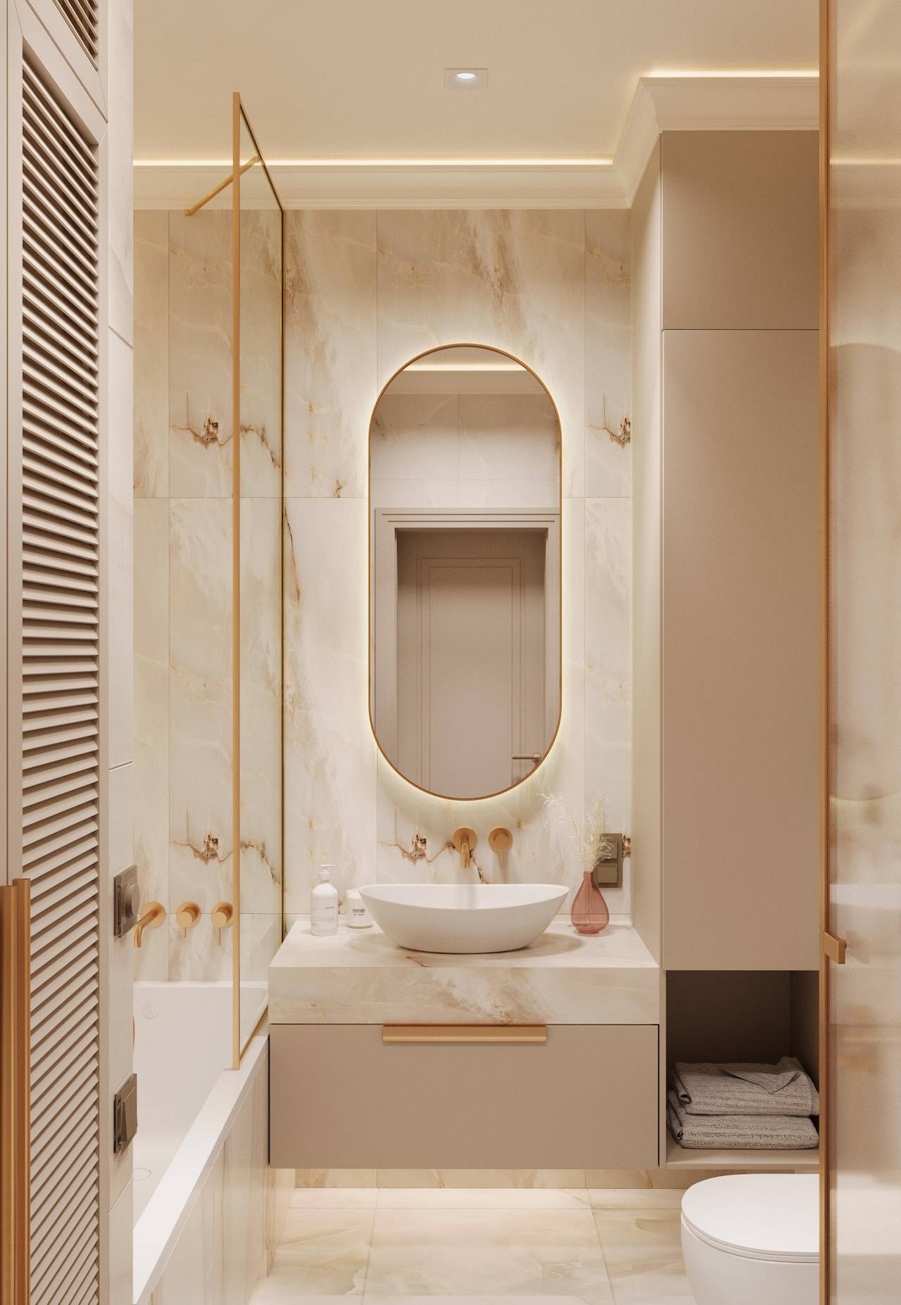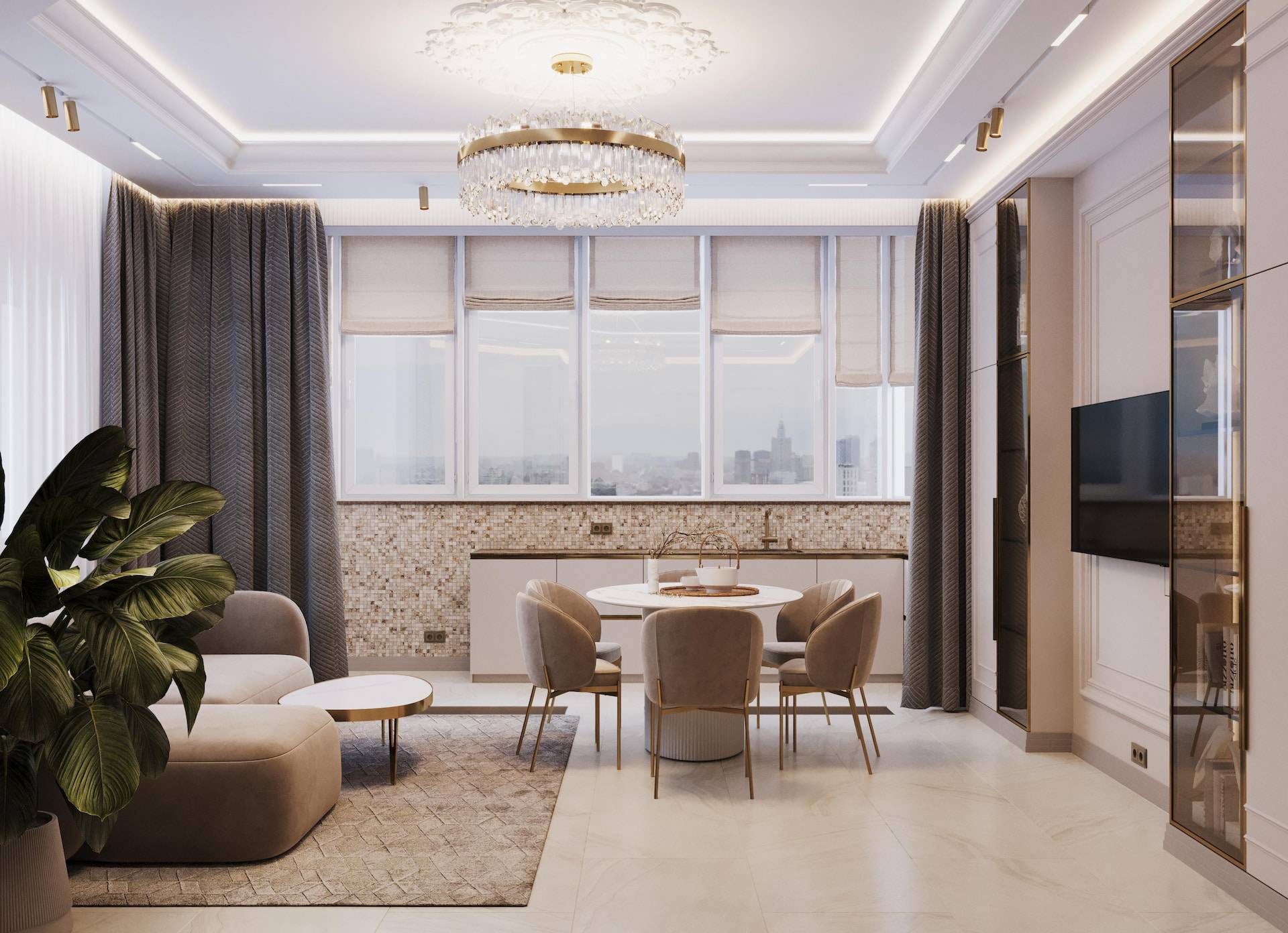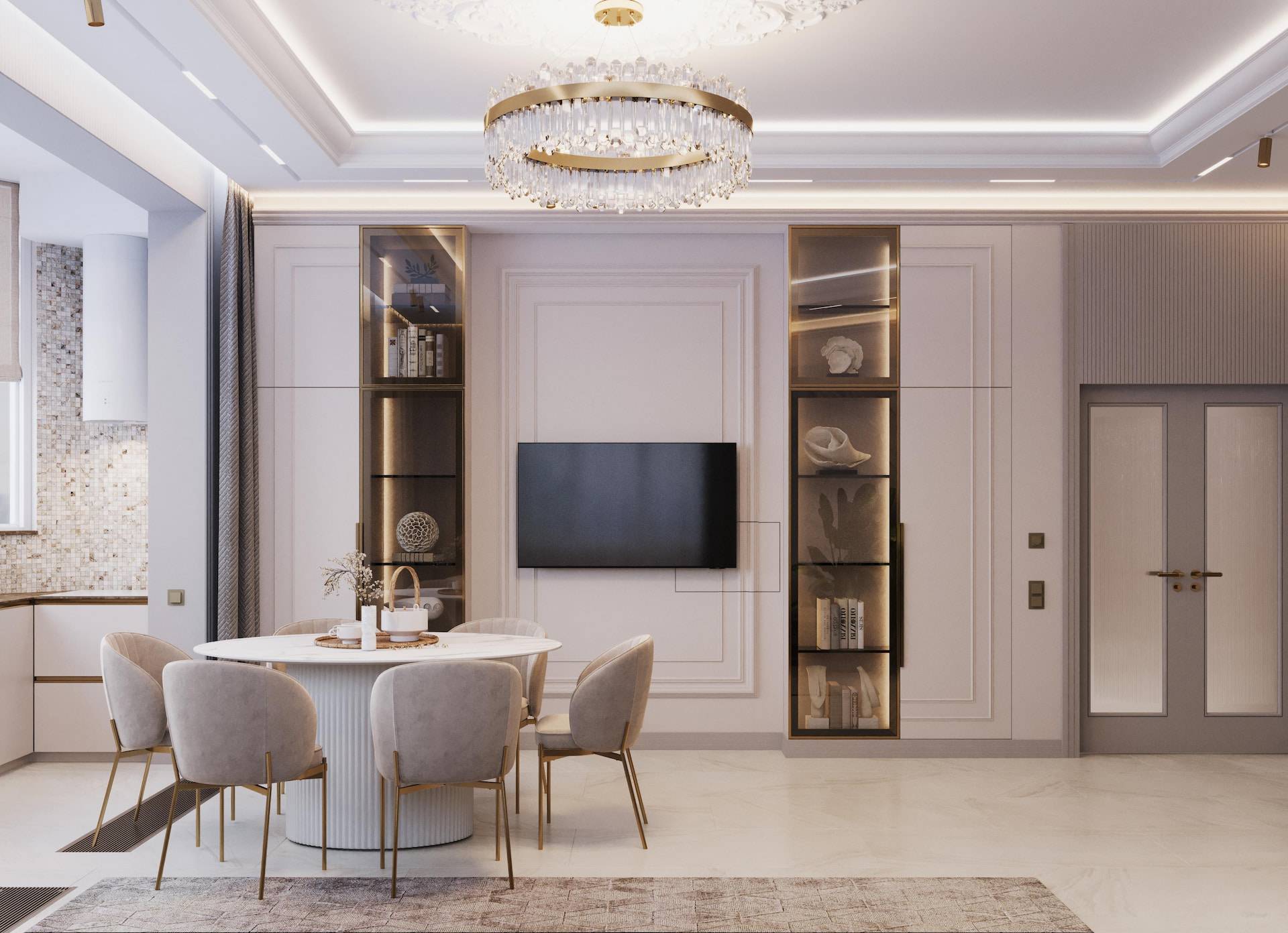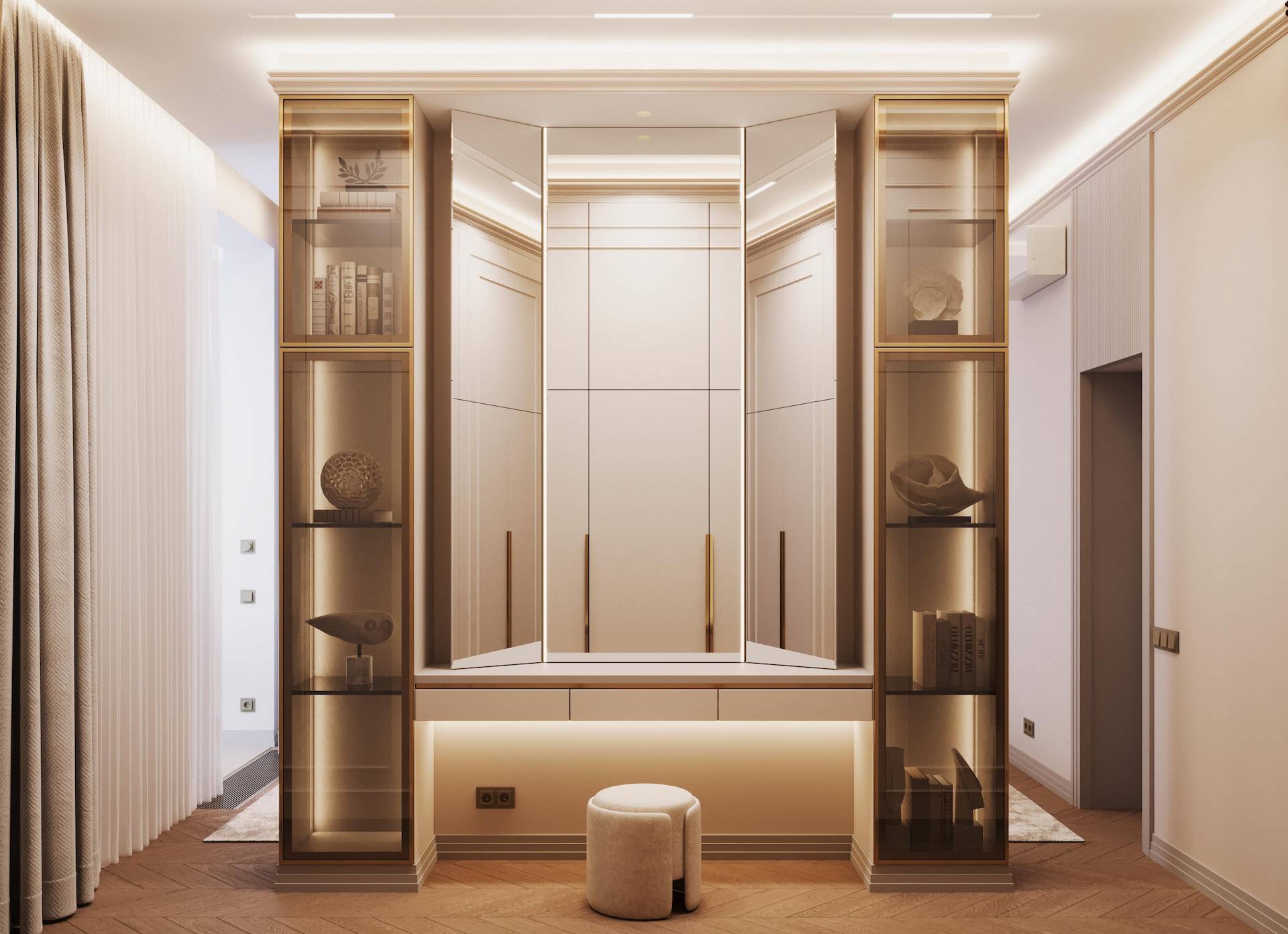 The apartment was initially intended for rental purposes, but during the design process, the client decided to live there. As a result, it became a cozy and calm apartment with neutral warm colors. Classic elements are present in the decor, such as a marble border on the floor, a ceiling rose, decorative moldings, brass accents, and herringbone parquet flooring. The bathroom decor features a combination of pink onyx and brass fixtures, adding a touch of elegance to the space.