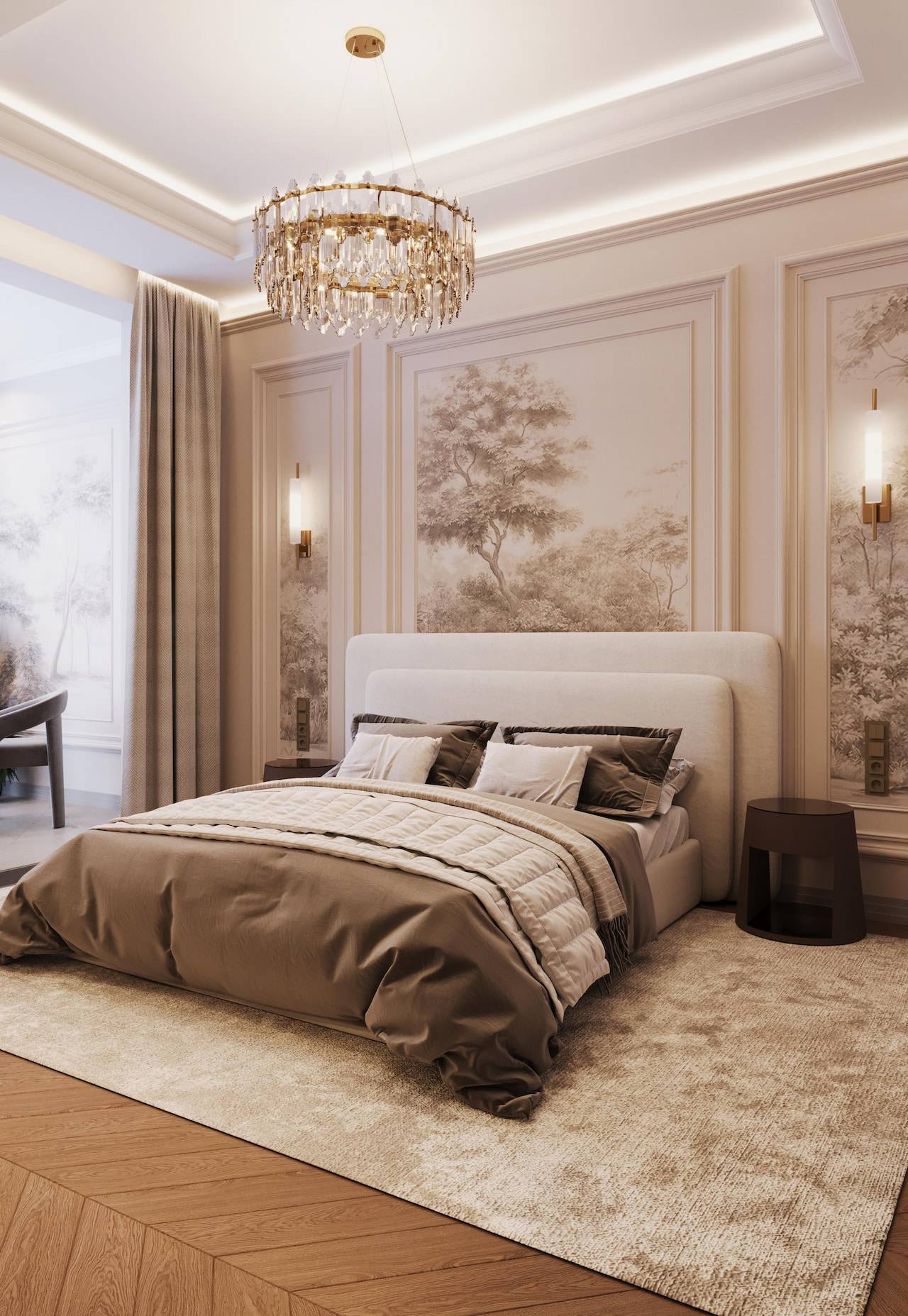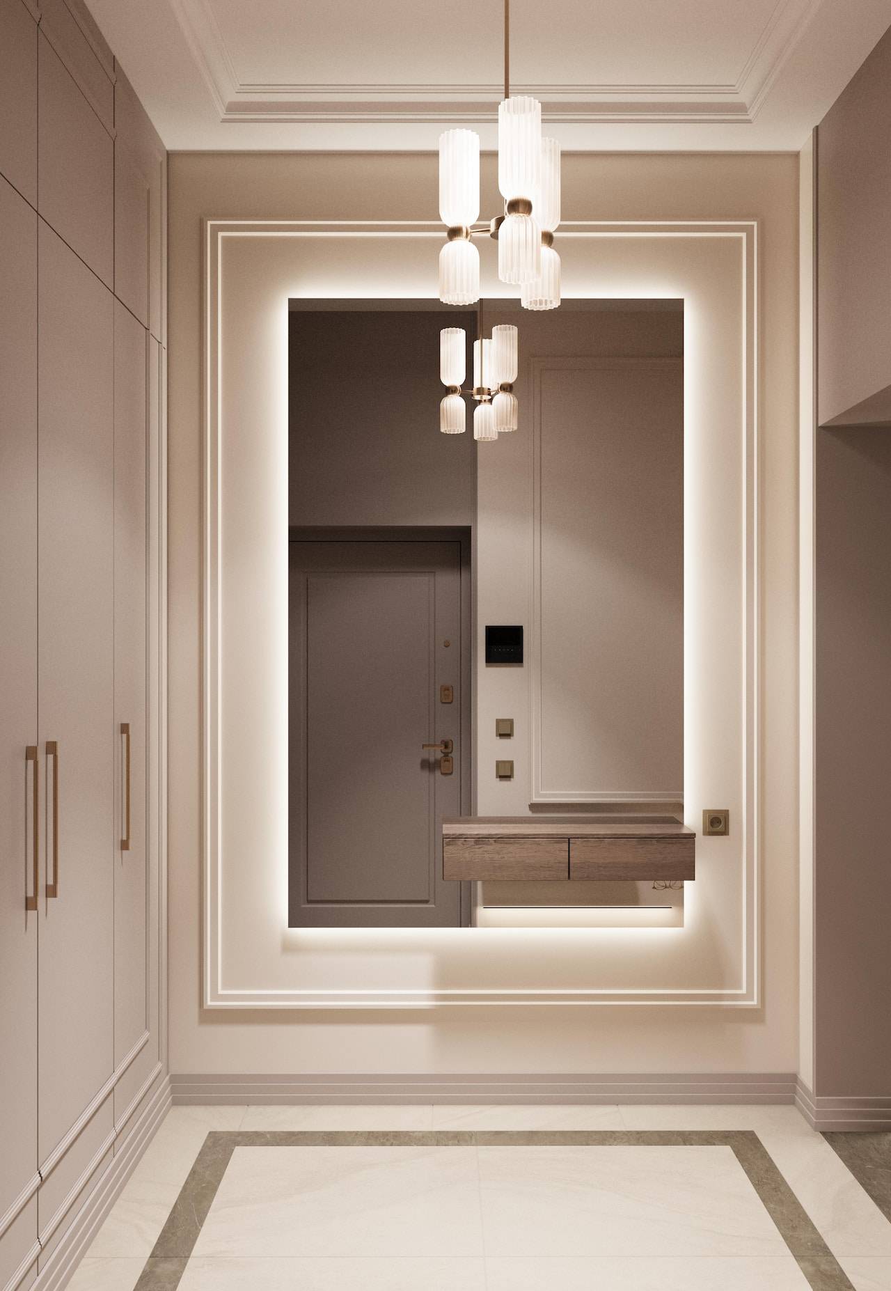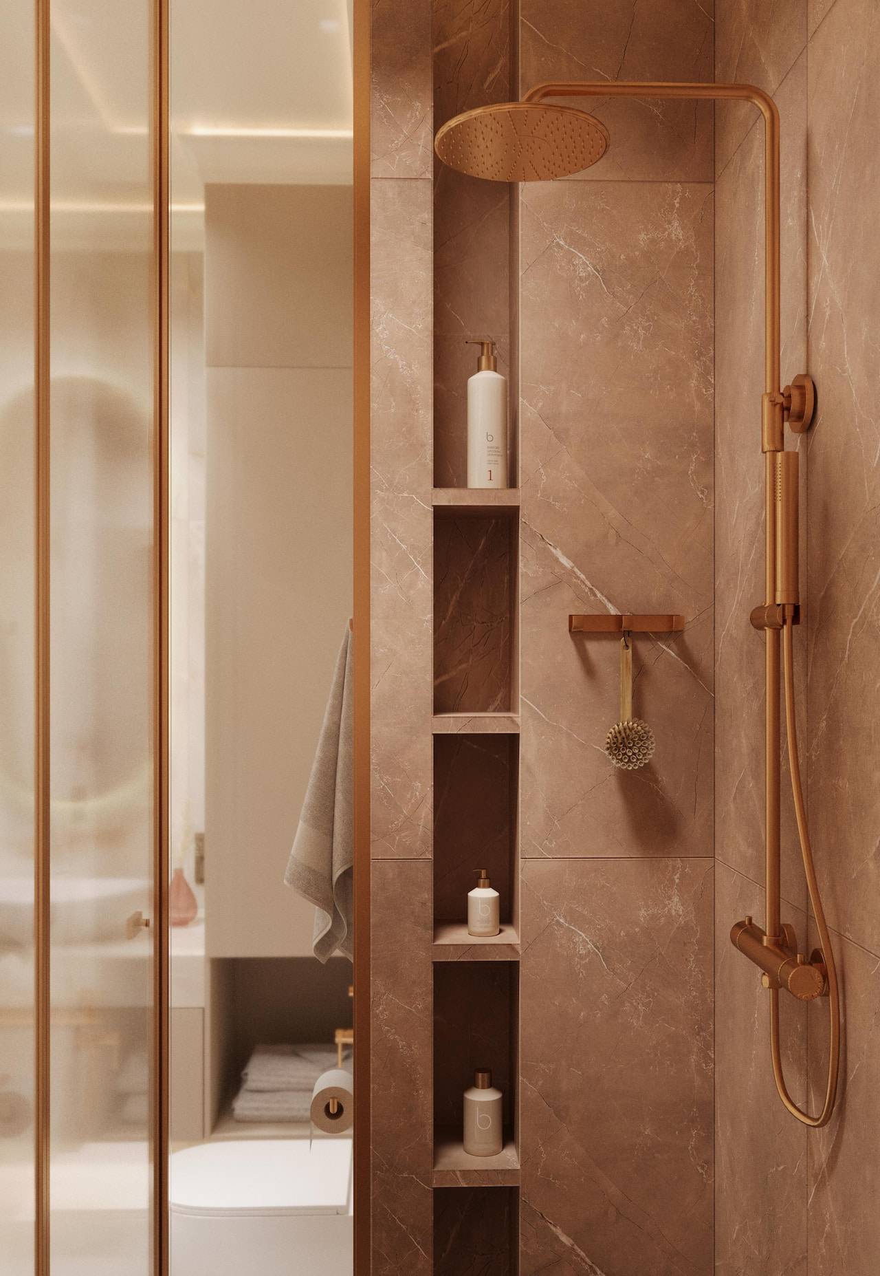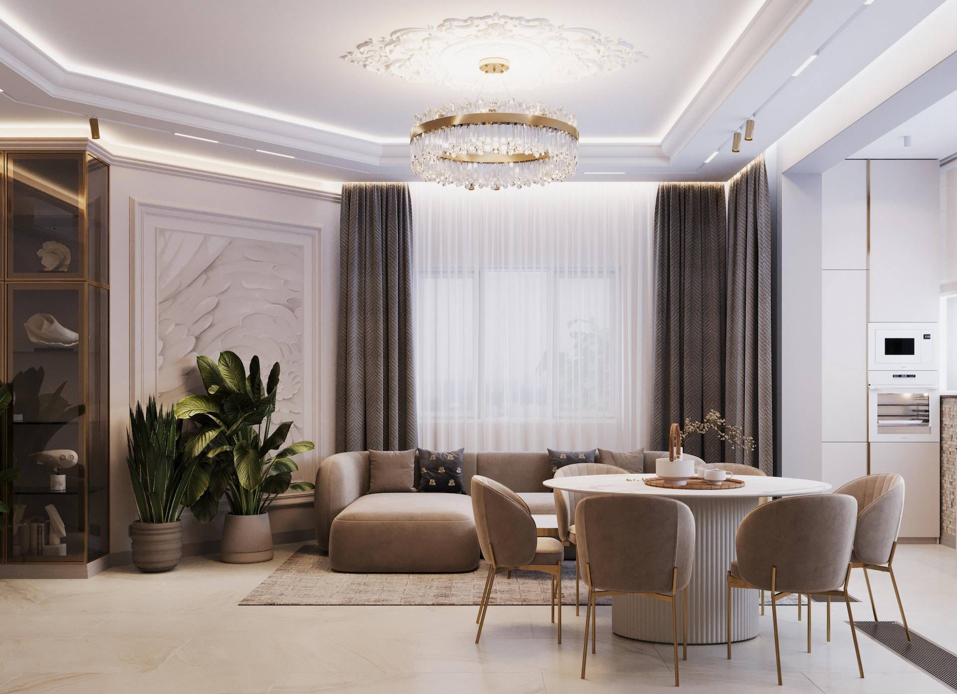 The apartment was initially intended for rental purposes, but during the design process, the client decided to live there. As a result, it became a cozy and calm apartment with neutral warm colors. Classic elements are present in the decor, such as a marble border on the floor, a ceiling rose, decorative moldings, brass accents, and herringbone parquet flooring. The bathroom decor features a combination of pink onyx and brass fixtures, adding a touch of elegance to the space.
