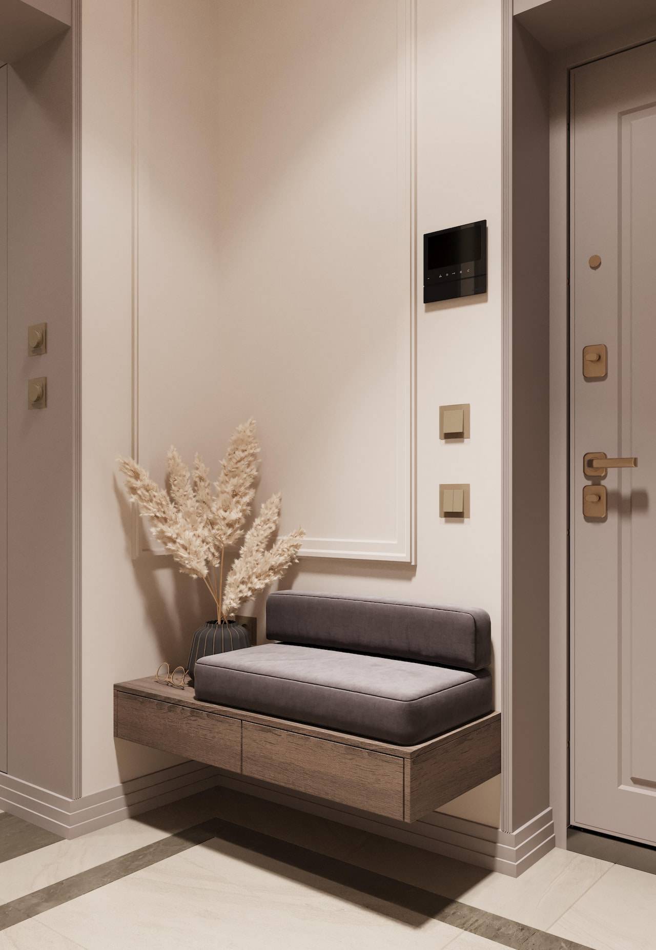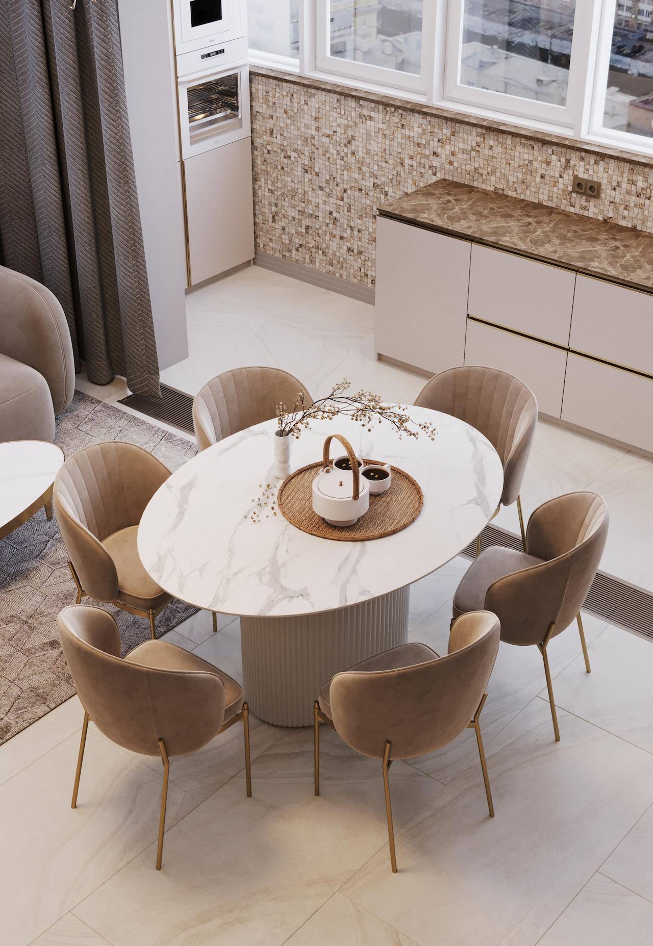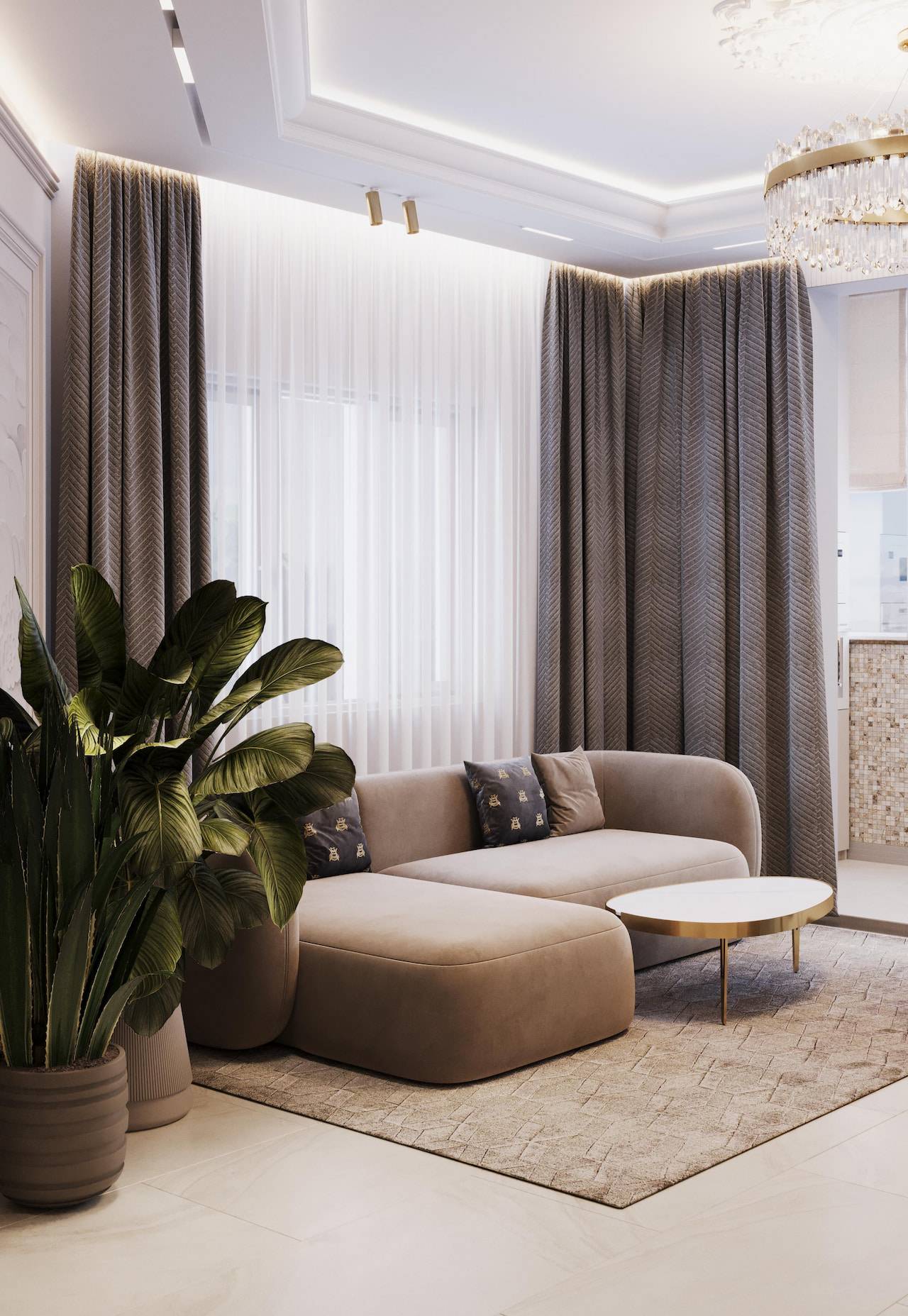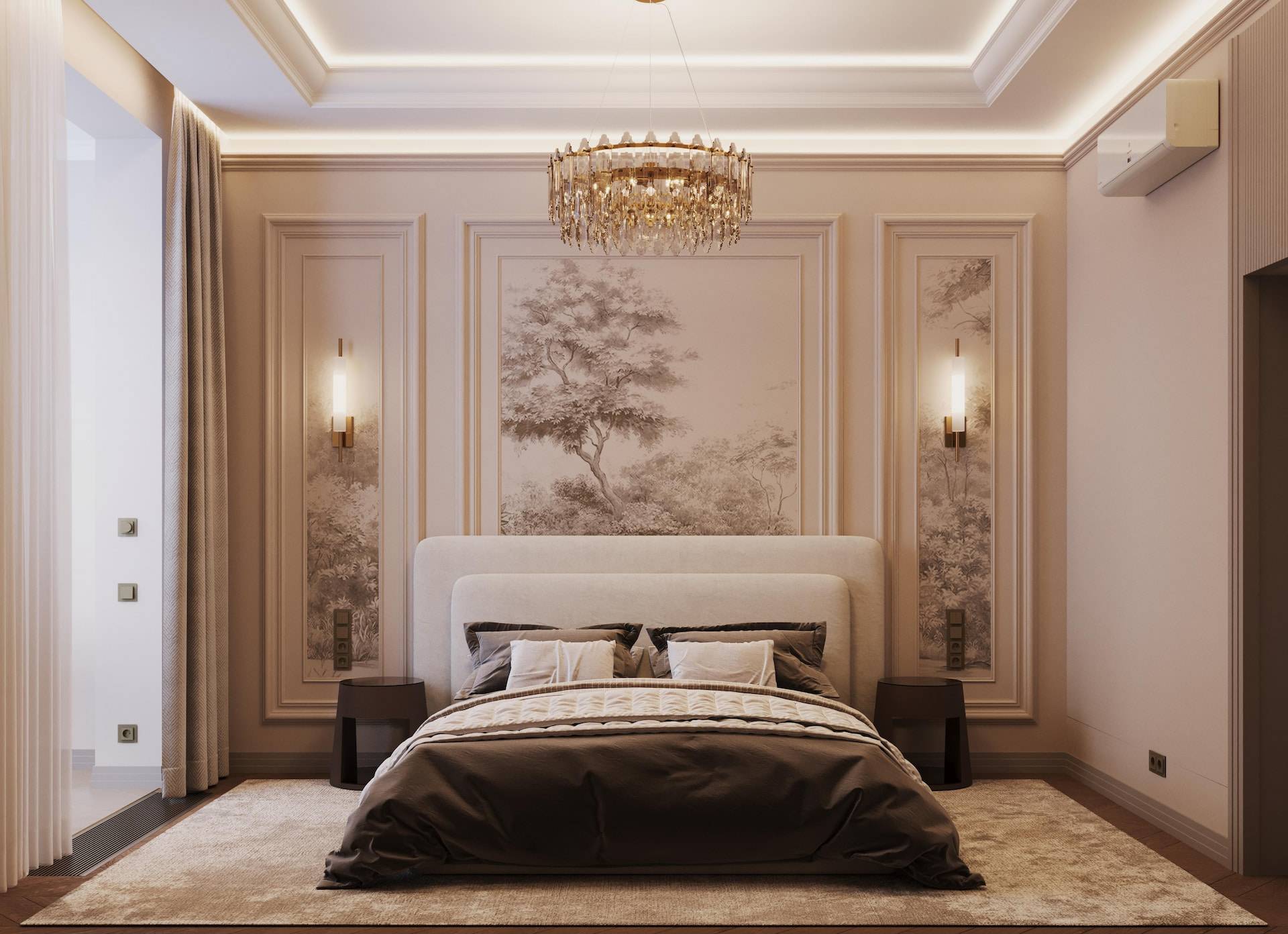 The apartment was initially intended for rental purposes, but during the design process, the client decided to live there. As a result, it became a cozy and calm apartment with neutral warm colors. Classic elements are present in the decor, such as a marble border on the floor, a ceiling rose, decorative moldings, brass accents, and herringbone parquet flooring. The bathroom decor features a combination of pink onyx and brass fixtures, adding a touch of elegance to the space.