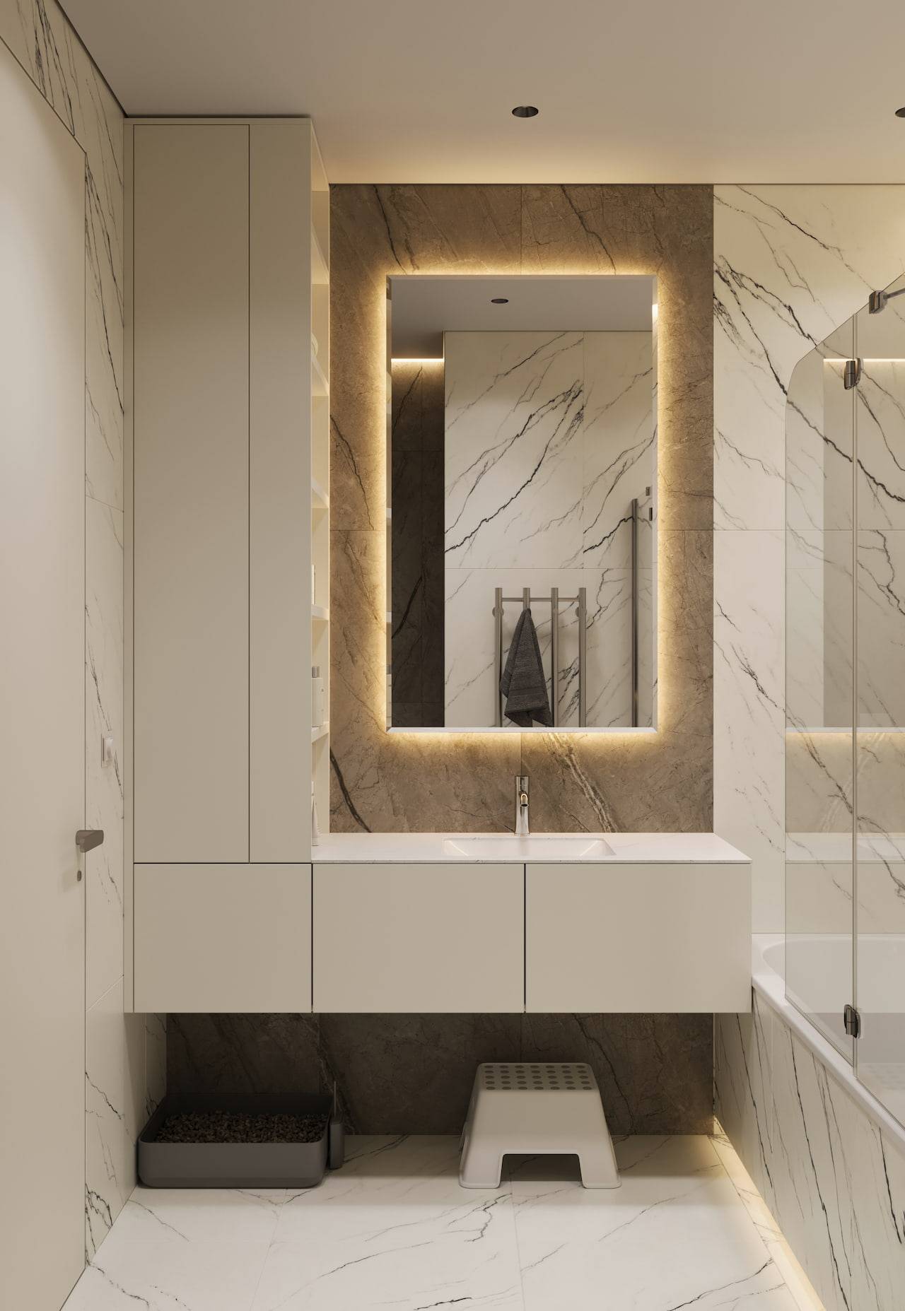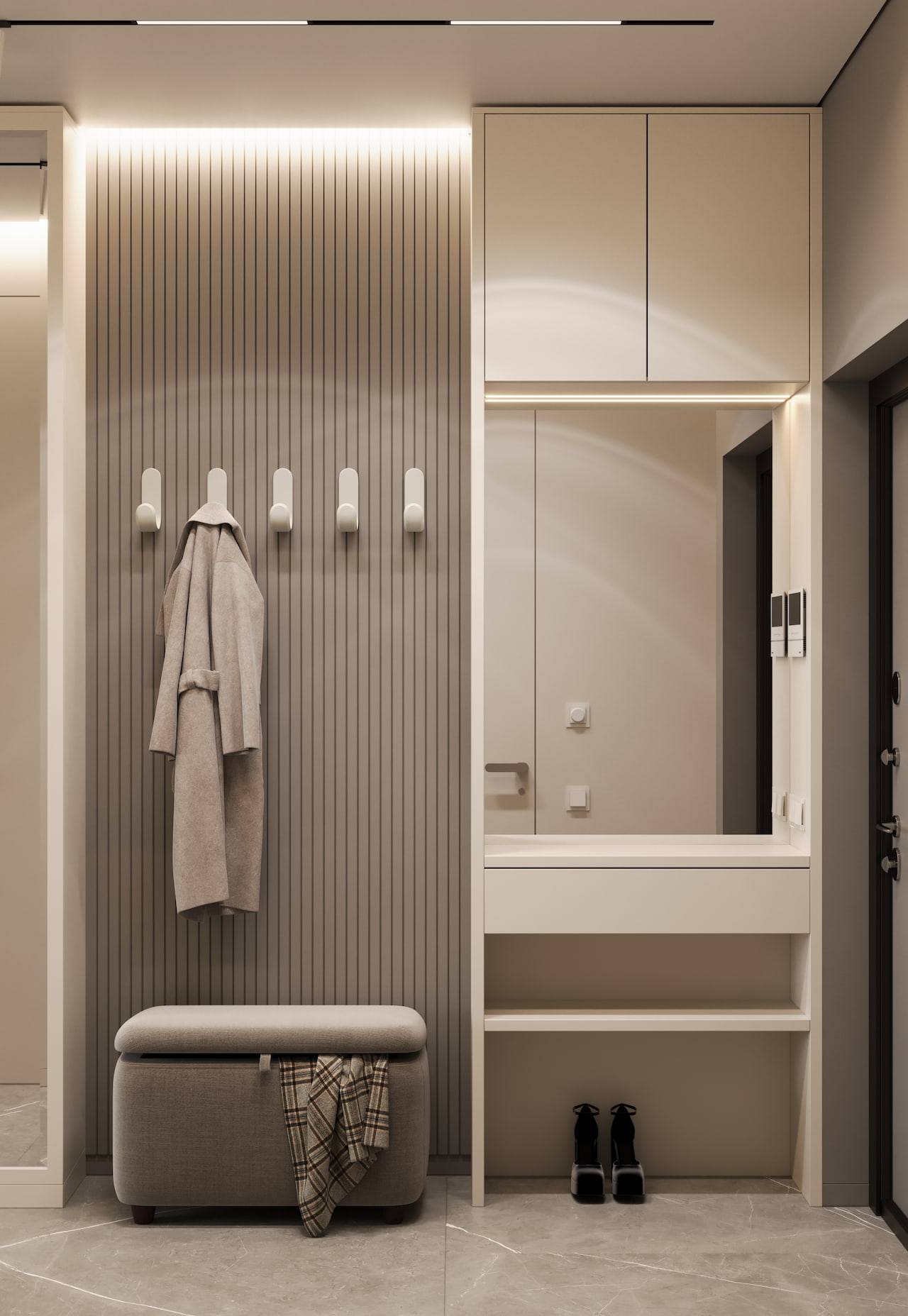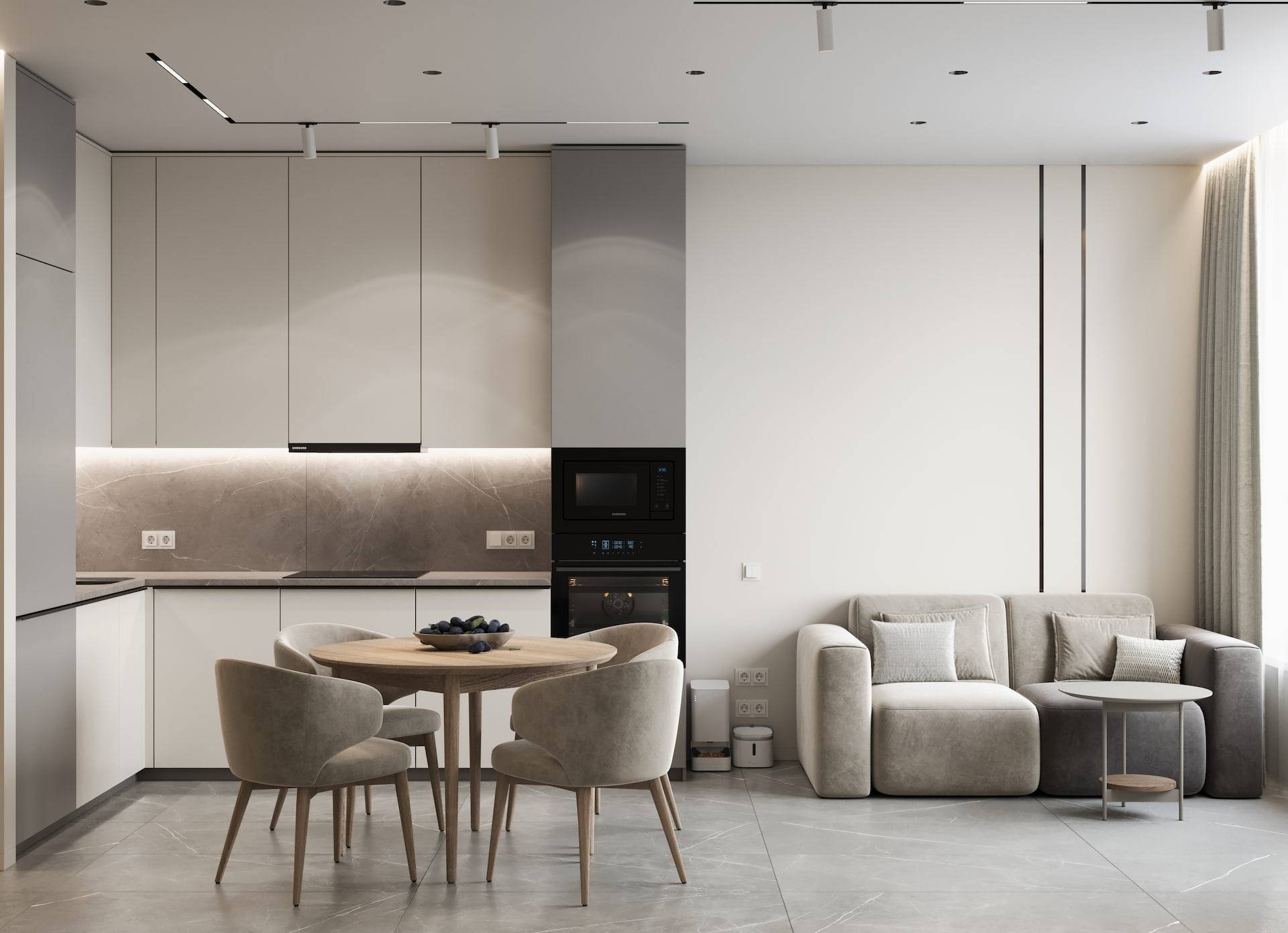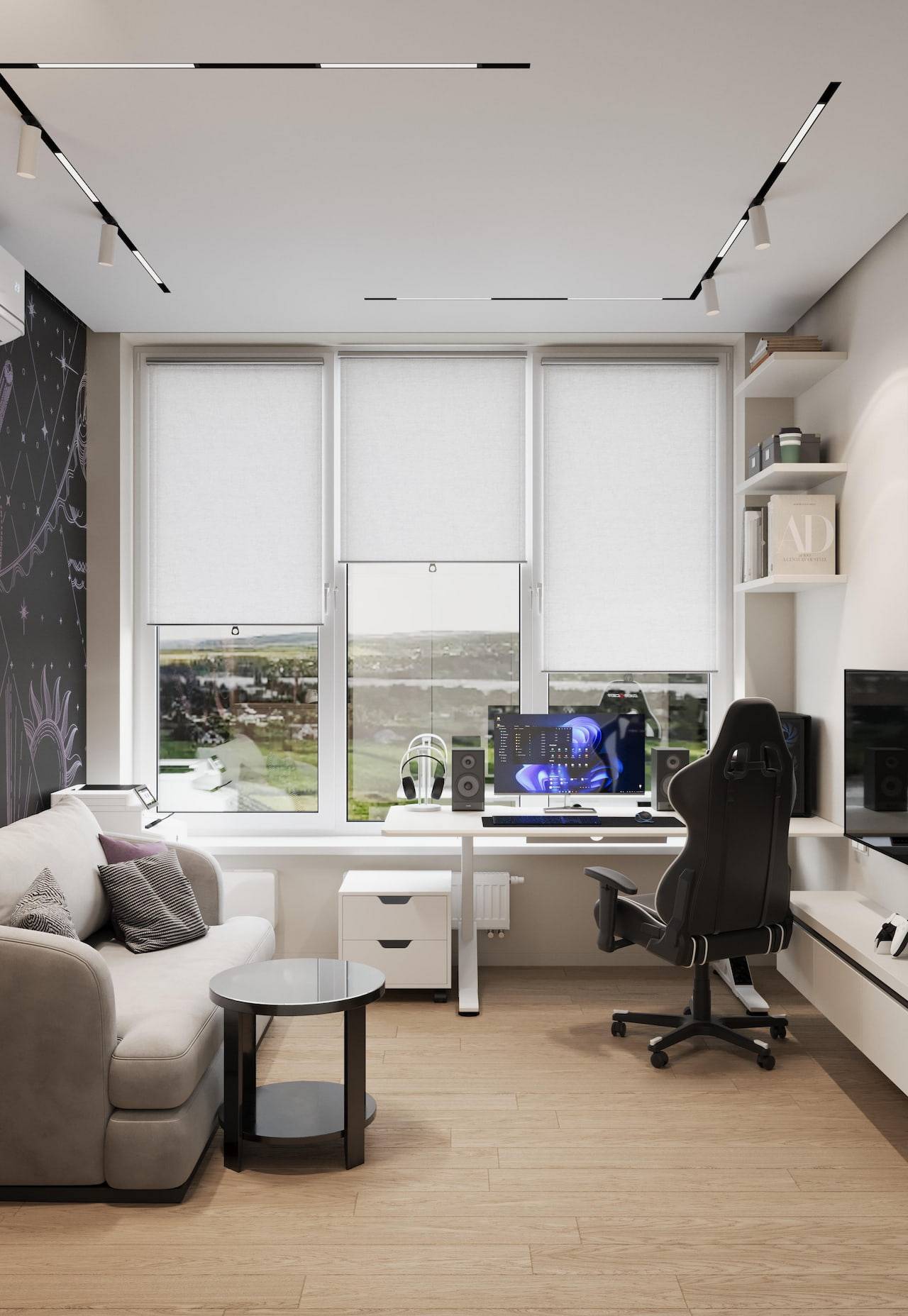 A light and modern apartment designed to provide comfortable living for a young family. The apartment features a spacious master bedroom, a bathroom with marble finishes, an open-plan kitchen and living area with a gray color scheme. The children's room can be easily transformed for two children. The office of the head of the family is a flexible space that combines a game area with colored lighting and a place to work and meet with friends.