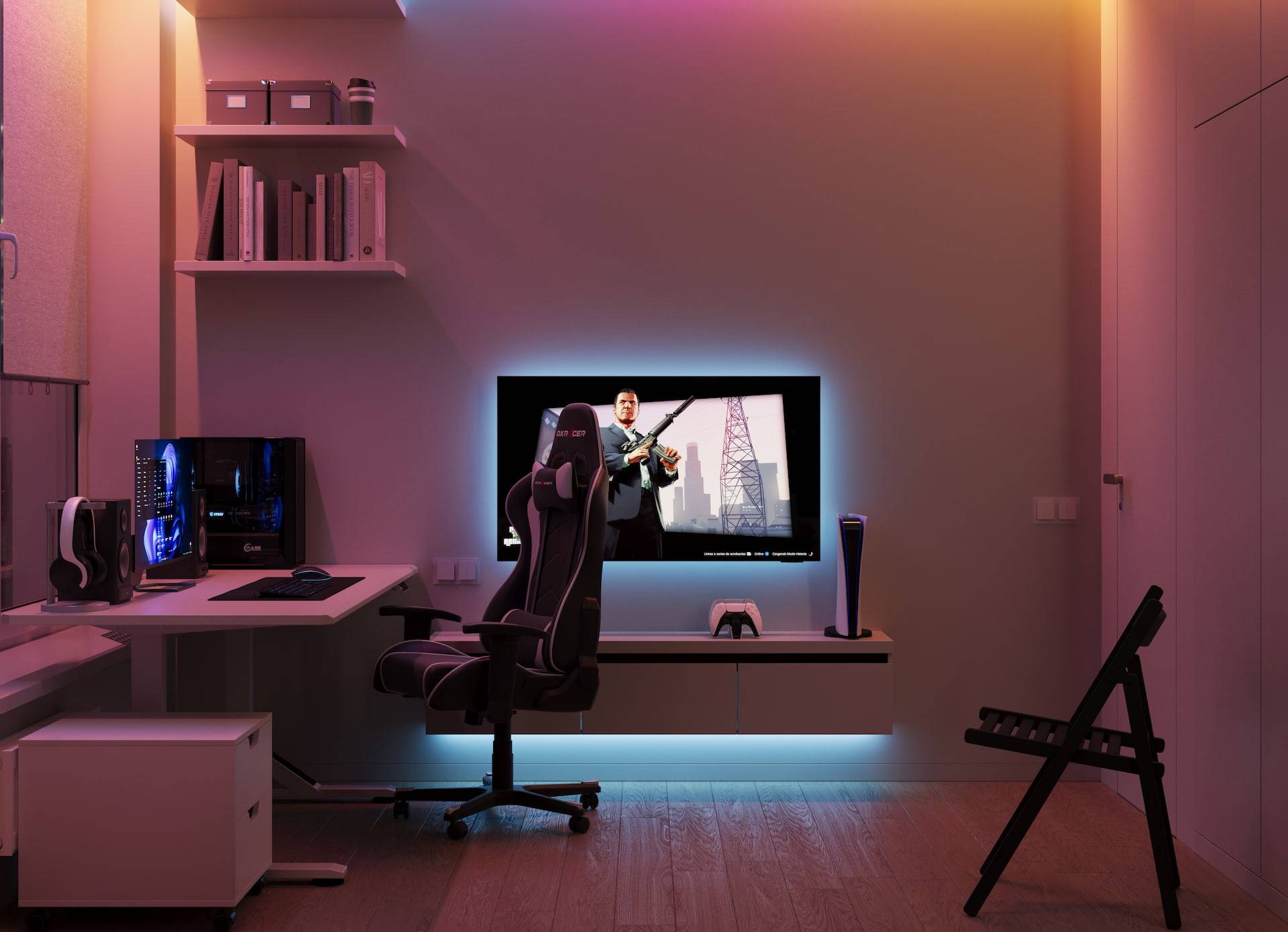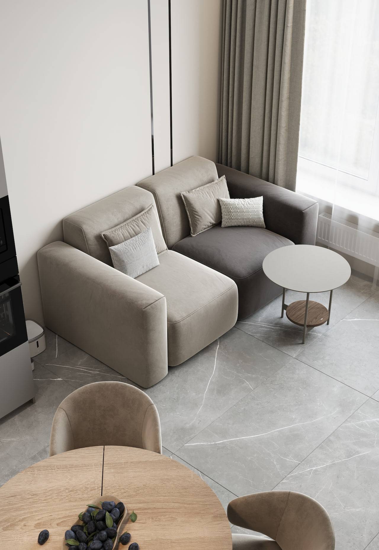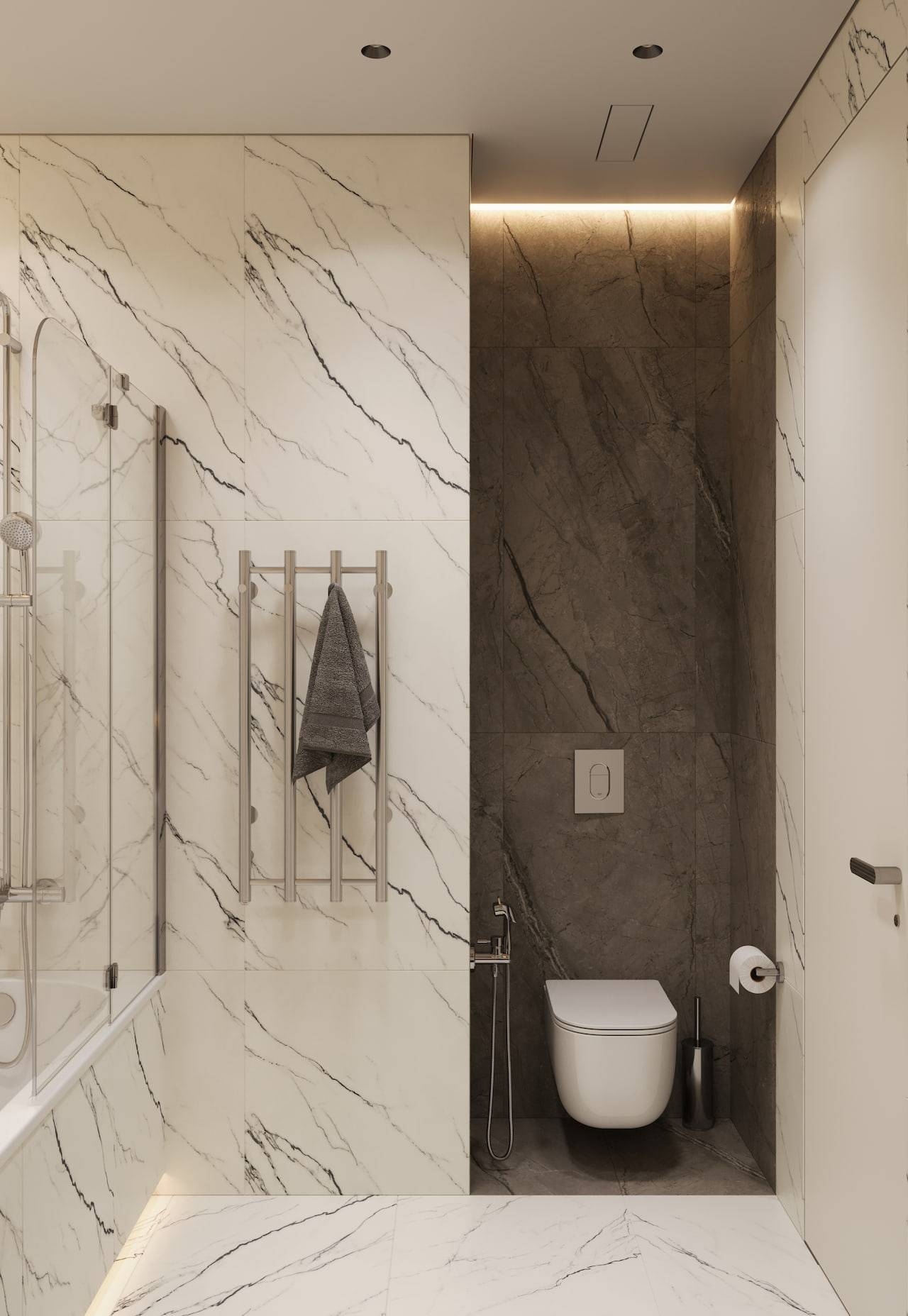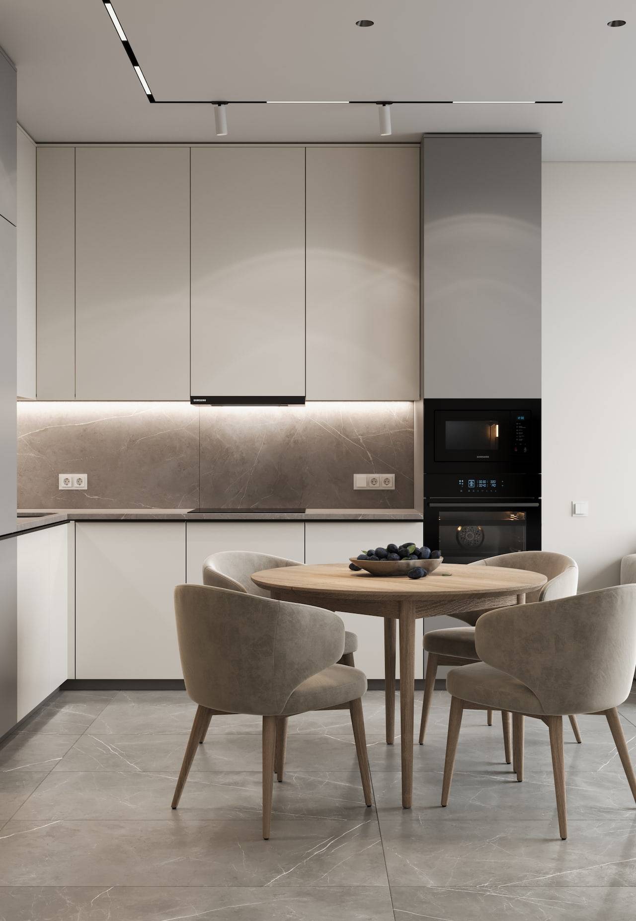 A light and modern apartment designed to provide comfortable living for a young family. The apartment features a spacious master bedroom, a bathroom with marble finishes, an open-plan kitchen and living area with a gray color scheme. The children's room can be easily transformed for two children. The office of the head of the family is a flexible space that combines a game area with colored lighting and a place to work and meet with friends.