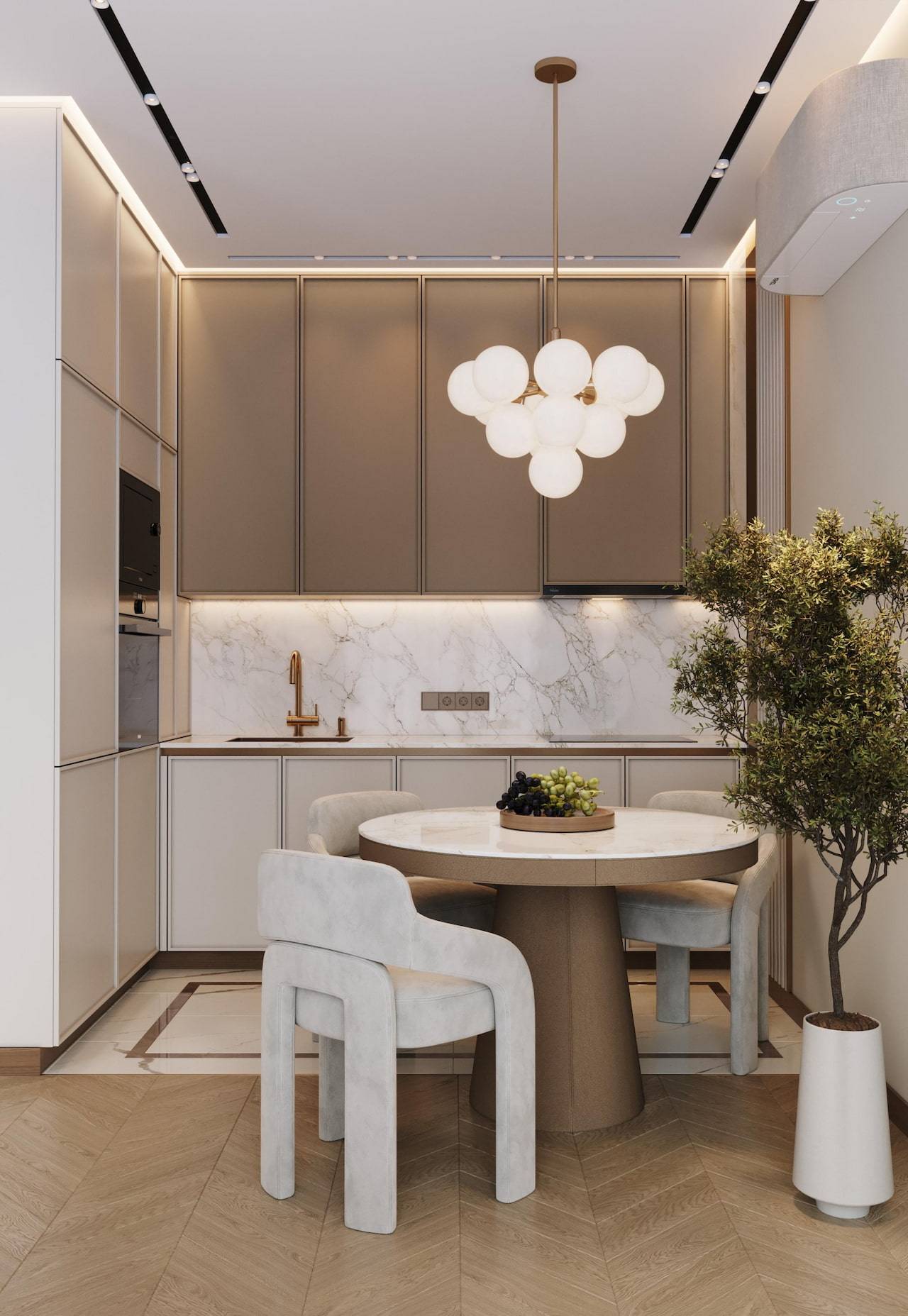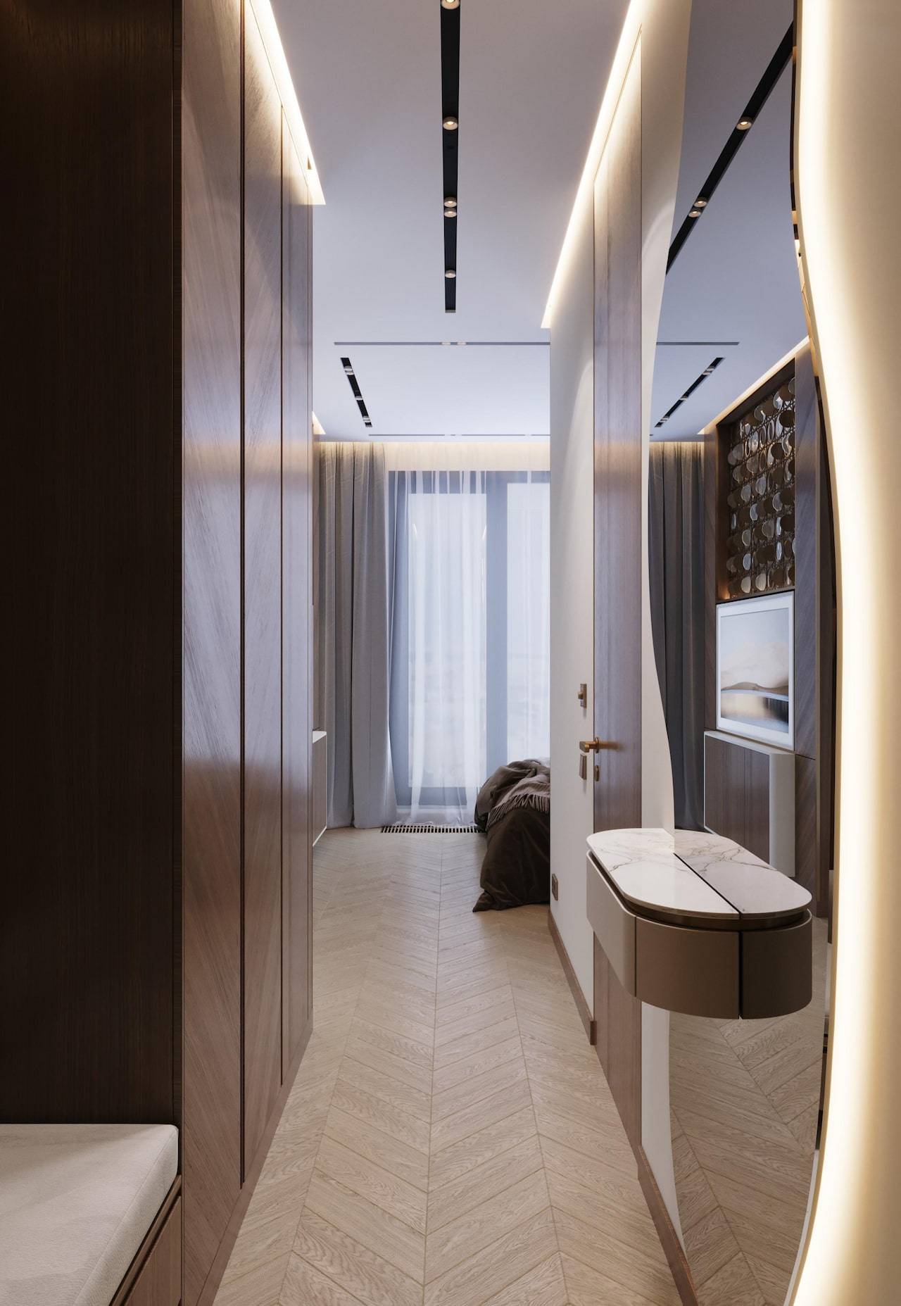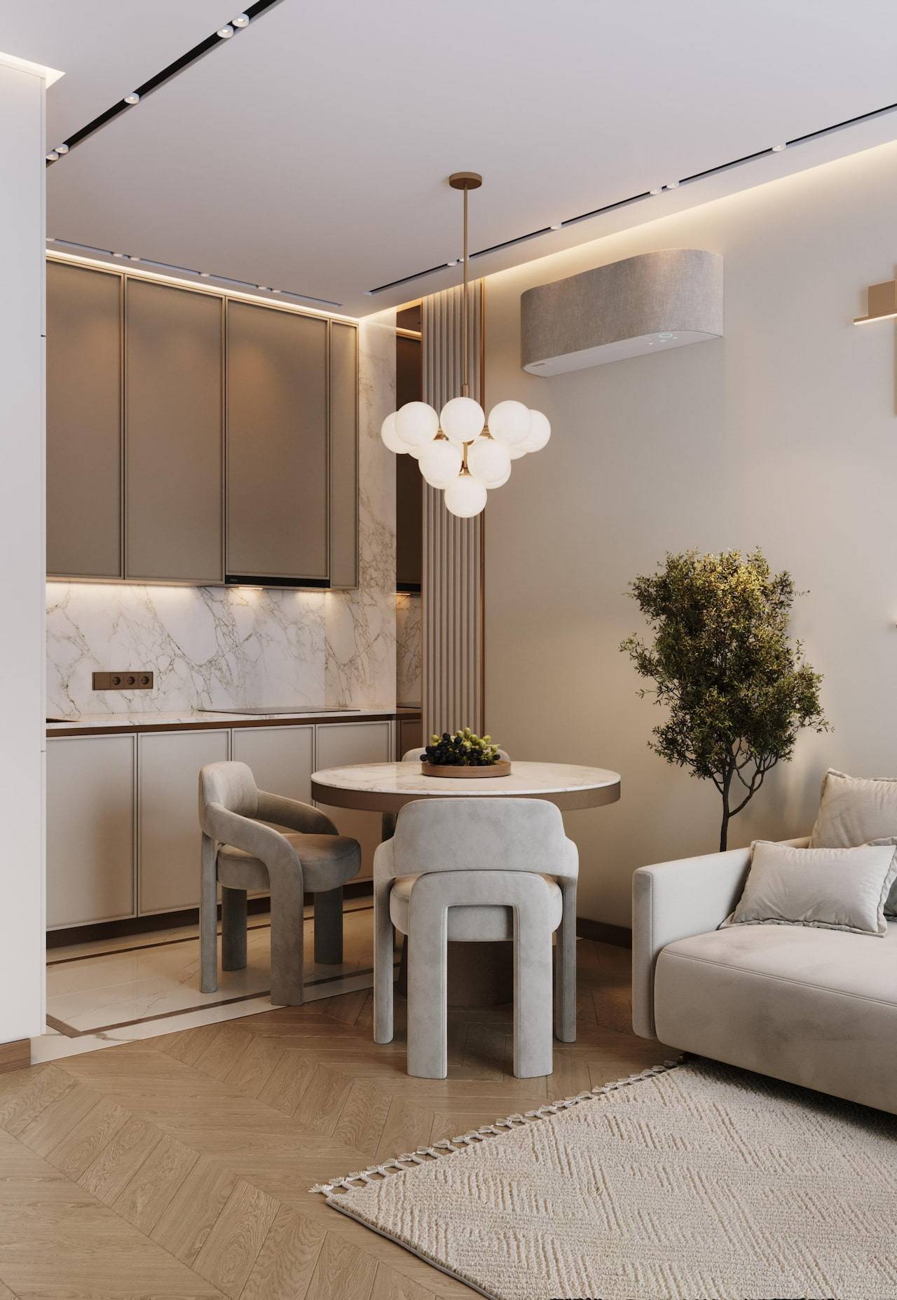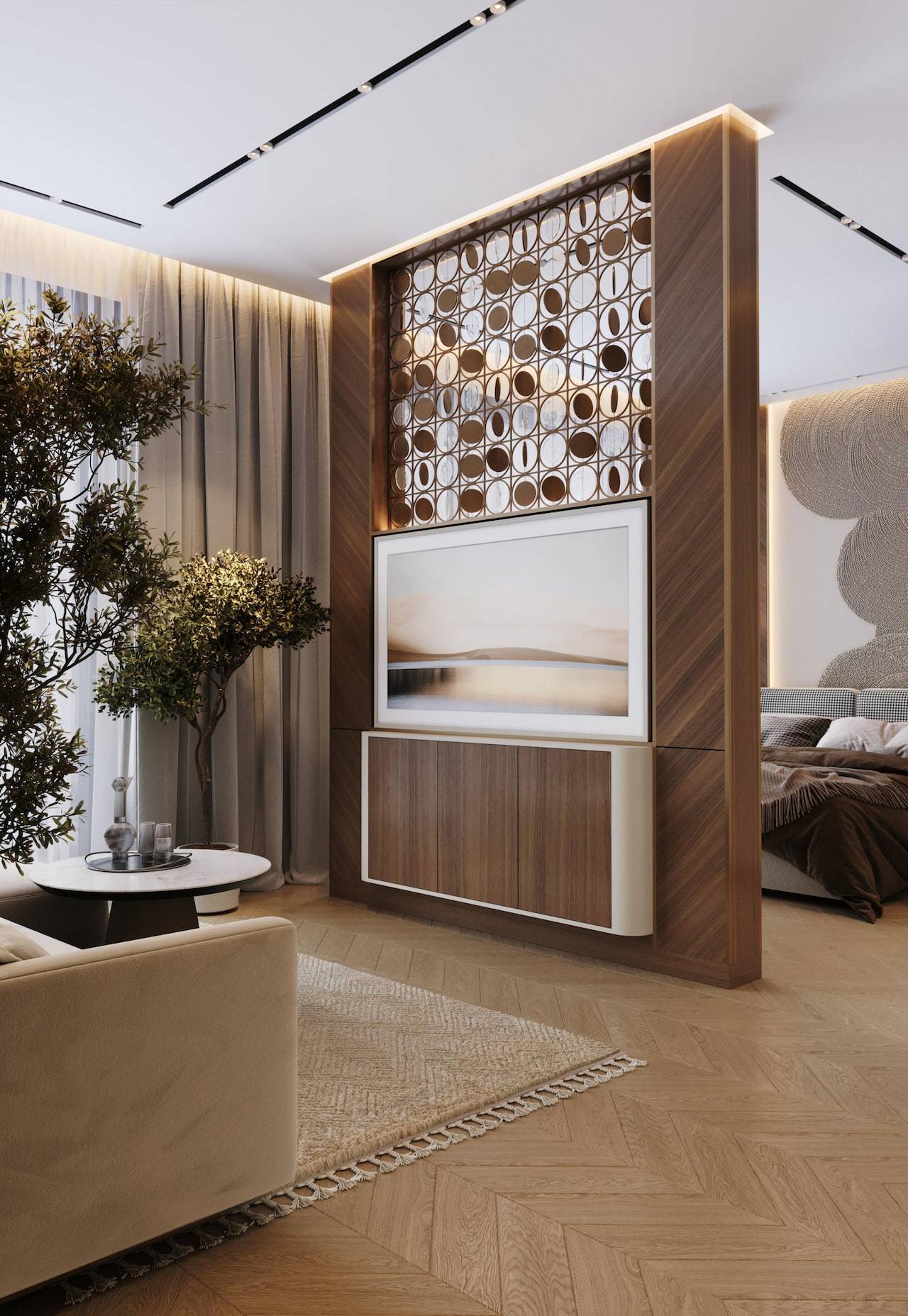 These small premium apartments are designed for rent. The rooms are combined into one common space - the entrance area, bedroom, and kitchen-living room, separated only by a column on which the TV is located on both sides. The column is decorated with ornamental elements made of brass and glass. Although the apartment is small, it has all the attributes of modern comfortable living and premium finish materials.
