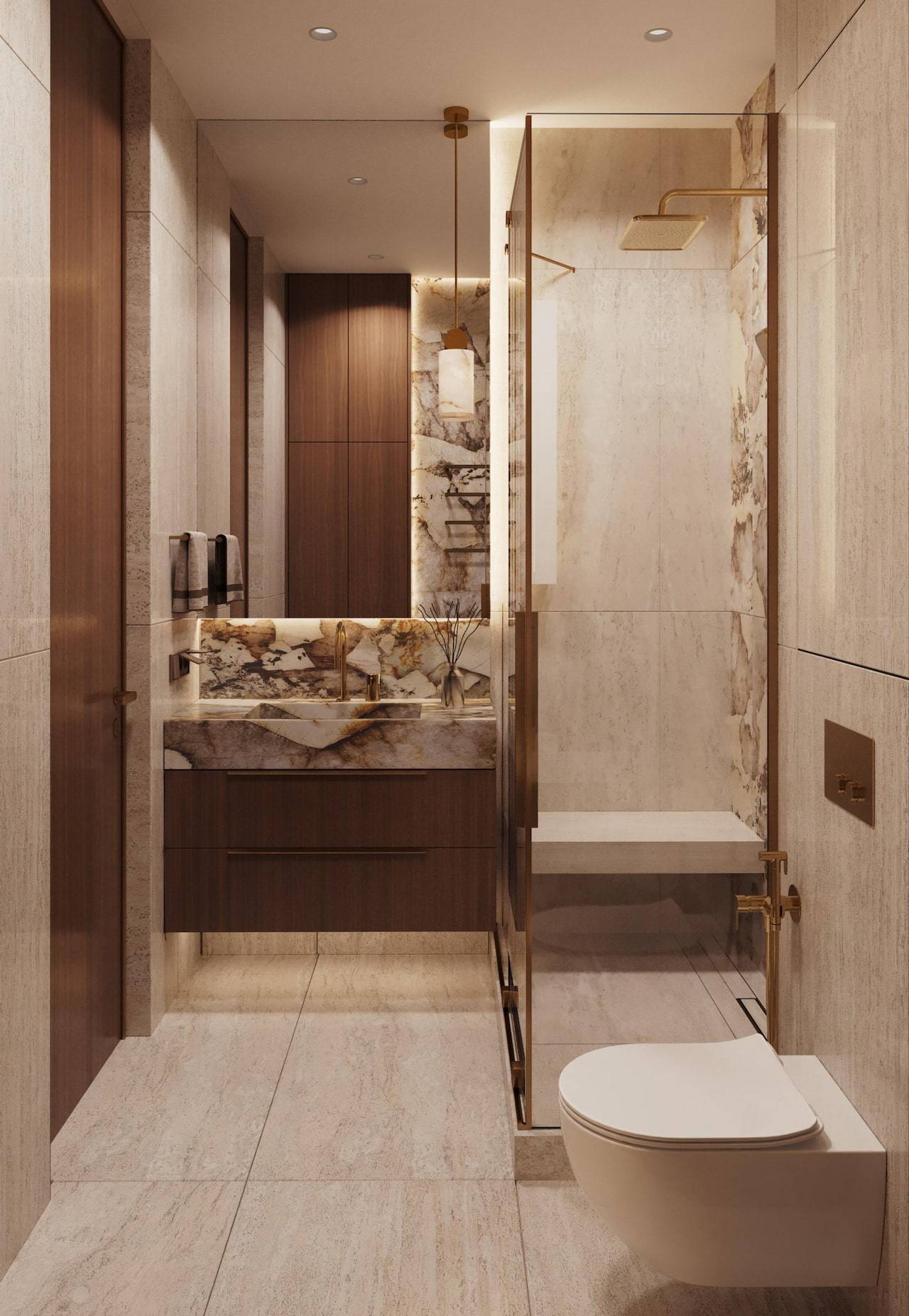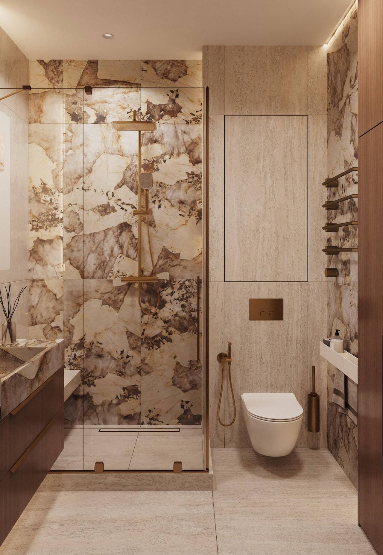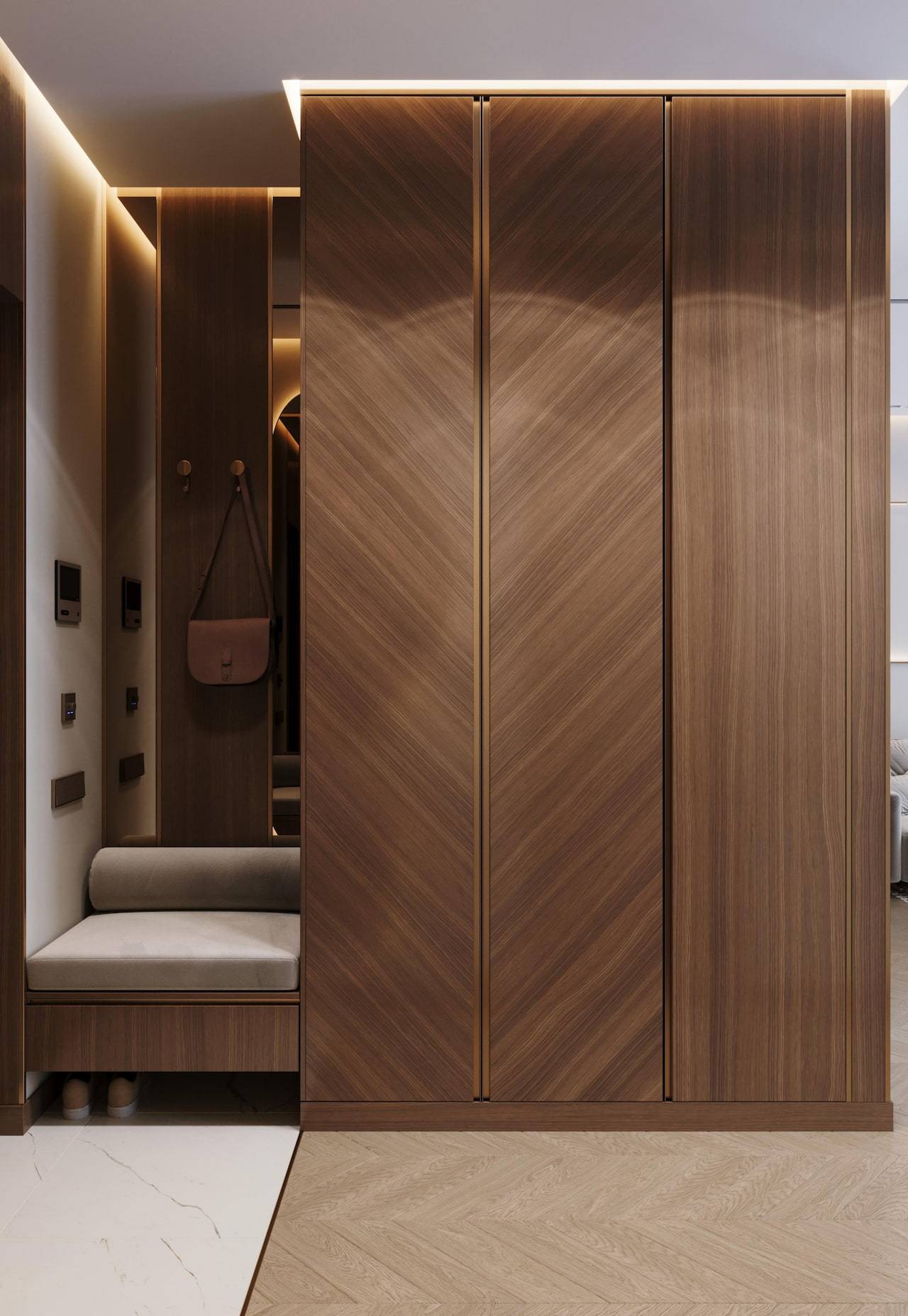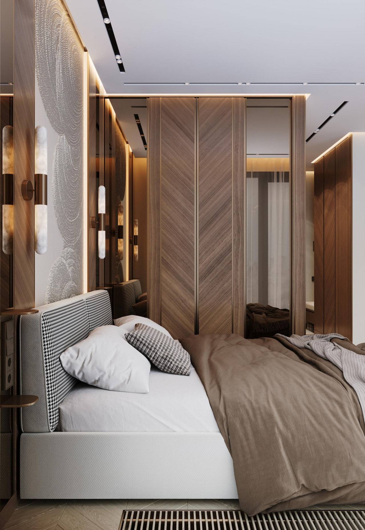 These small premium apartments are designed for rent. The rooms are combined into one common space - the entrance area, bedroom, and kitchen-living room, separated only by a column on which the TV is located on both sides. The column is decorated with ornamental elements made of brass and glass. Although the apartment is small, it has all the attributes of modern comfortable living and premium finish materials.