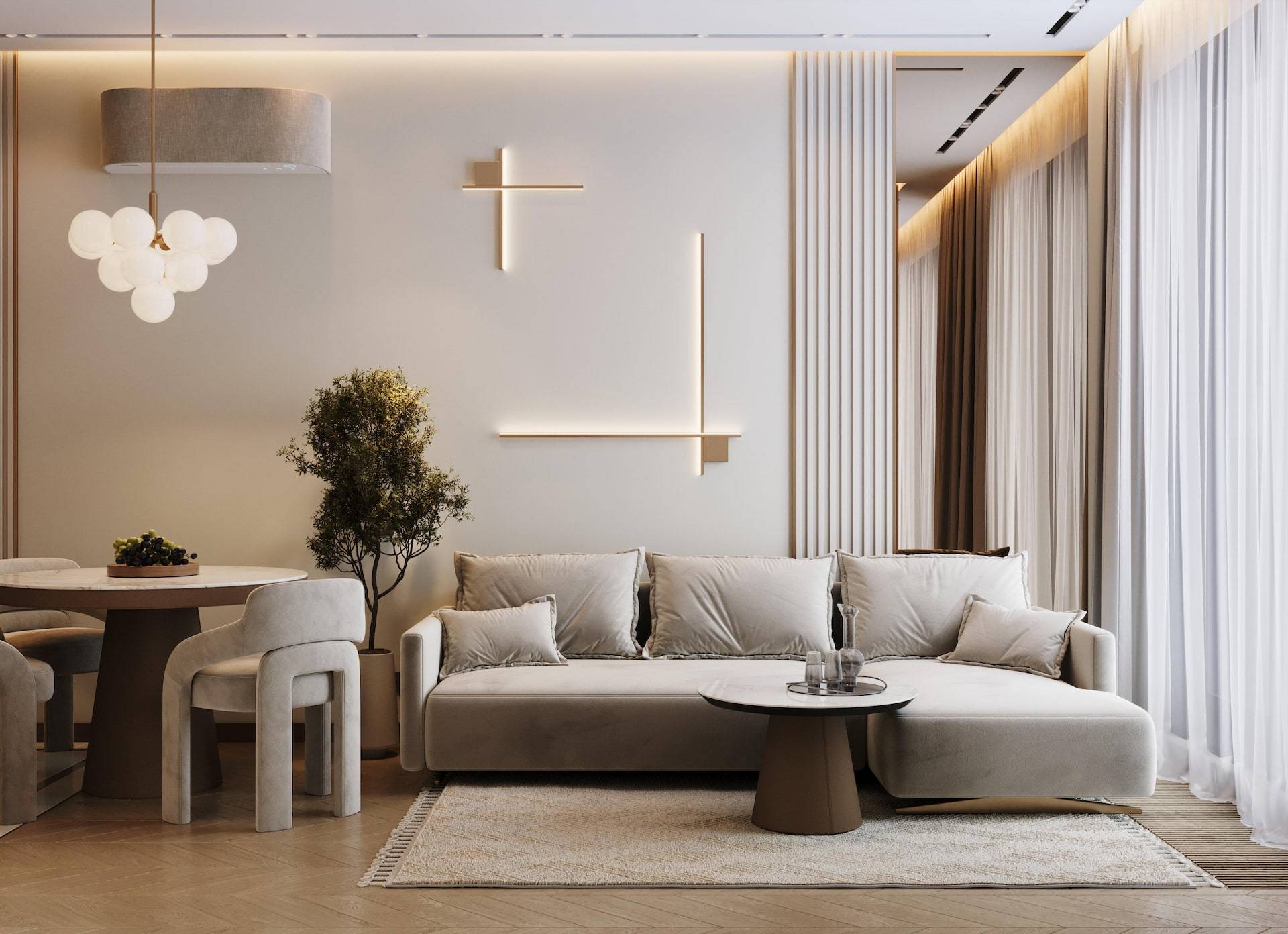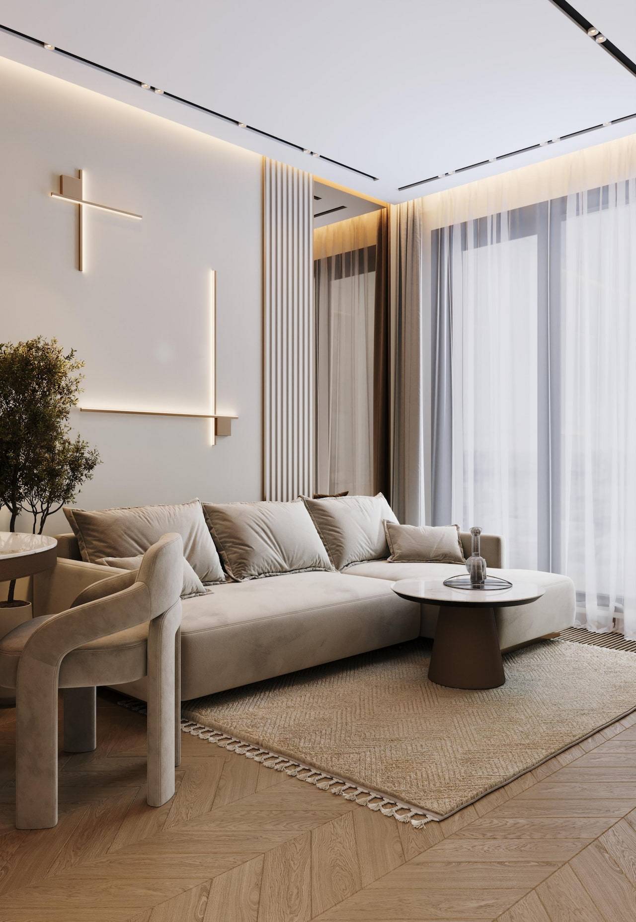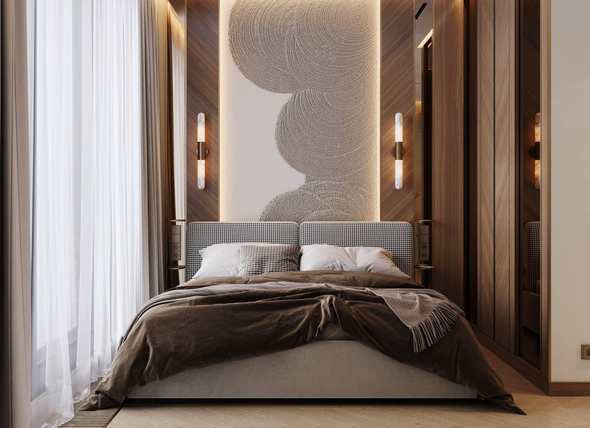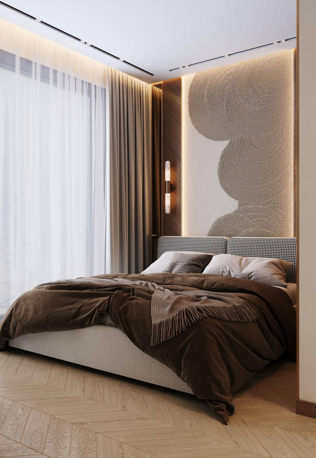 These small premium apartments are designed for rent. The rooms are combined into one common space - the entrance area, bedroom, and kitchen-living room, separated only by a column on which the TV is located on both sides. The column is decorated with ornamental elements made of brass and glass. Although the apartment is small, it has all the attributes of modern comfortable living and premium finish materials.