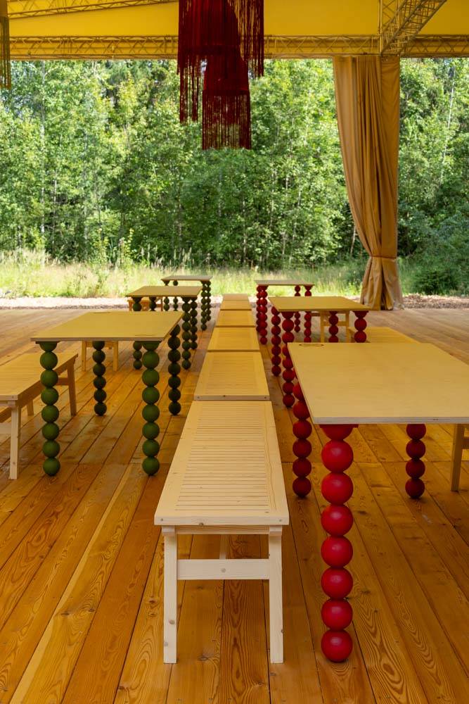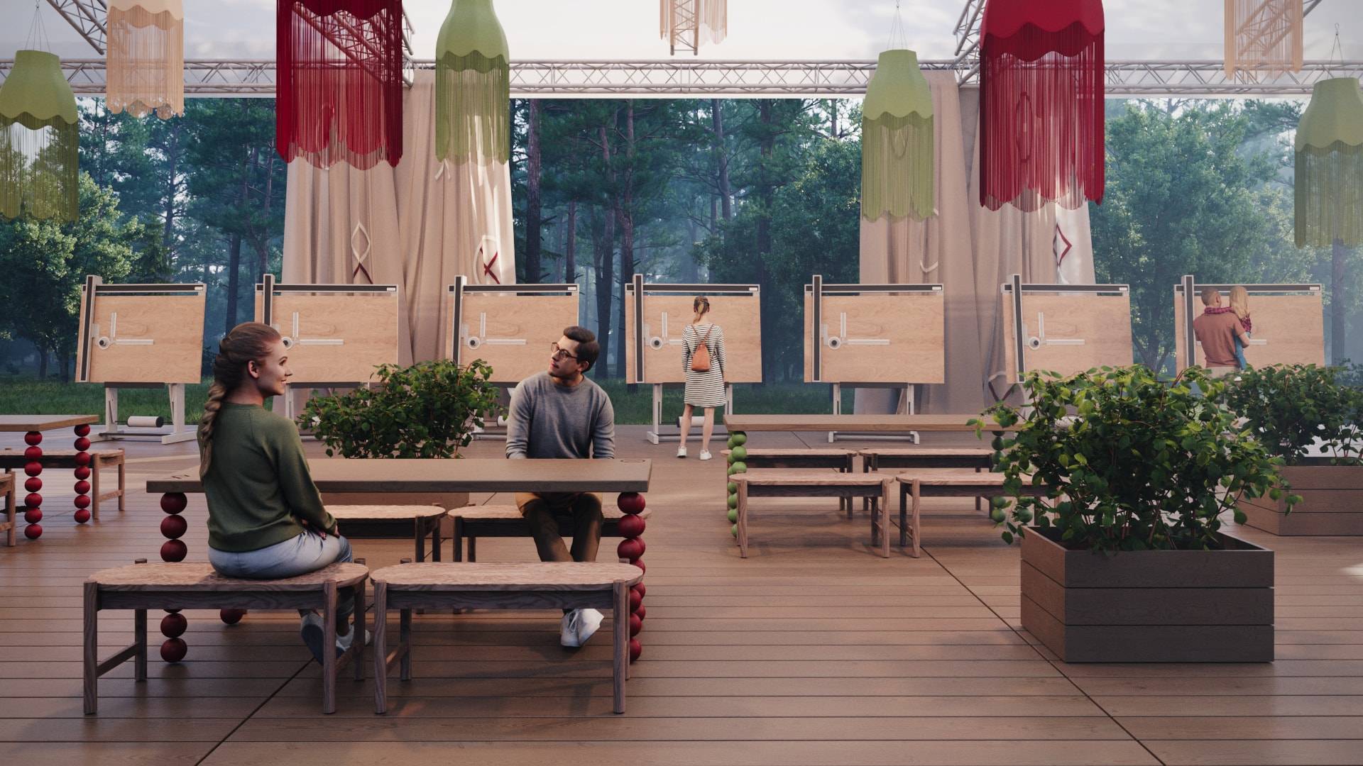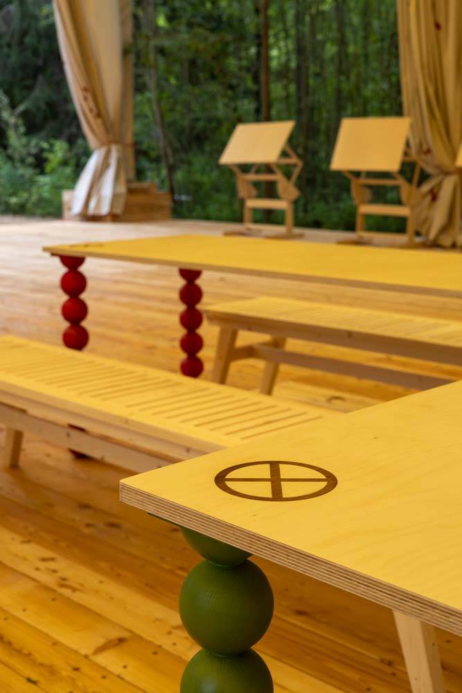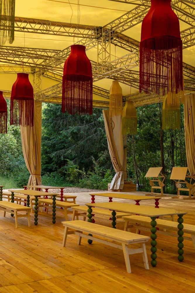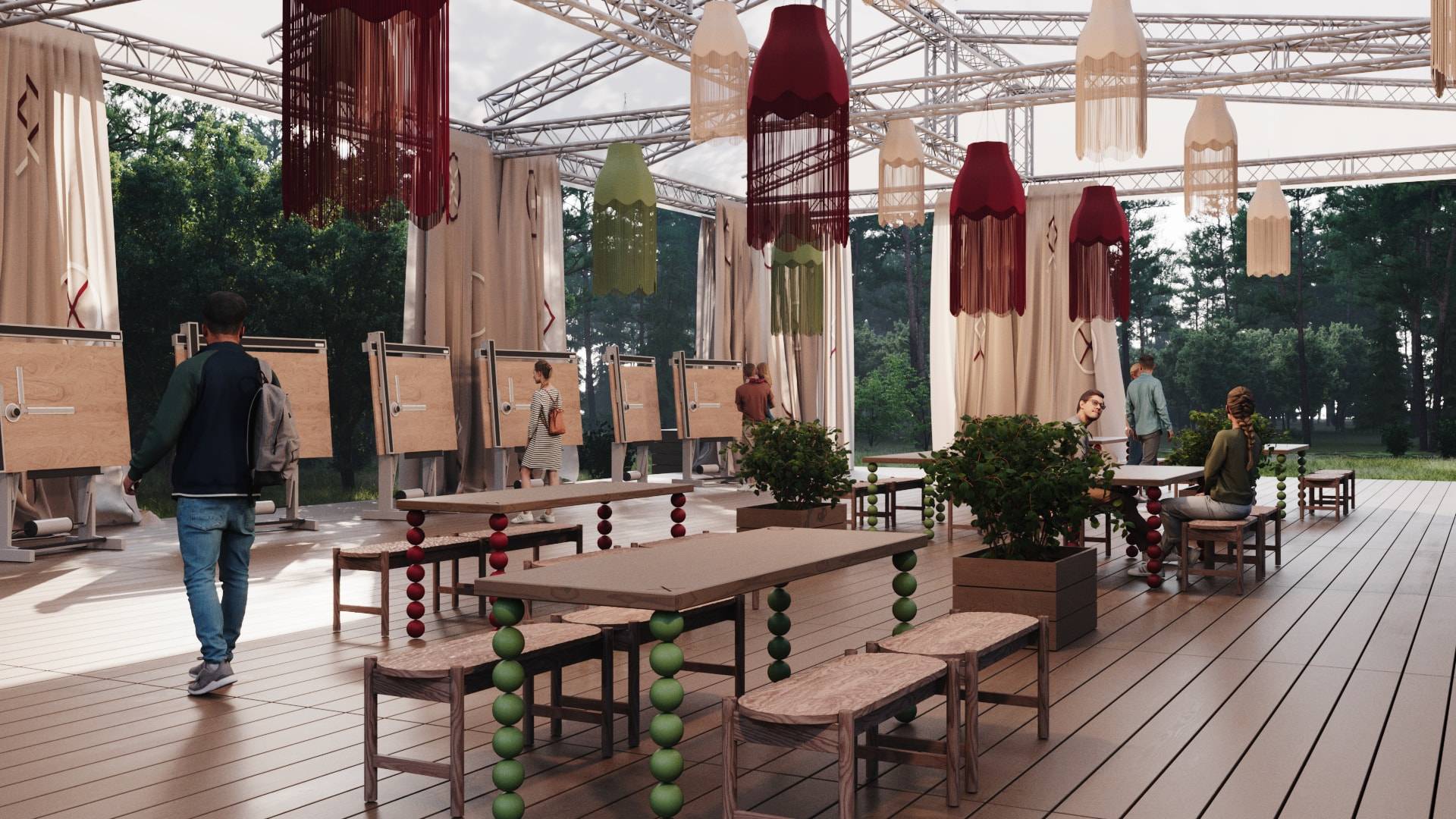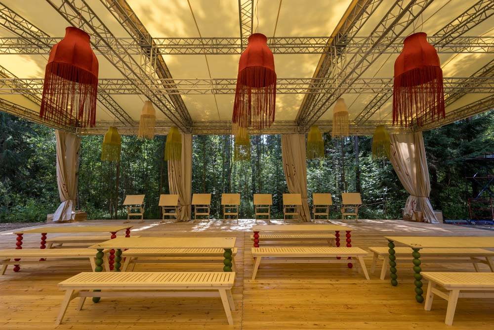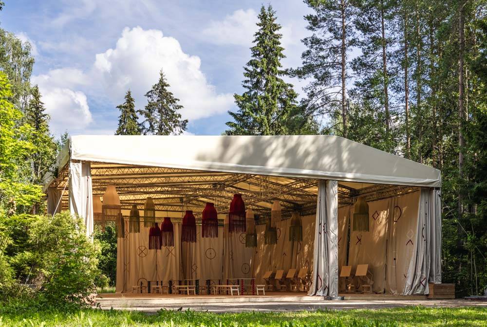 When creating the visual concept, special attention was paid to the aesthetics and details of famous dachas in the Kurortny District of St. Petersburg. Many decorative elements found at Bogdanov's former villa (Villa Anino) were integrated into the design of Archbesedka: icons and brand-name architraves. Several zones were created: the main space with large canvases, tables and easels for exhibitions; a relaxation area next to it with branded chairs and tables; and a campfire area with garland racks and lounge chairs.