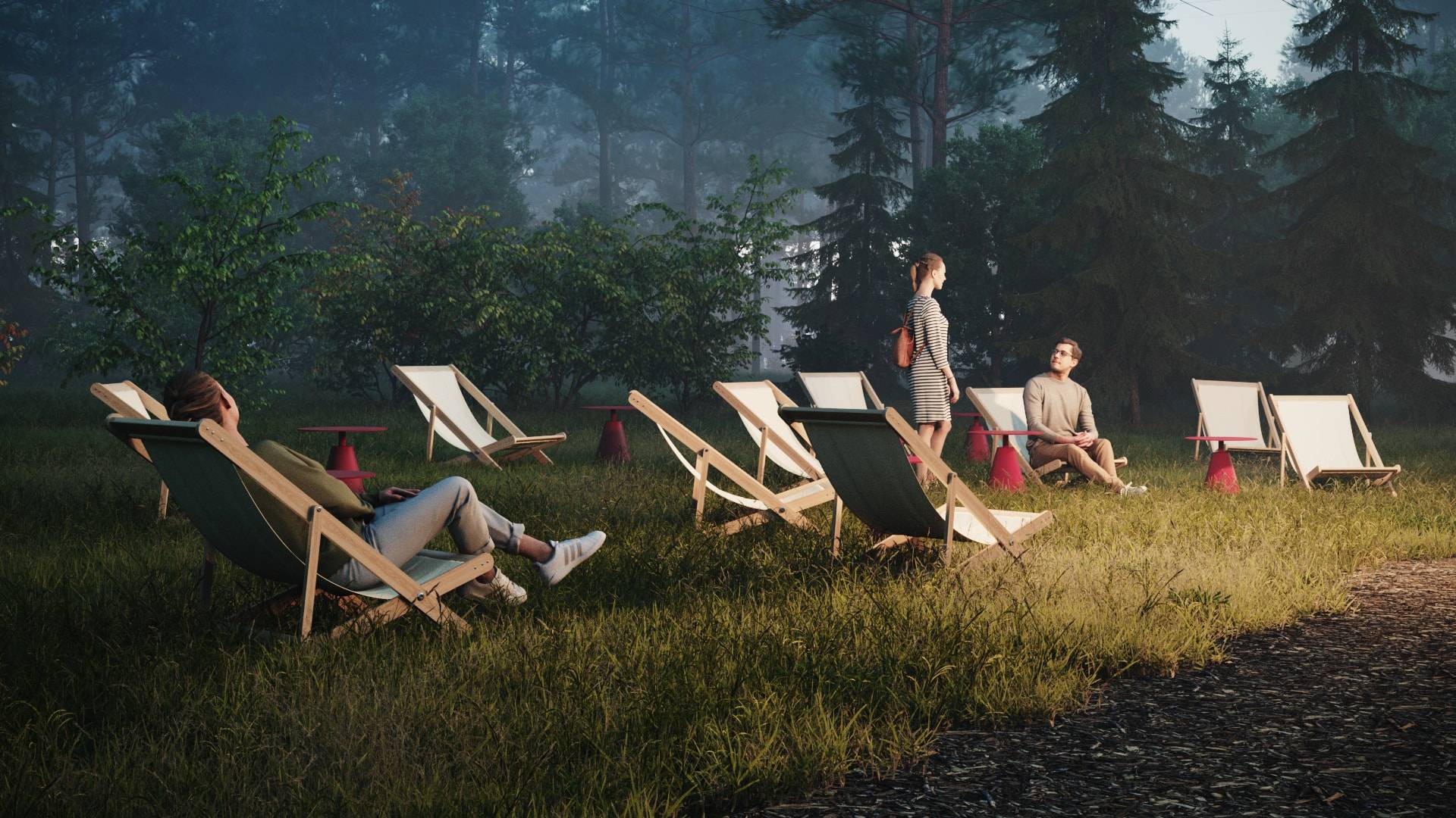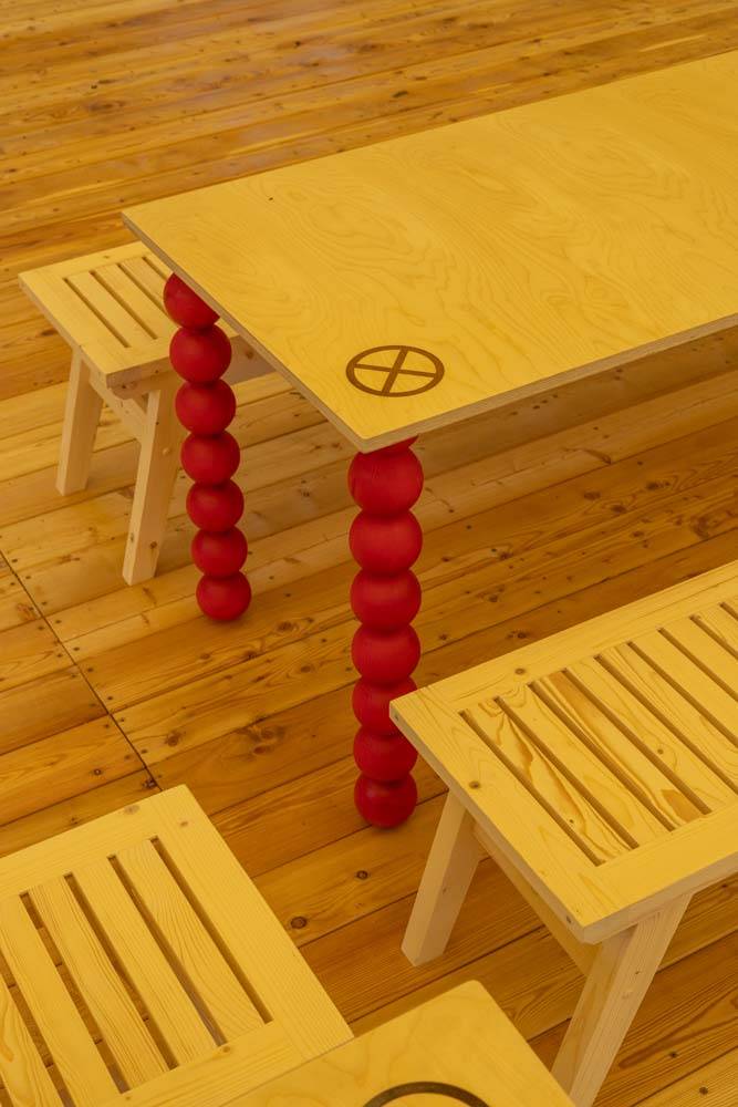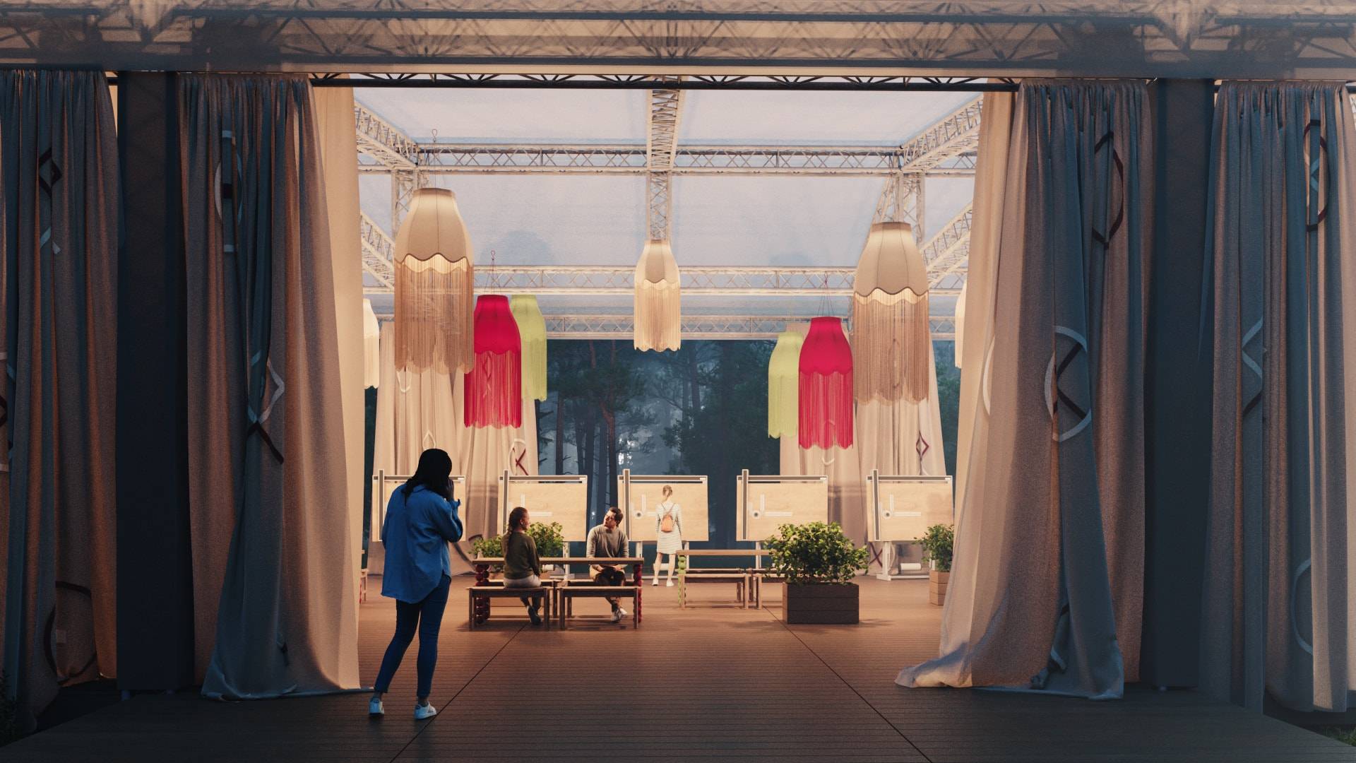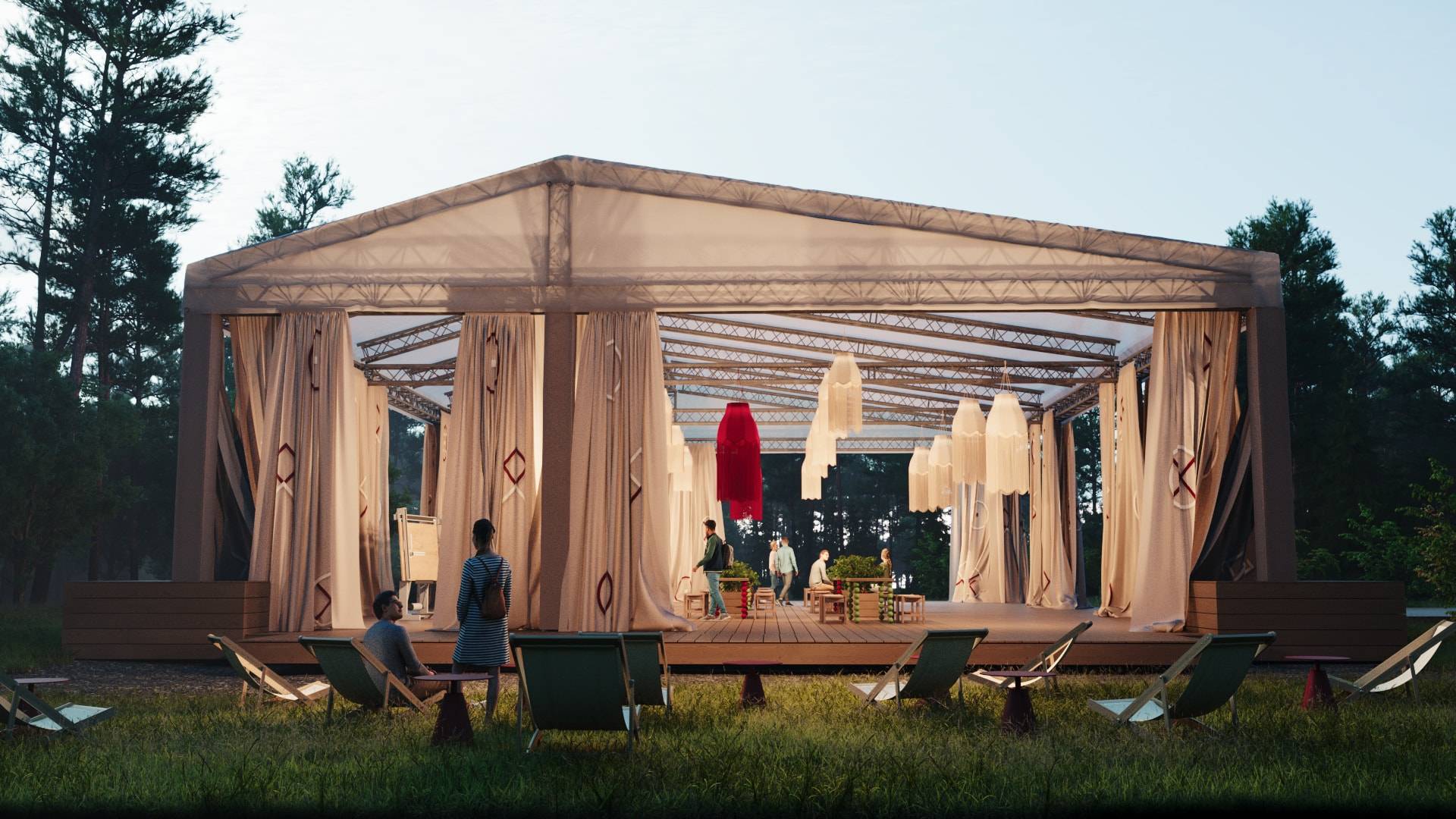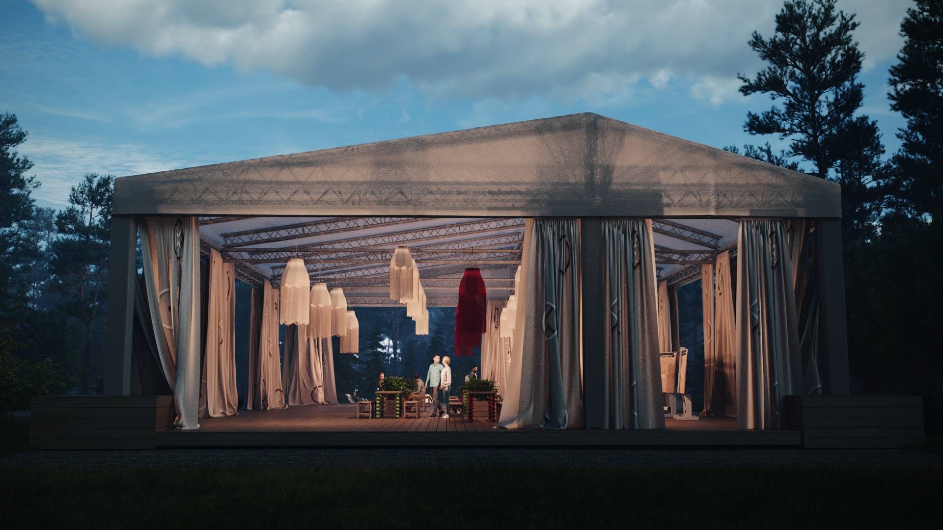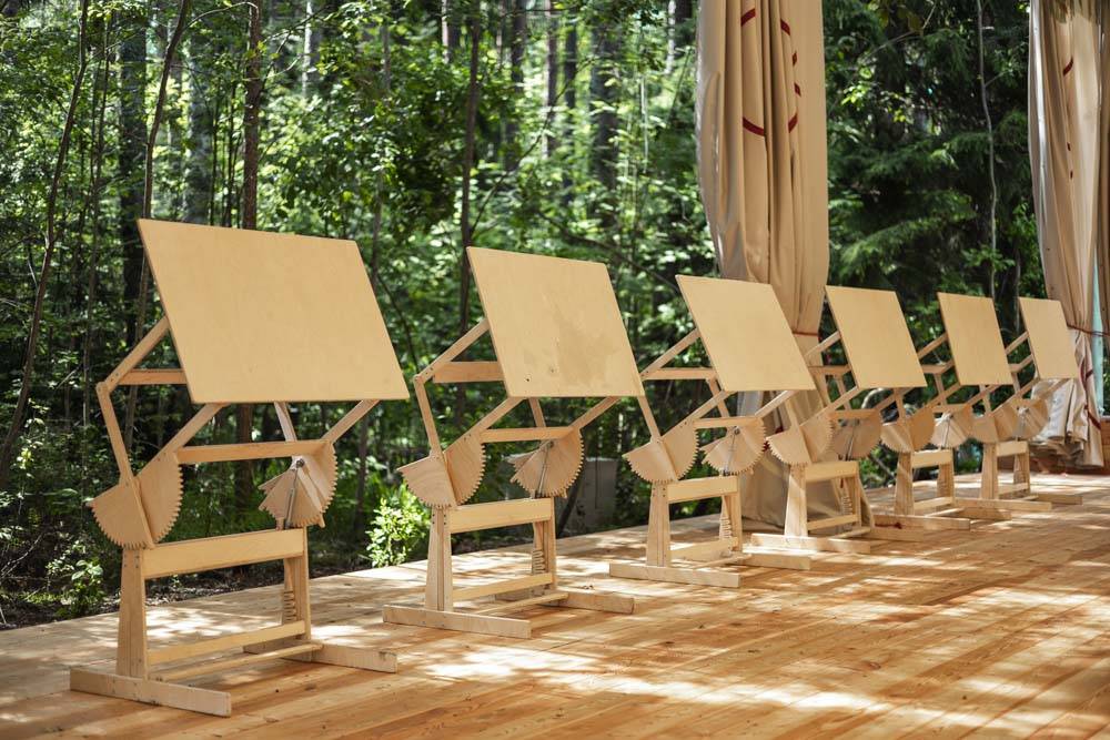 When creating the visual concept, special attention was paid to the aesthetics and details of famous dachas in the Kurortny District of St. Petersburg. Many decorative elements found at Bogdanov's former villa (Villa Anino) were integrated into the design of Archbesedka: icons and brand-name architraves. Several zones were created: the main space with large canvases, tables and easels for exhibitions; a relaxation area next to it with branded chairs and tables; and a campfire area with garland racks and lounge chairs.