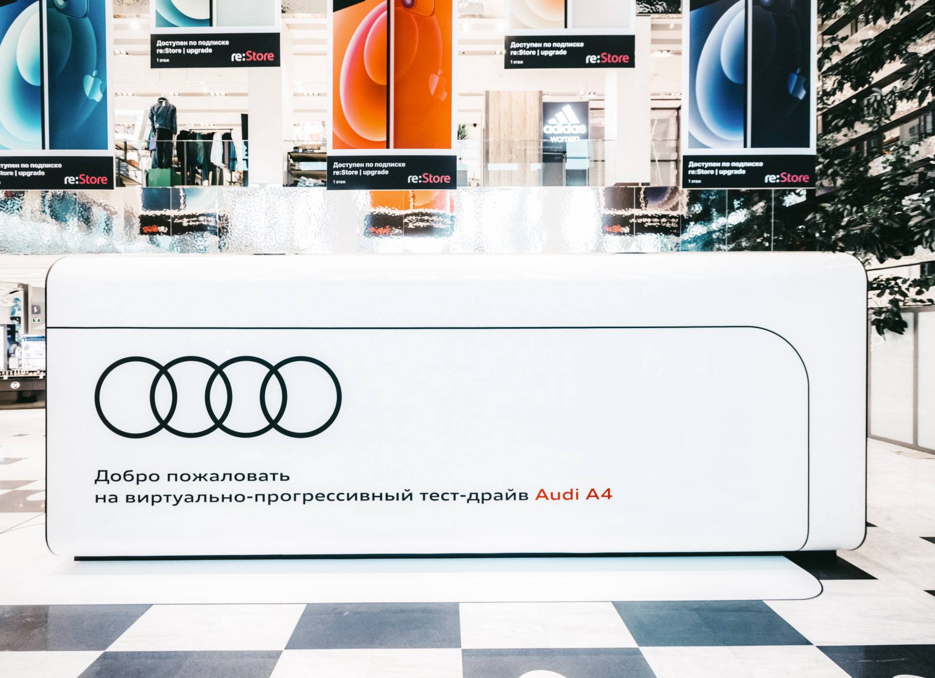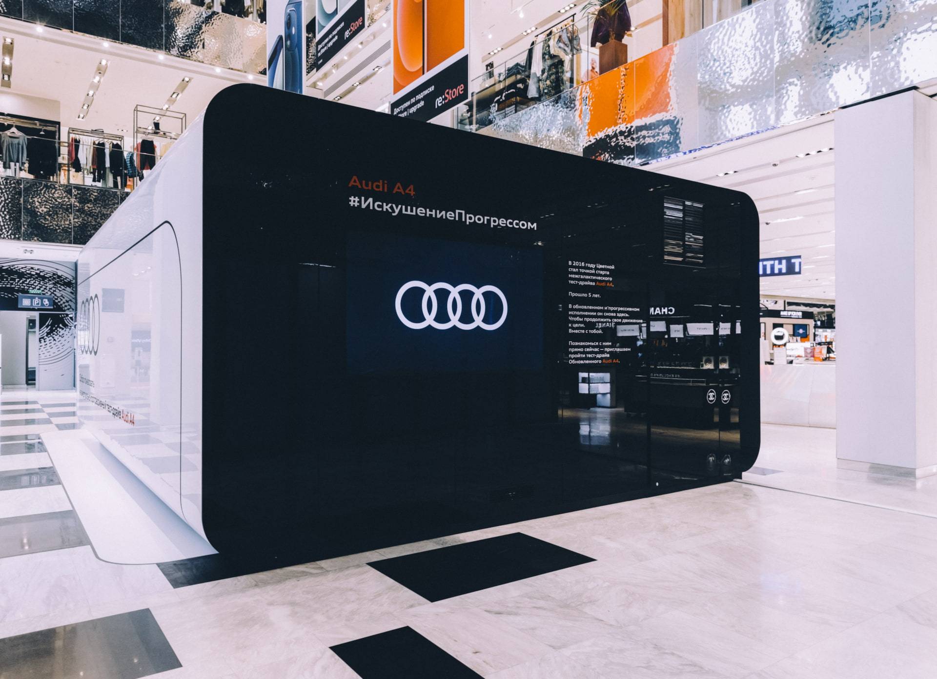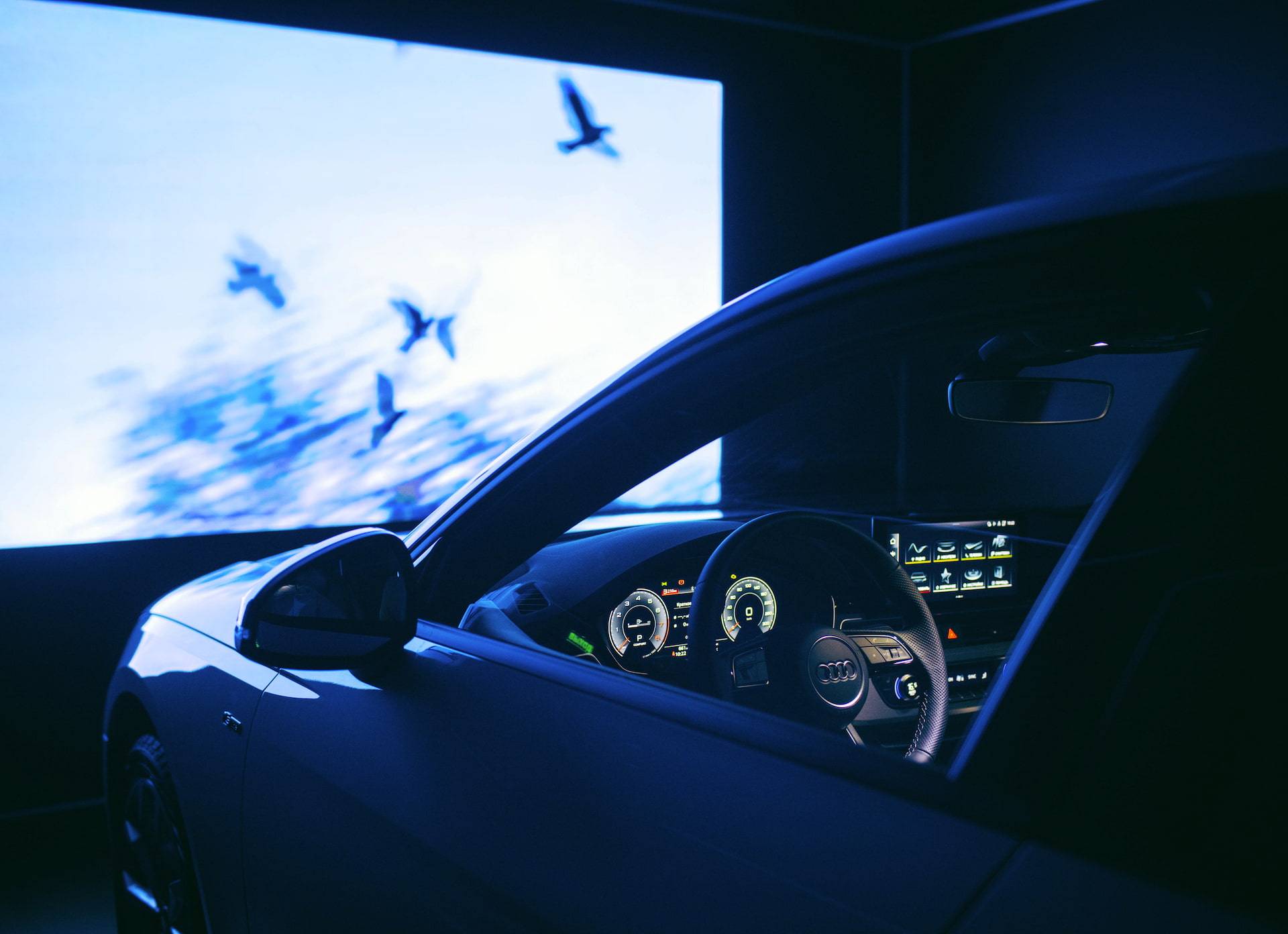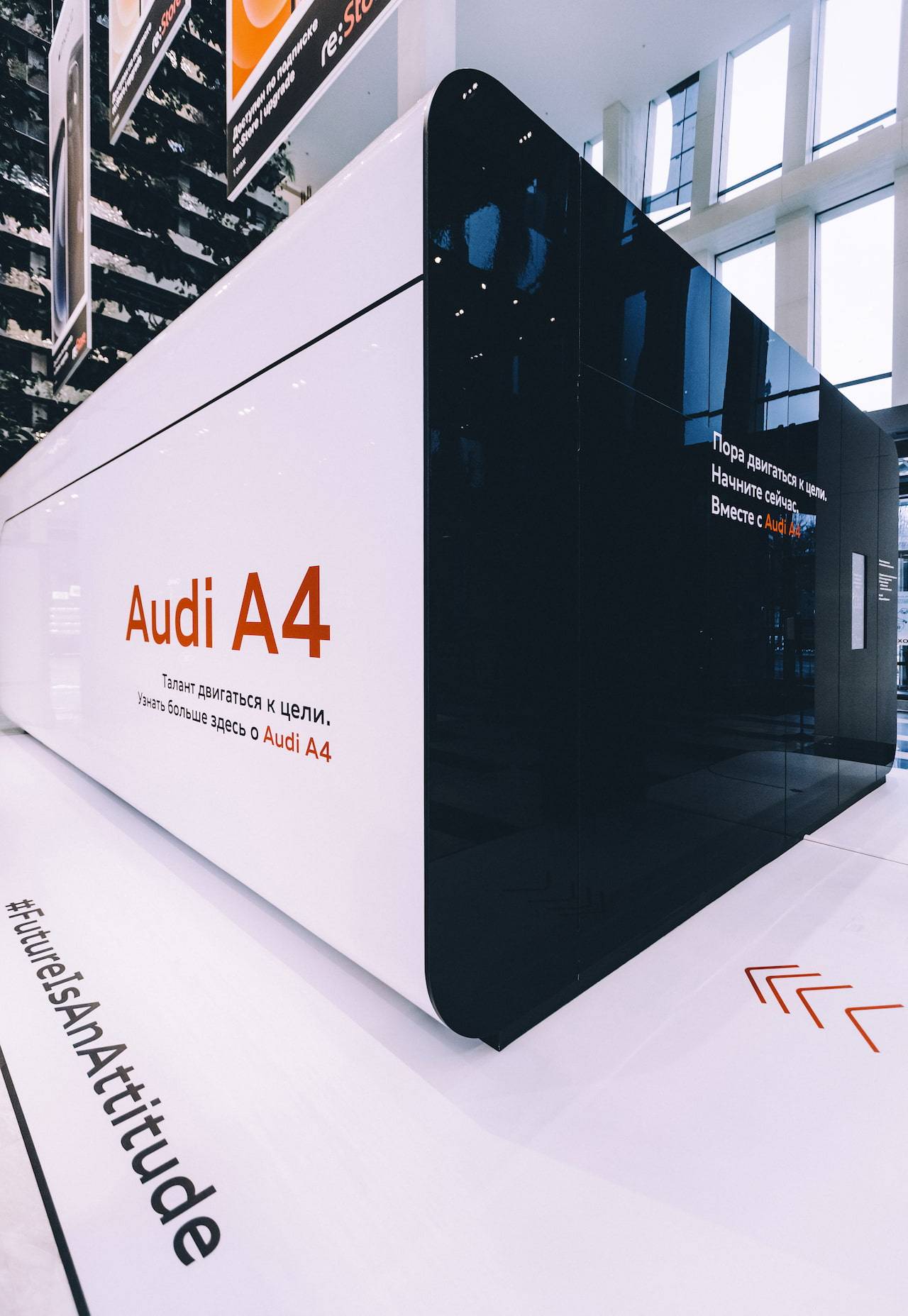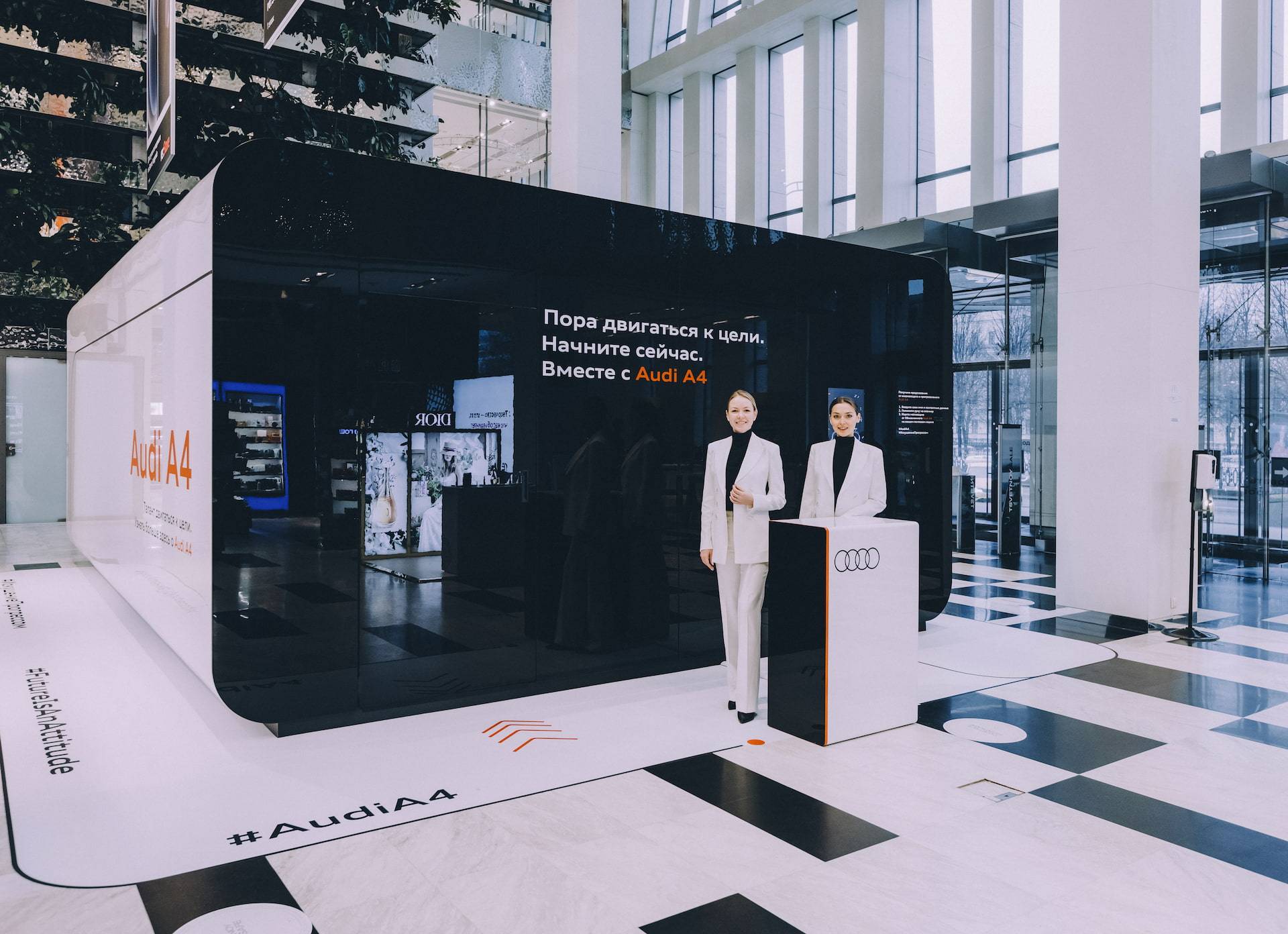 The presentation of the new Audi A4 car showcases the advanced technology and design of this model. From the outside, the stand looks like something alien, like an elegant space capsule – streamlined, white, with glossy black glass ends. Inside the stand there's a car that you can get into for a virtual test drive. In front of the car is a screen that shows various scenarios of the environment.