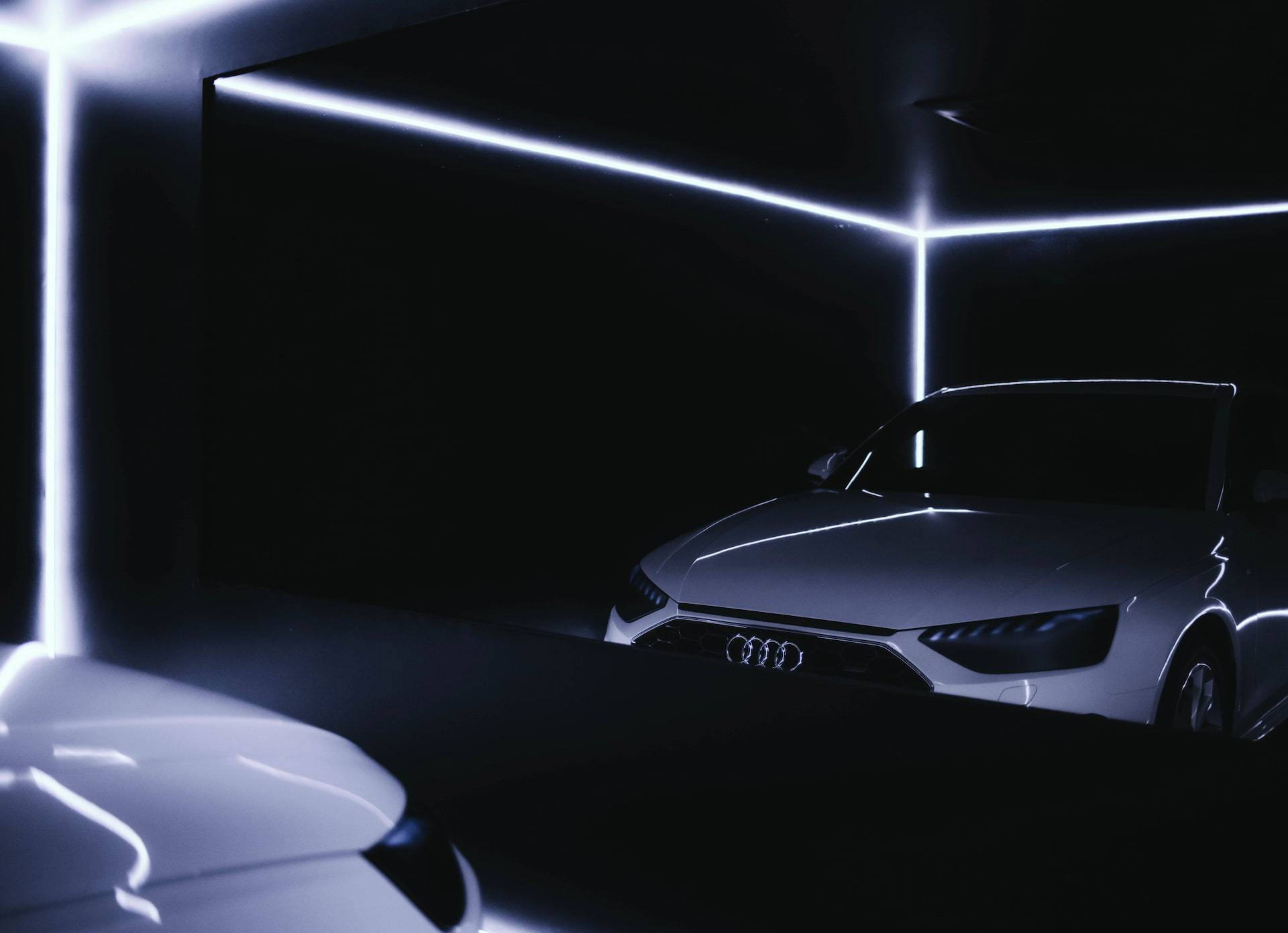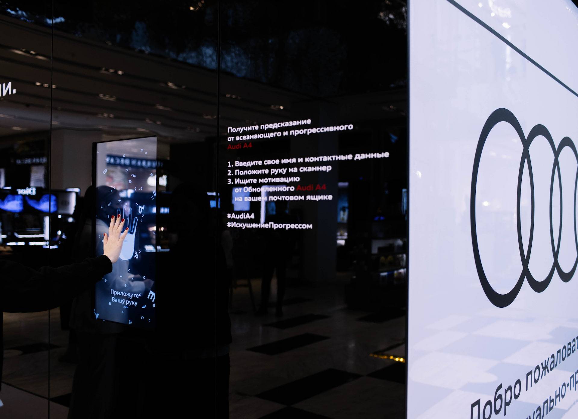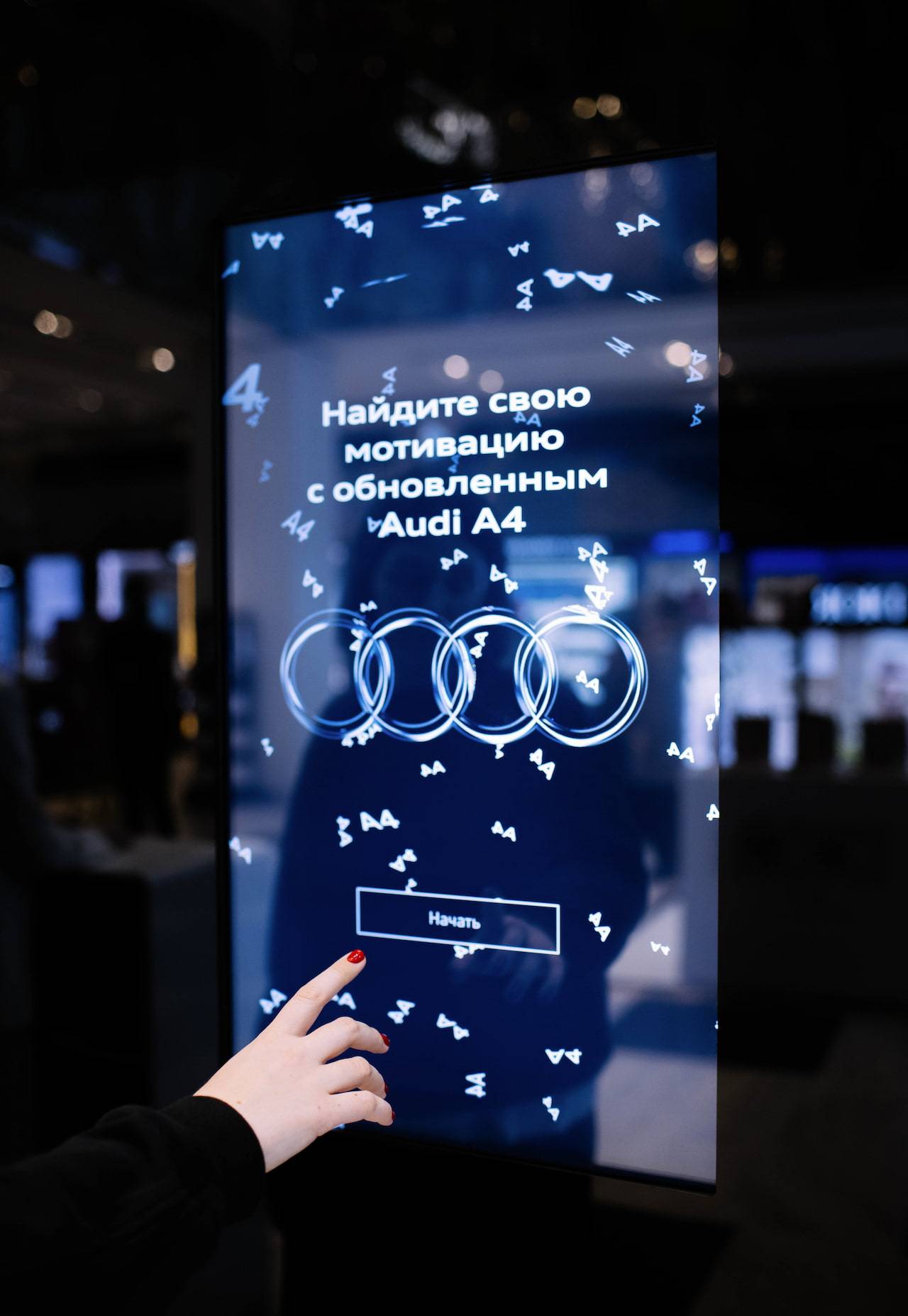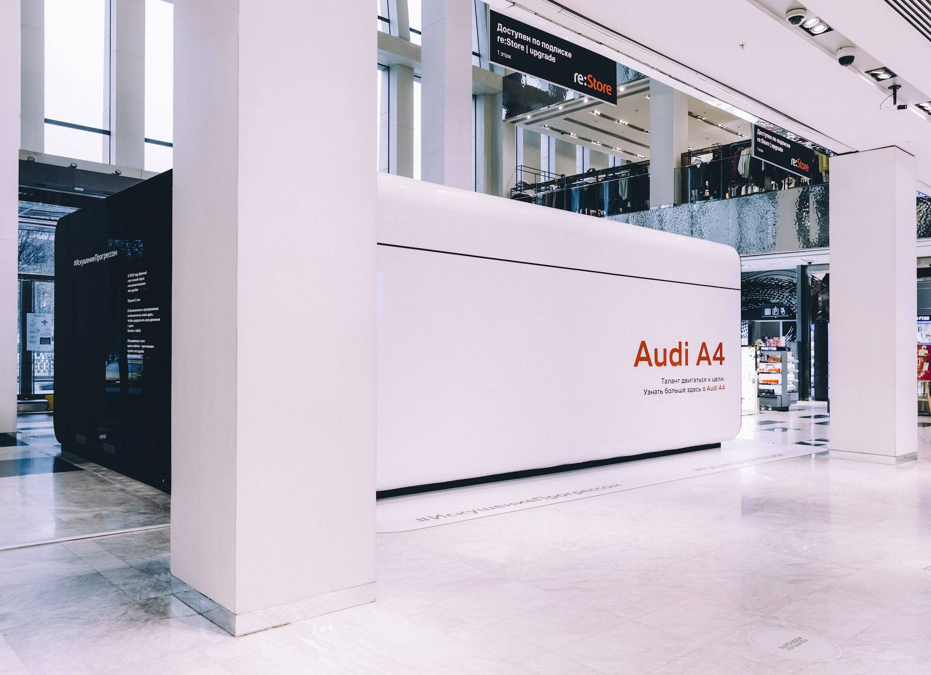 The presentation of the new Audi A4 car showcases the advanced technology and design of this model. From the outside, the stand looks like something alien, like an elegant space capsule – streamlined, white, with glossy black glass ends. Inside the stand there's a car that you can get into for a virtual test drive. In front of the car is a screen that shows various scenarios of the environment.