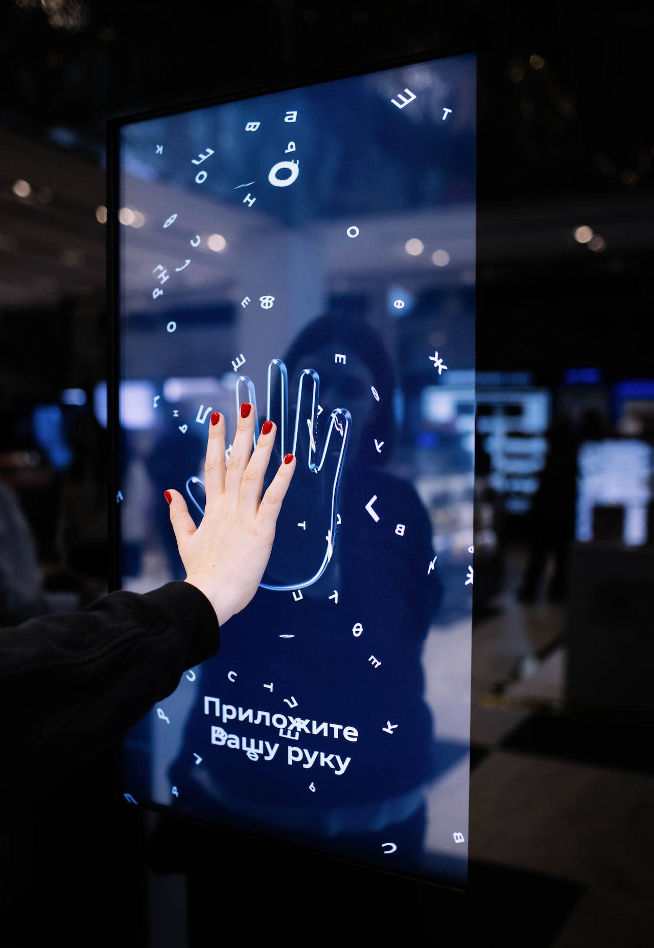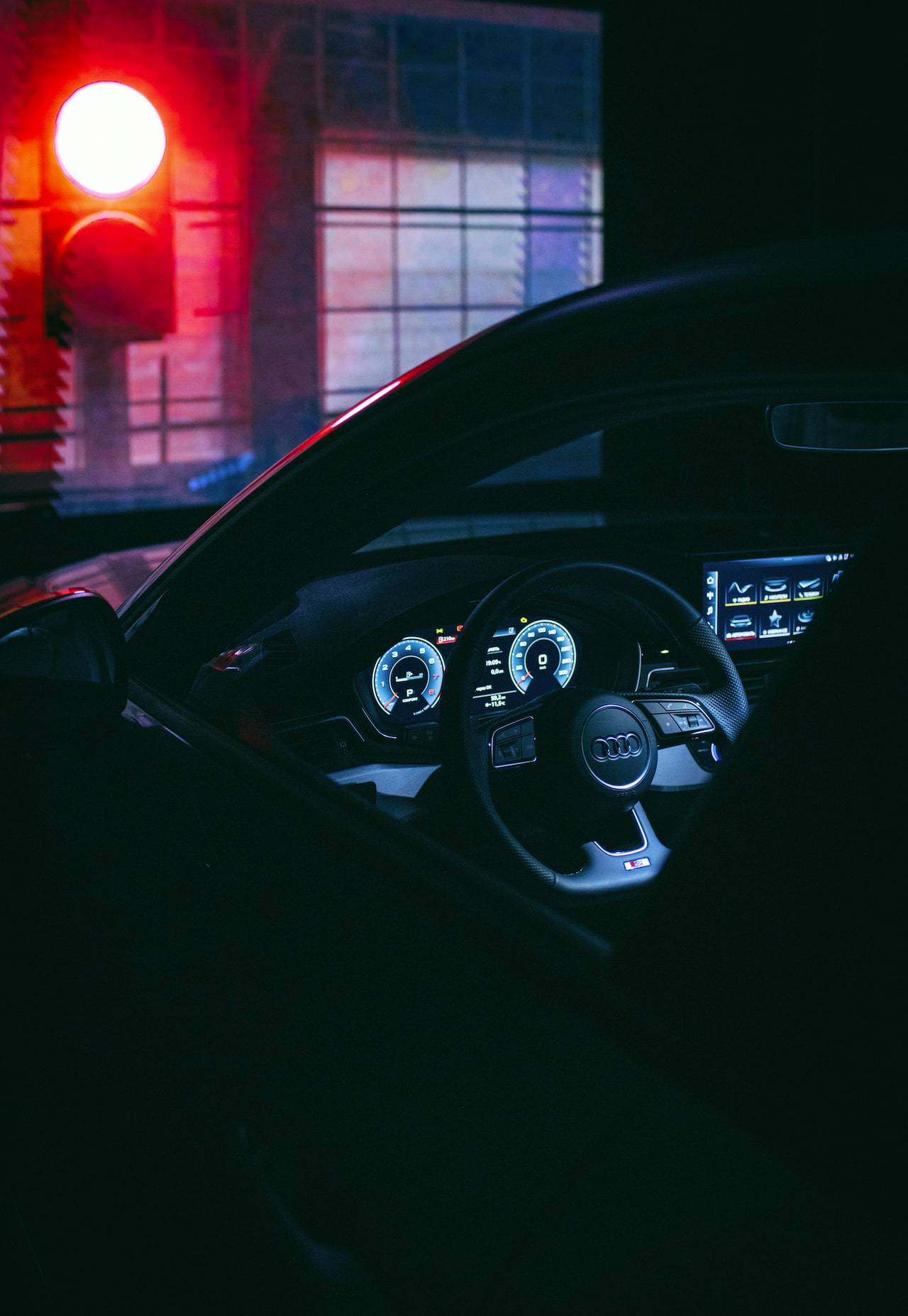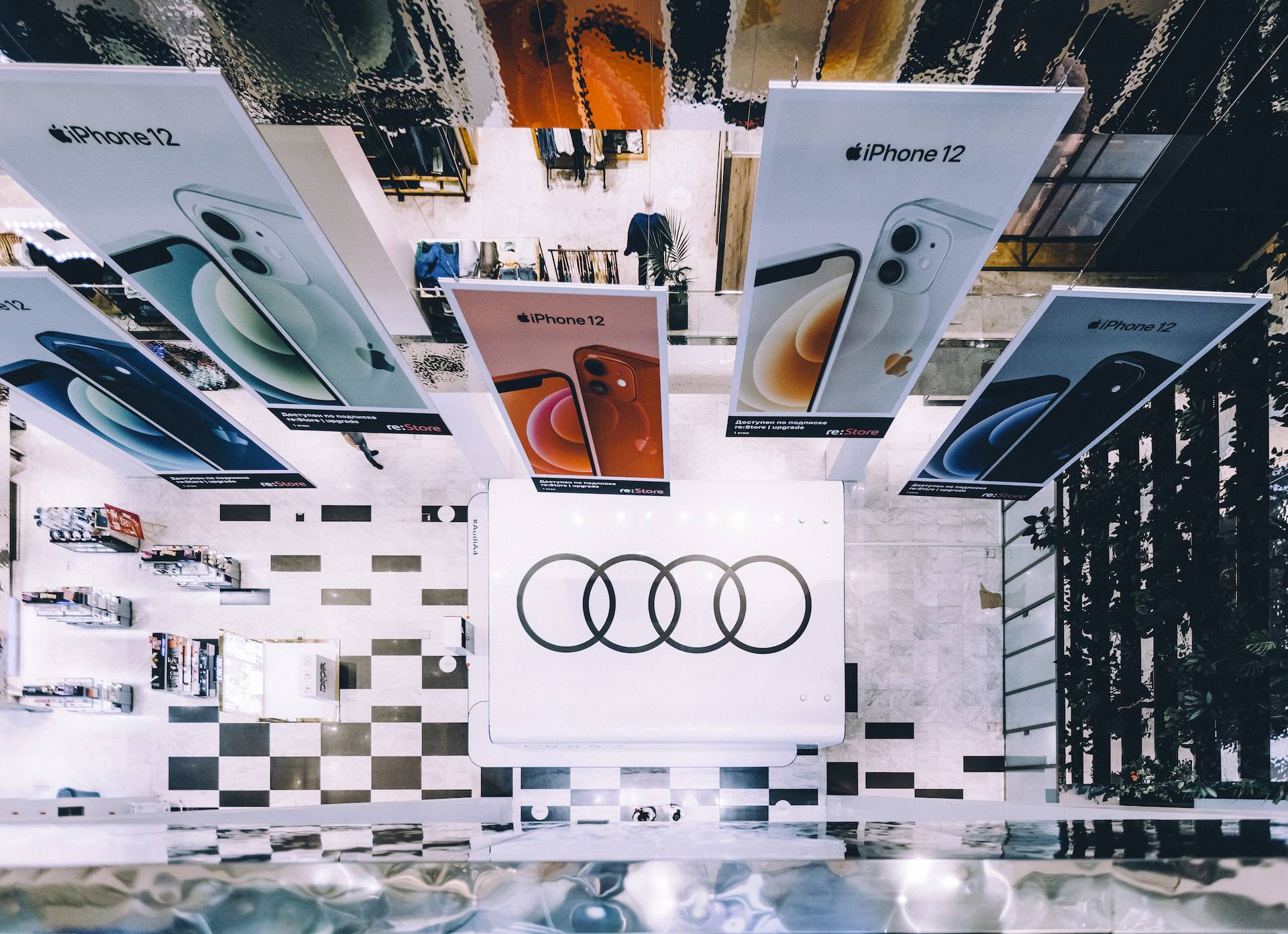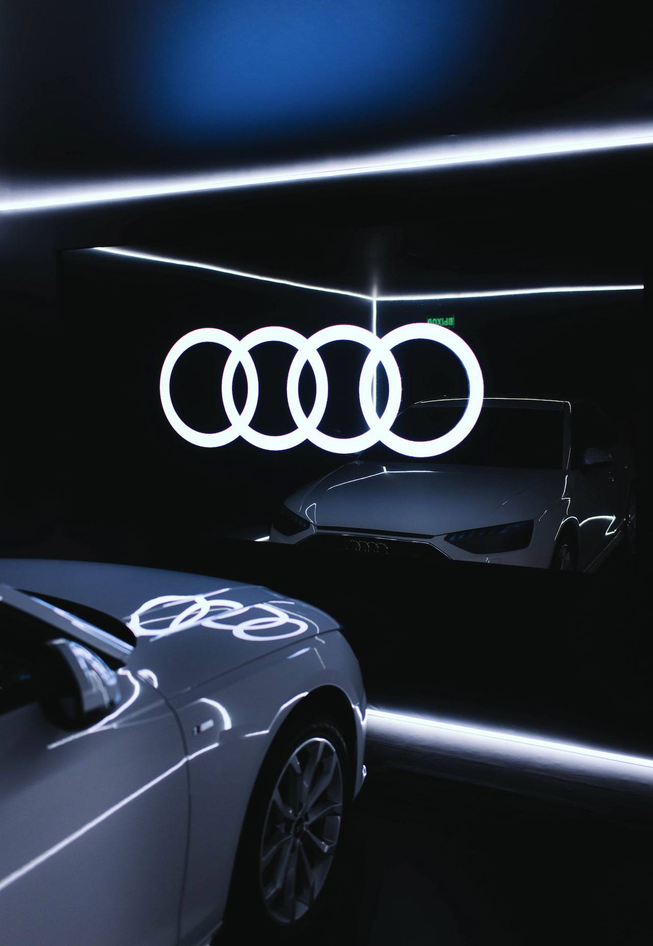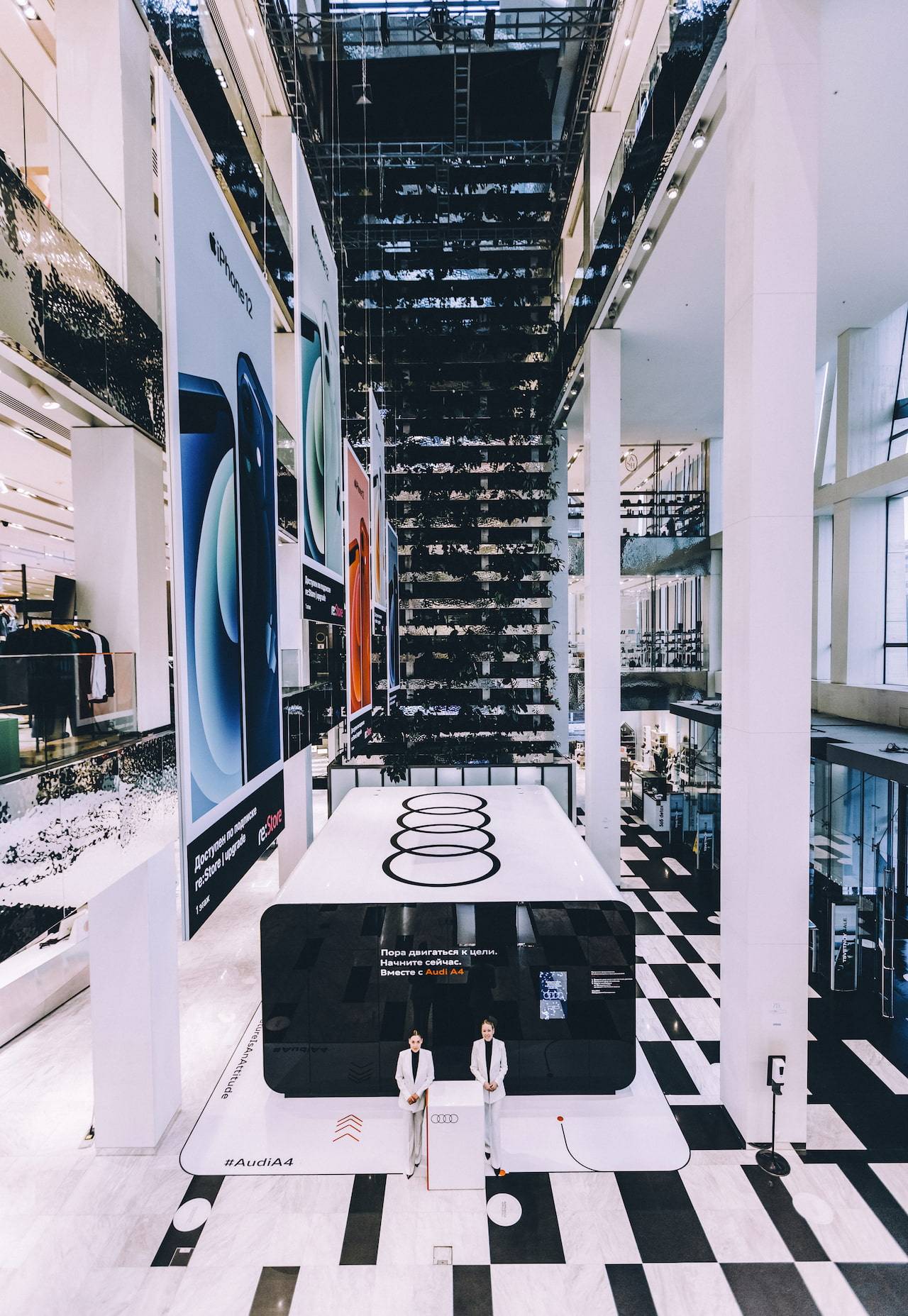 The presentation of the new Audi A4 car showcases the advanced technology and design of this model. From the outside, the stand looks like something alien, like an elegant space capsule – streamlined, white, with glossy black glass ends. Inside the stand there's a car that you can get into for a virtual test drive. In front of the car is a screen that shows various scenarios of the environment.