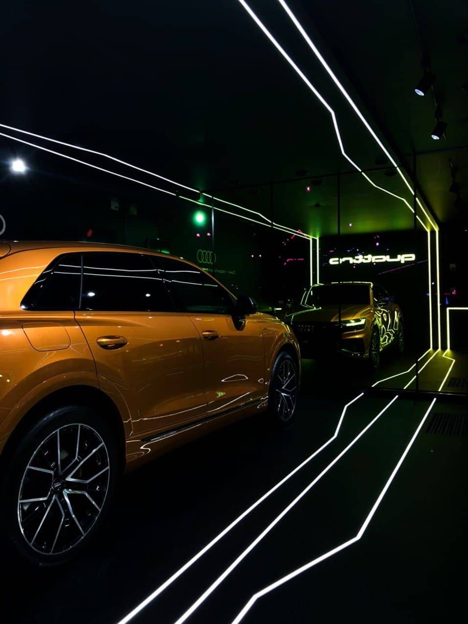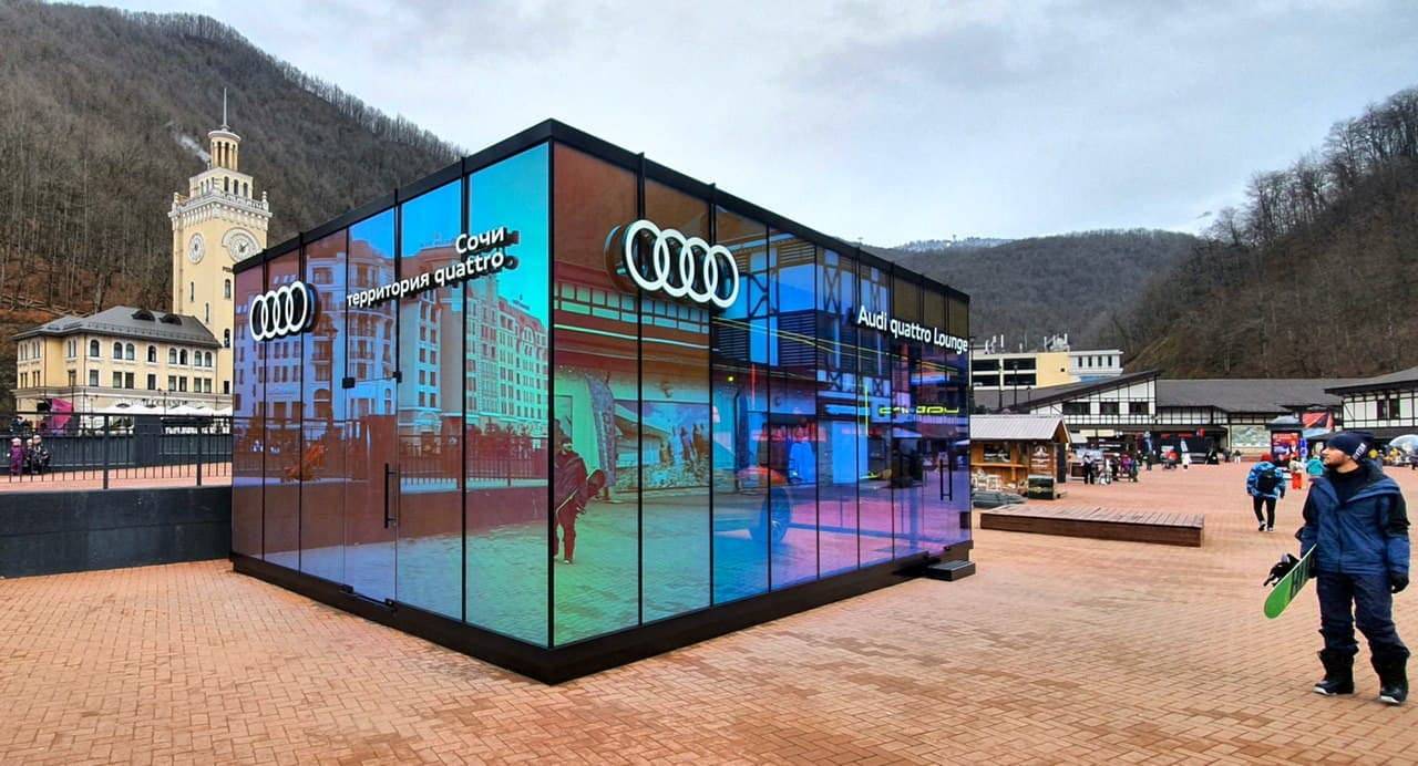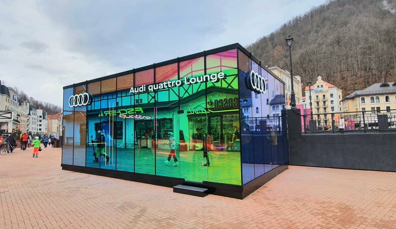 Audi Quattro Lounge, a brand pavilion in the form of a pop-up showroom located in Rosa Khutor, Sochi. Design concept of the brand pavilion highlights the bright and eye-catching design of DRAGON ORANGE Audi Q8. The cube exterior is covered with holographic reflective coating while the cube interior has a futuristic black design with led lights.