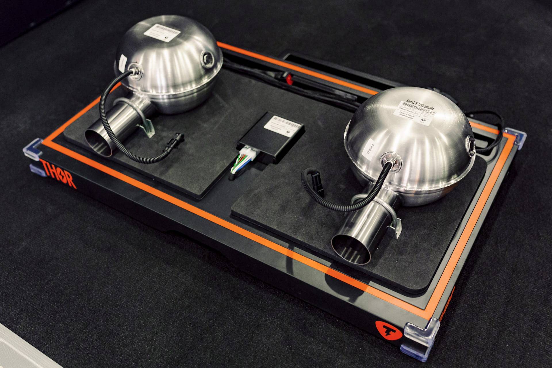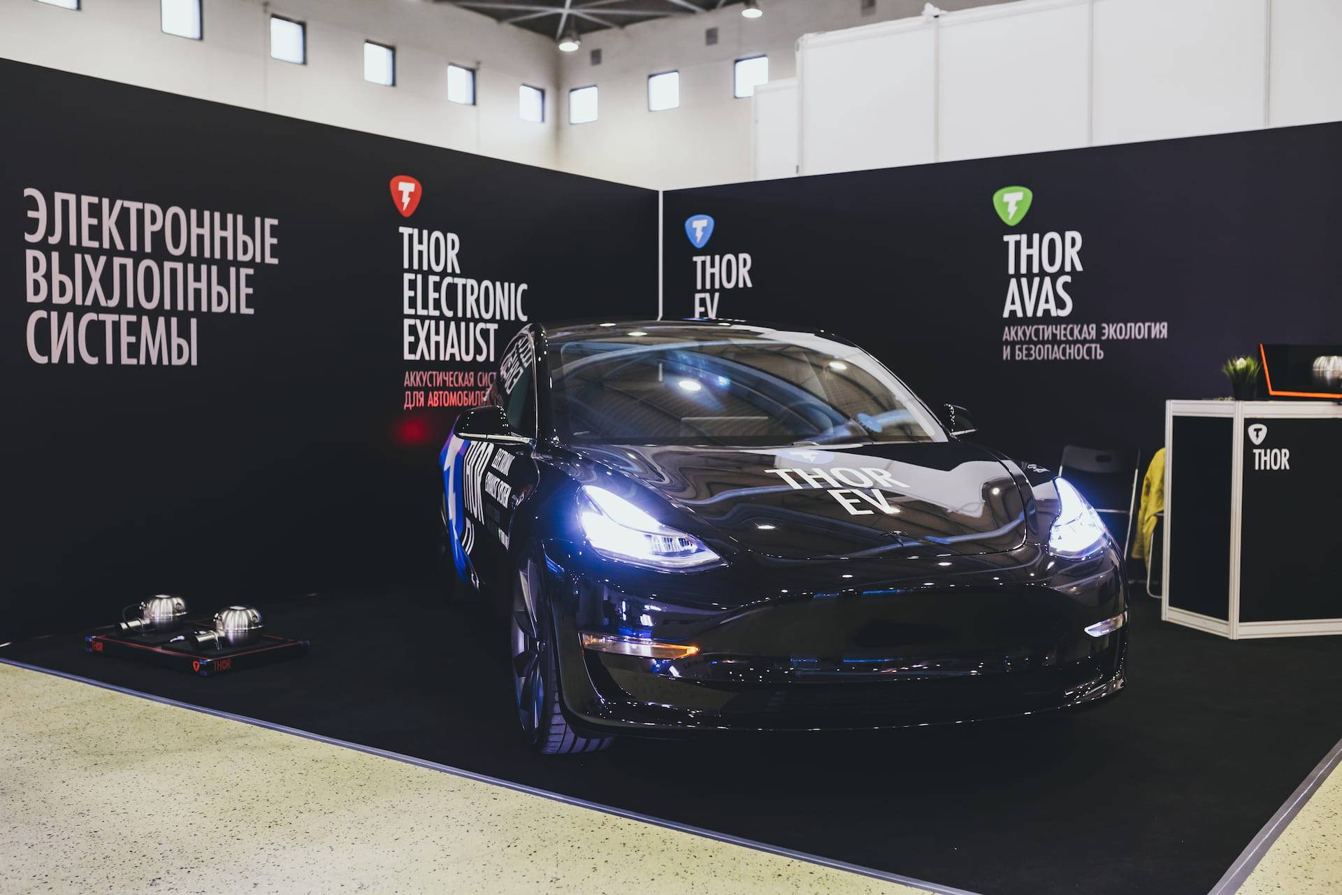 Exhibition booth designed for Electronic exhaust system THOR at ElectroTrans exhibition hosted in Moscow, 2021. Exhibition stall was designed to demonstrate the sound of THOR exhaust system on any available car without installing this acoustic system at the car bottom. Compact dark gray platform with LED lighting highlights the exceptional features of the product.