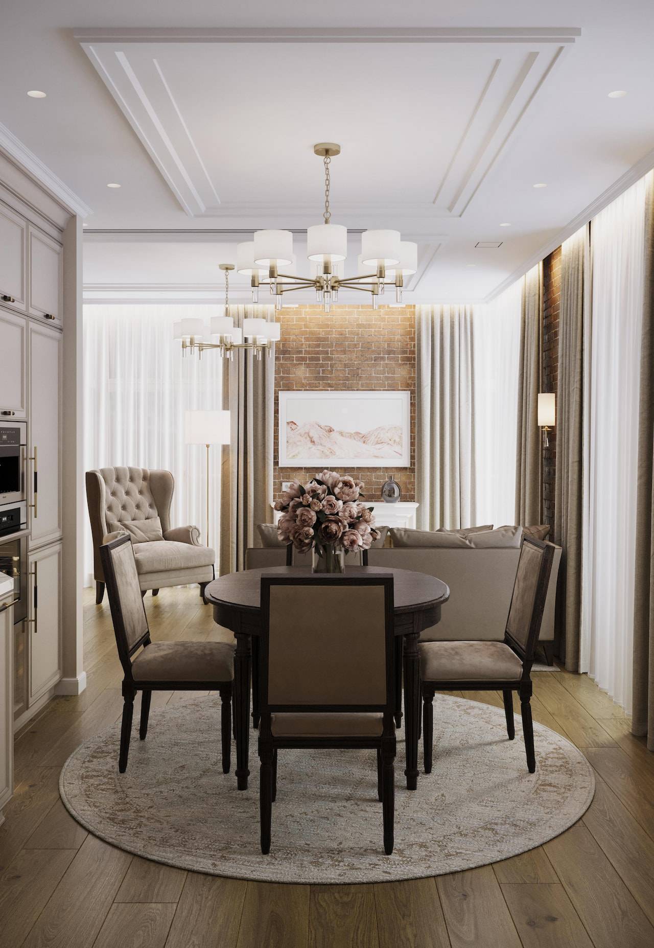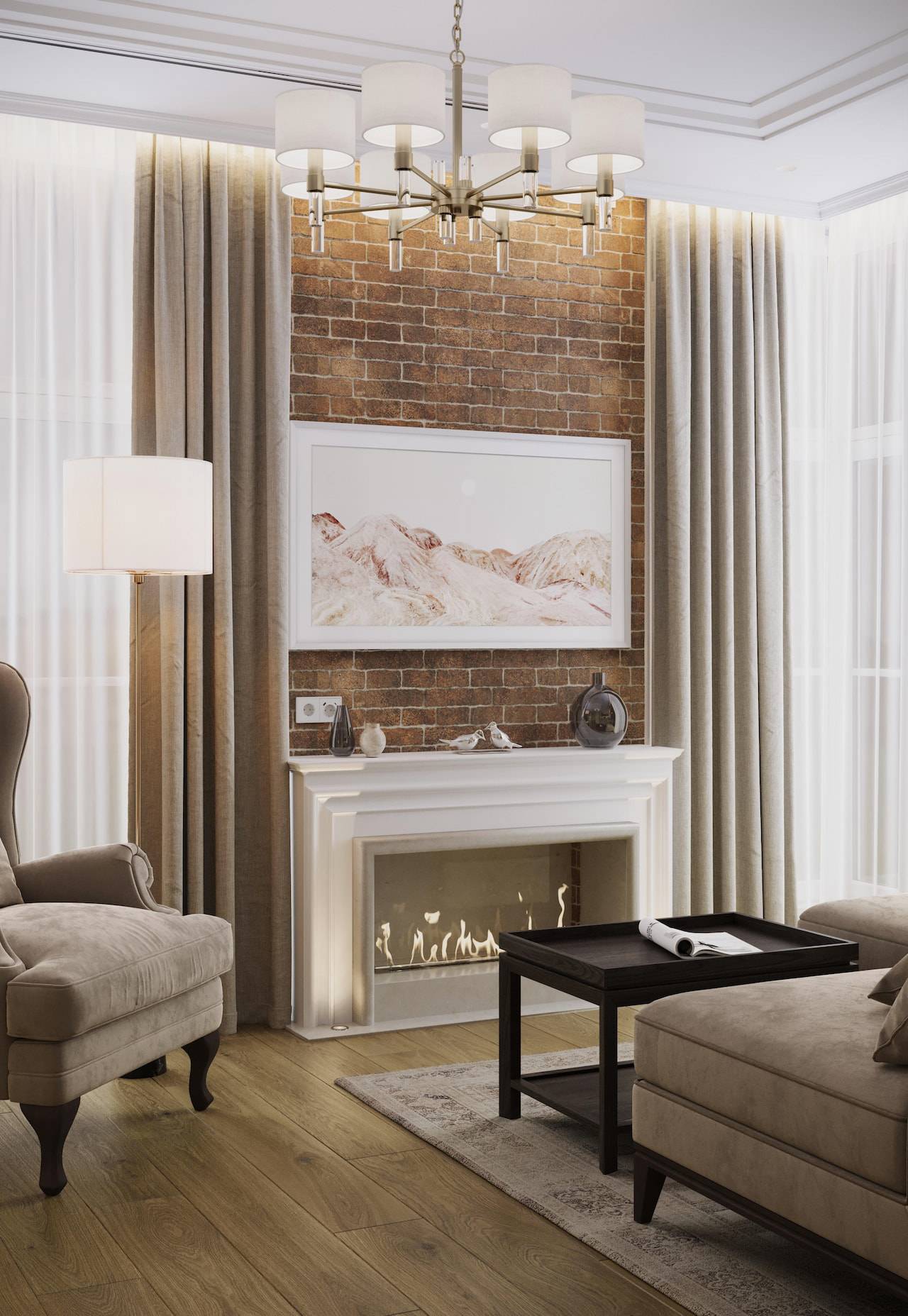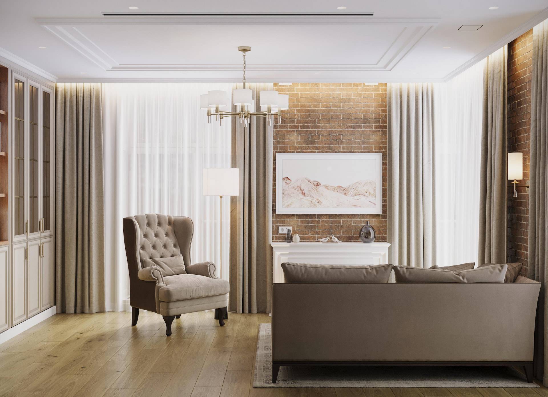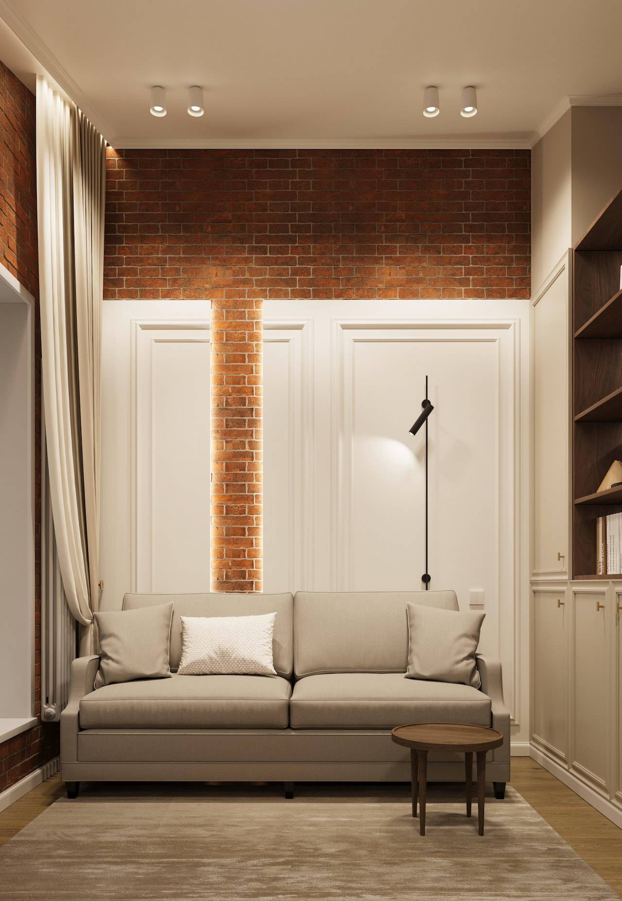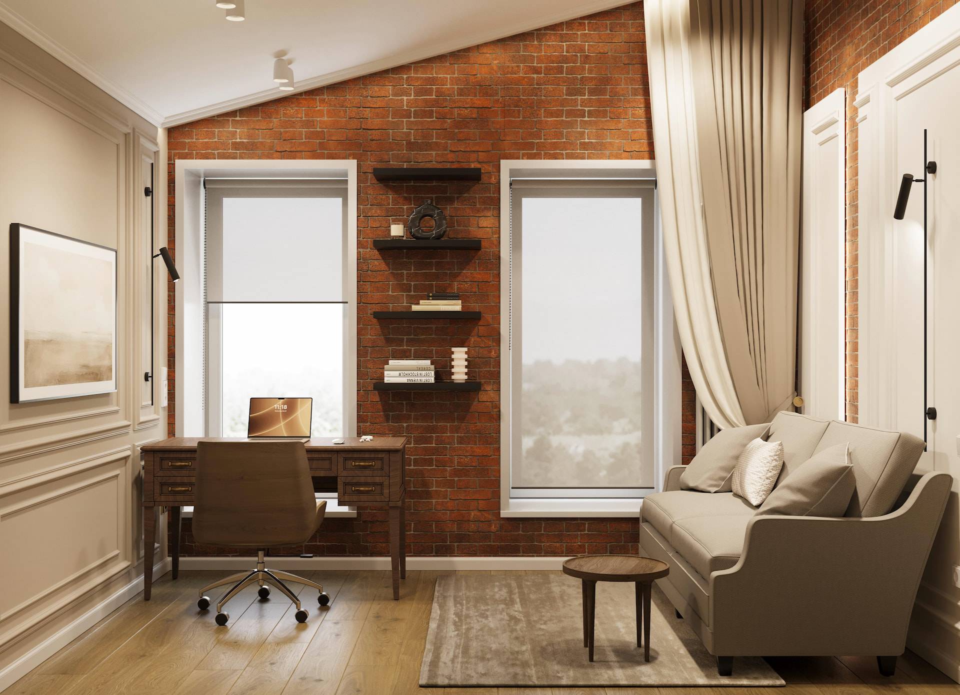 The three-story townhouse, in the American classic style, includes elements of loft styles. It combines classic moldings and trims on the walls, multilevel lighting, and a restrained color scheme, typical of American classics. While brick walls and a brutal bathroom with grey stone and black plumbing are typically of loft style. The house was designed for comfortable family living, each bedroom has its own dressing room and bathroom. The kitchen-living area takes center stage in the house as the house owner enjoys cooking and has guests over.