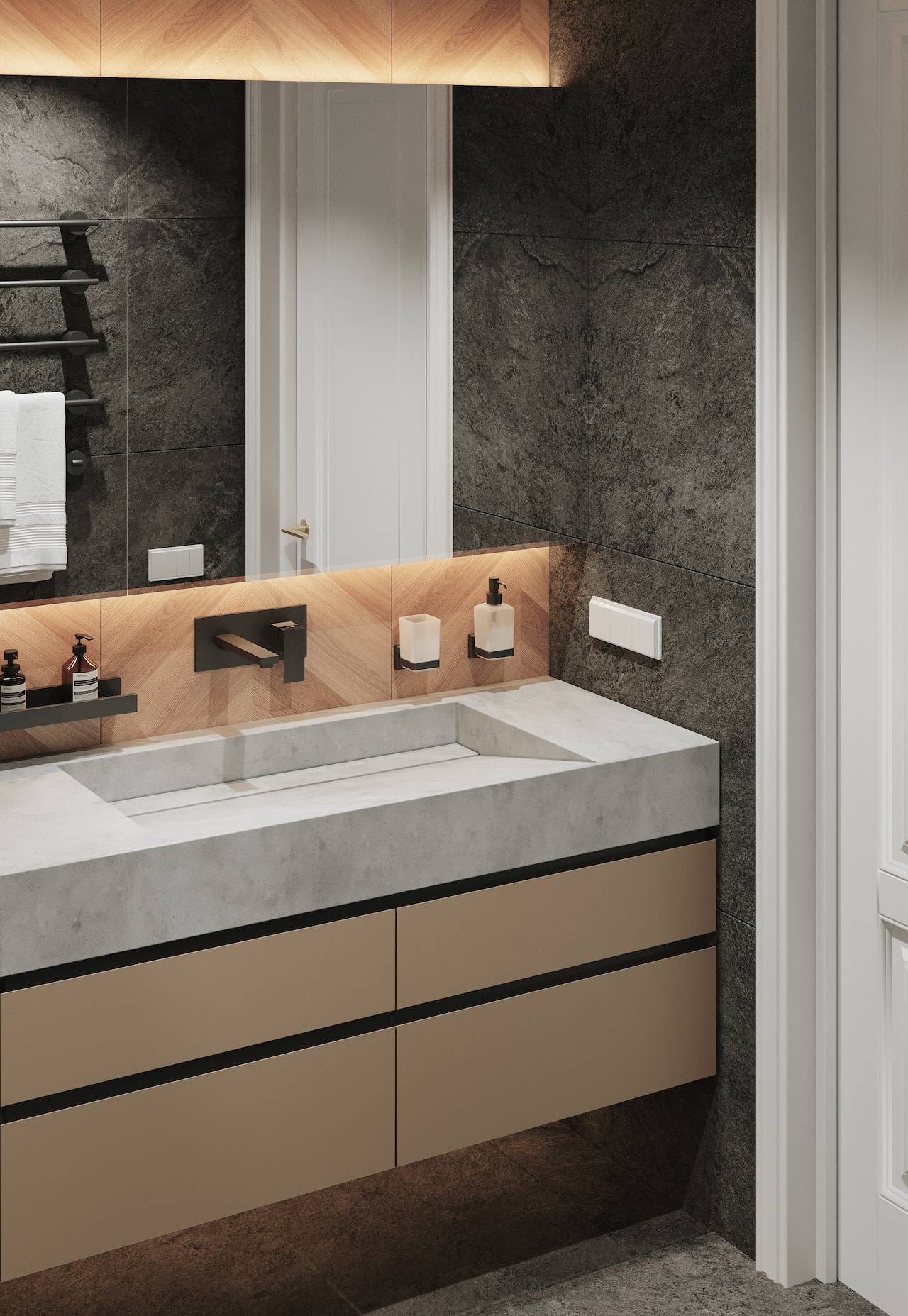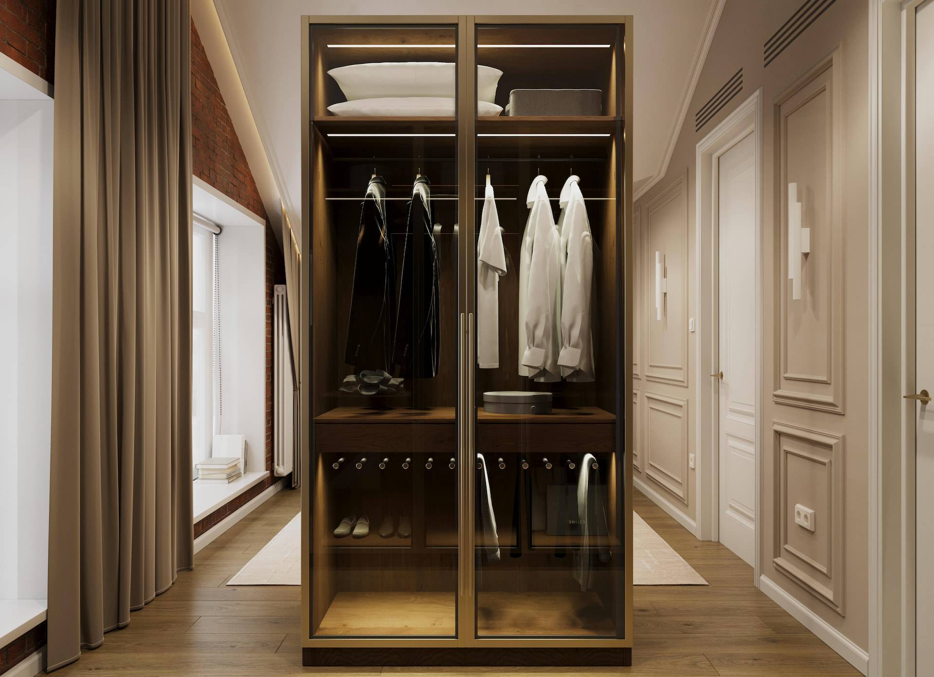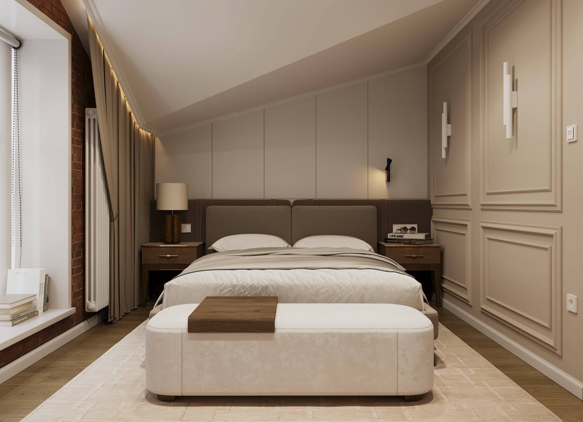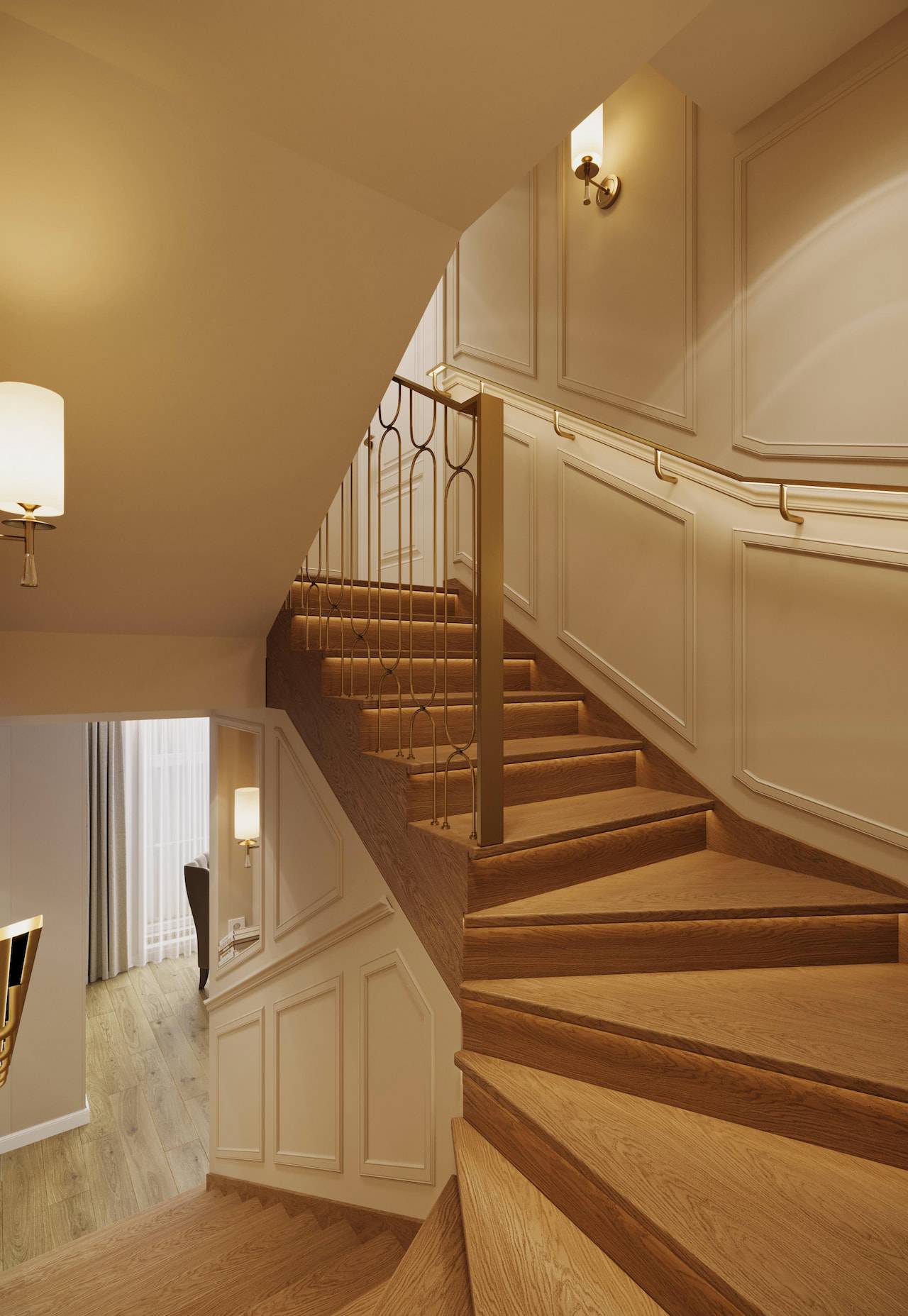 The three-story townhouse, in the American classic style, includes elements of loft styles. It combines classic moldings and trims on the walls, multilevel lighting, and a restrained color scheme, typical of American classics. While brick walls and a brutal bathroom with grey stone and black plumbing are typically of loft style. The house was designed for comfortable family living, each bedroom has its own dressing room and bathroom. The kitchen-living area takes center stage in the house as the house owner enjoys cooking and has guests over.