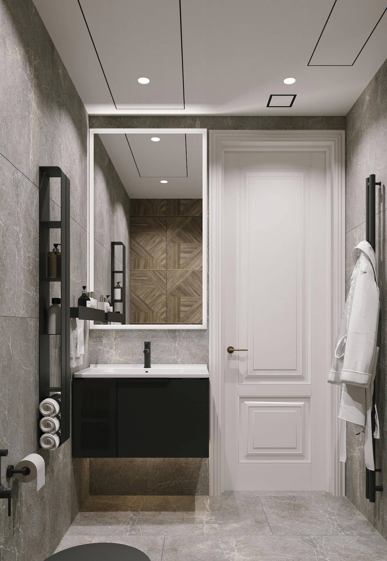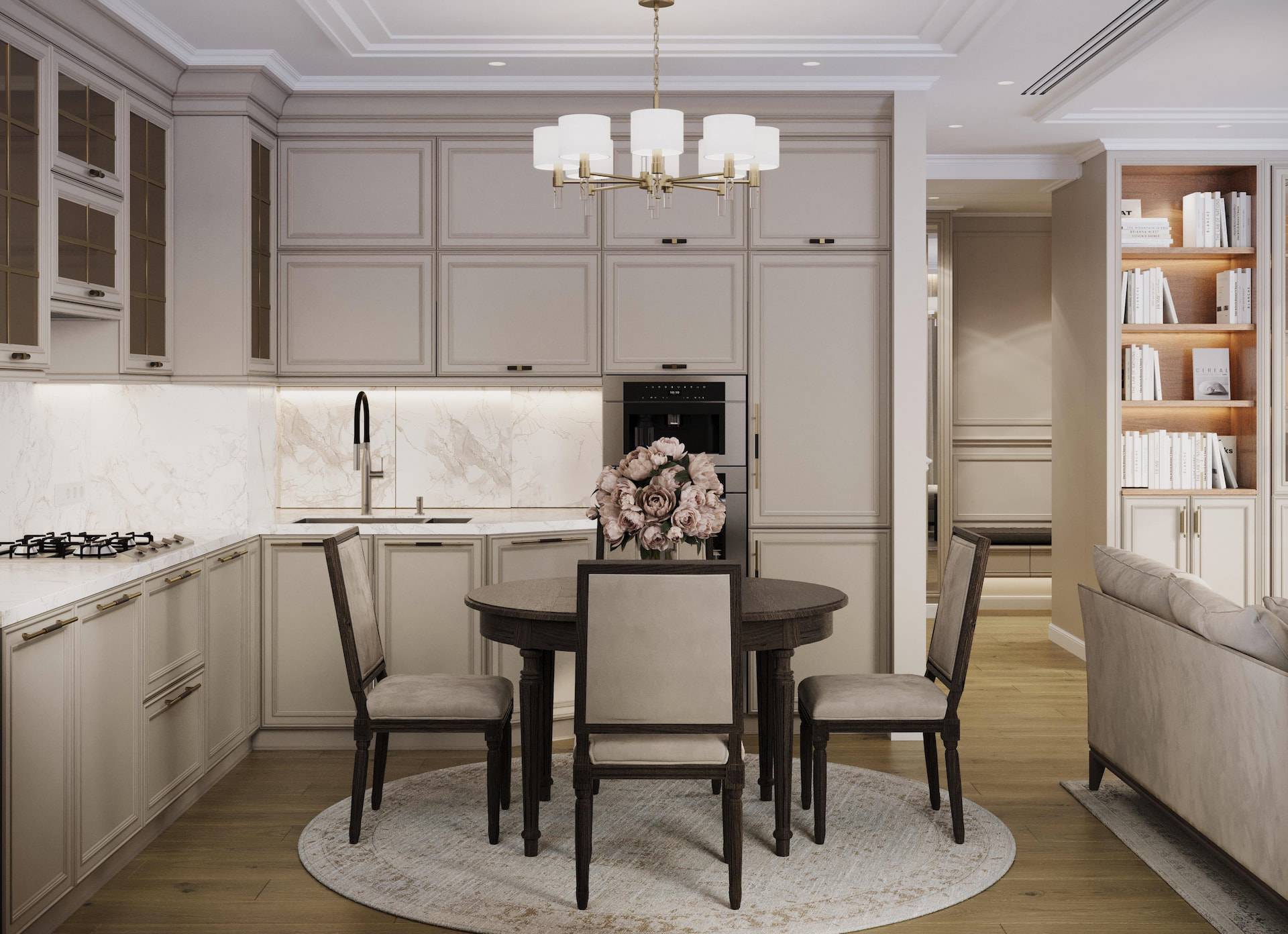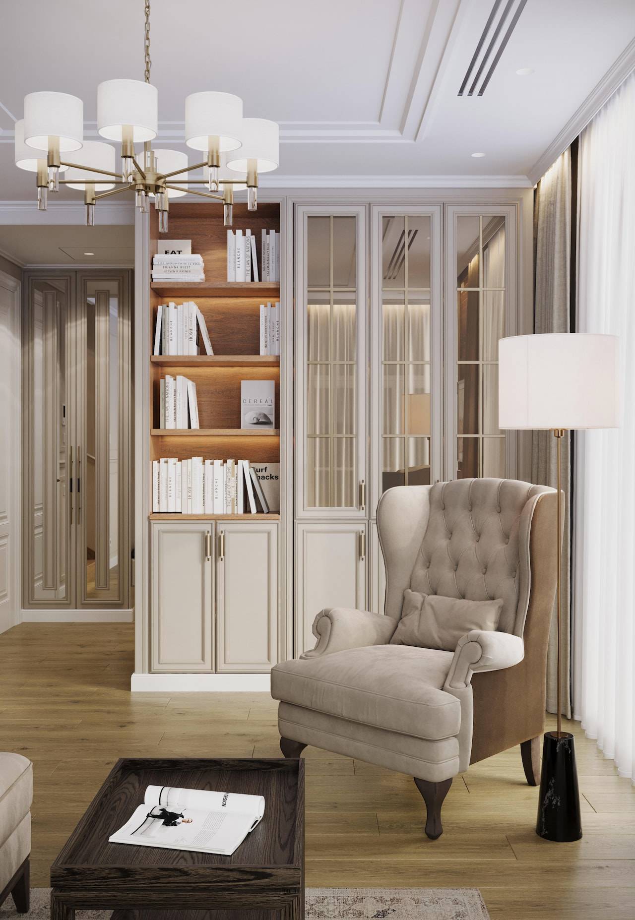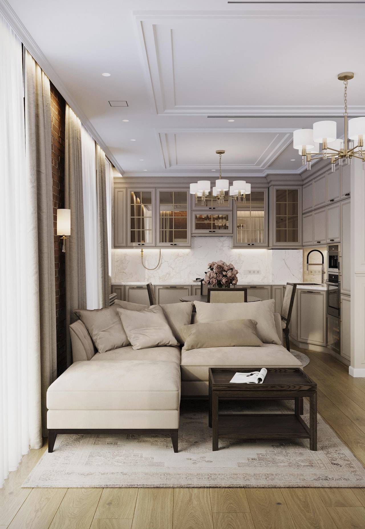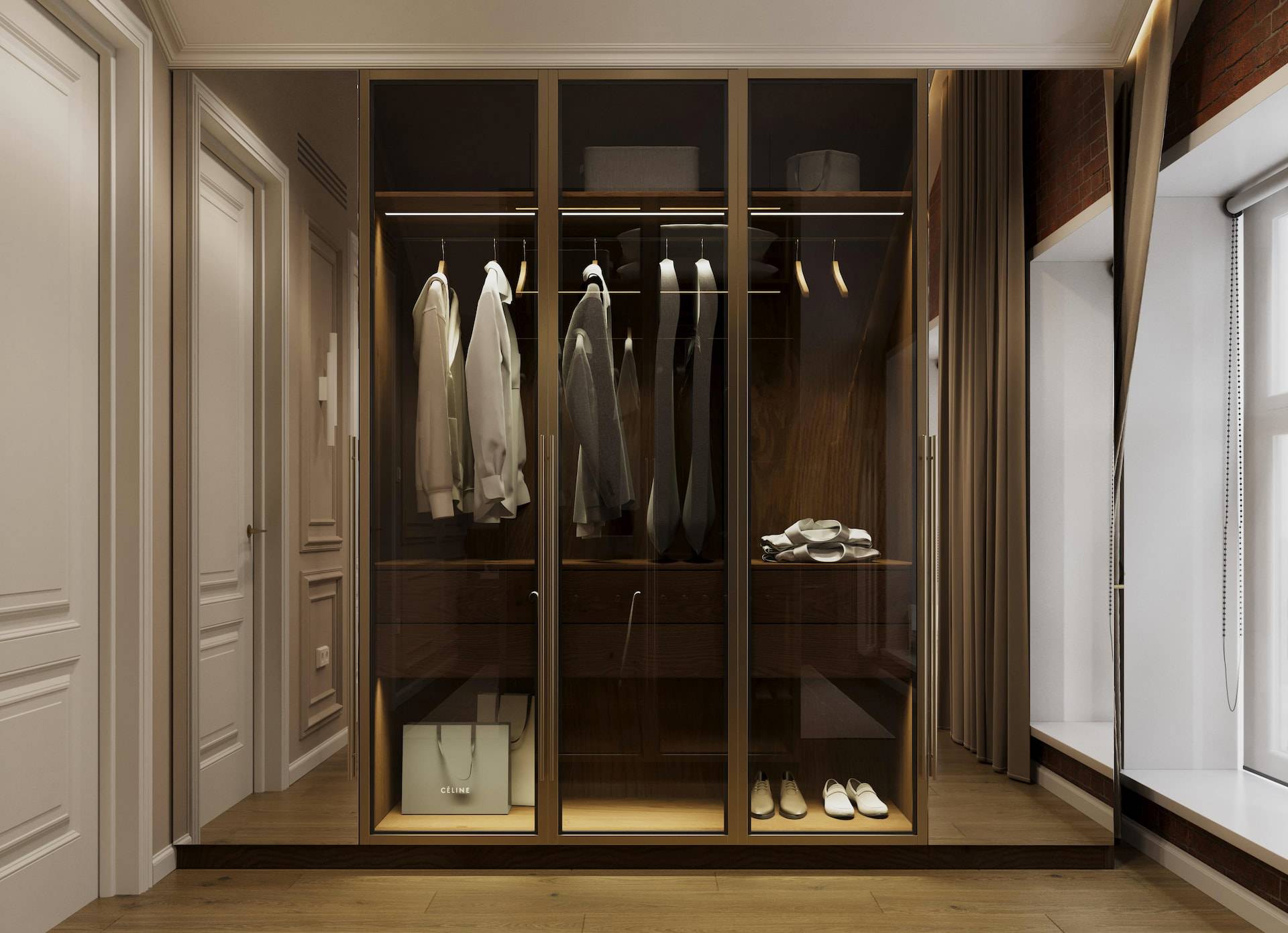 The three-story townhouse, in the American classic style, includes elements of loft styles. It combines classic moldings and trims on the walls, multilevel lighting, and a restrained color scheme, typical of American classics. While brick walls and a brutal bathroom with grey stone and black plumbing are typically of loft style. The house was designed for comfortable family living, each bedroom has its own dressing room and bathroom. The kitchen-living area takes center stage in the house as the house owner enjoys cooking and has guests over.