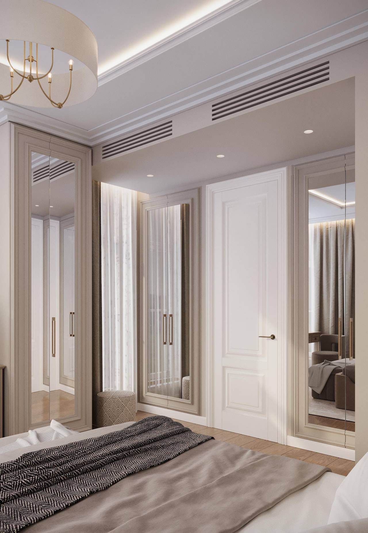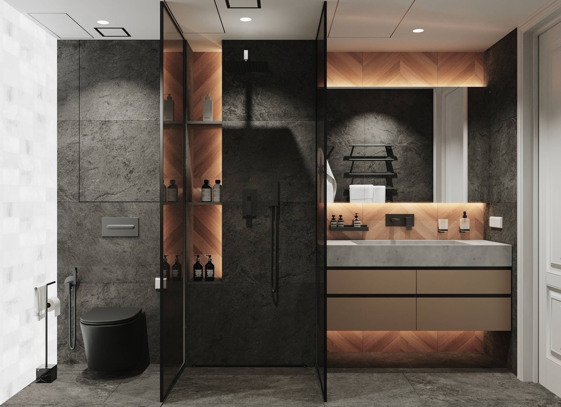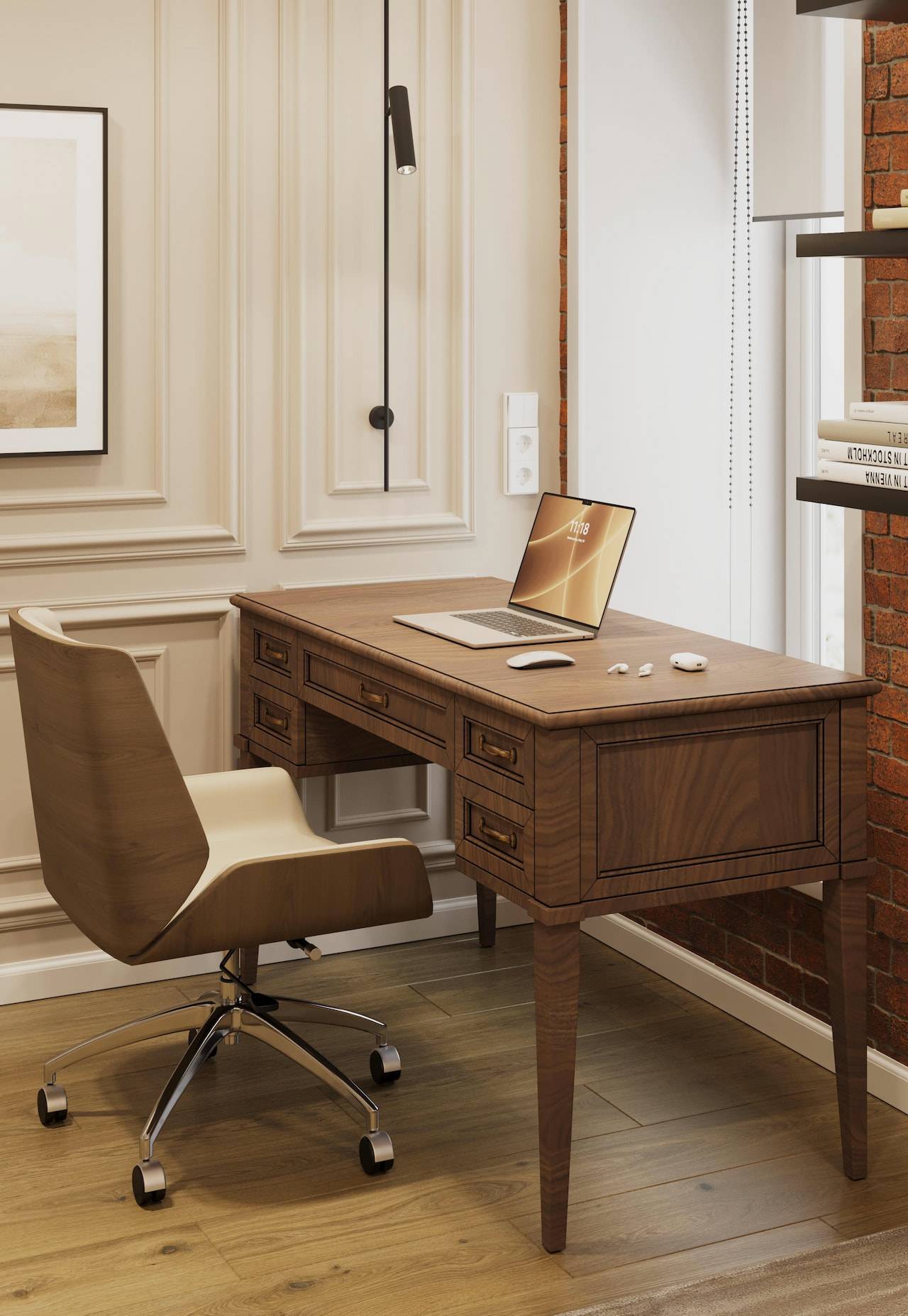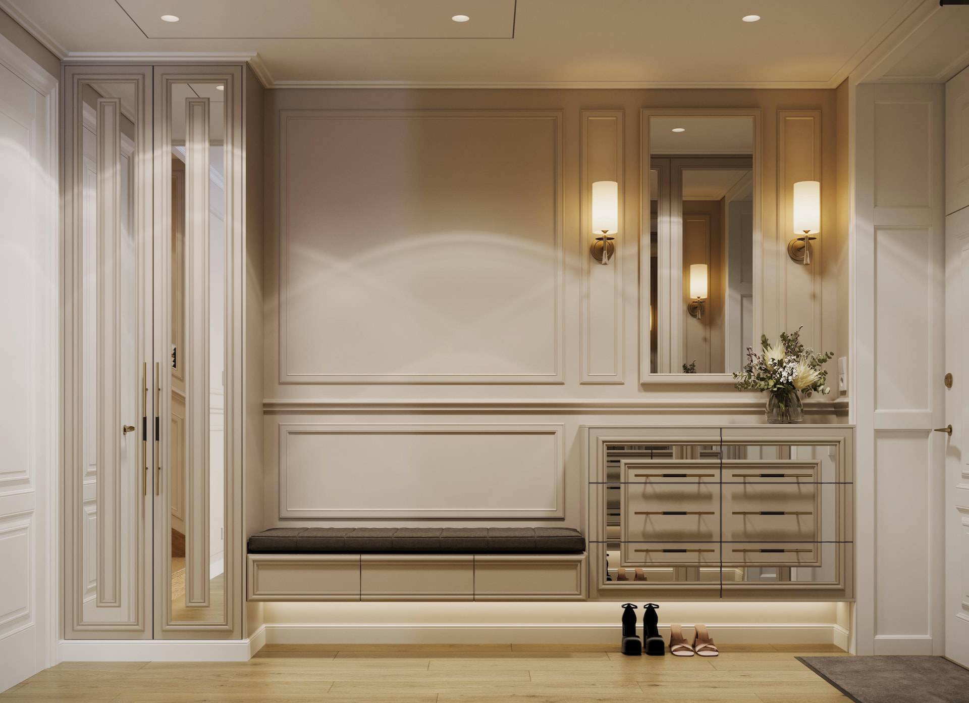 The three-story townhouse, in the American classic style, includes elements of loft styles. It combines classic moldings and trims on the walls, multilevel lighting, and a restrained color scheme, typical of American classics. While brick walls and a brutal bathroom with grey stone and black plumbing are typically of loft style. The house was designed for comfortable family living, each bedroom has its own dressing room and bathroom. The kitchen-living area takes center stage in the house as the house owner enjoys cooking and has guests over.