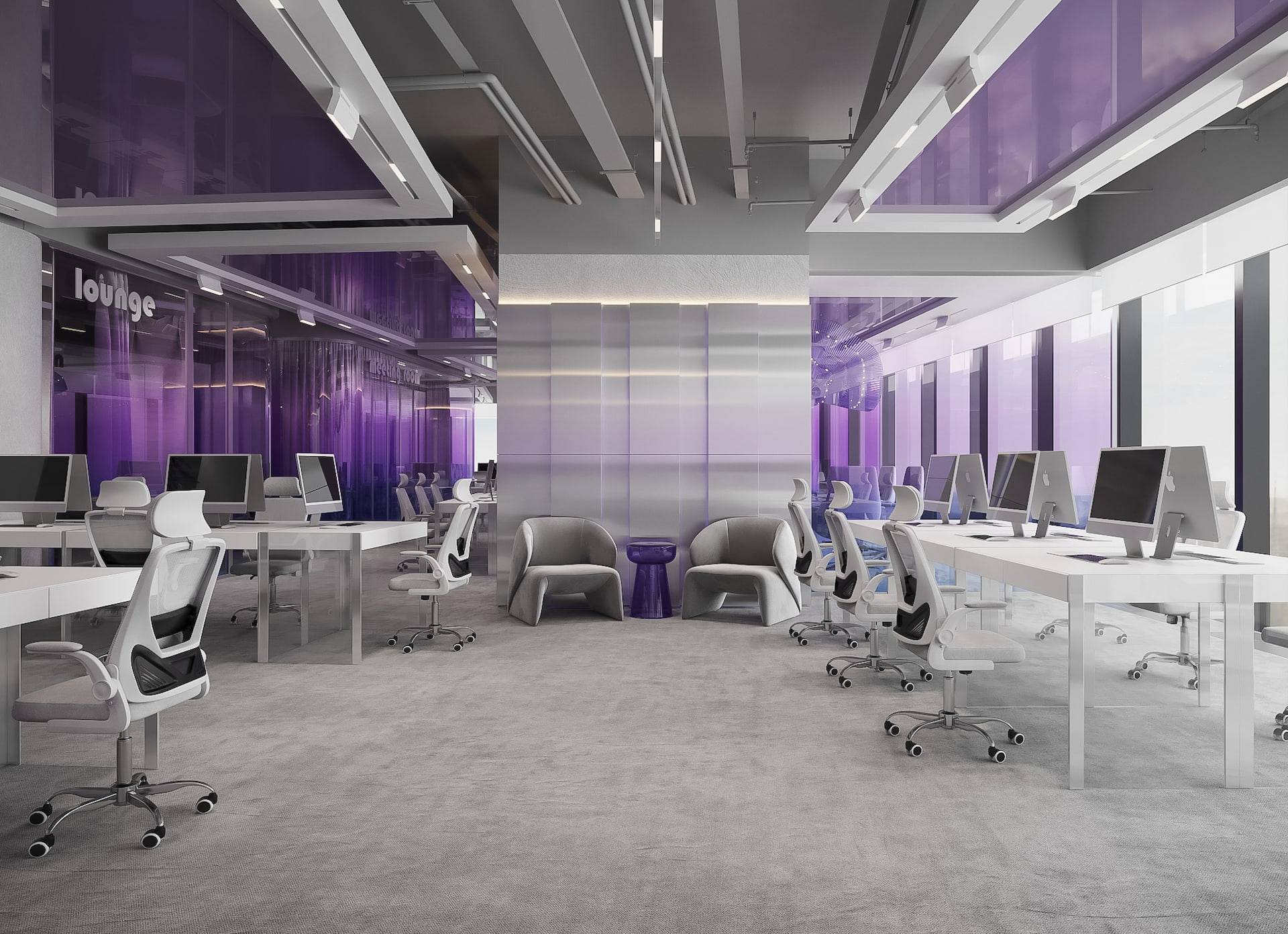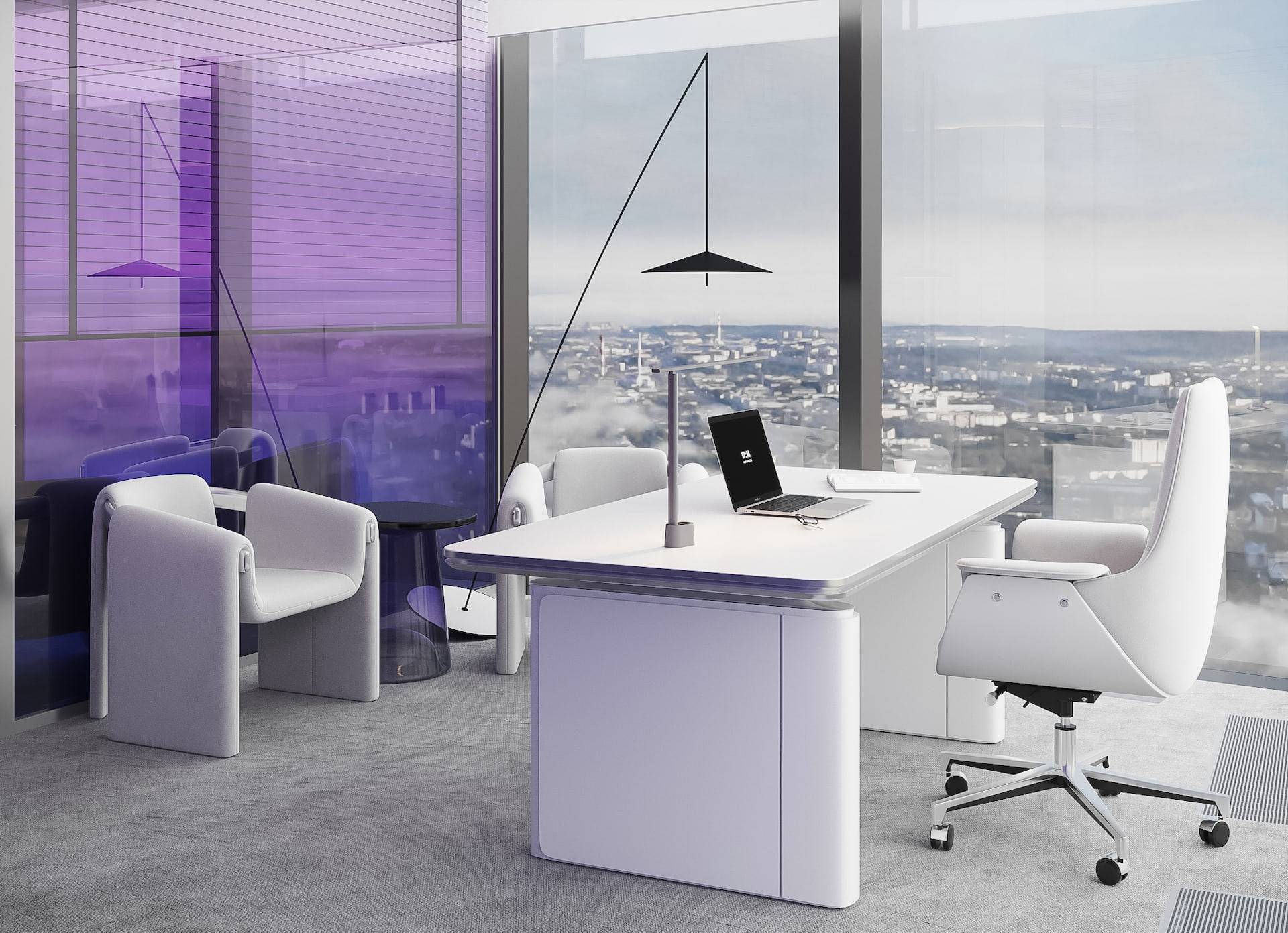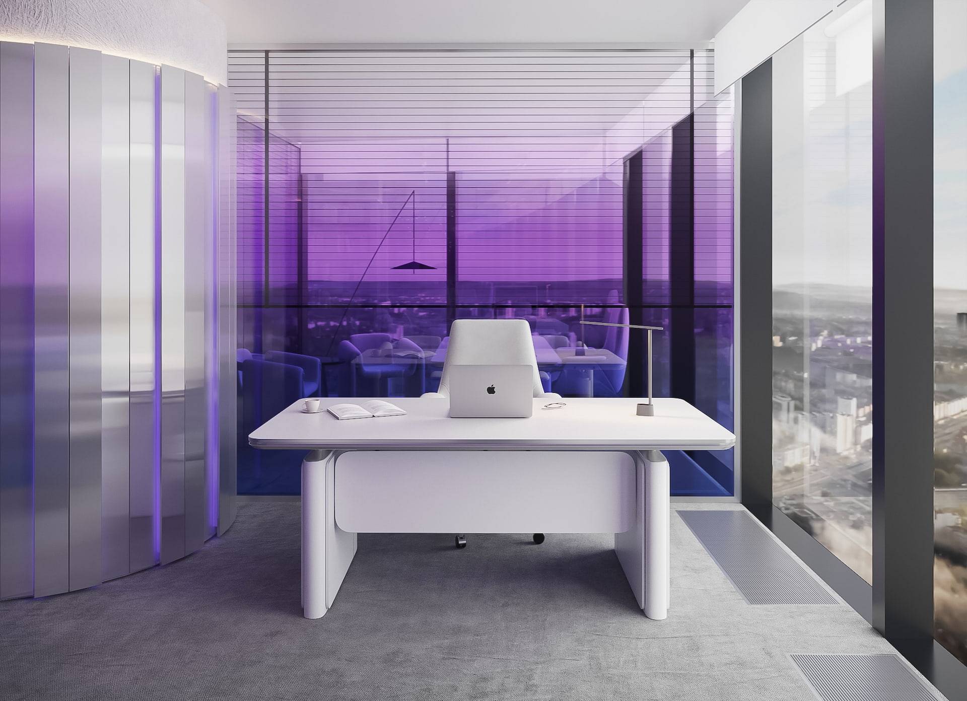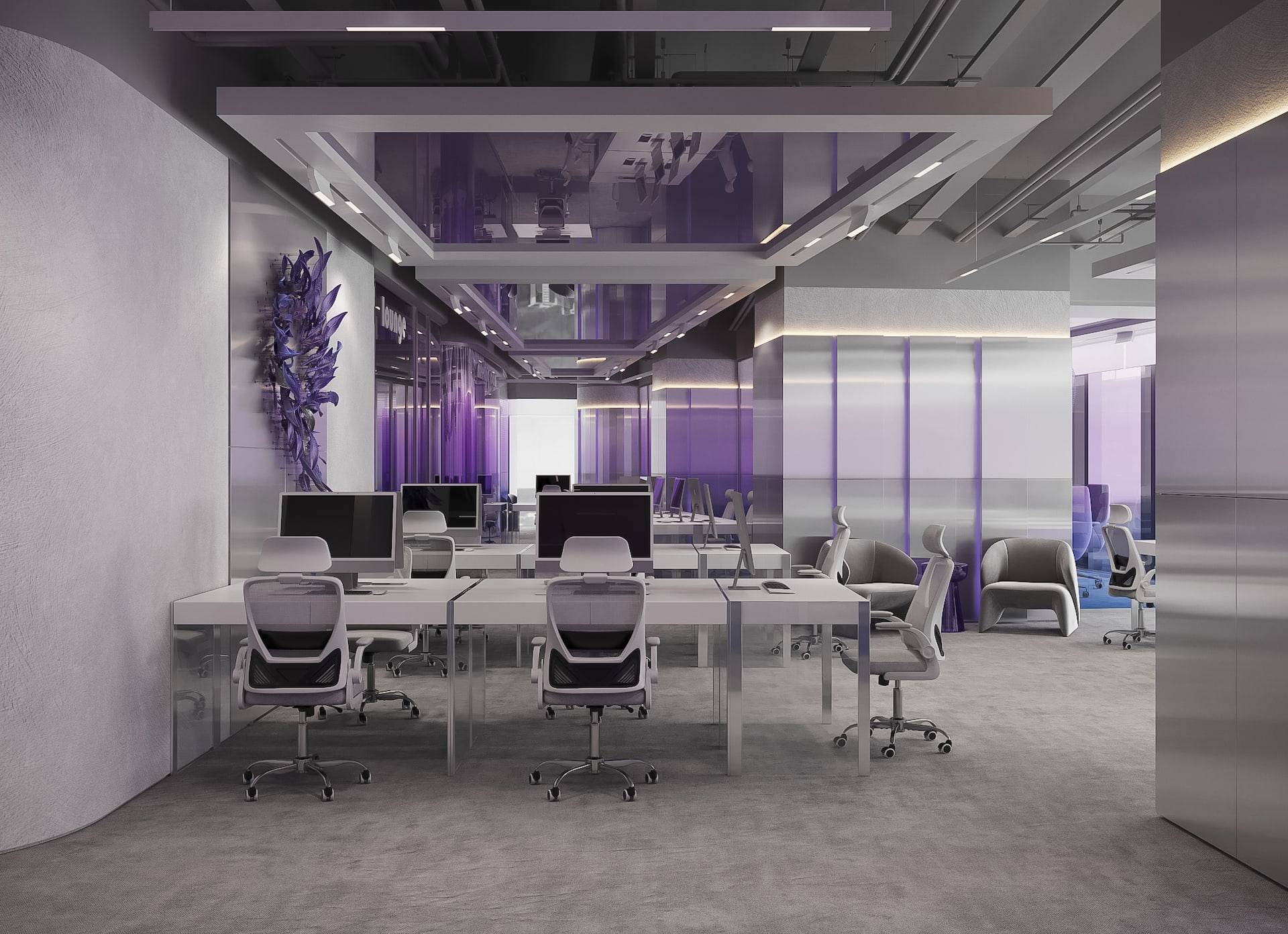 This modern sales office boasts a high-tech design with an open floor plan, featuring natural metal panels and a cool color scheme accented by touches of violet. The interior strikes a balance between cold aesthetics and warm-toned lighting, resulting in a welcoming atmosphere for both clients and employees. The space includes a reception area, a lounge, workstations with cubicles, and meeting rooms that offer views of the city. These features seamlessly combine functionality with a futuristic style, creating an environment that is both efficient and stylish.