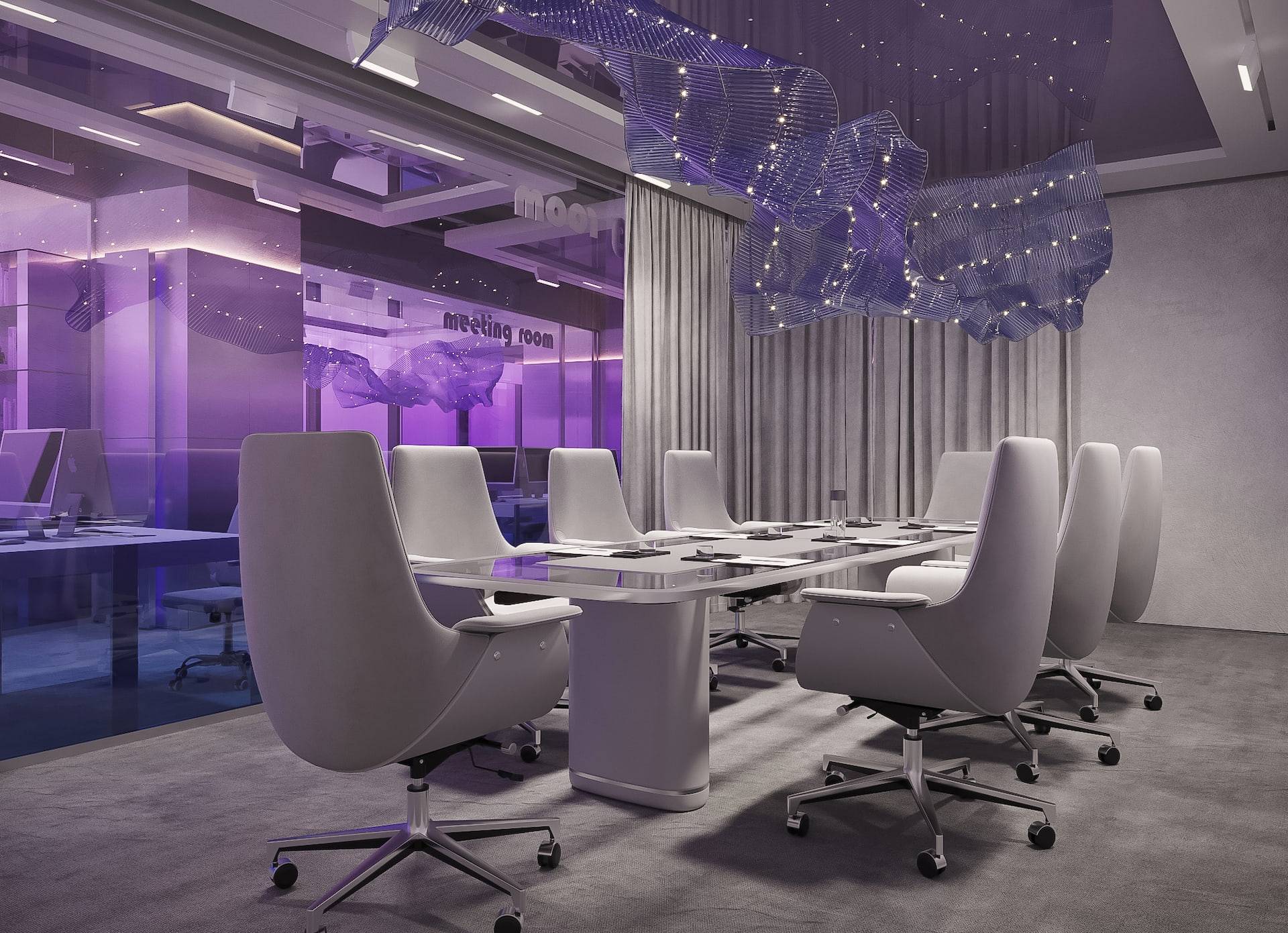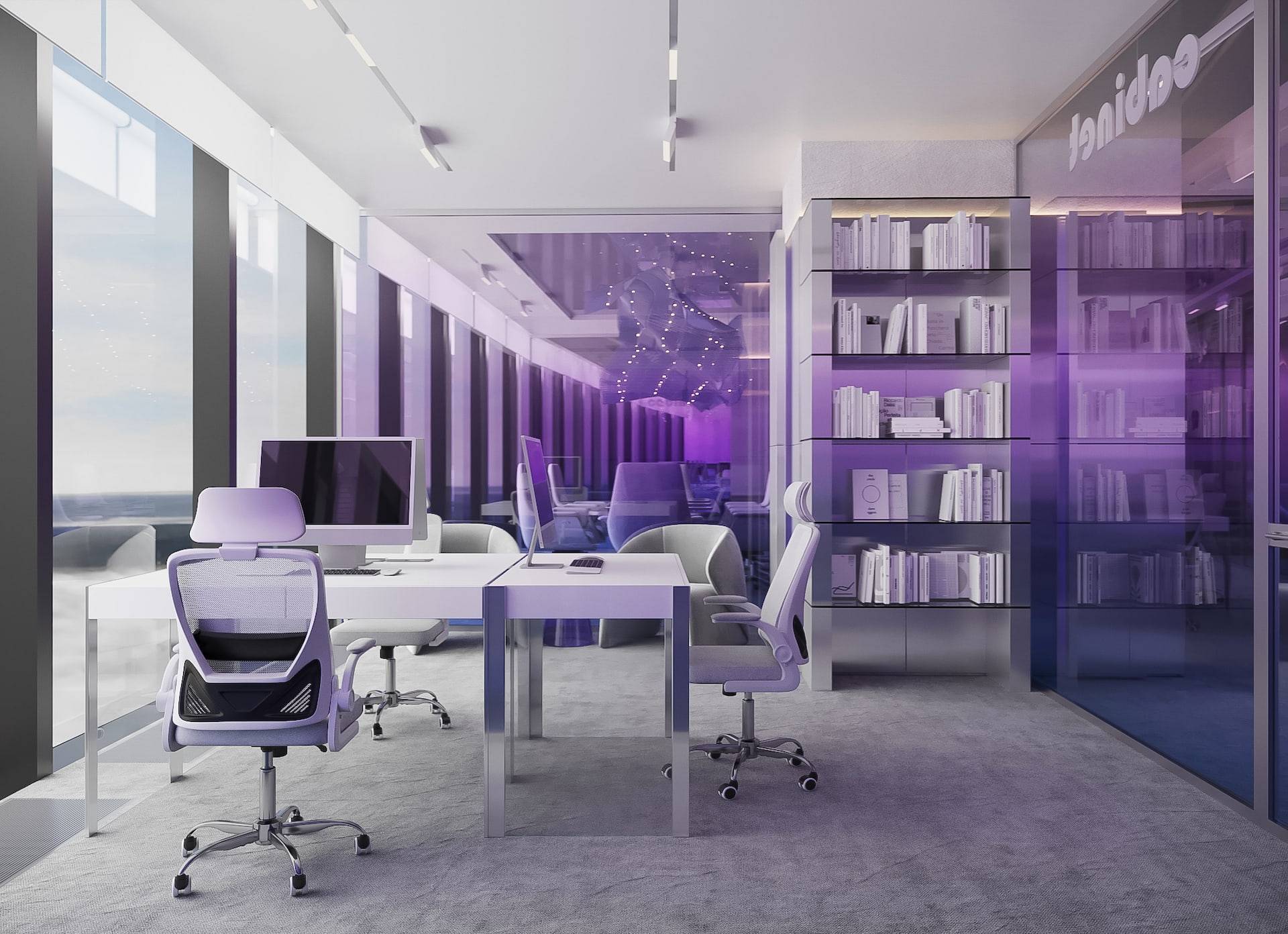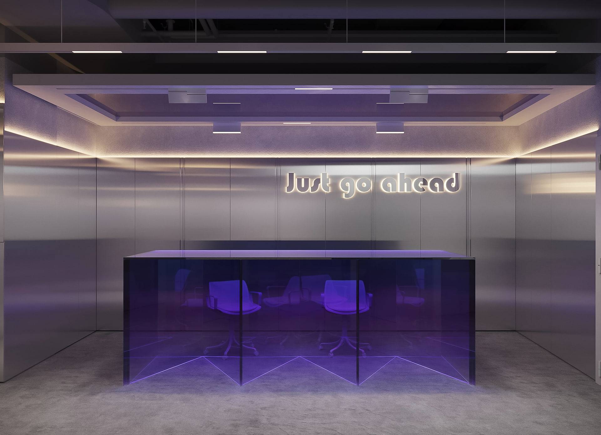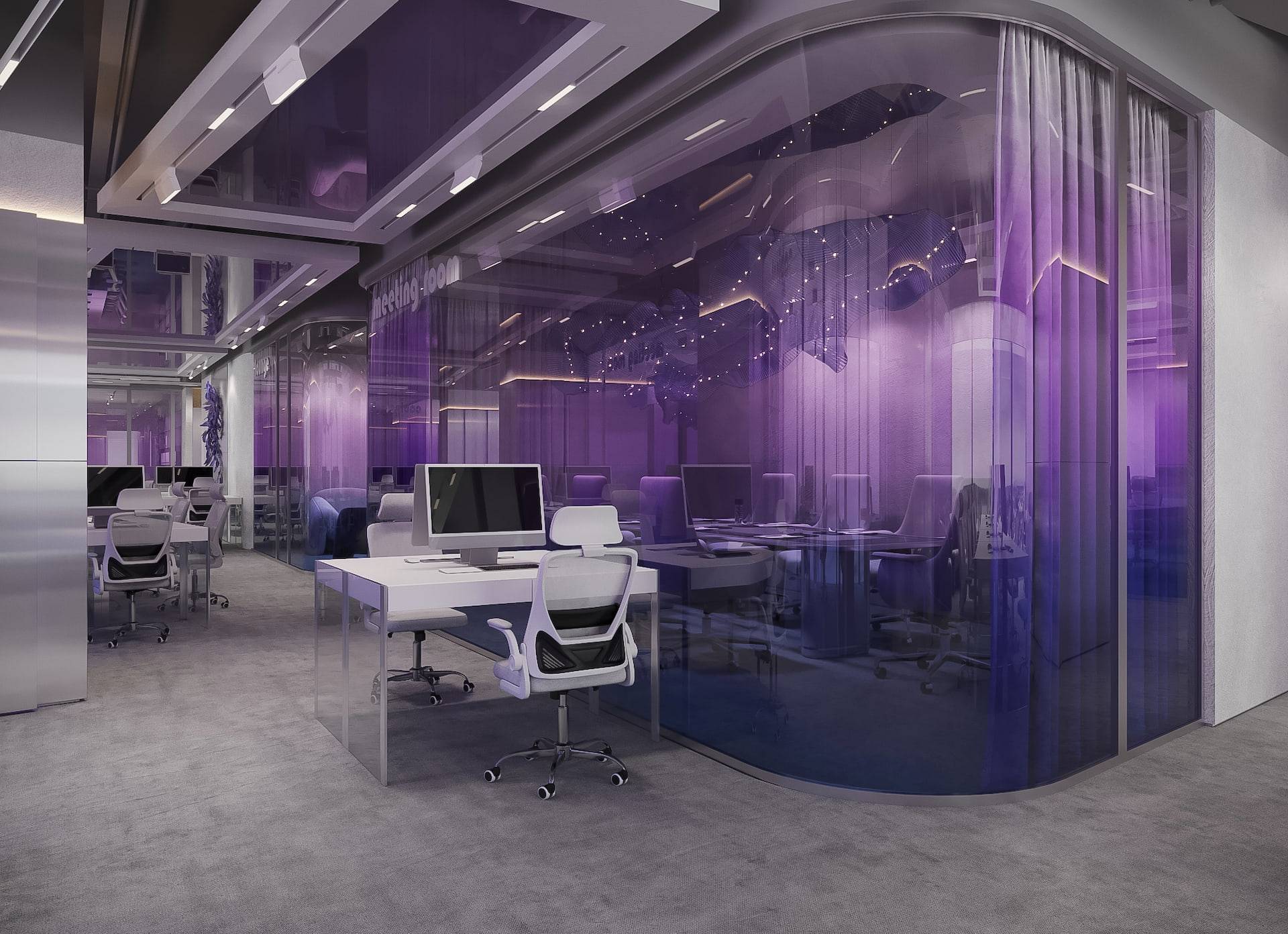 This modern sales office boasts a high-tech design with an open floor plan, featuring natural metal panels and a cool color scheme accented by touches of violet. The interior strikes a balance between cold aesthetics and warm-toned lighting, resulting in a welcoming atmosphere for both clients and employees. The space includes a reception area, a lounge, workstations with cubicles, and meeting rooms that offer views of the city. These features seamlessly combine functionality with a futuristic style, creating an environment that is both efficient and stylish.