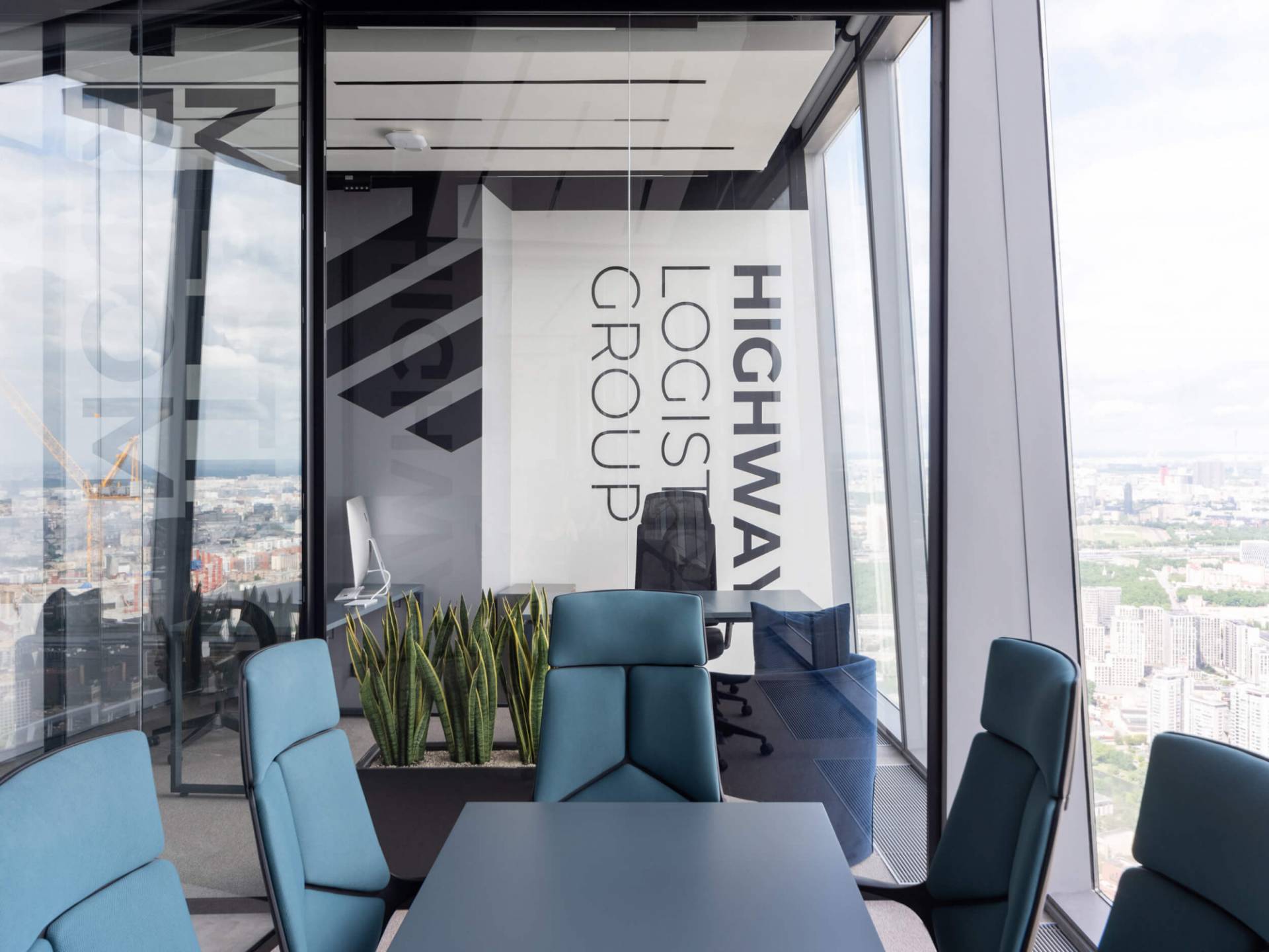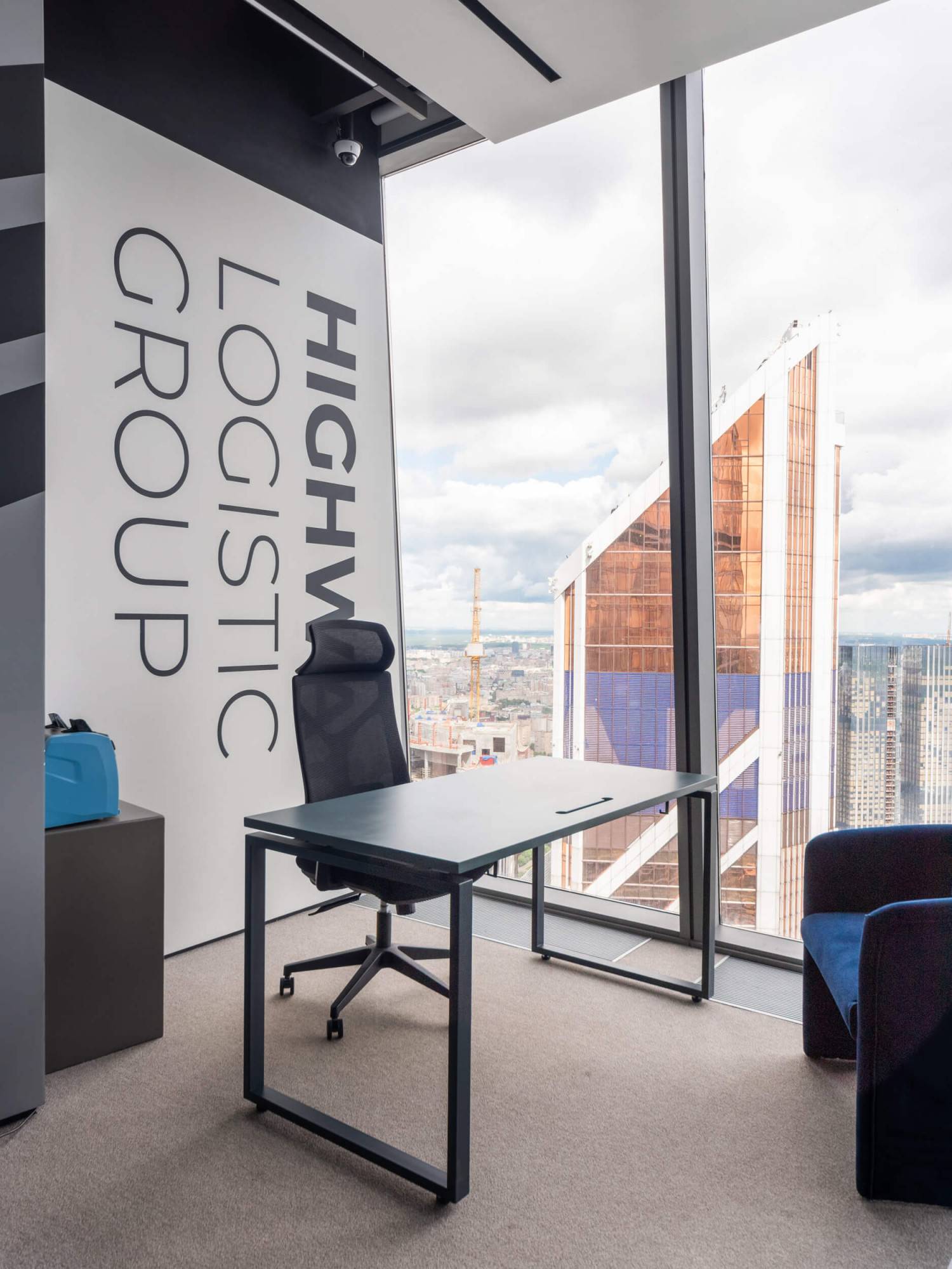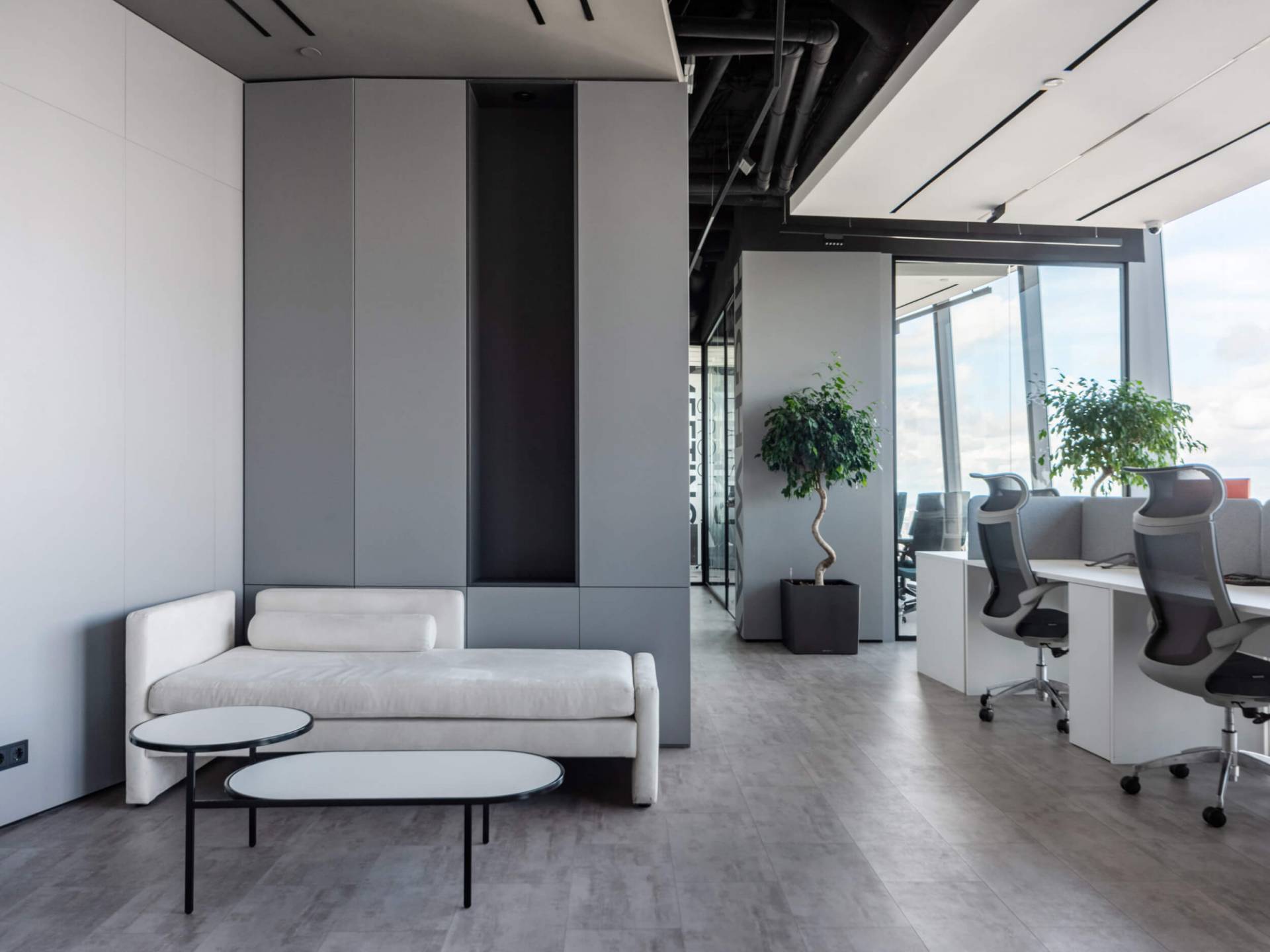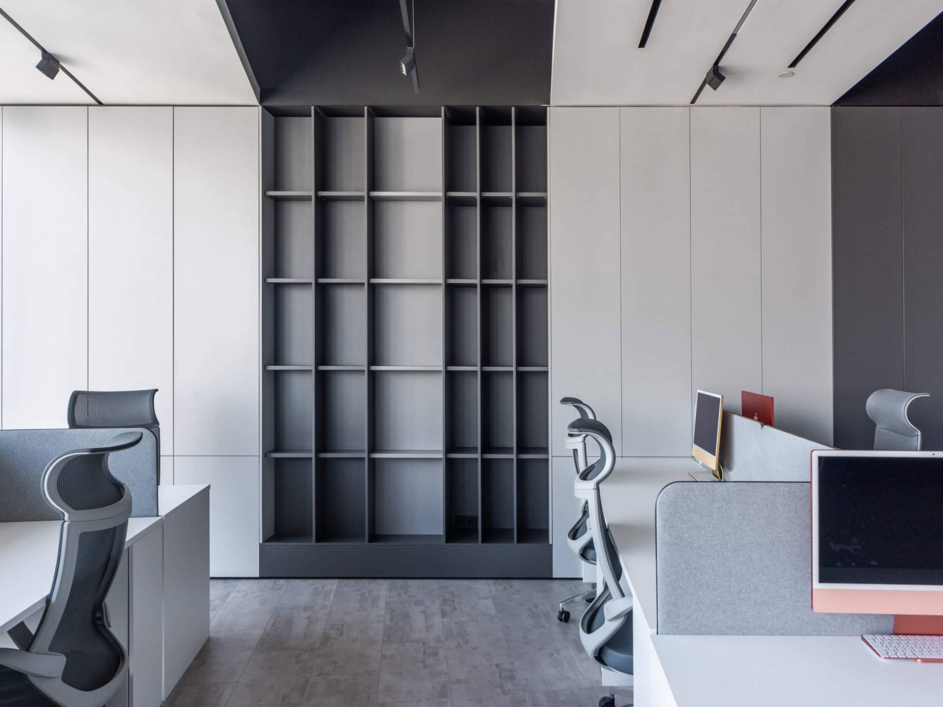 Back office designed for Sales department of Export Trading company in Moscow City. Office design features achromatic interior emphasized by finishing materials in different shades of grey and blue branding elements used as an accent.