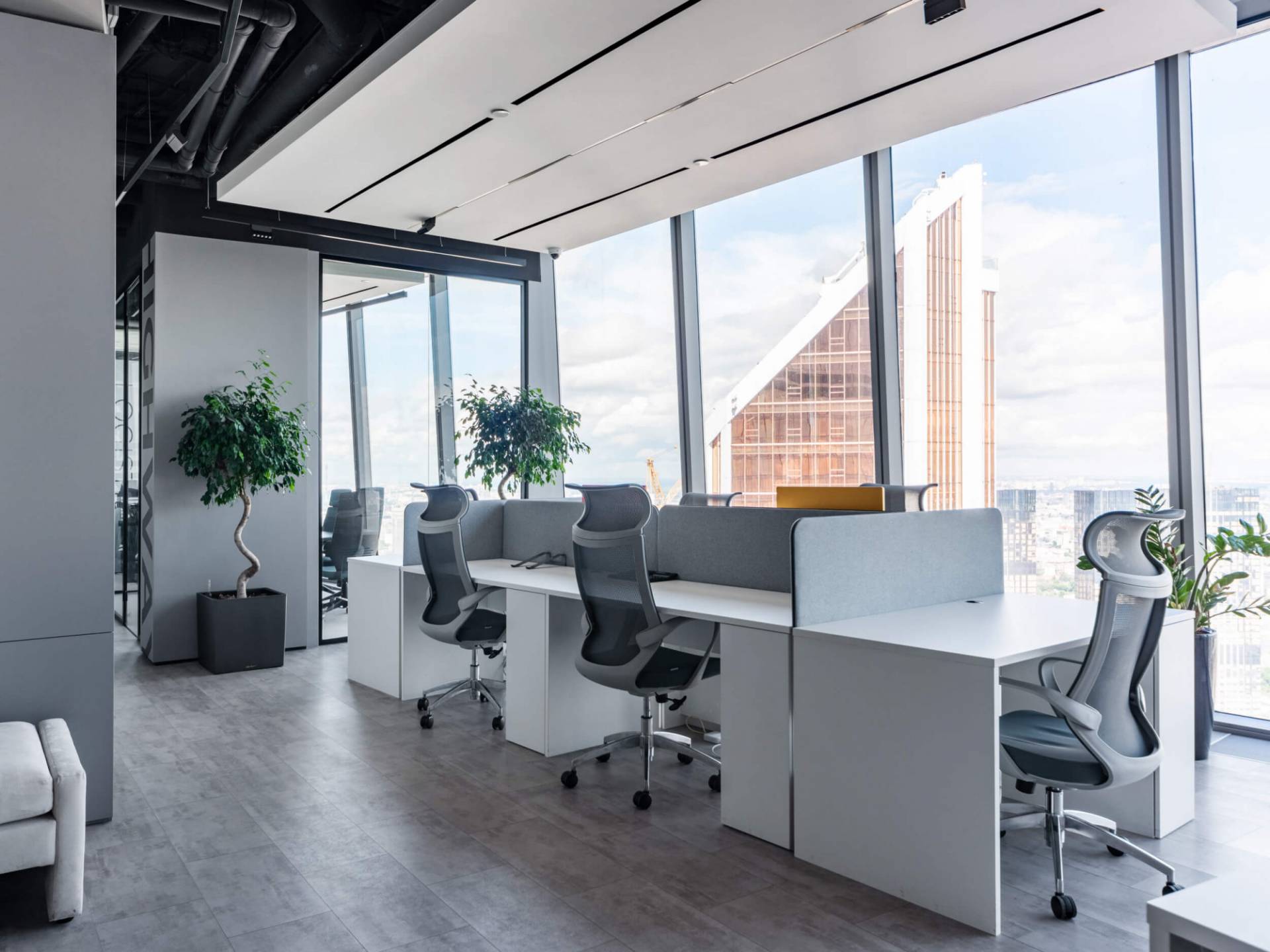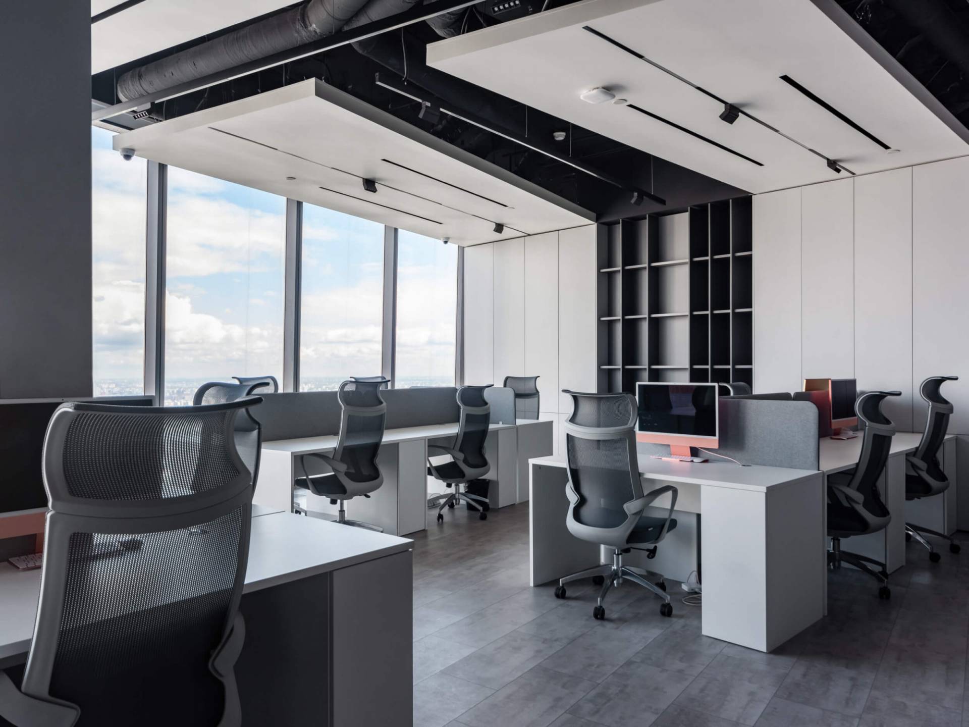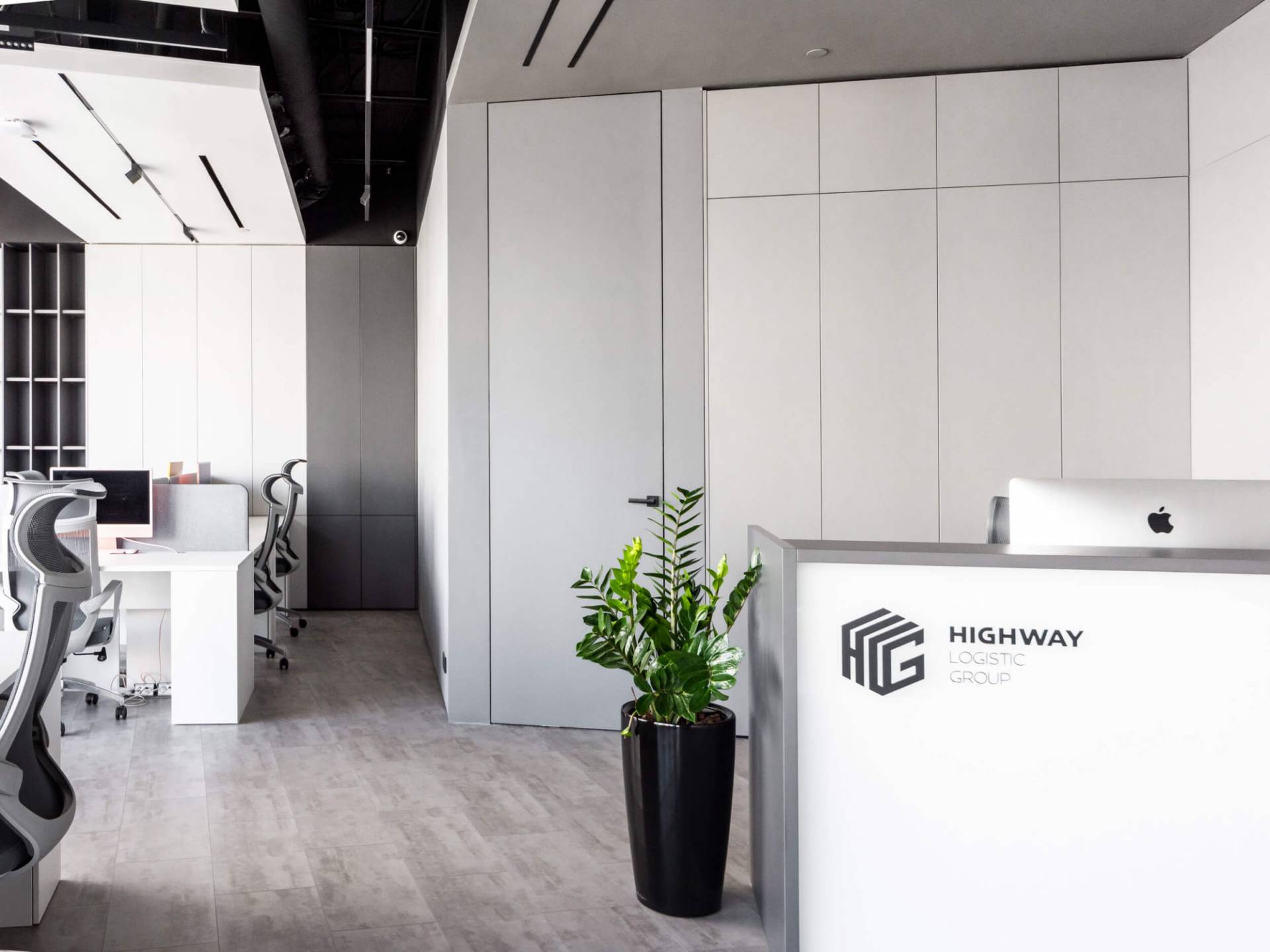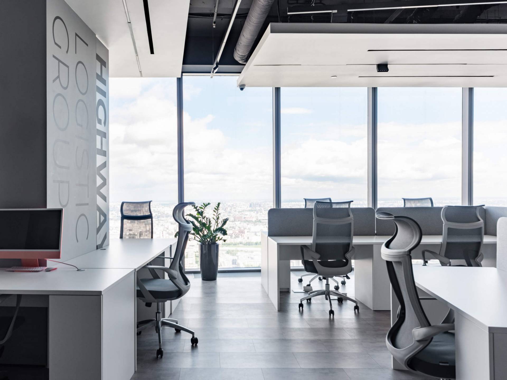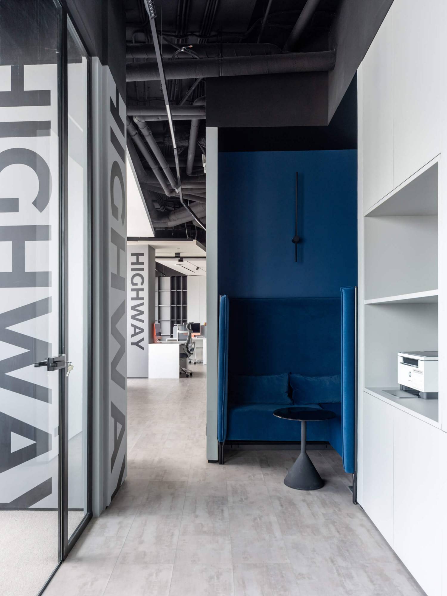 Back office designed for Sales department of Export Trading company in Moscow City. Office design features achromatic interior emphasized by finishing materials in different shades of grey and blue branding elements used as an accent.