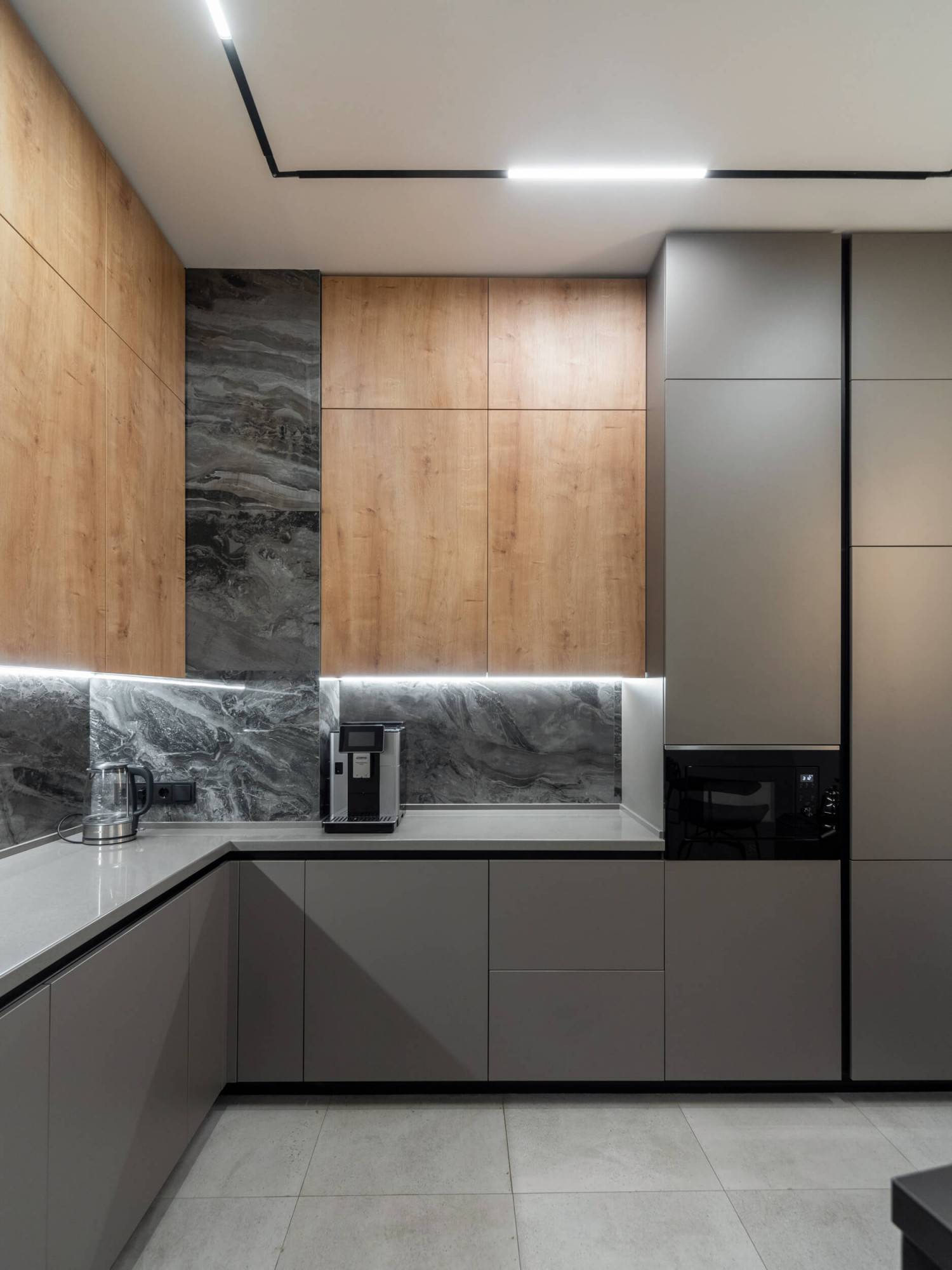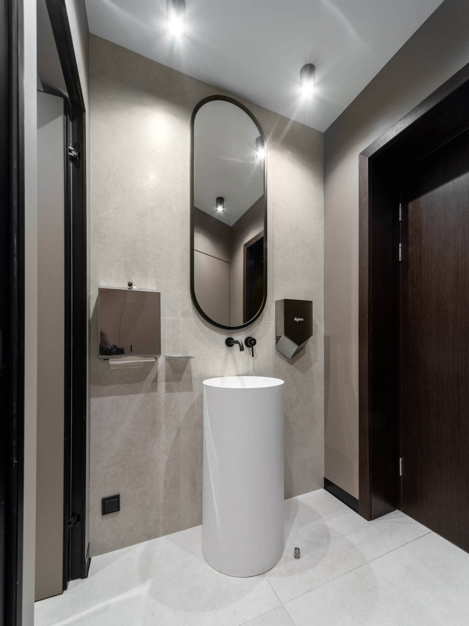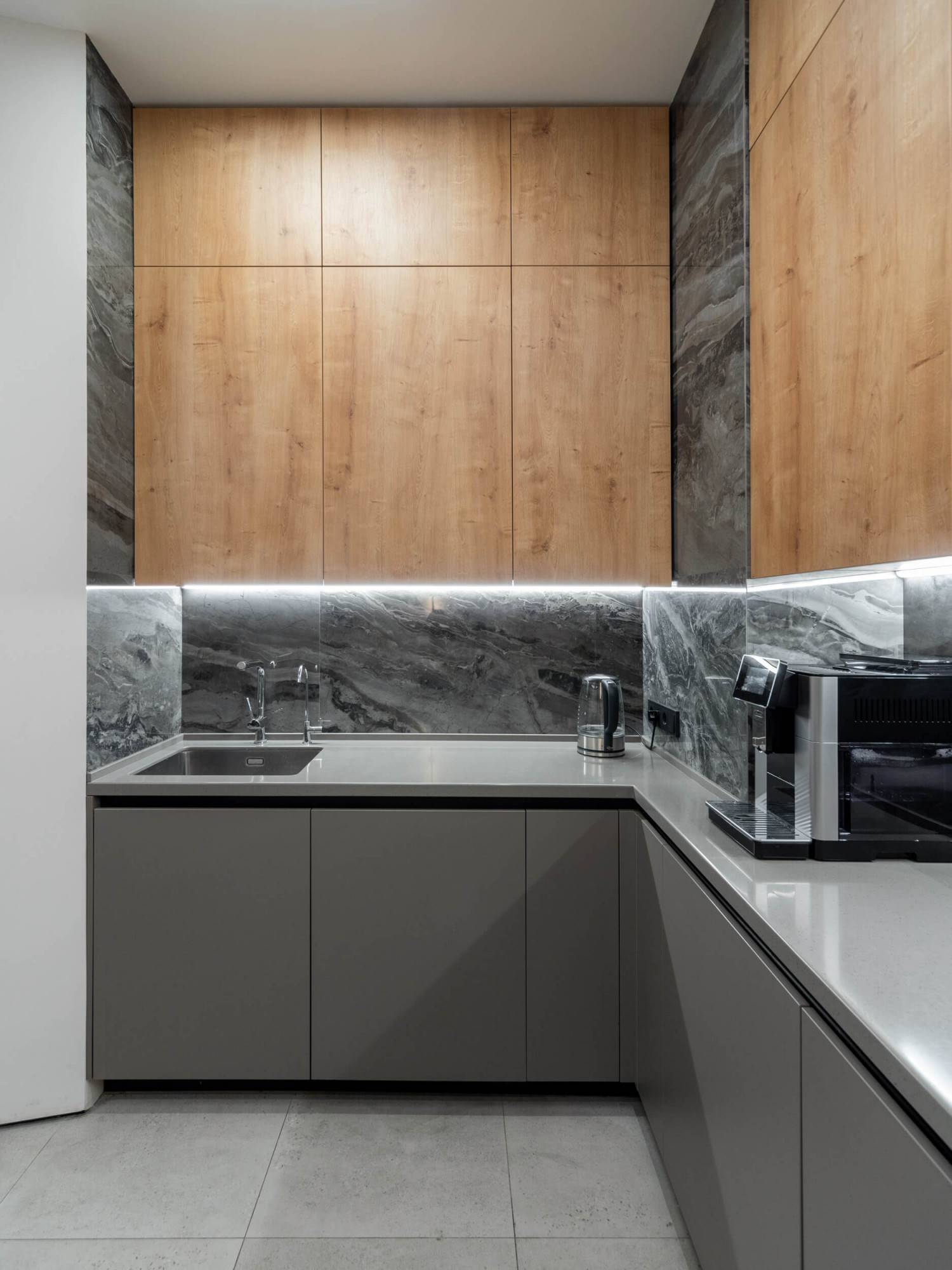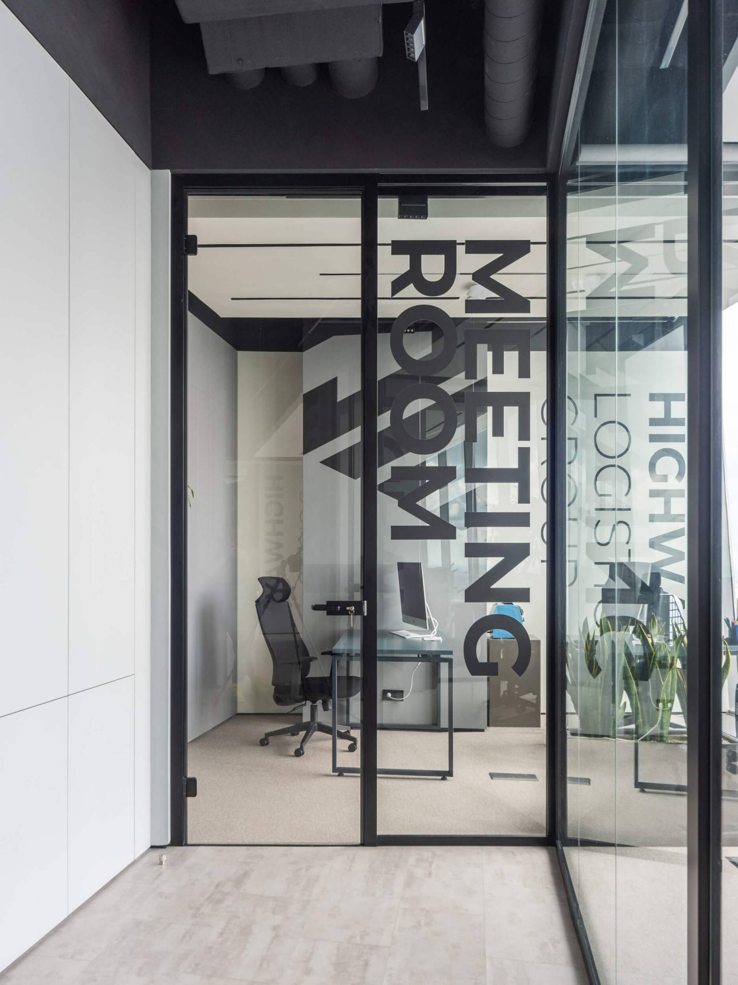 Back office designed for Sales department of Export Trading company in Moscow City. Office design features achromatic interior emphasized by finishing materials in different shades of grey and blue branding elements used as an accent.