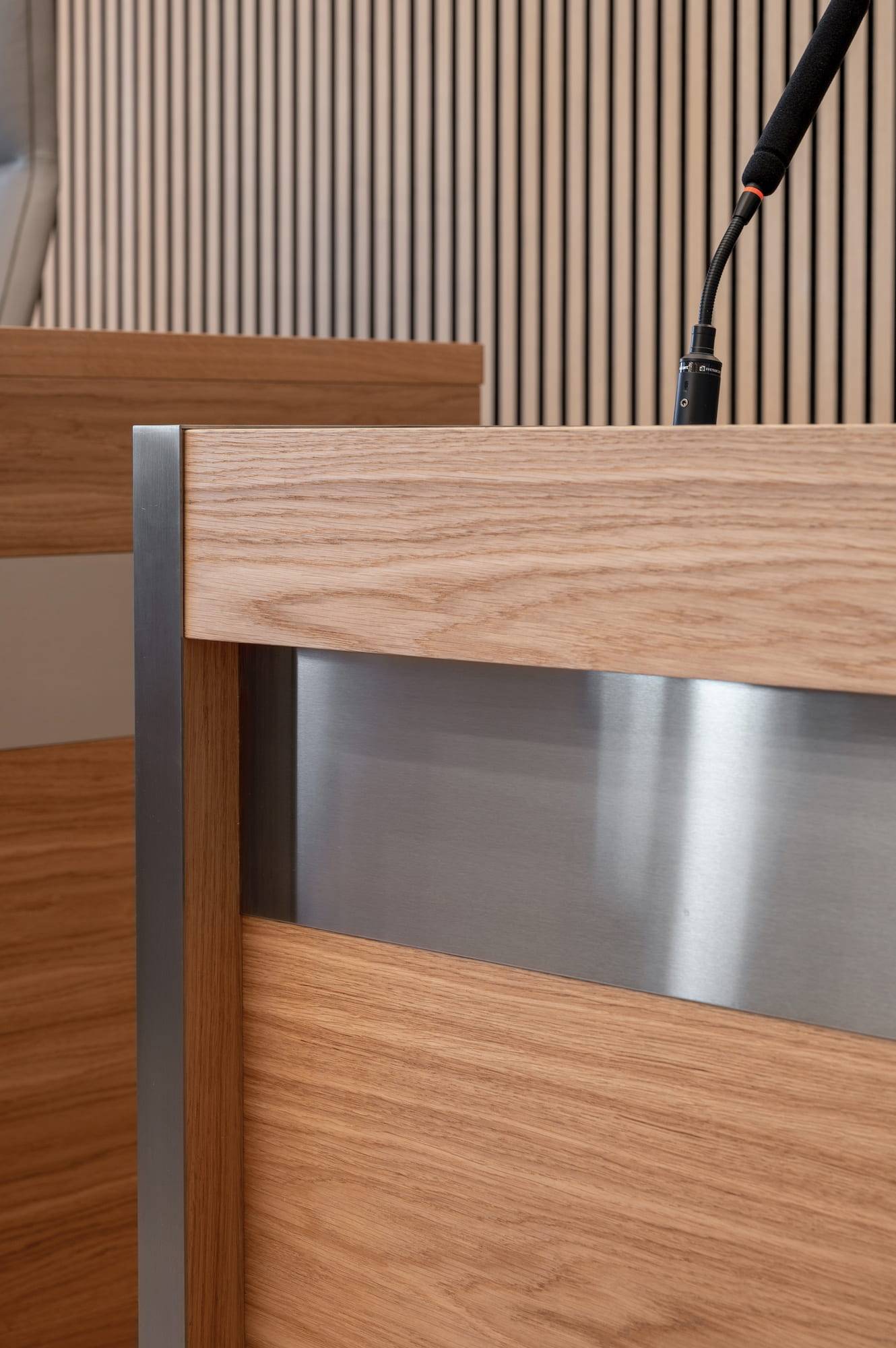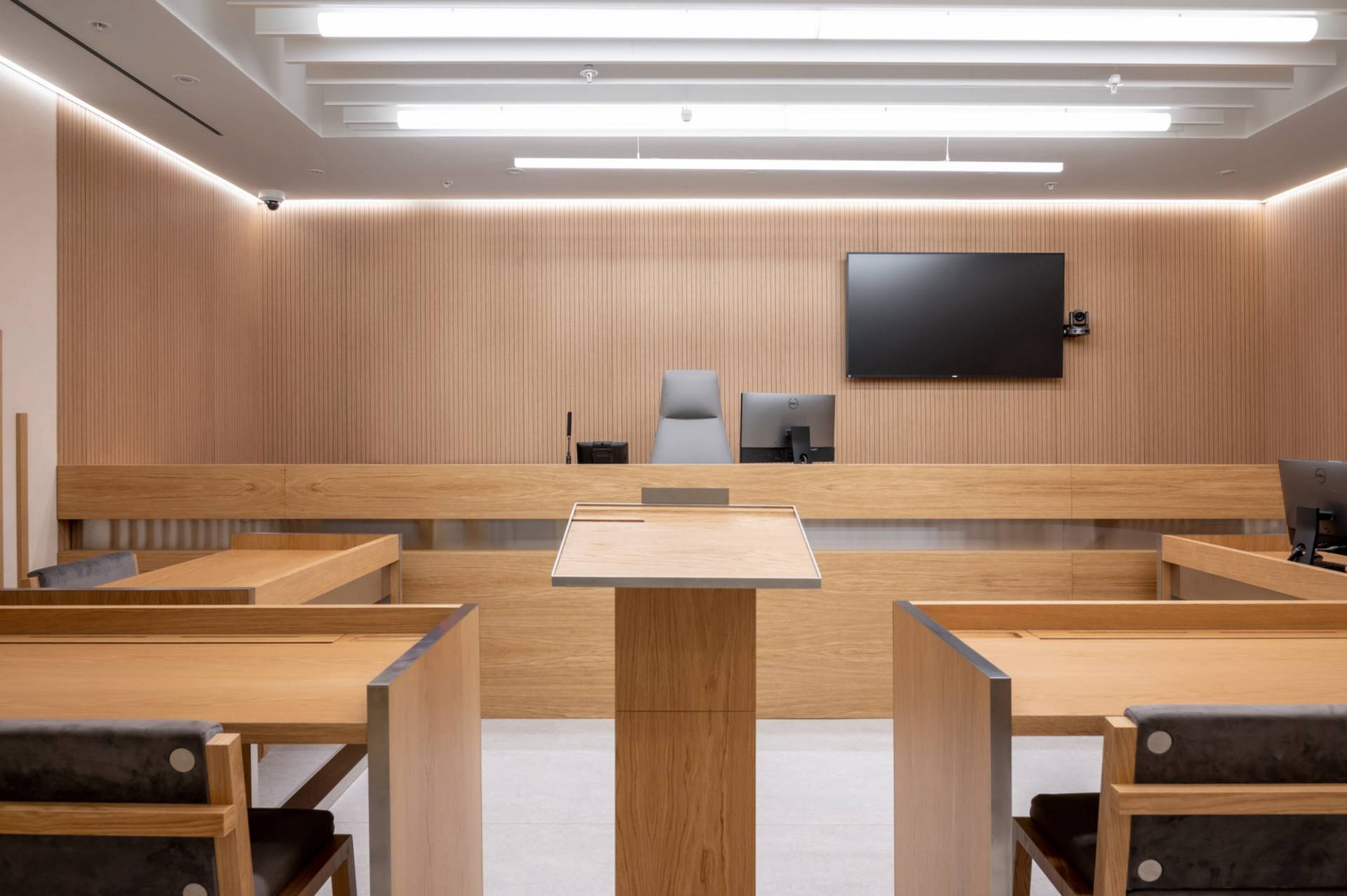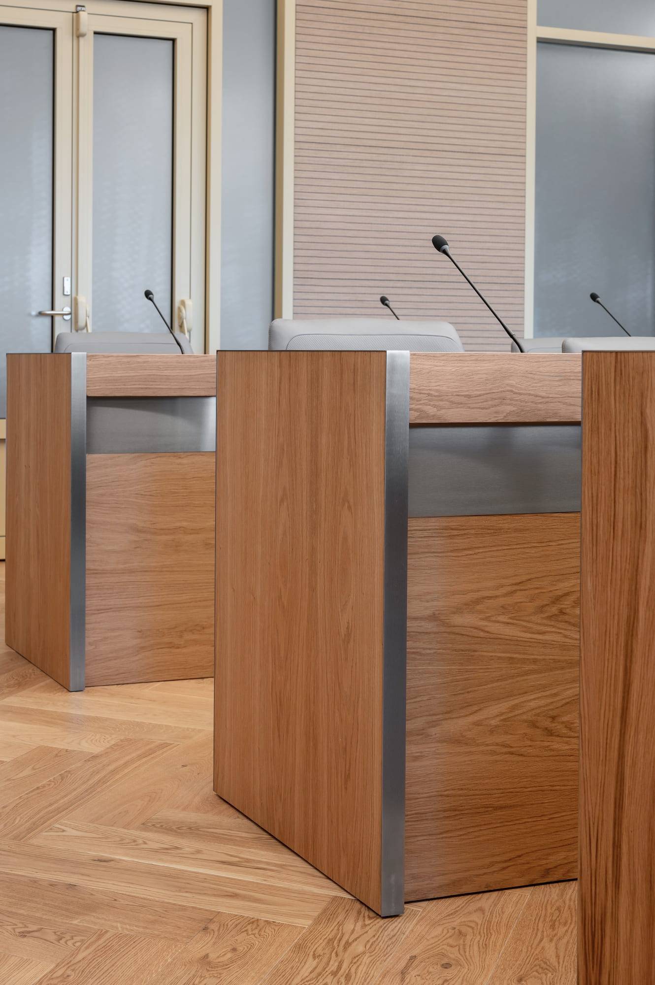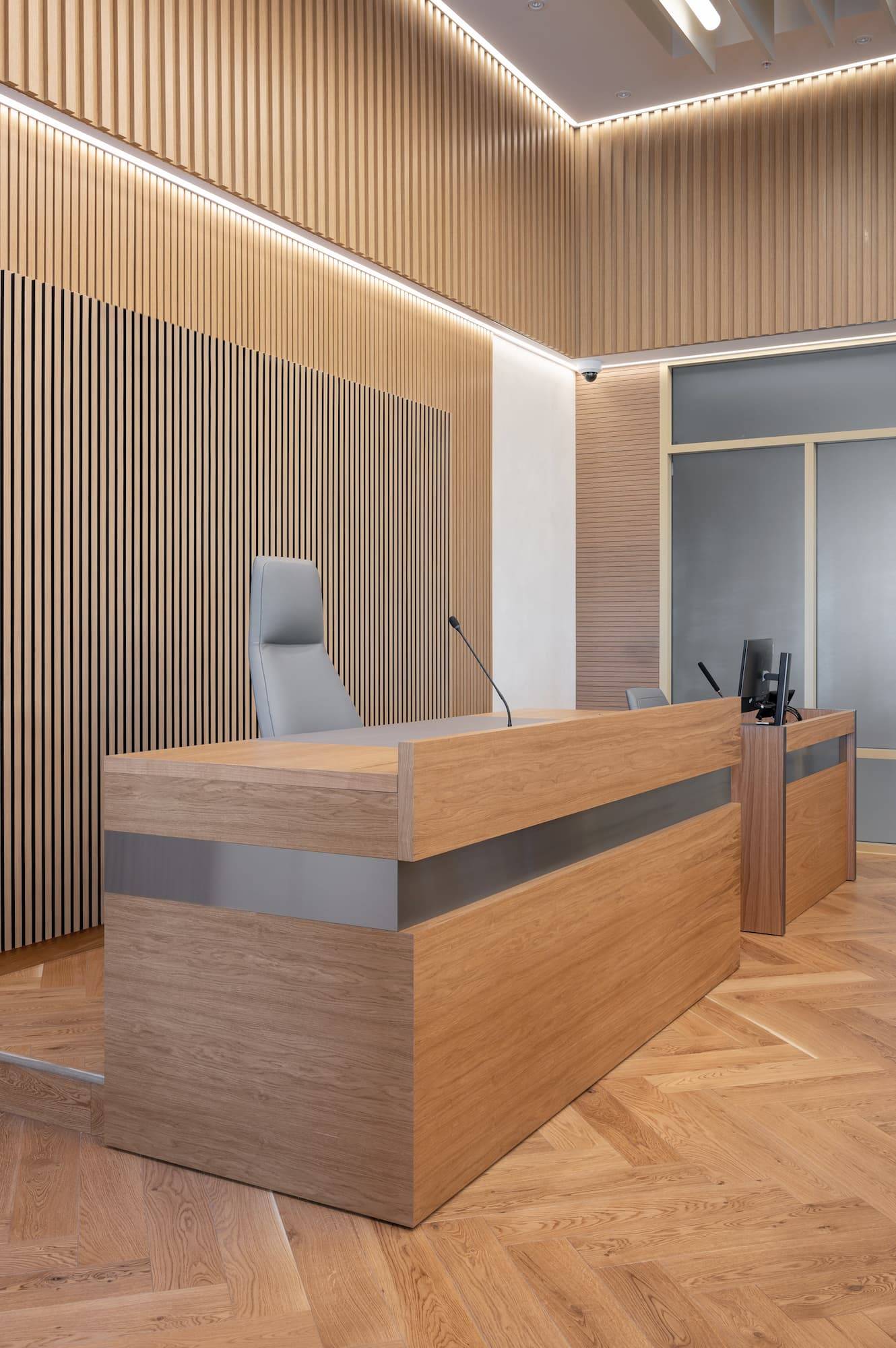 Courtroom furniture design was developed in collaboration with another architectural bureau. We created furniture design concept that solved ergonomic issues, ensured durability and maintenance and had long-term vandal and mechanical resistance.