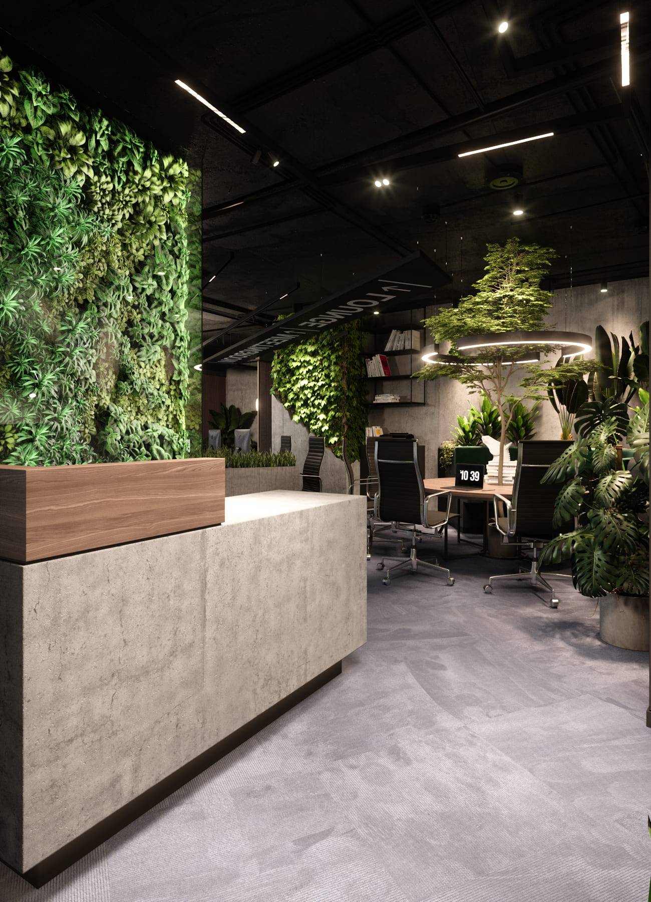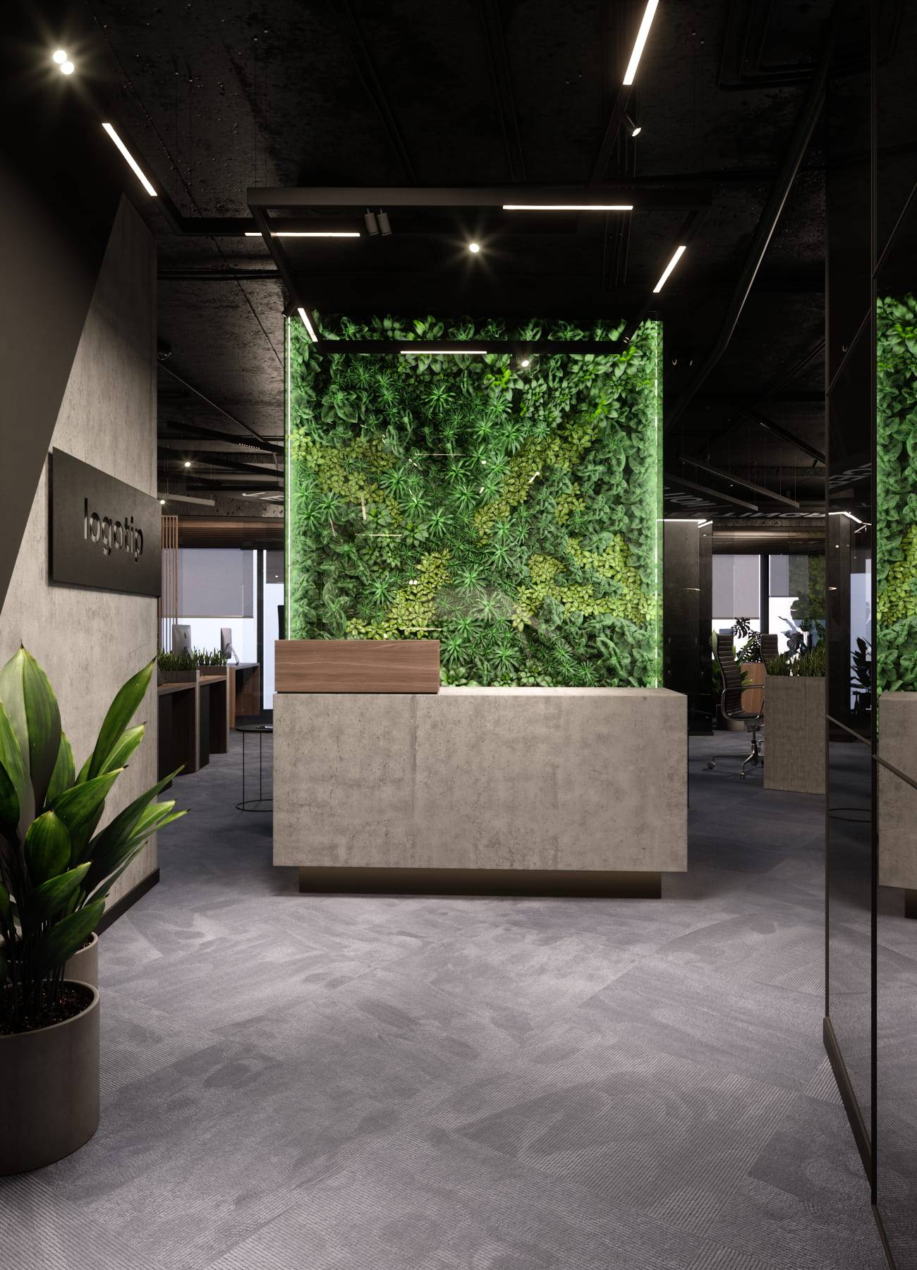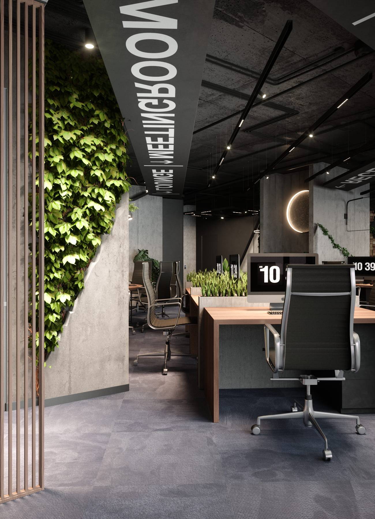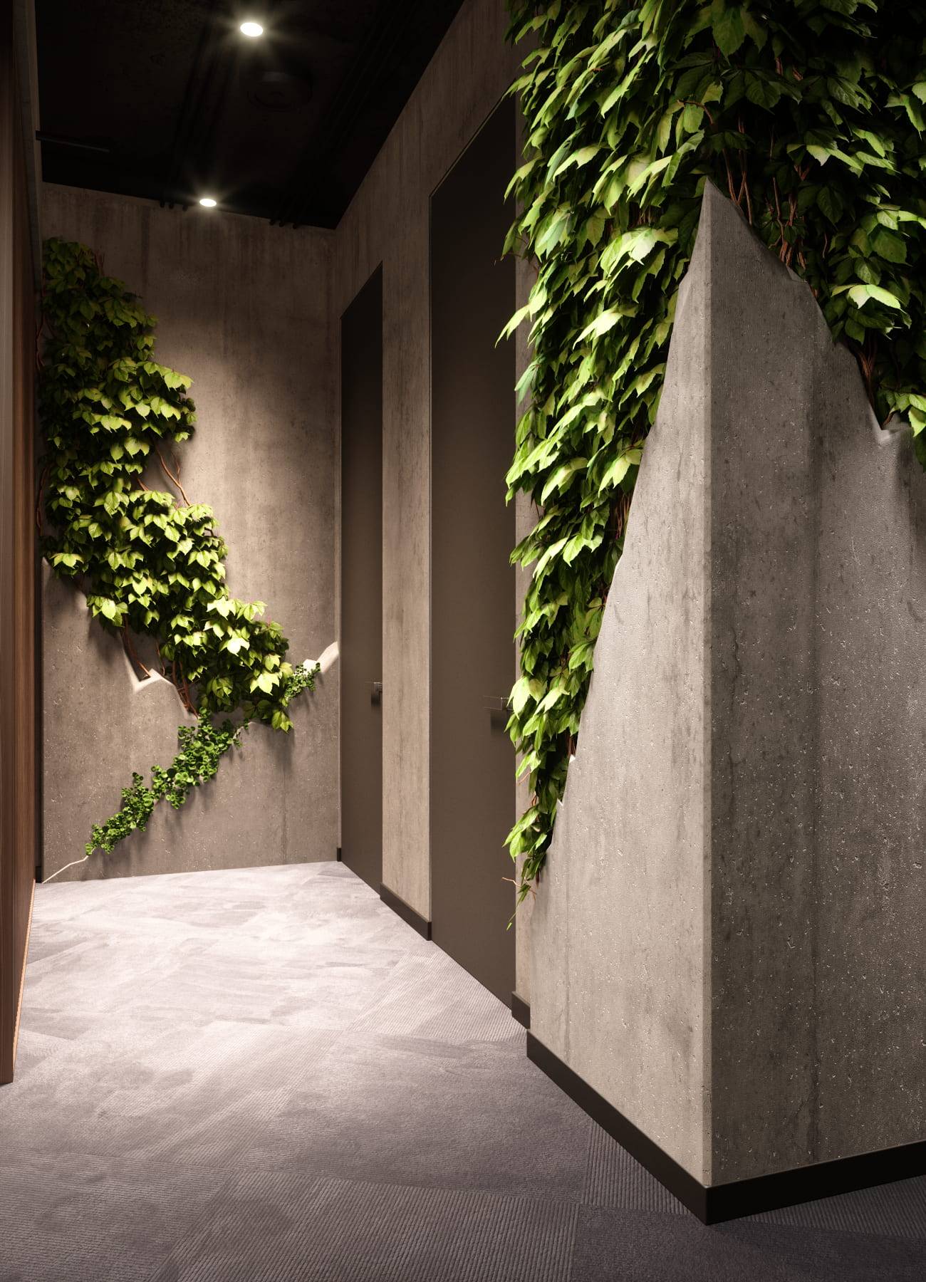 Elegant Loft style office located in Moscow city. The main aim was to build an office that would resemble ancient ruins. Office design features achromatic interior emphasized by grey color scheme, lush green plants and wooden and concrete textures. Glass partitions connect central open space with numerous offices.