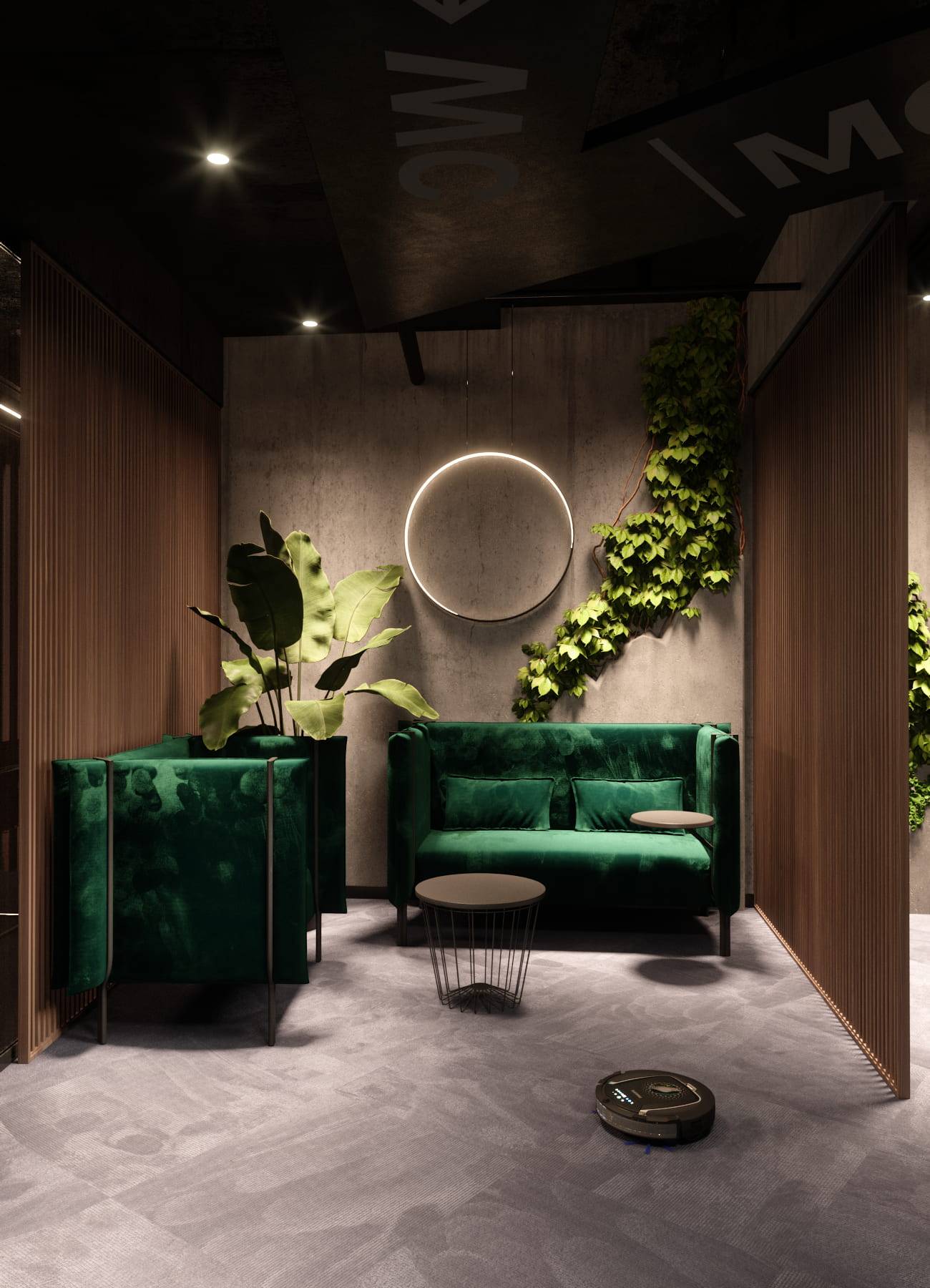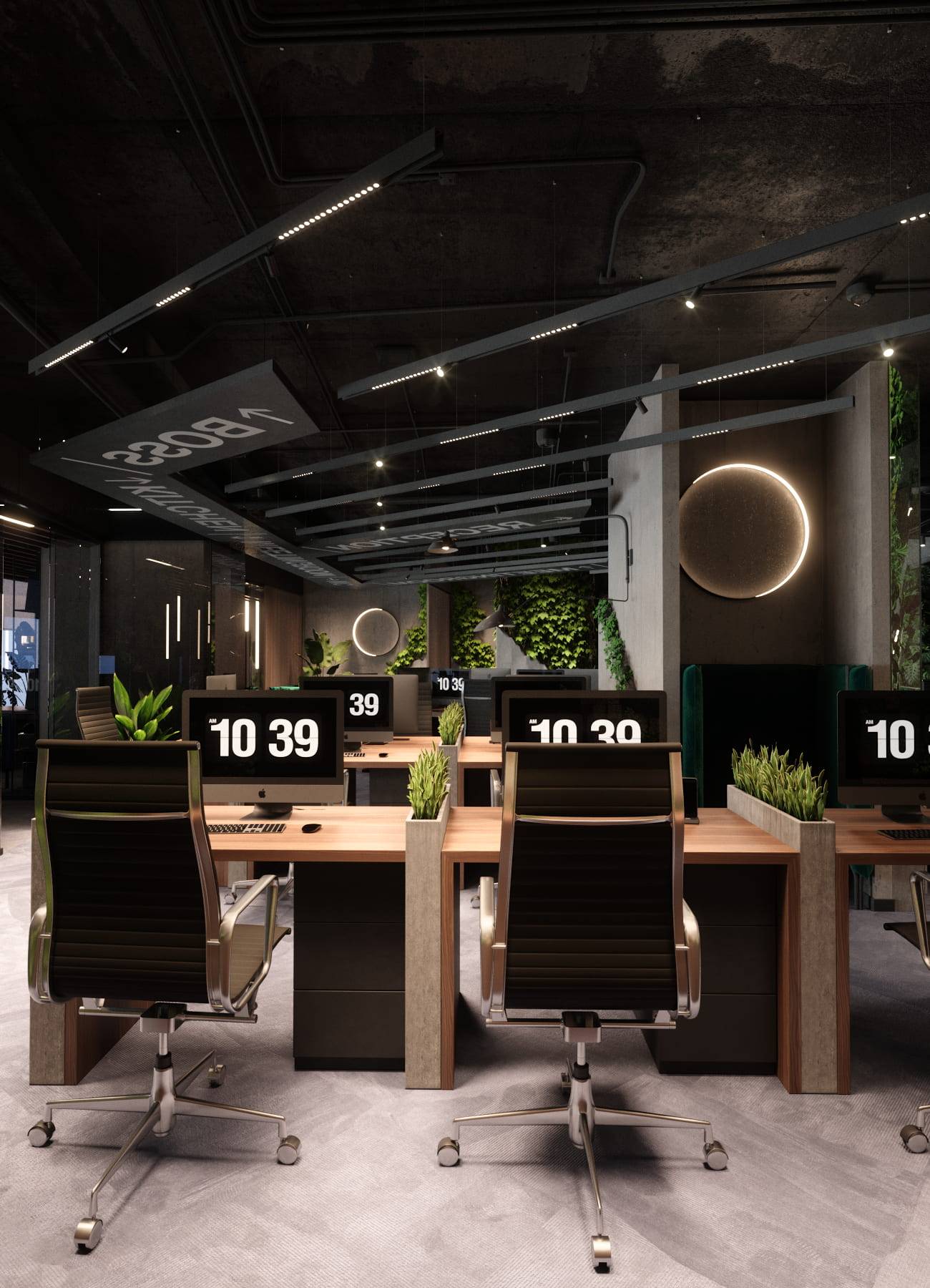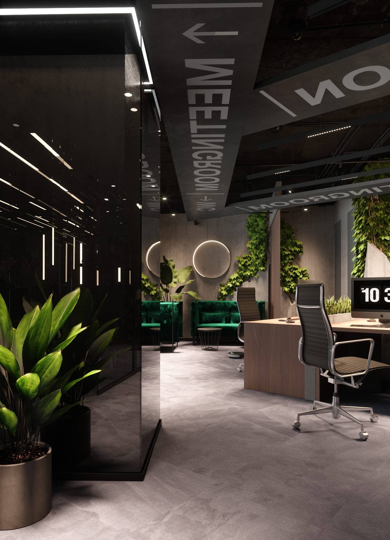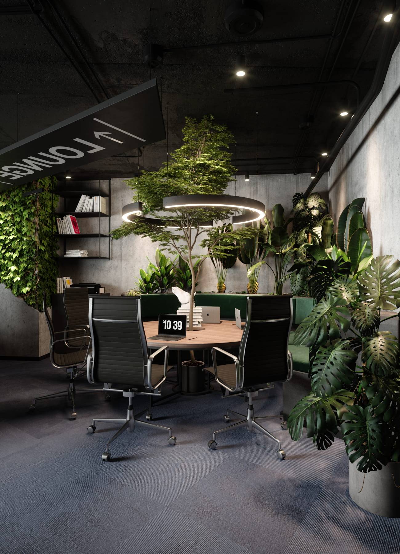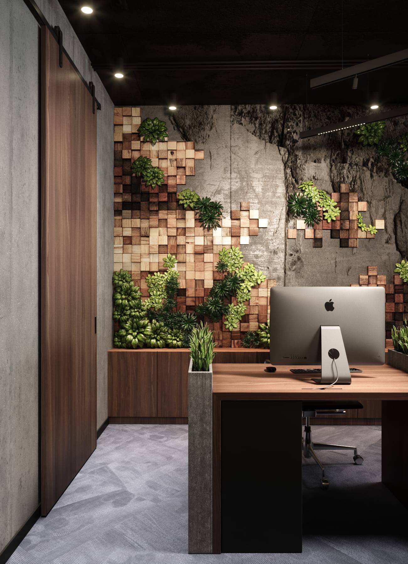 Elegant Loft style office located in Moscow city. The main aim was to build an office that would resemble ancient ruins. Office design features achromatic interior emphasized by grey color scheme, lush green plants and wooden and concrete textures. Glass partitions connect central open space with numerous offices.