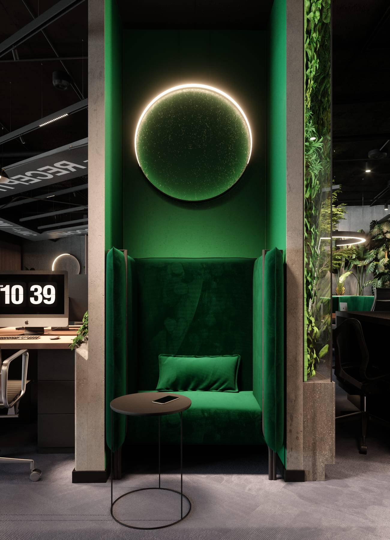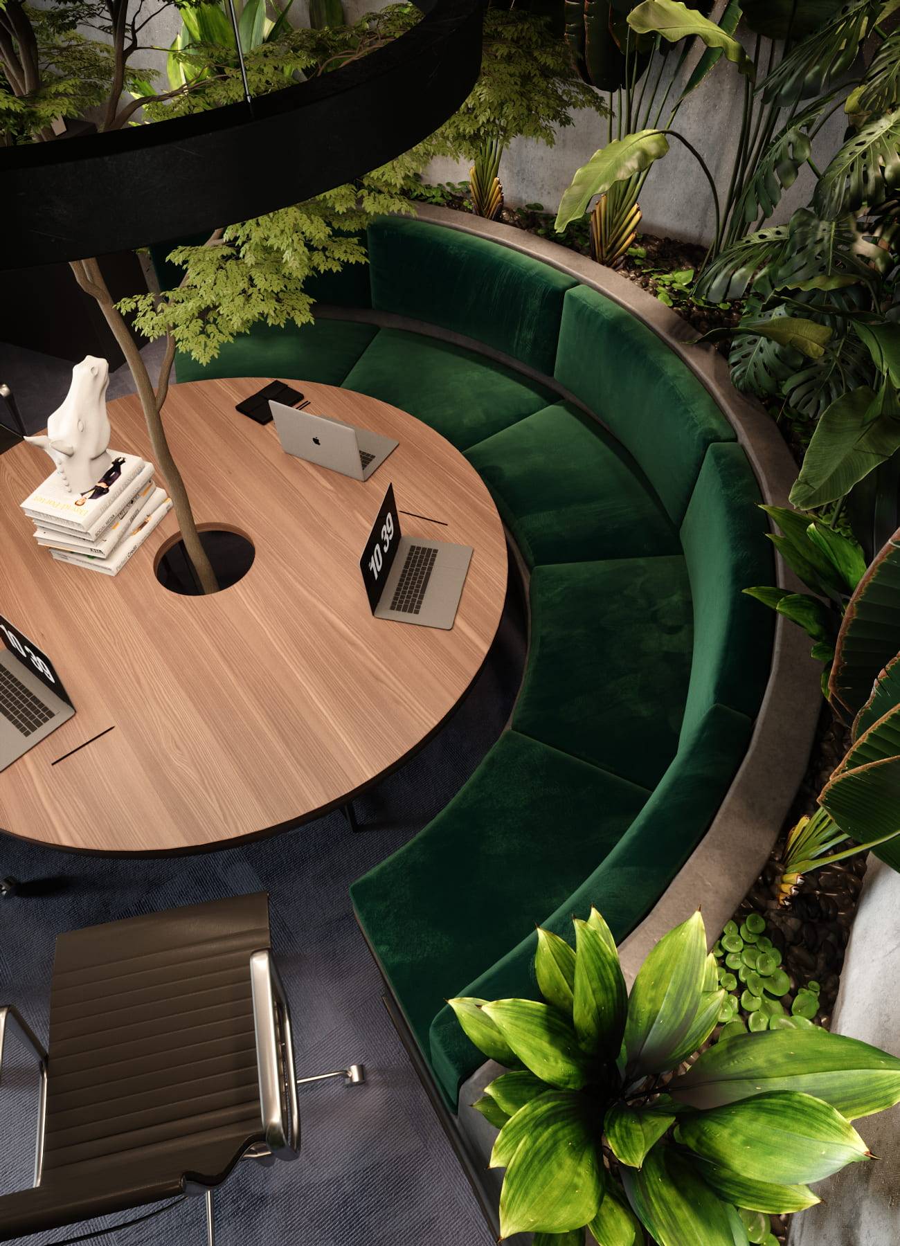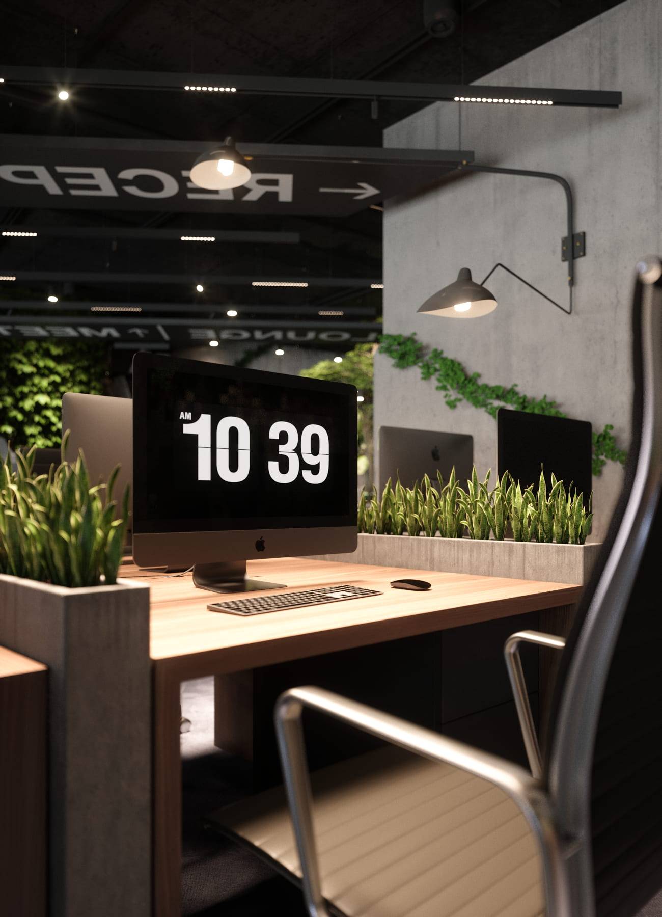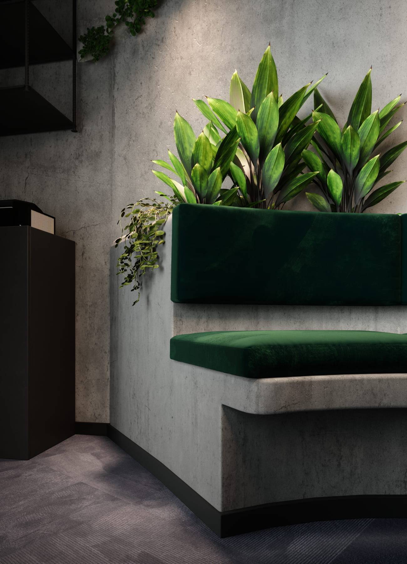 Elegant Loft style office located in Moscow city. The main aim was to build an office that would resemble ancient ruins. Office design features achromatic interior emphasized by grey color scheme, lush green plants and wooden and concrete textures. Glass partitions connect central open space with numerous offices.