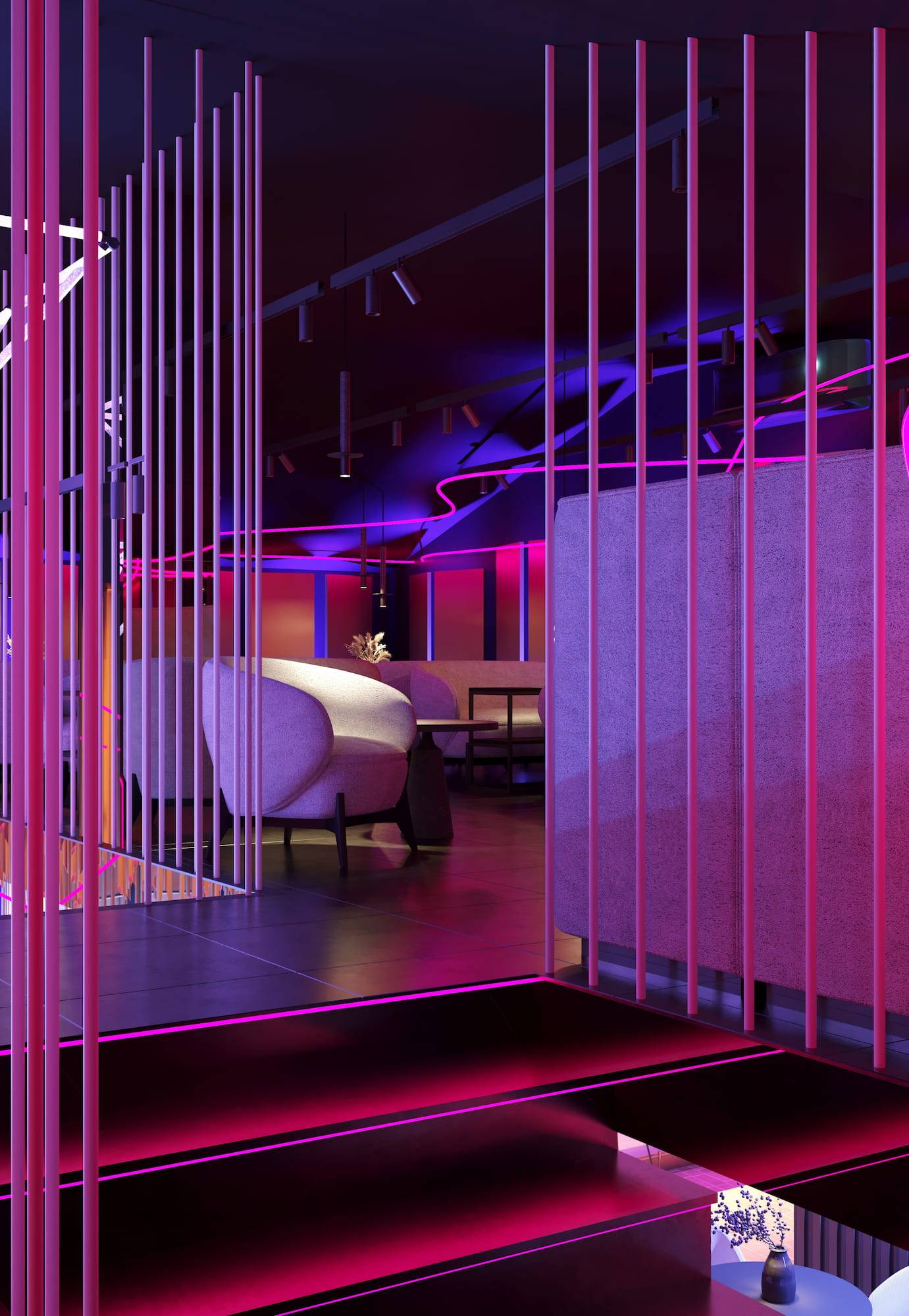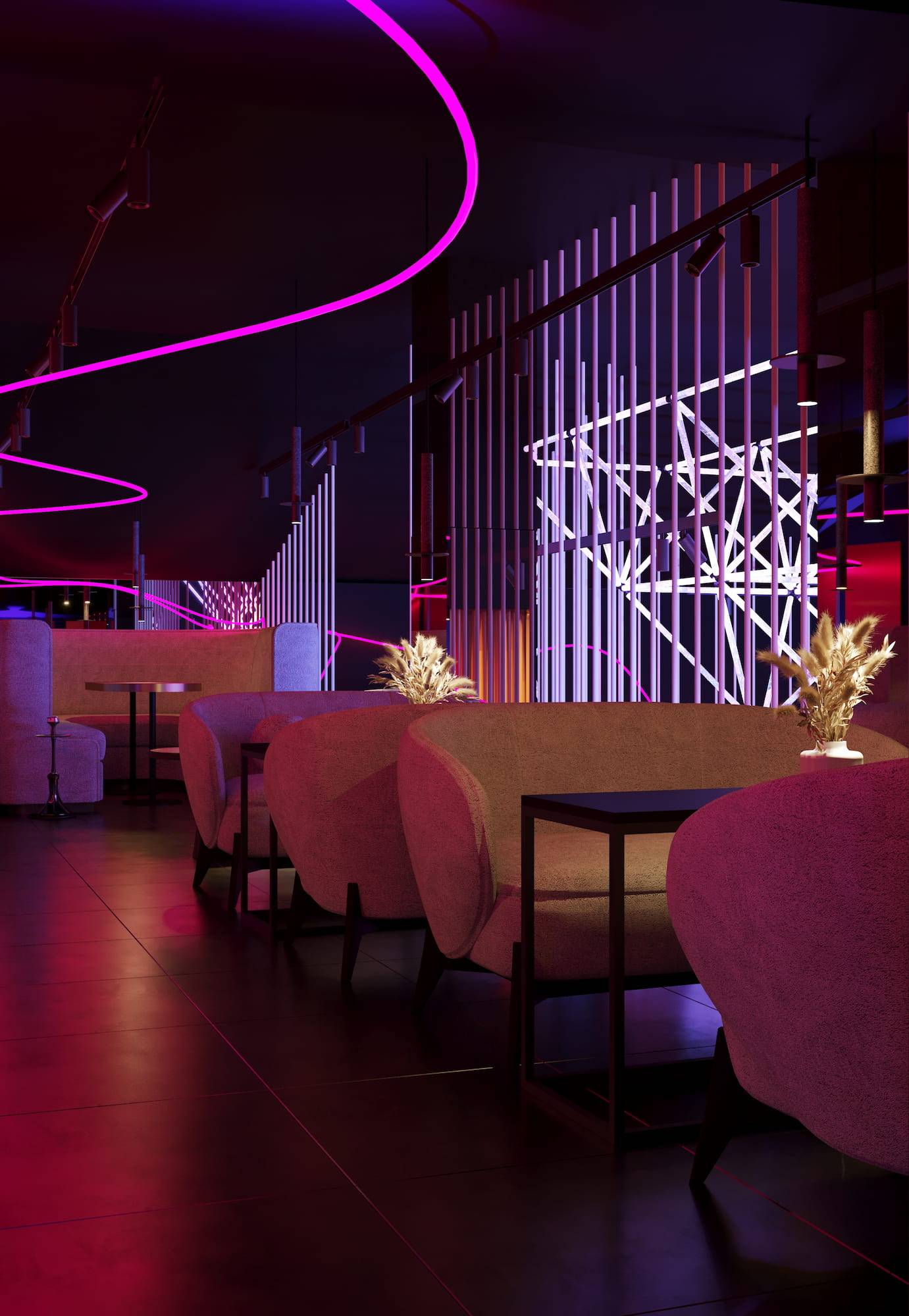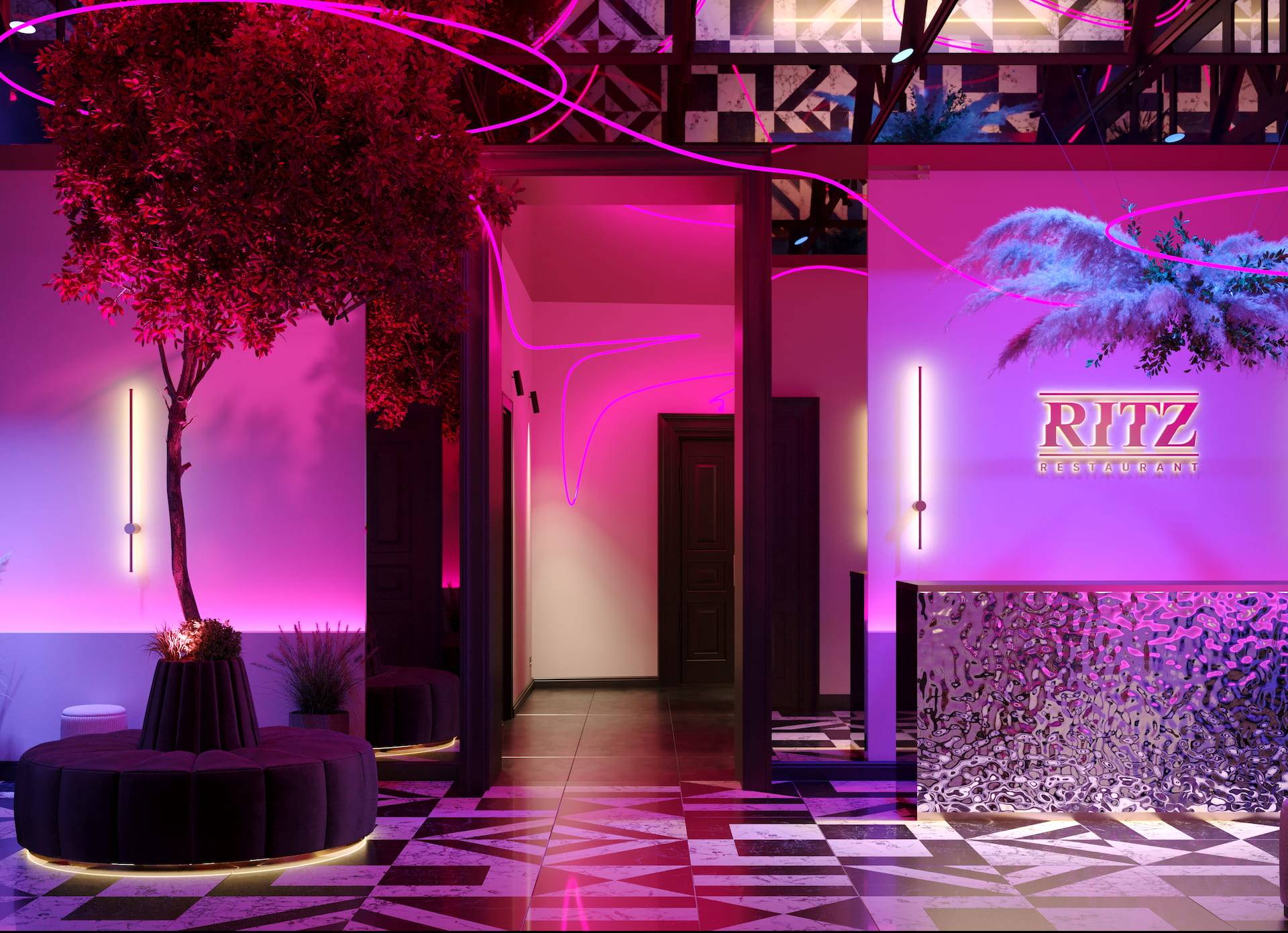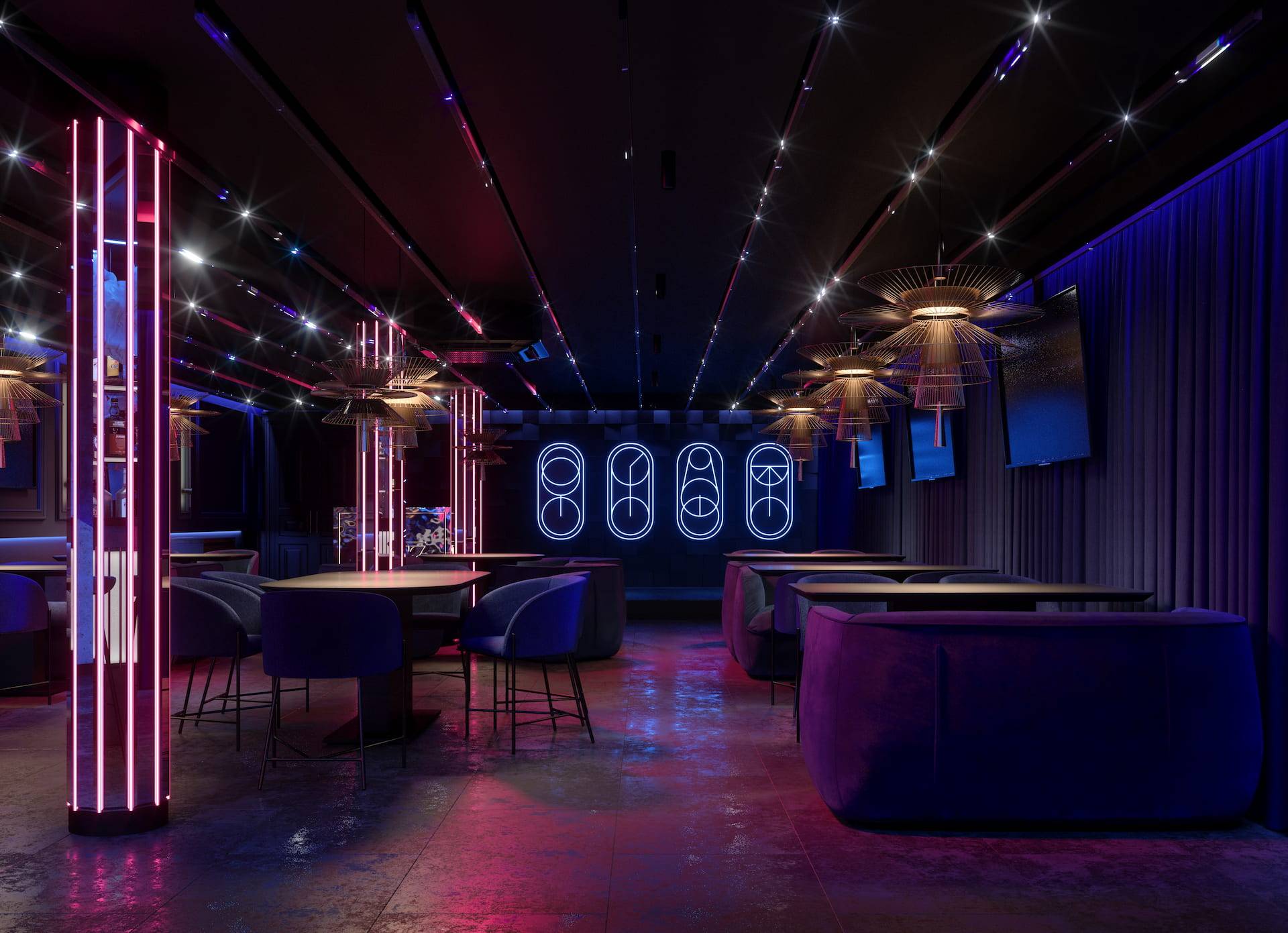 Ritz Nightclub located in the tourist area of Yakutsk. Building features two wings with various lounge spaces connected by a glass lobby.