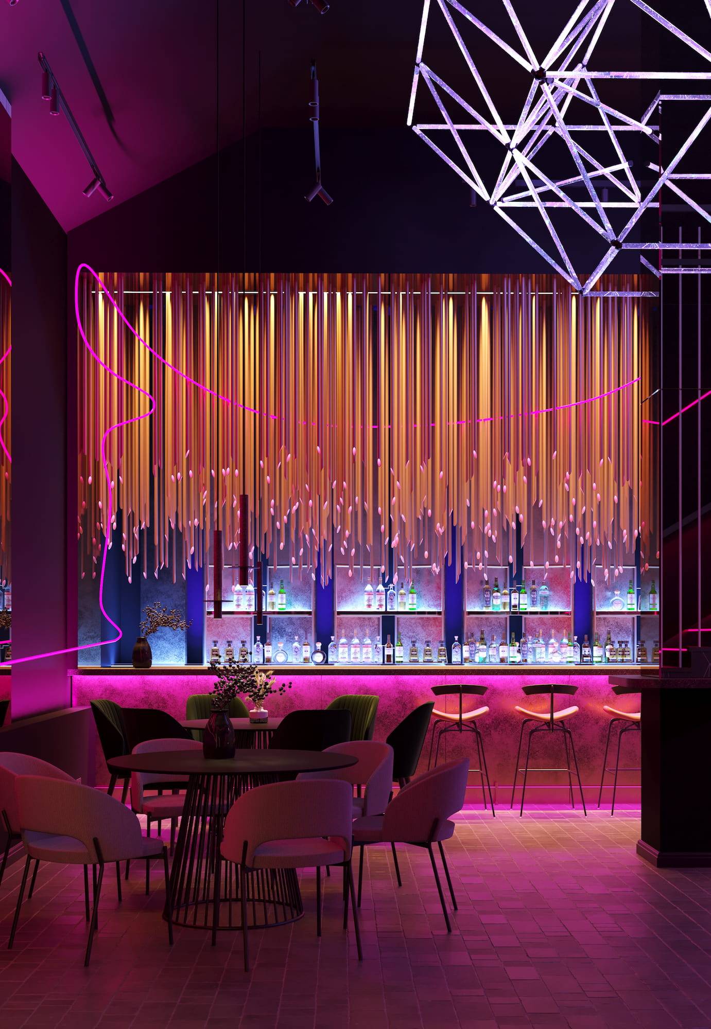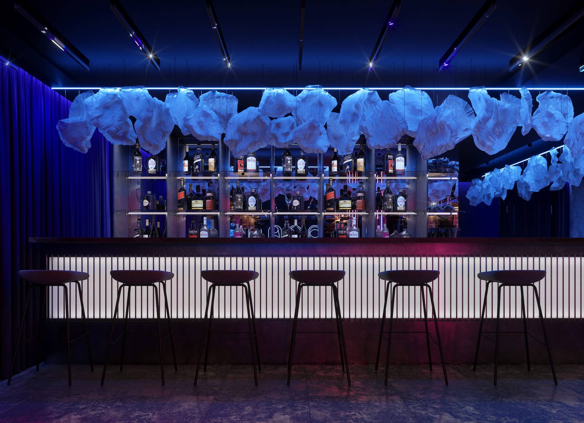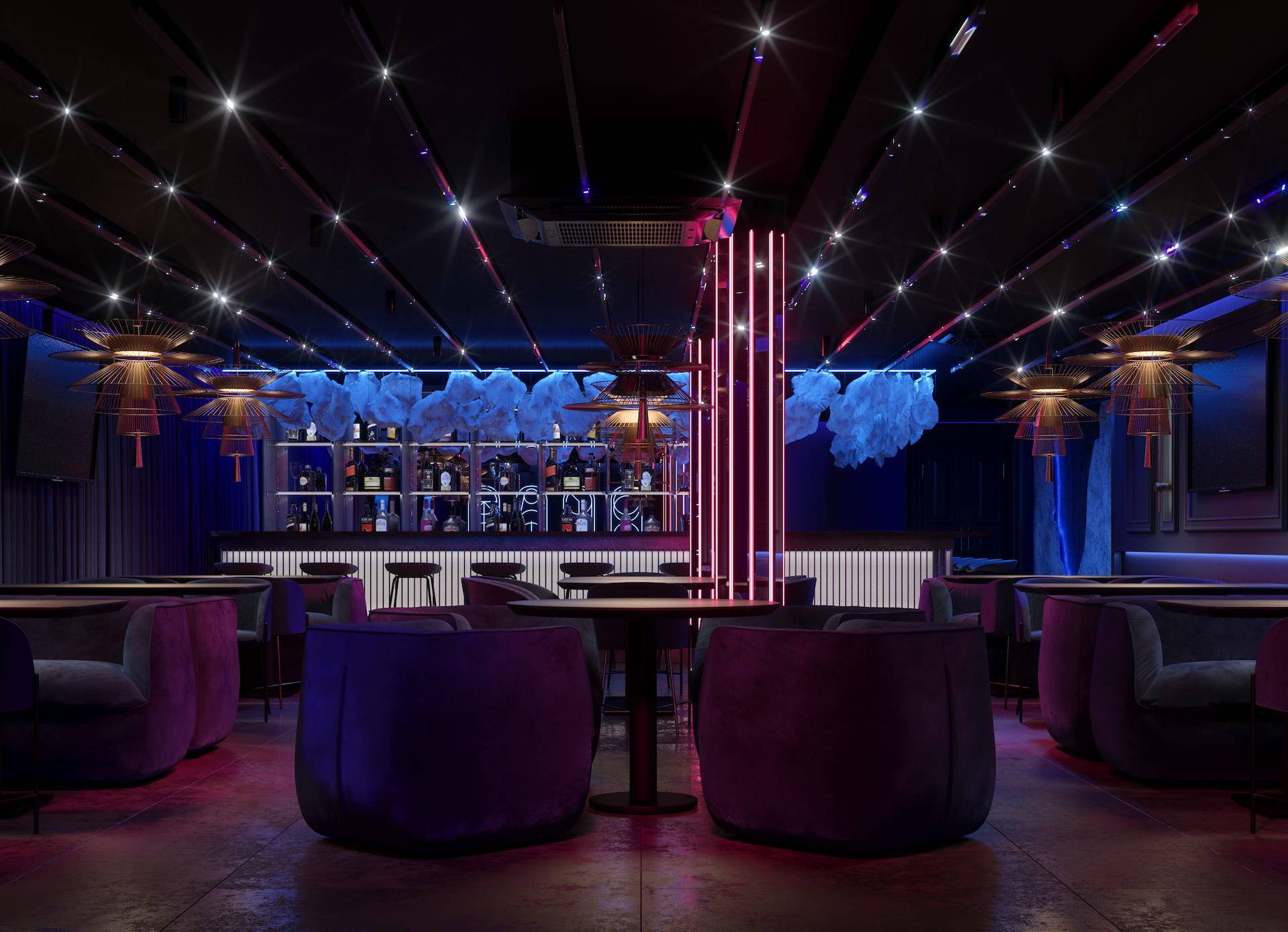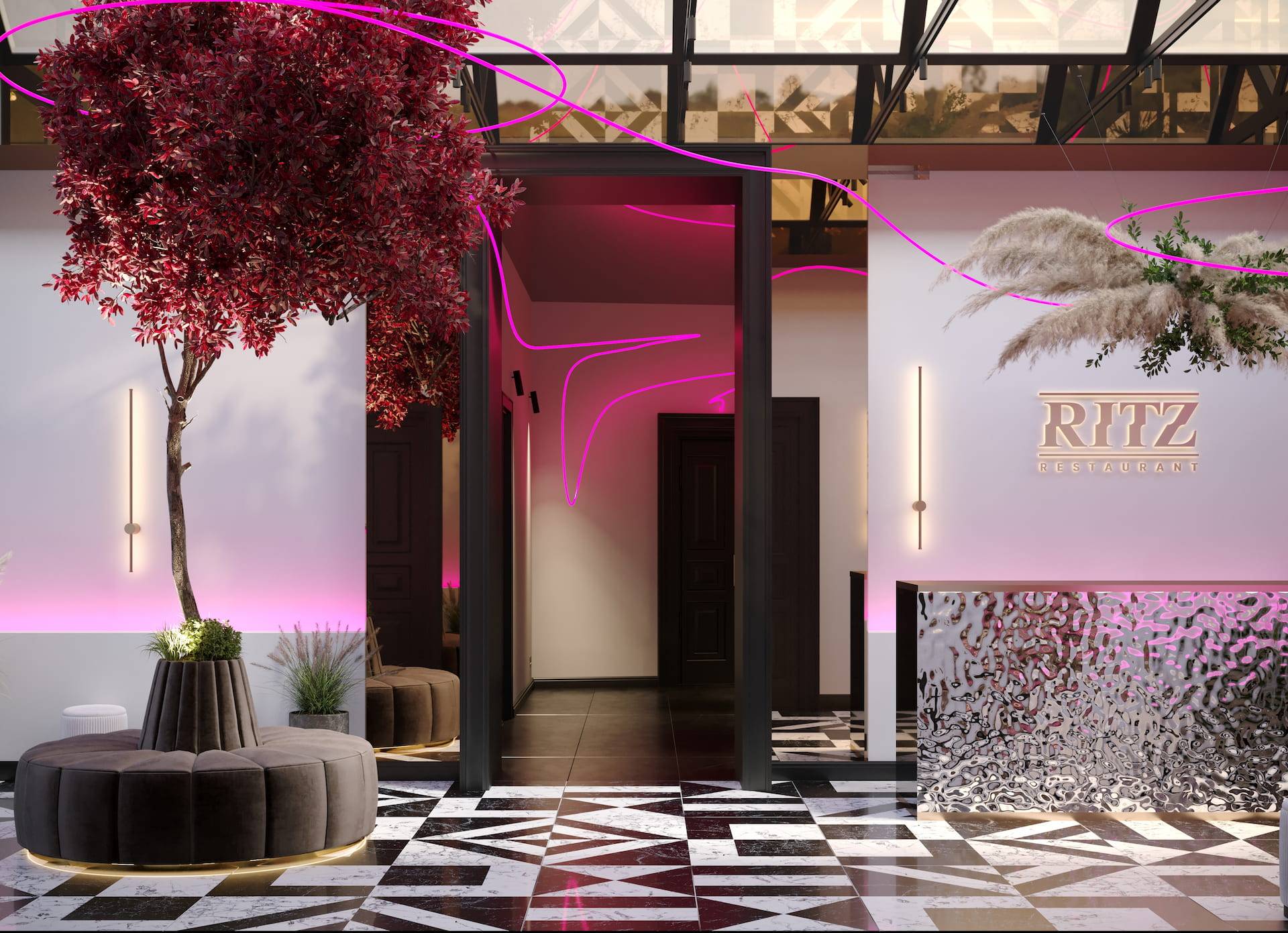 Ritz Nightclub located in the tourist area of Yakutsk. Building features two wings with various lounge spaces connected by a glass lobby.