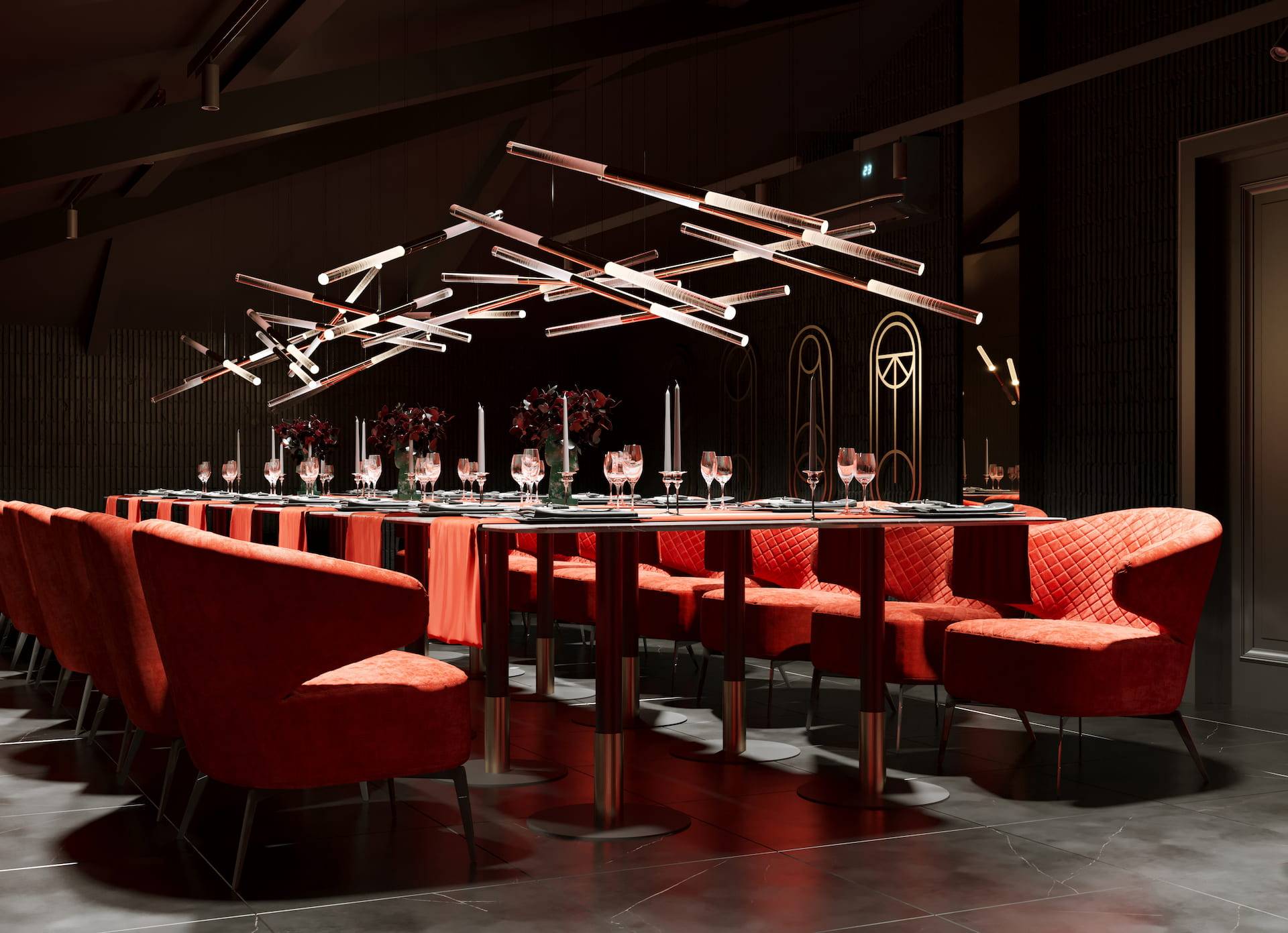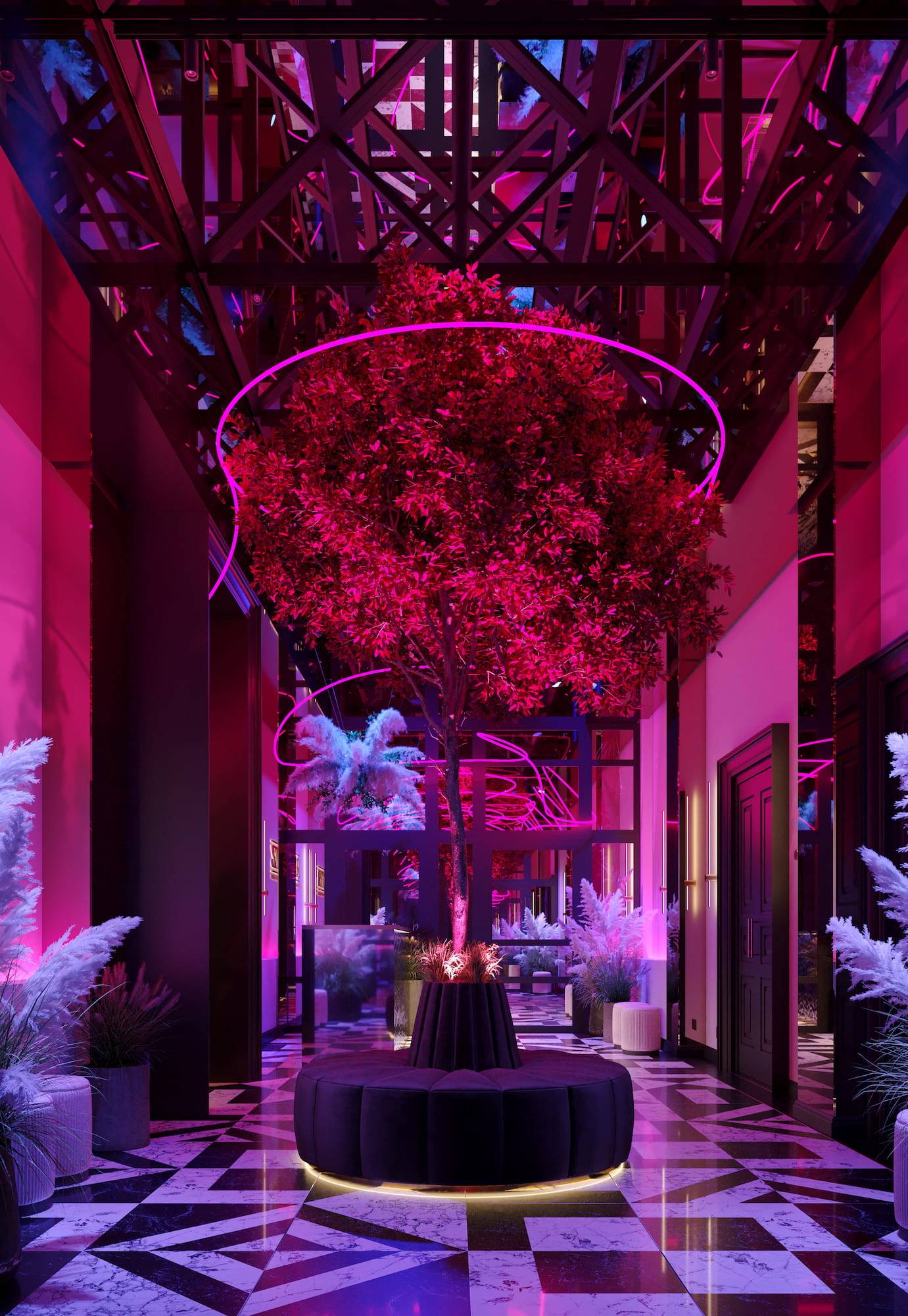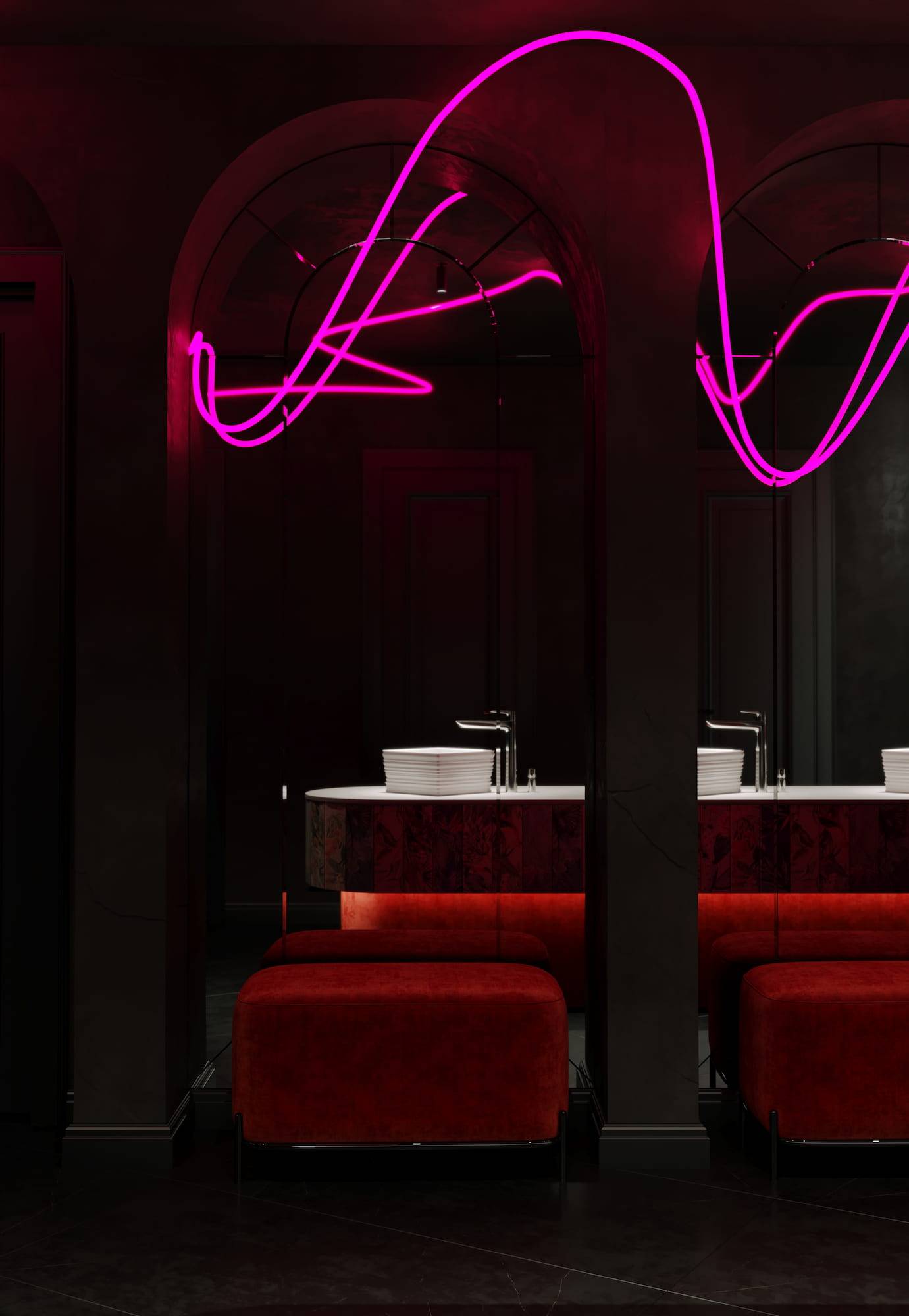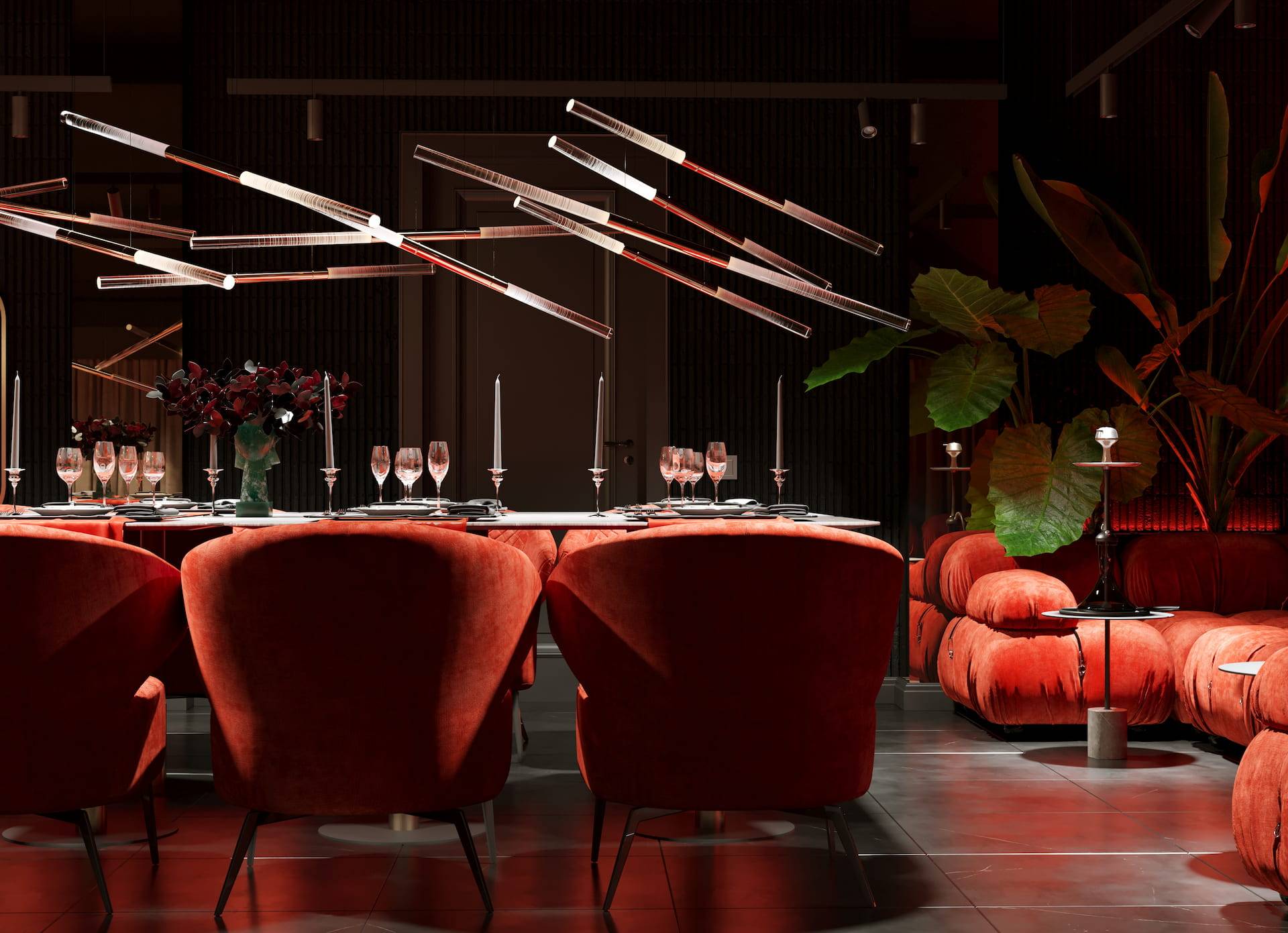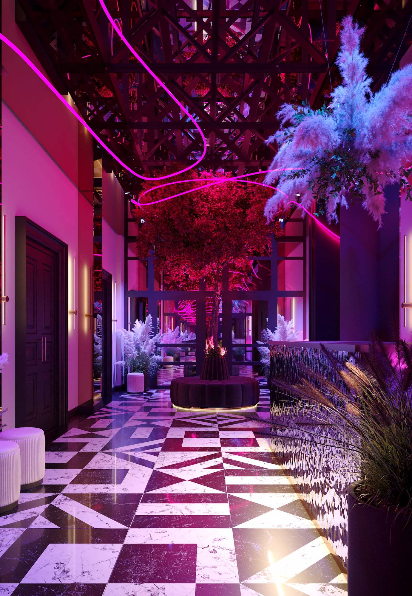 Ritz Nightclub located in the tourist area of Yakutsk. Building features two wings with various lounge spaces connected by a glass lobby.