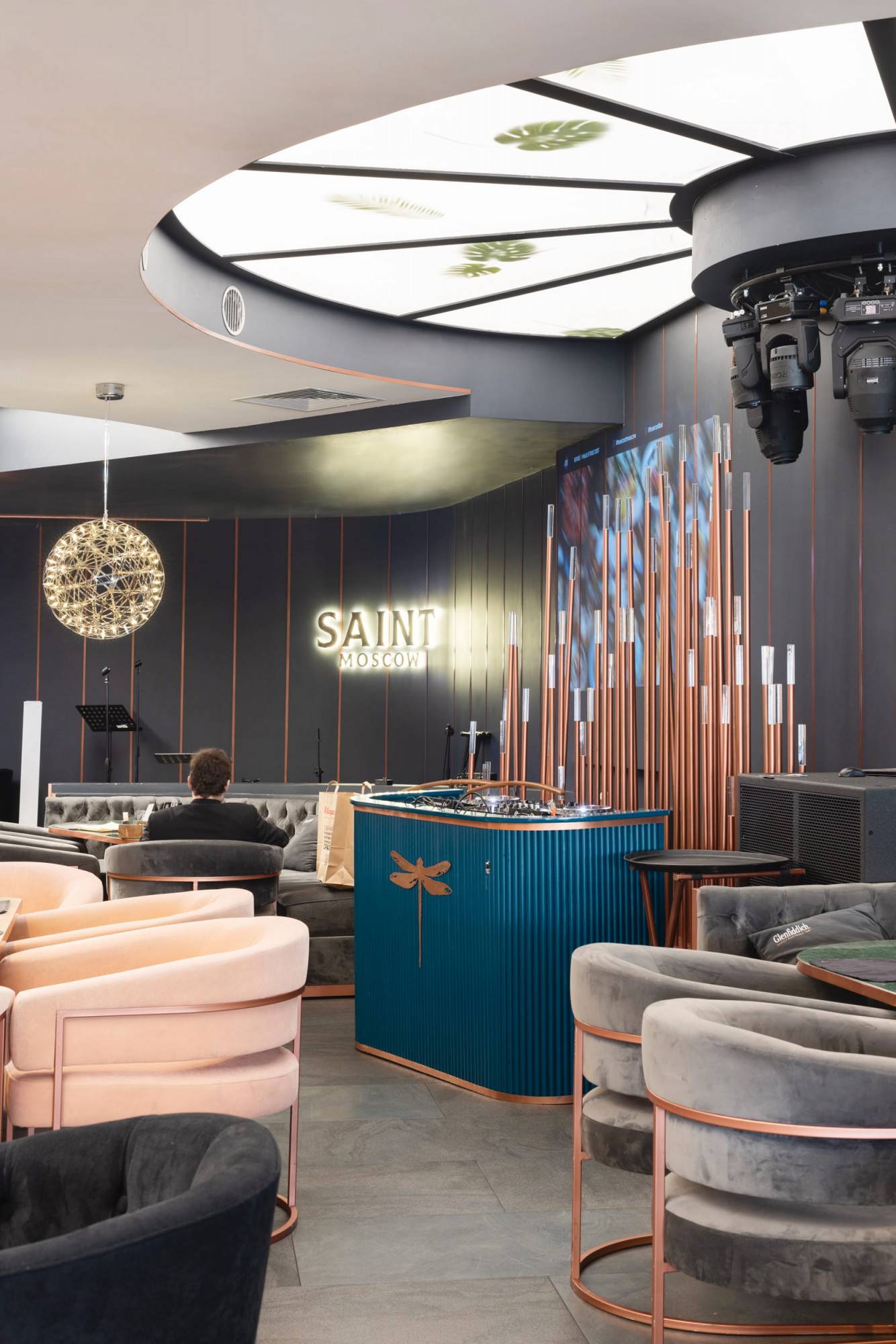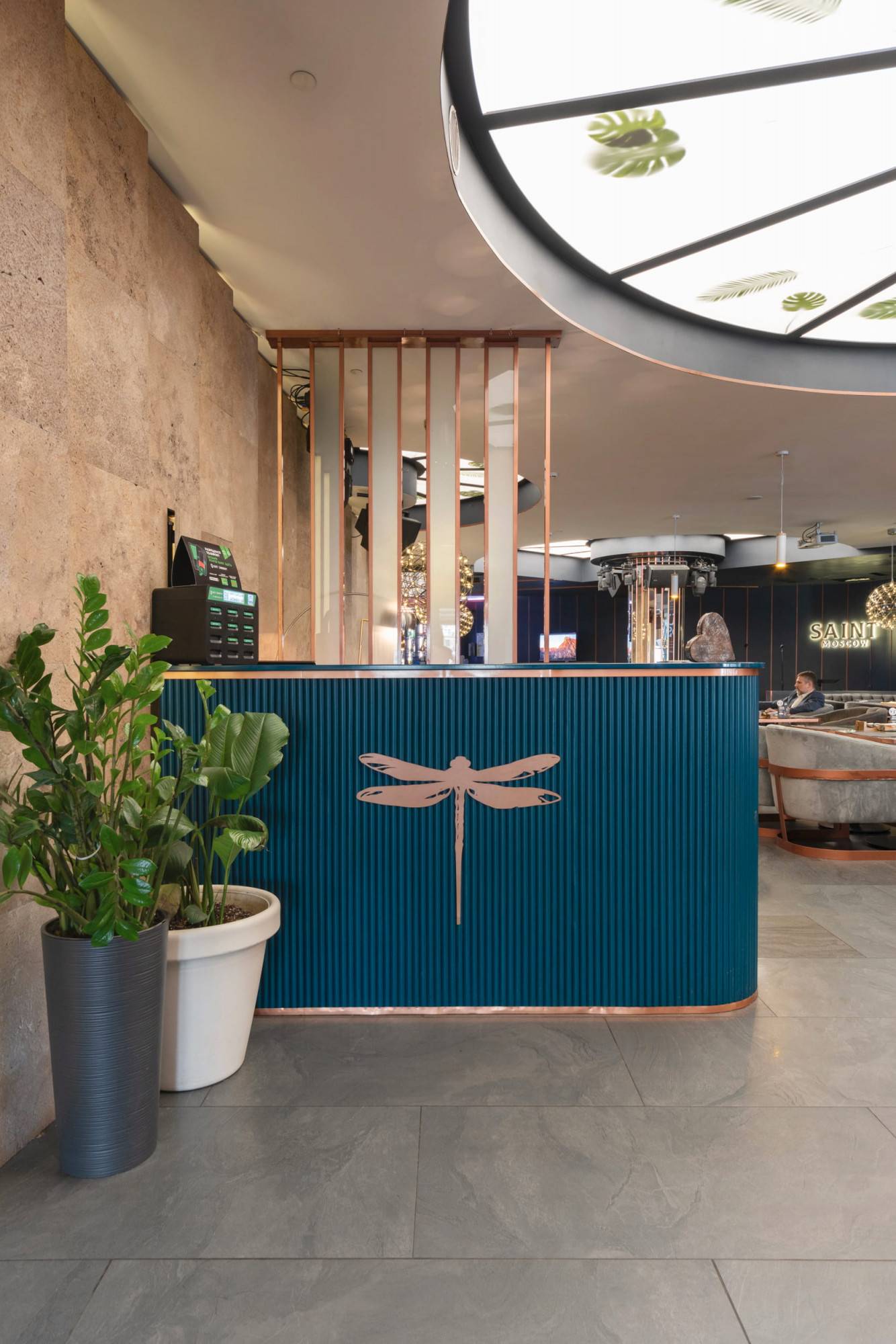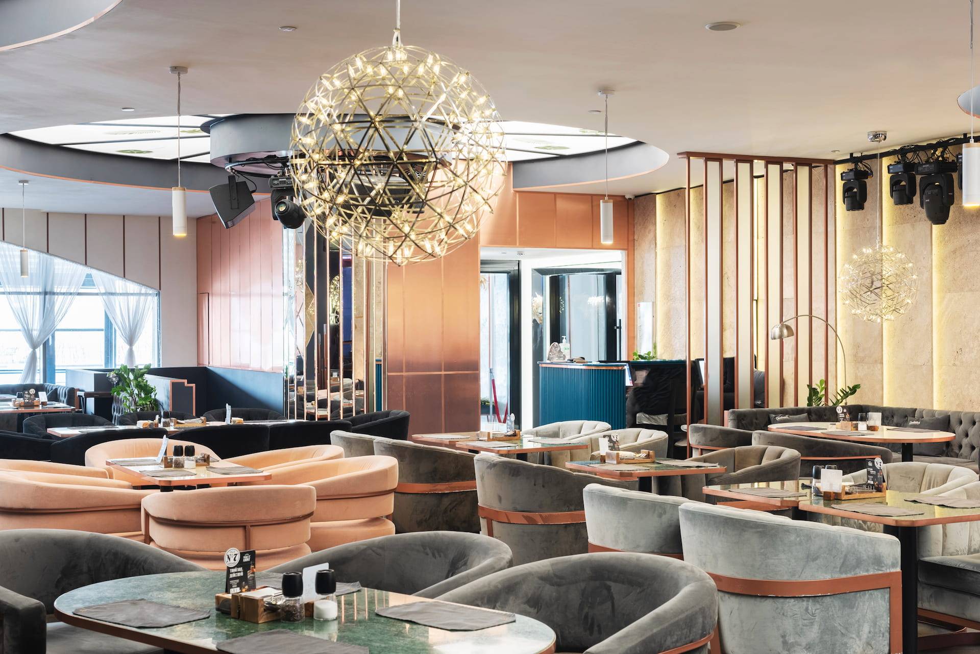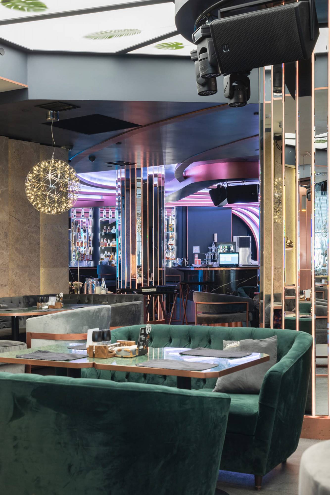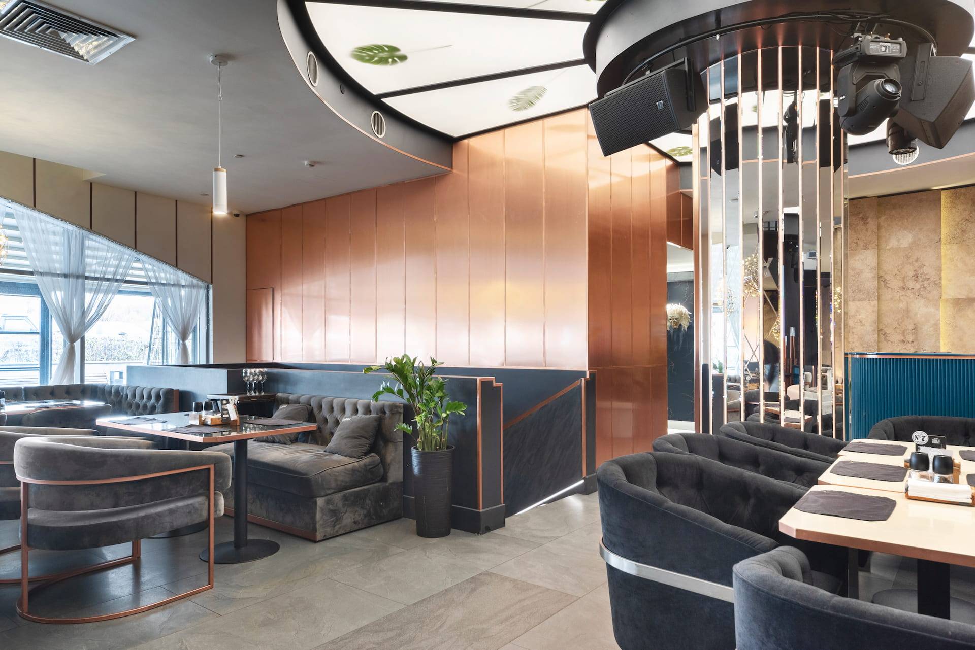 Upscale modern restaurant located in Moscow. The main goal was to create a stylish and multifunctional restaurant that can be easily transformed into a venue for parties or events for high-status individuals and celebrities. Therefore, the main hall was divided into two areas where the lighting system allows the space to quickly transform into a nightclub. Graphite ceiling with luminous copper slats, mirrors and an installation with palm leaves highlight the nightclub area.