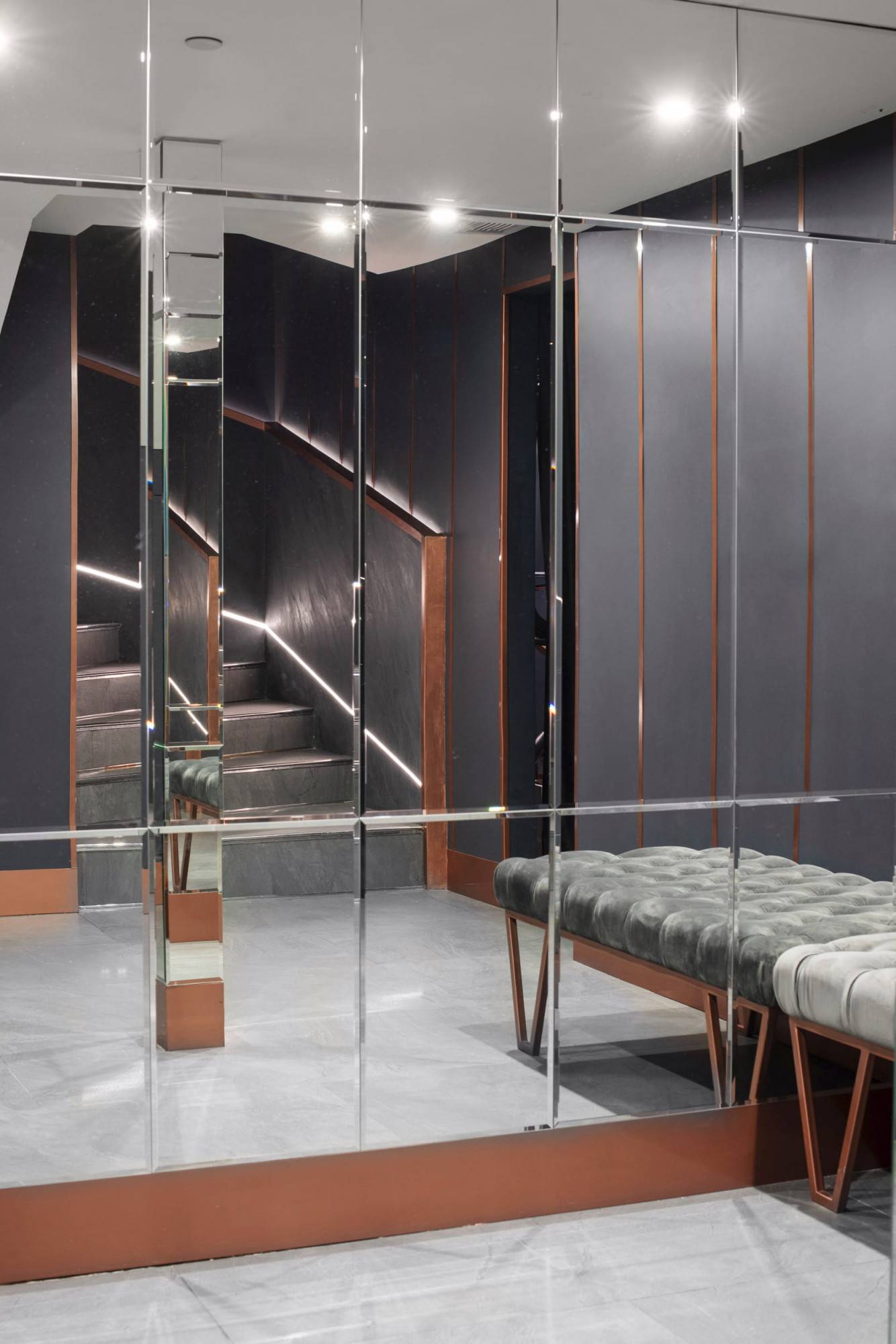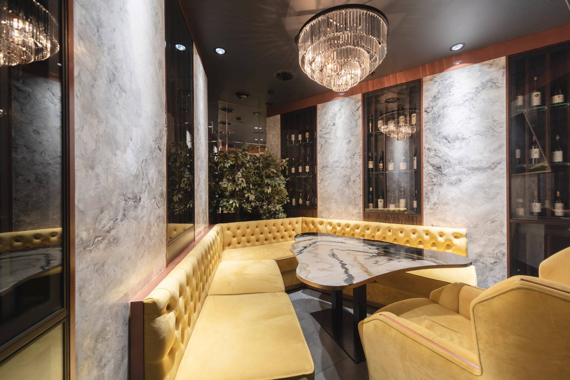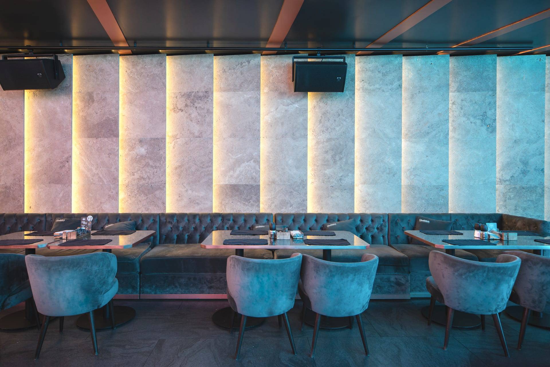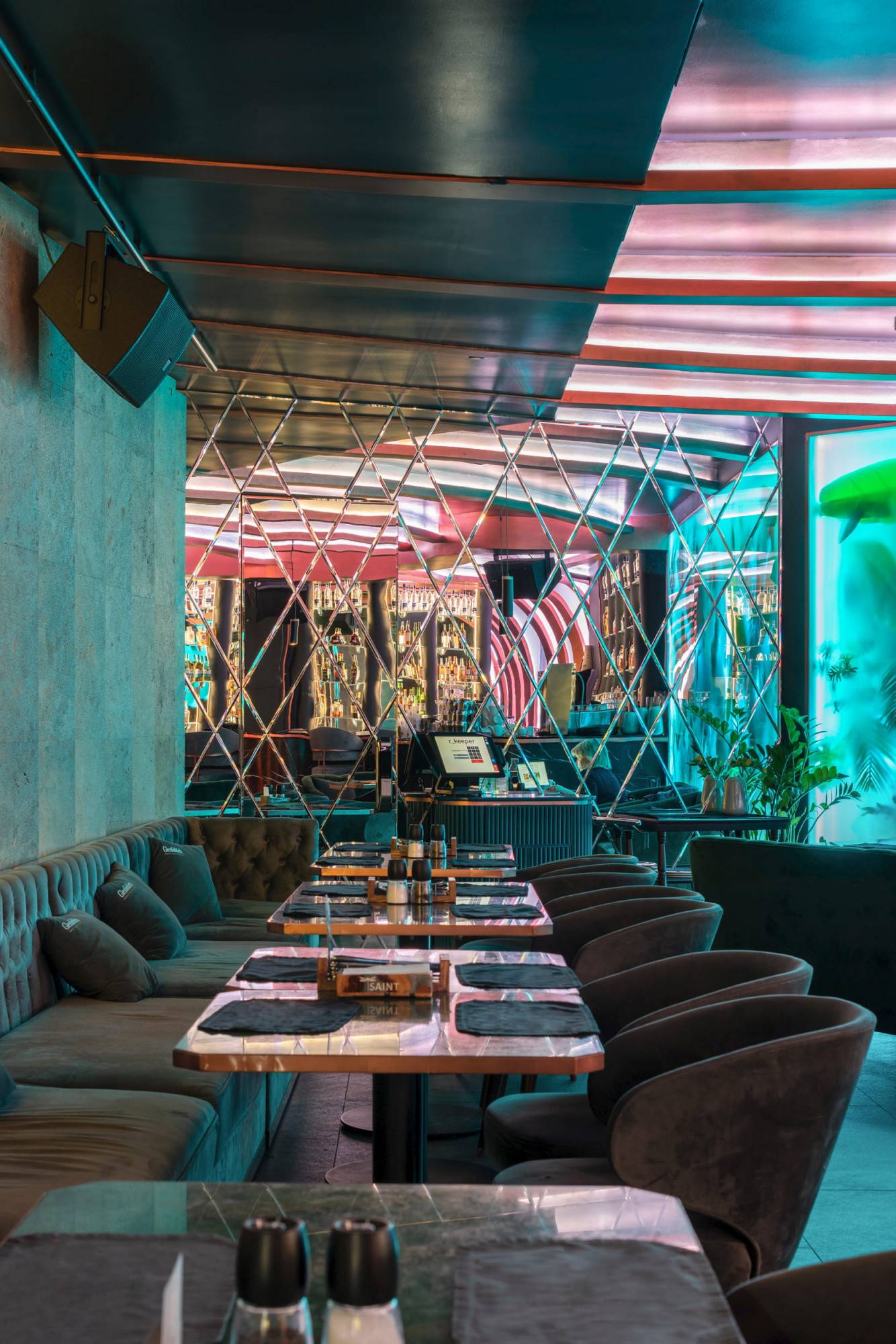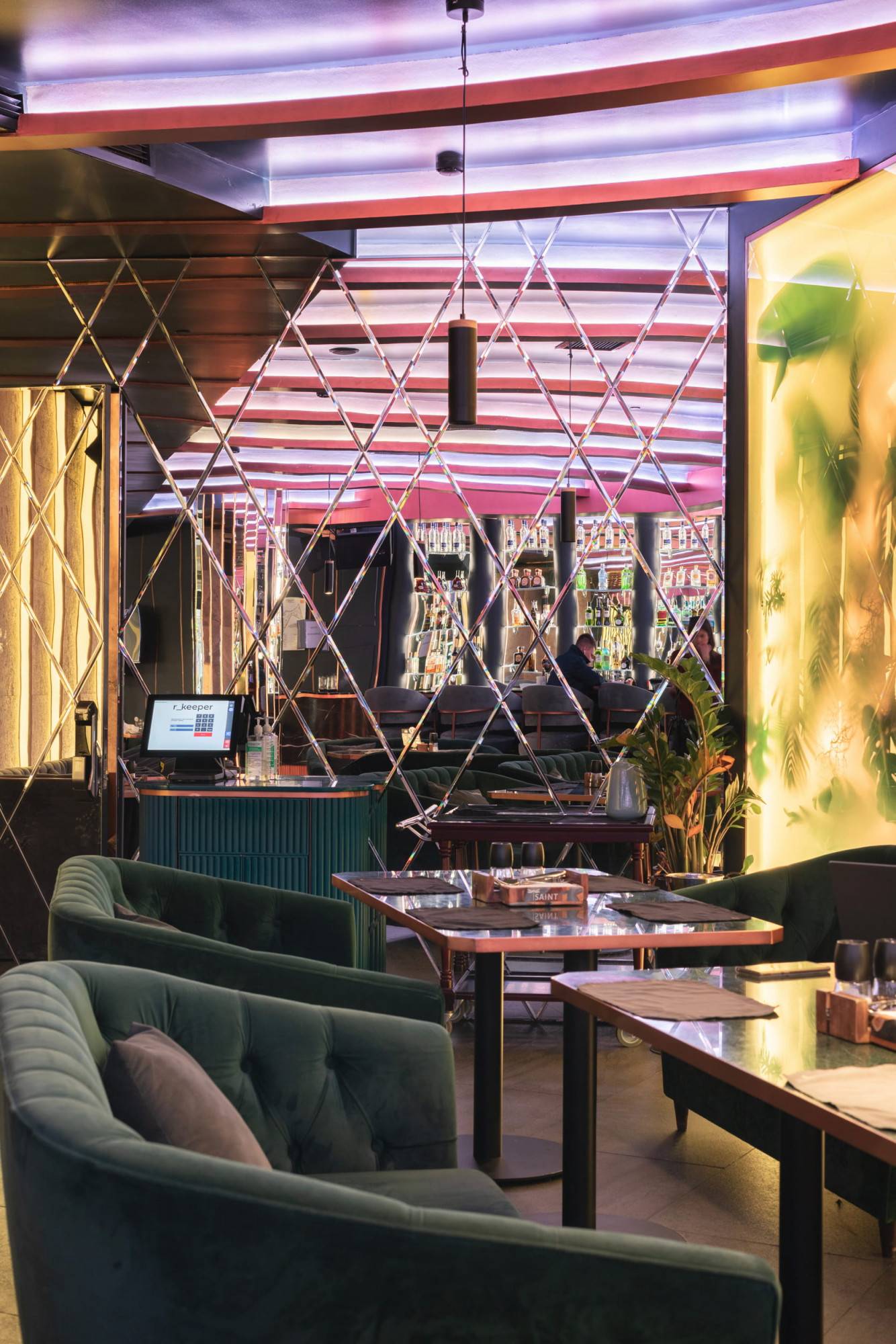 Upscale modern restaurant located in Moscow. The main goal was to create a stylish and multifunctional restaurant that can be easily transformed into a venue for parties or events for high-status individuals and celebrities. Therefore, the main hall was divided into two areas where the lighting system allows the space to quickly transform into a nightclub. Graphite ceiling with luminous copper slats, mirrors and an installation with palm leaves highlight the nightclub area.
