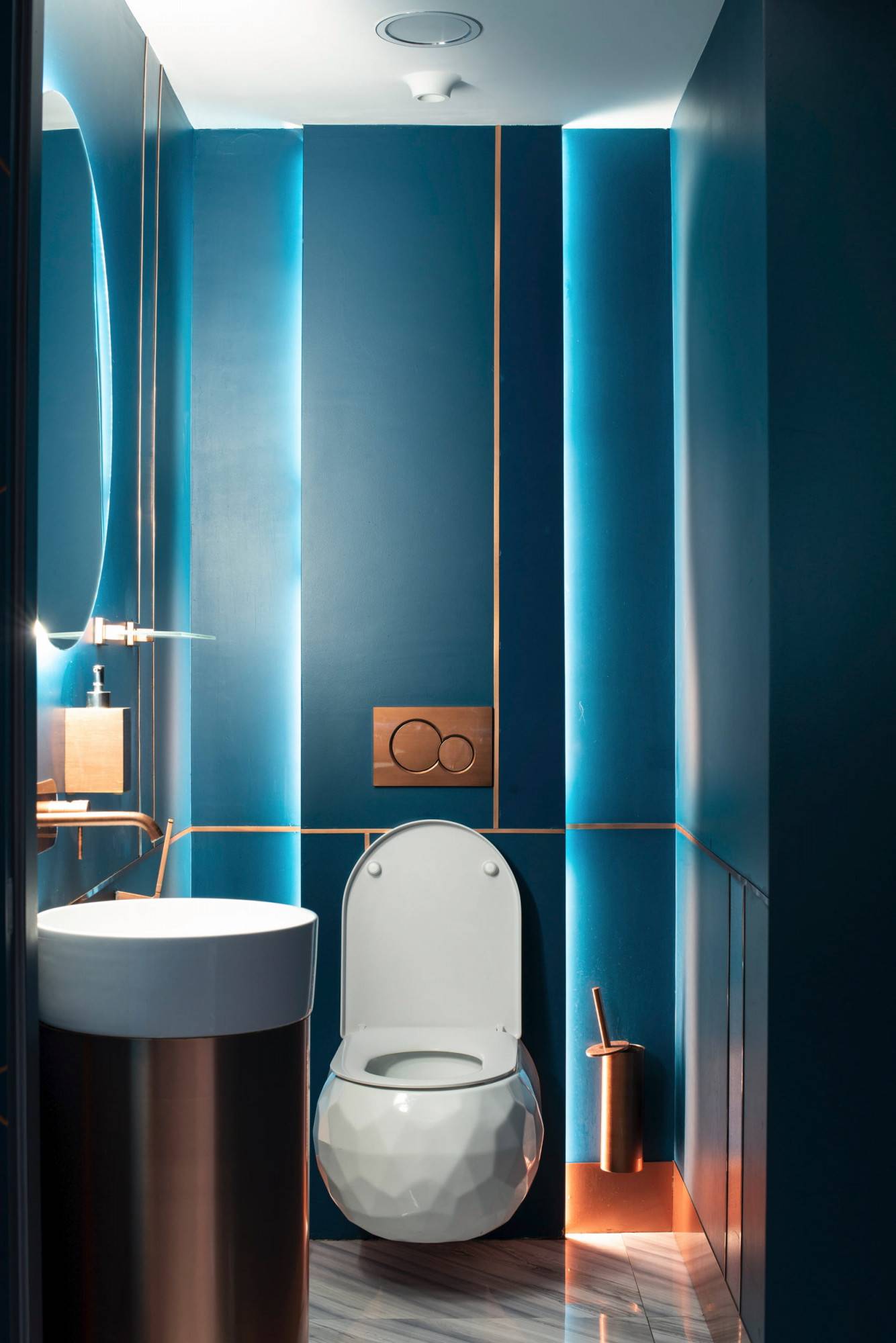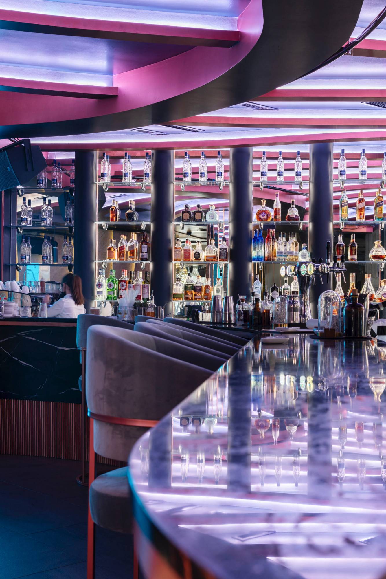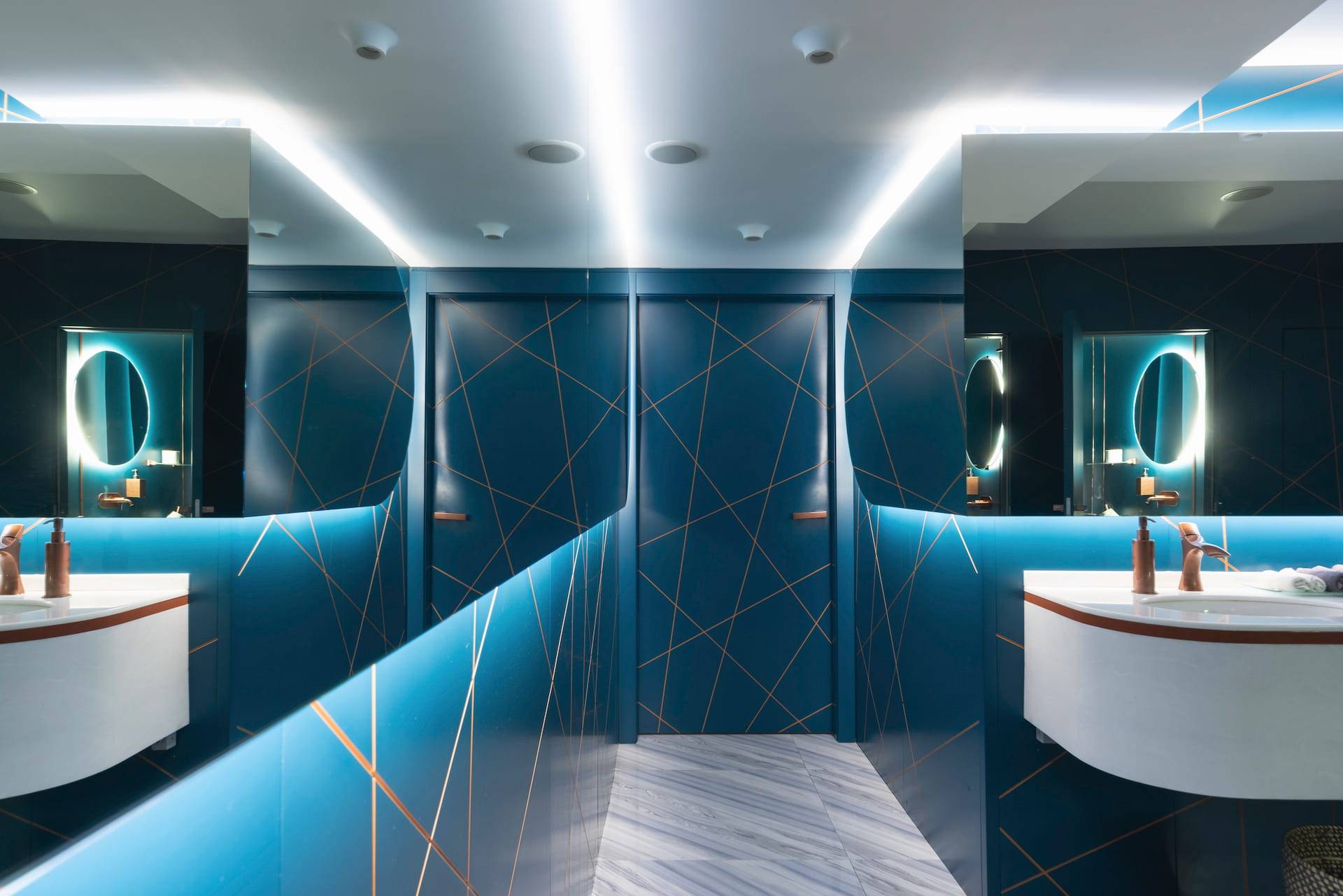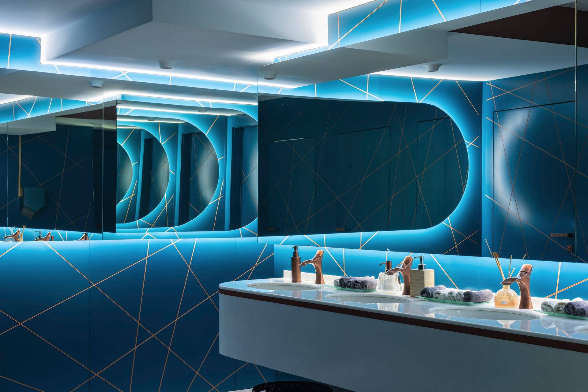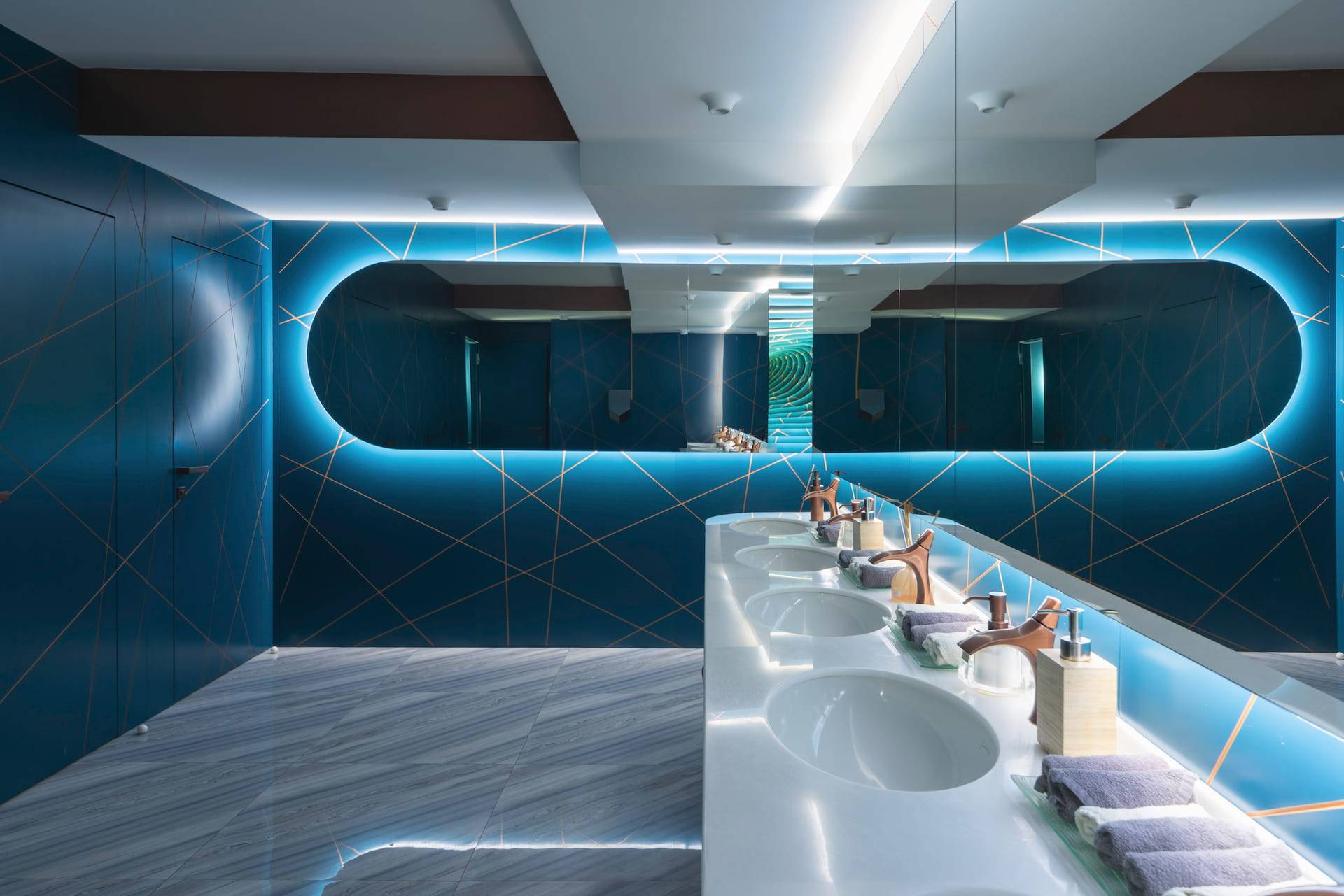Upscale modern restaurant located in Moscow. The main goal was to create a stylish and multifunctional restaurant that can be easily transformed into a venue for parties or events for high-status individuals and celebrities. Therefore, the main hall was divided into two areas where the lighting system allows the space to quickly transform into a nightclub. Graphite ceiling with luminous copper slats, mirrors and an installation with palm leaves highlight the nightclub area.