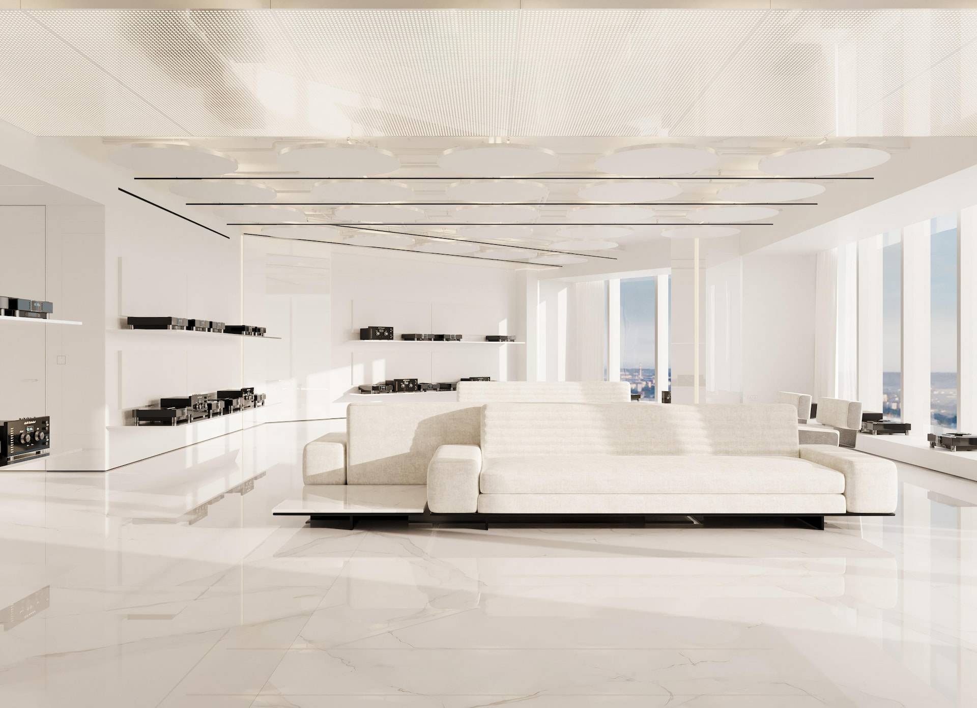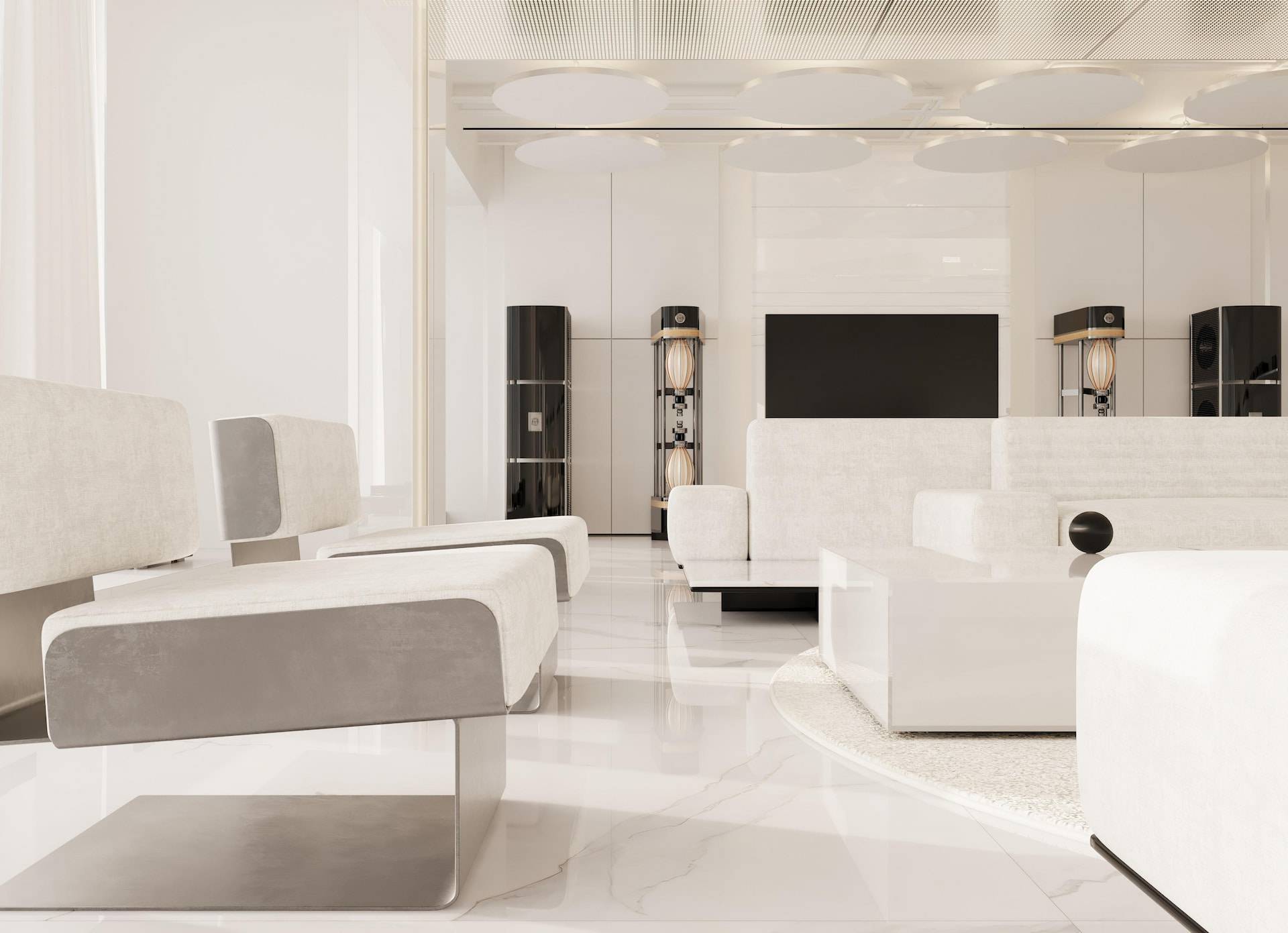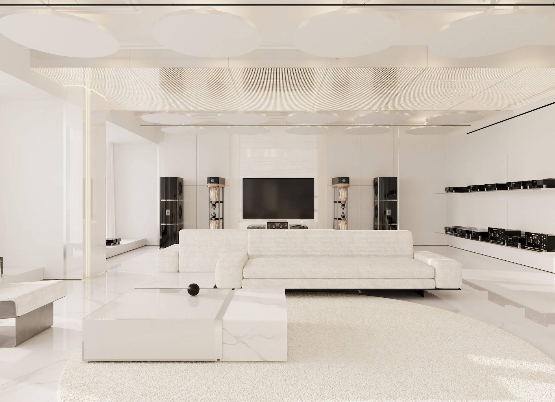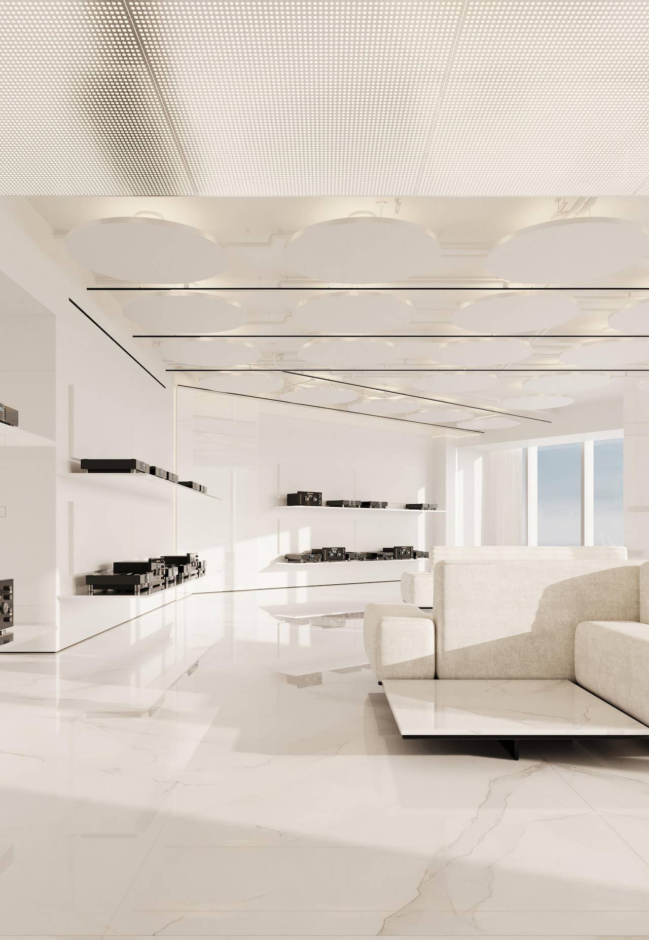 An uncluttered interior that doesn't distract from the main purpose - listening to music with Hi-End audio systems. This showroom of premium audio equipment features a monochromatic design, with glossy white marble, stainless steel, and white solid glass, which contrasts beautifully with the products. Collectible furniture highlights the status of the audio equipment. The showroom's design incorporates thoughtful details, such as round sound-absorbing panels suspended from the ceiling that improve acoustics while also serving as decoration. Engineering systems are concealed behind decorative perforated metal boxes with lighting.