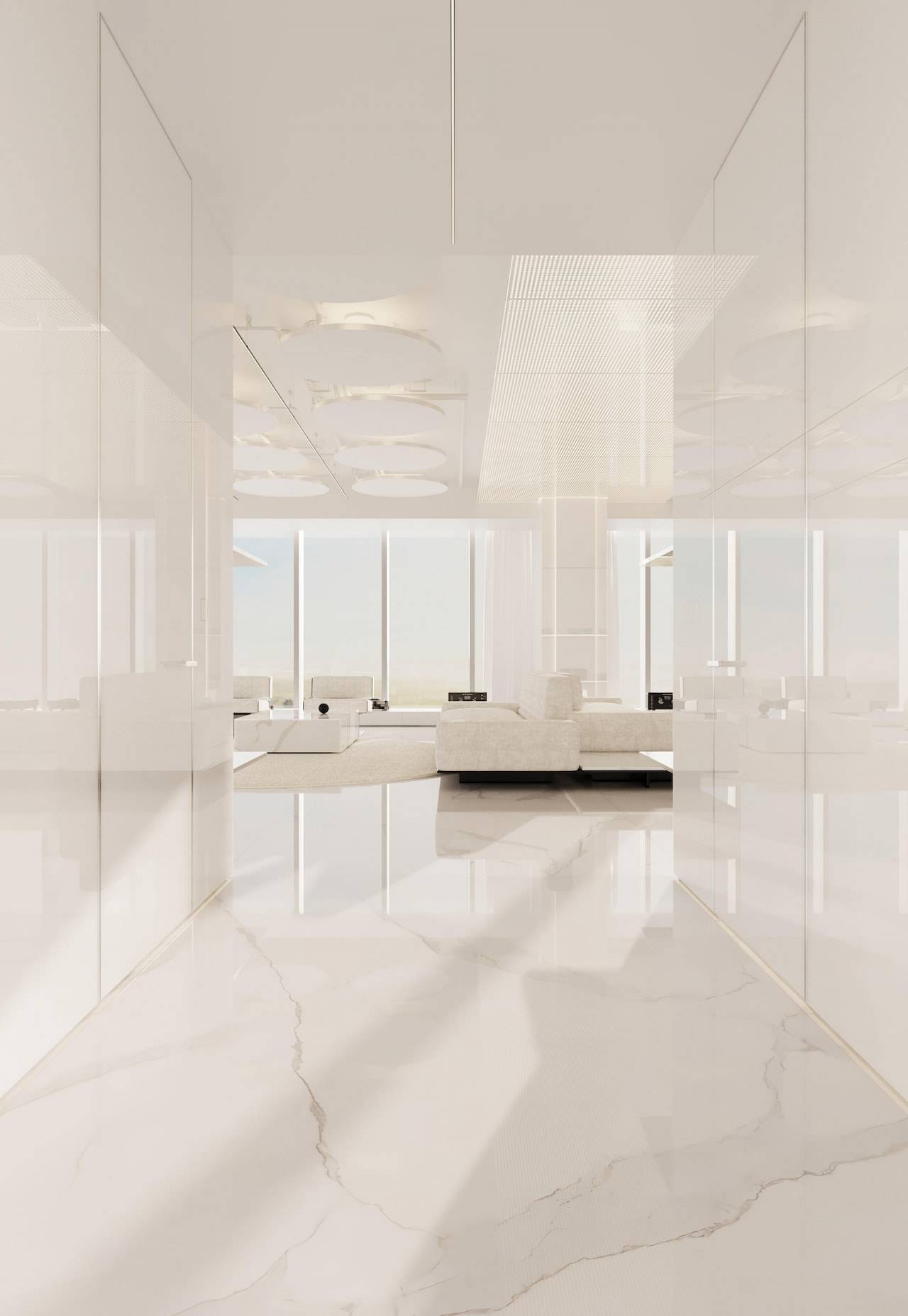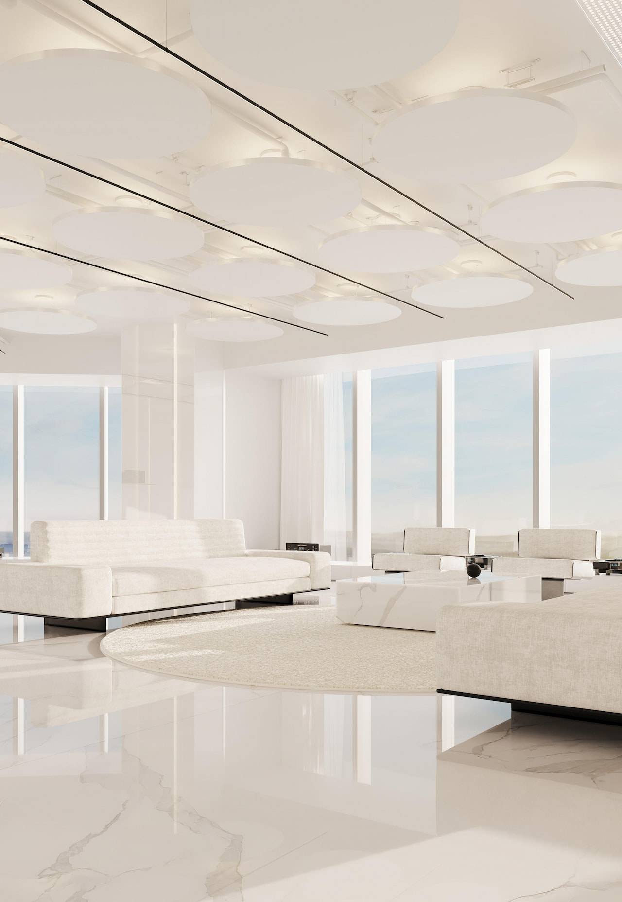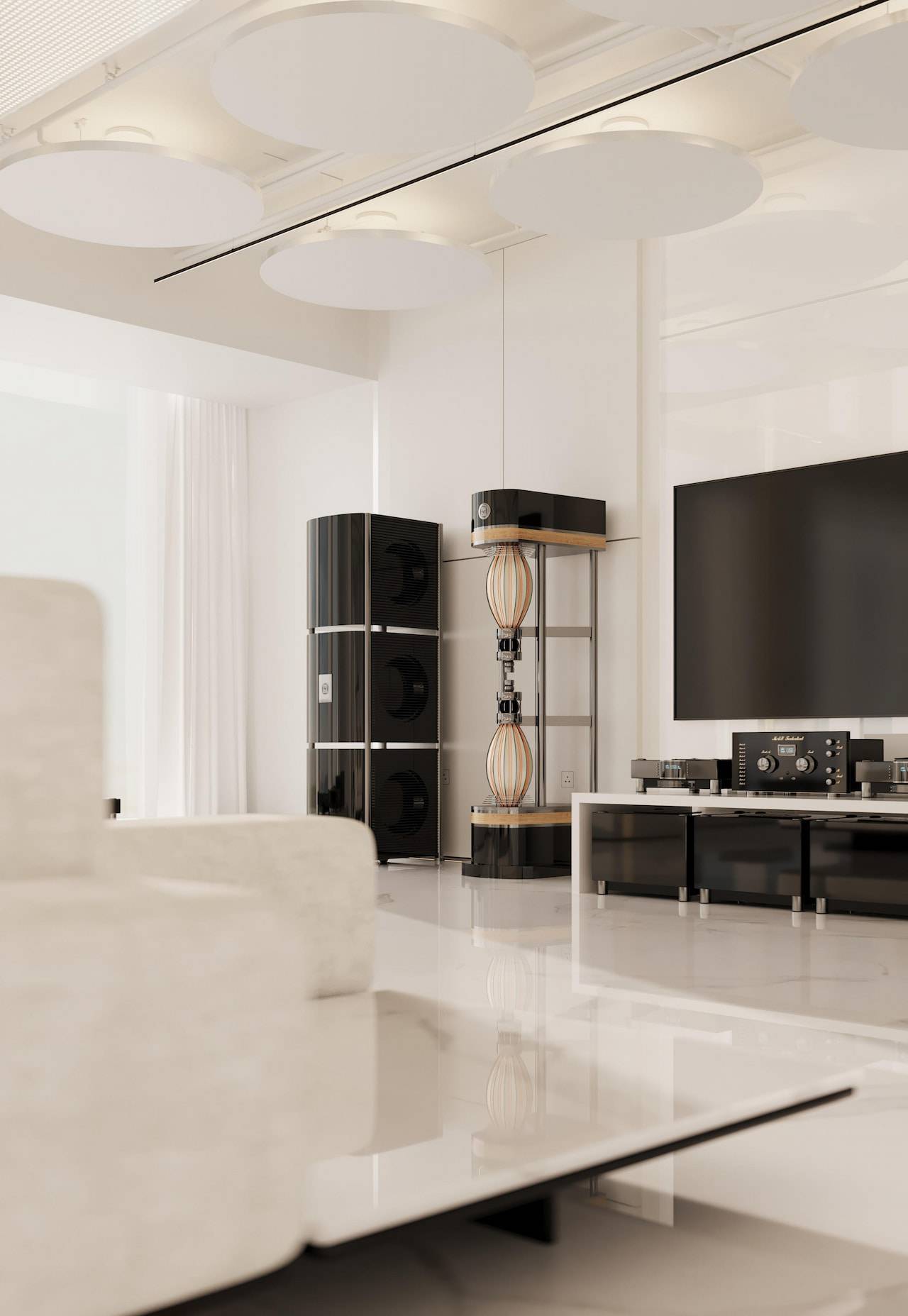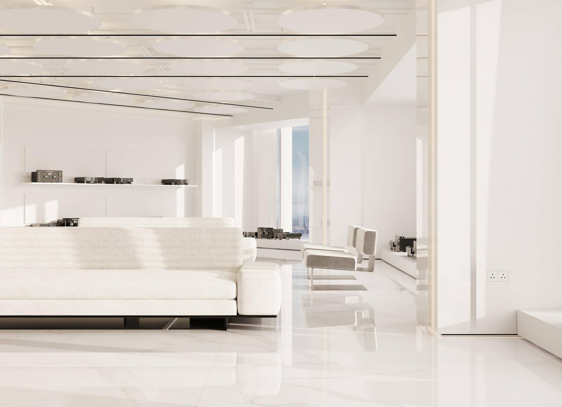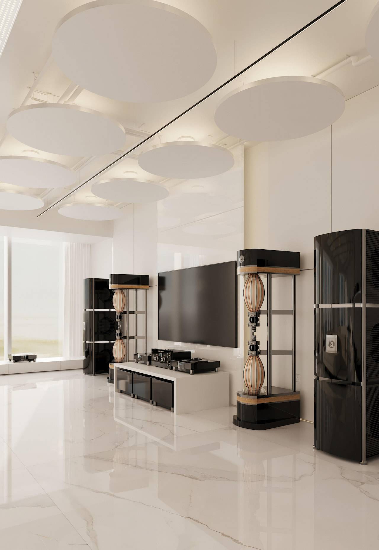 An uncluttered interior that doesn't distract from the main purpose - listening to music with Hi-End audio systems. This showroom of premium audio equipment features a monochromatic design, with glossy white marble, stainless steel, and white solid glass, which contrasts beautifully with the products. Collectible furniture highlights the status of the audio equipment. The showroom's design incorporates thoughtful details, such as round sound-absorbing panels suspended from the ceiling that improve acoustics while also serving as decoration. Engineering systems are concealed behind decorative perforated metal boxes with lighting.