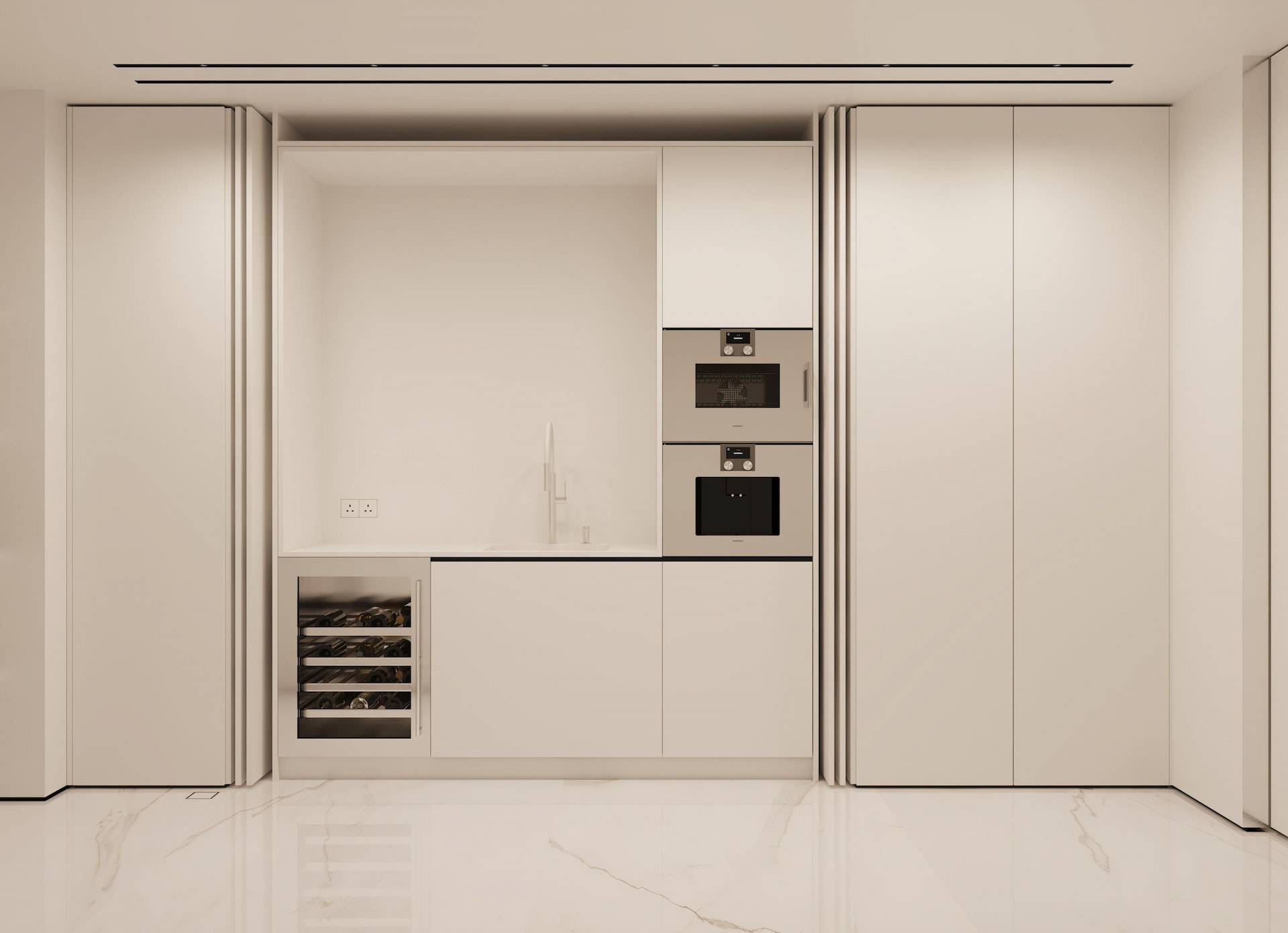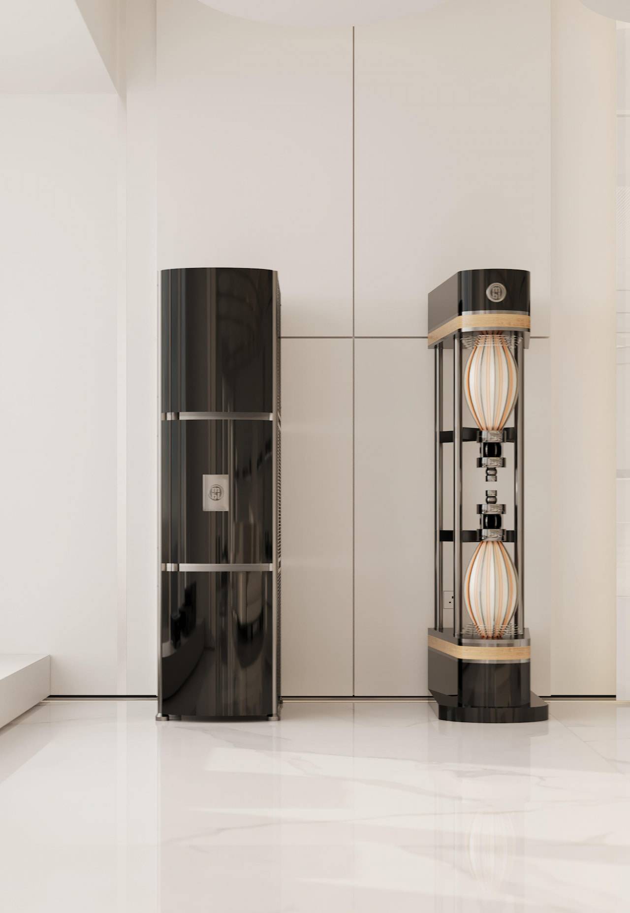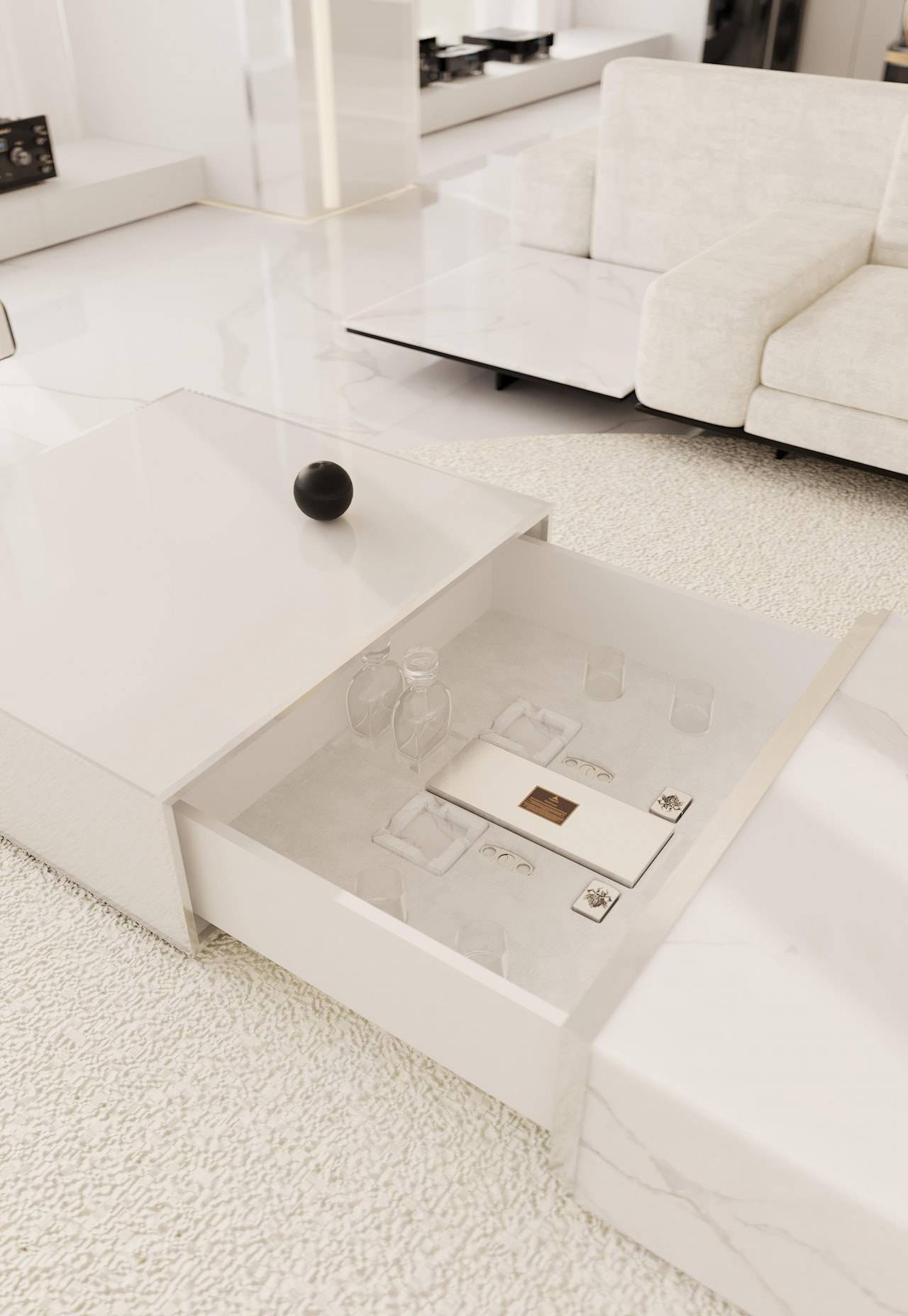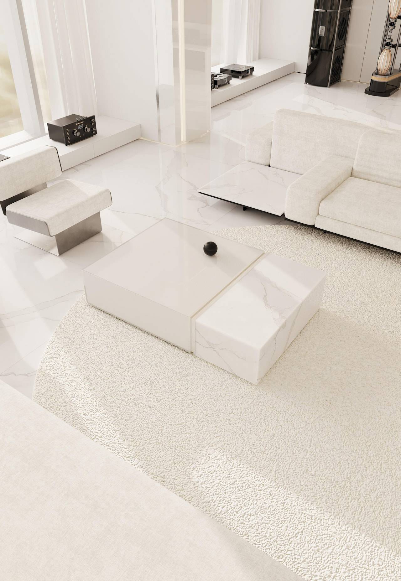 An uncluttered interior that doesn't distract from the main purpose - listening to music with Hi-End audio systems. This showroom of premium audio equipment features a monochromatic design, with glossy white marble, stainless steel, and white solid glass, which contrasts beautifully with the products. Collectible furniture highlights the status of the audio equipment. The showroom's design incorporates thoughtful details, such as round sound-absorbing panels suspended from the ceiling that improve acoustics while also serving as decoration. Engineering systems are concealed behind decorative perforated metal boxes with lighting.