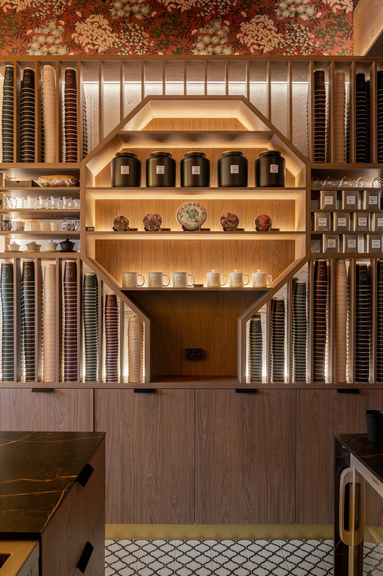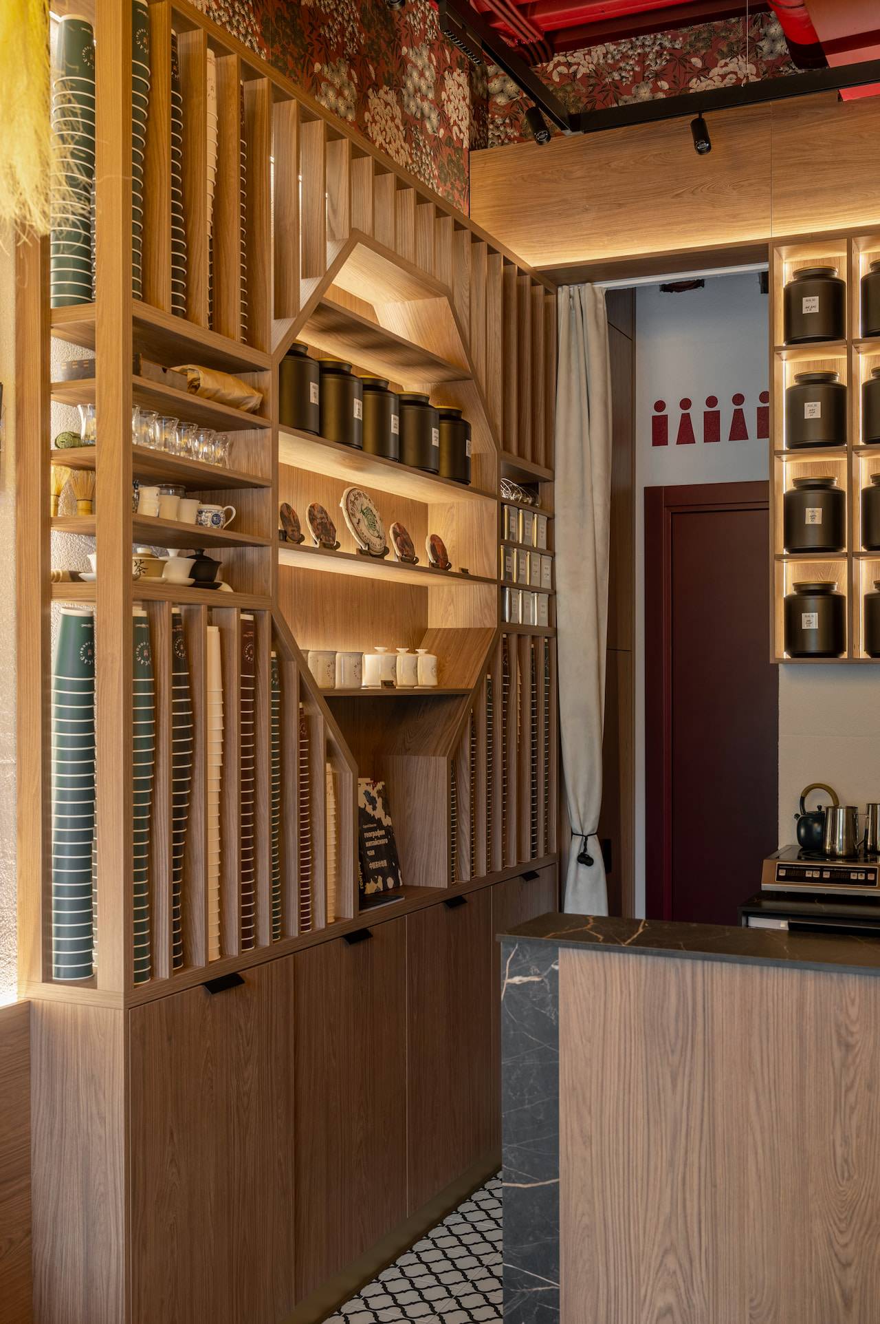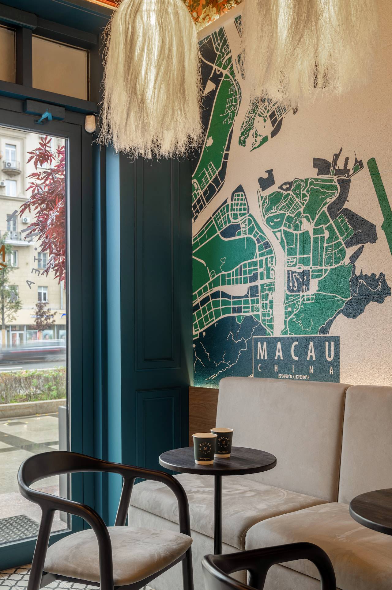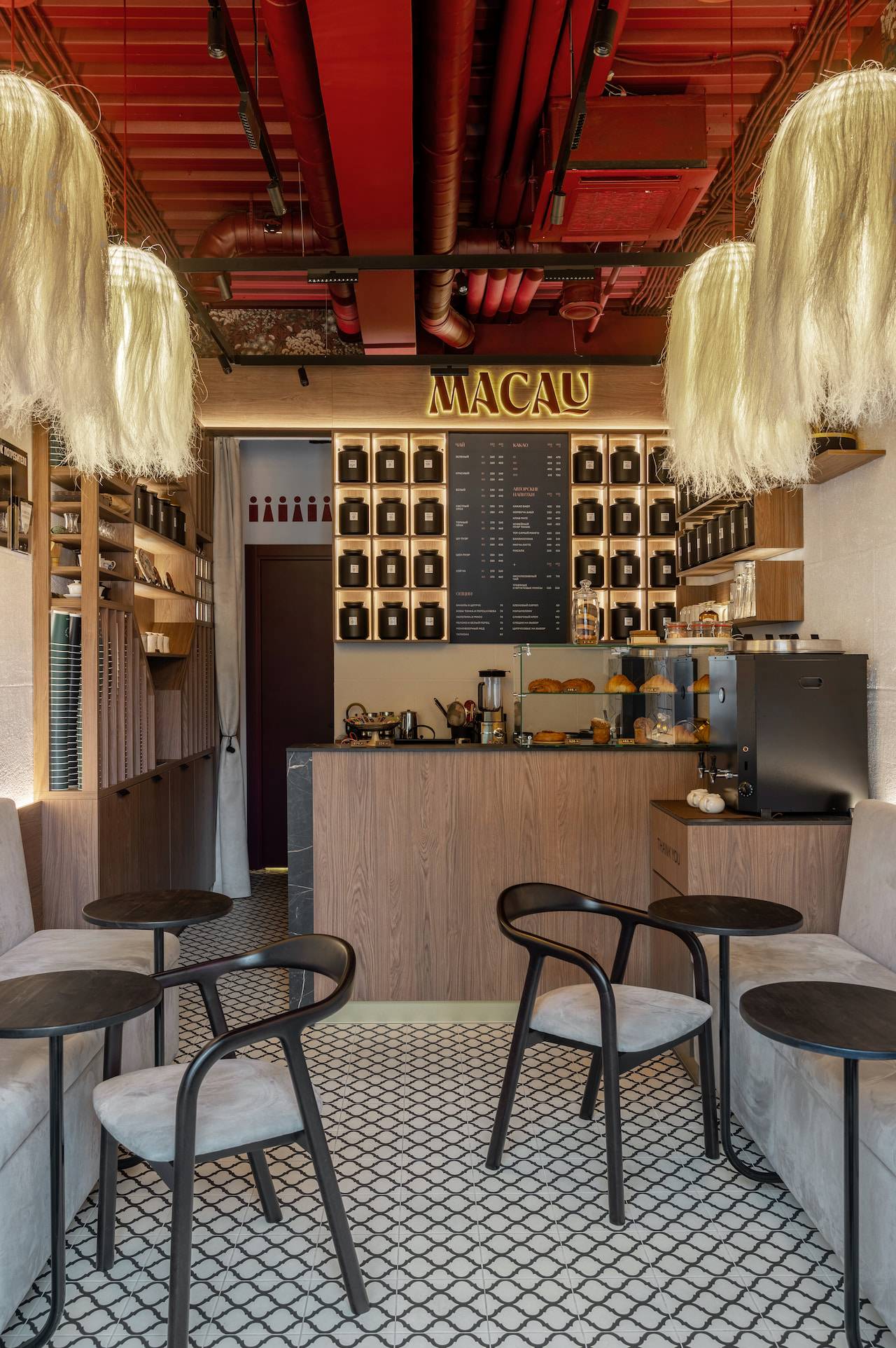 A tea cafe named after the Chinese city of Macau, which historically exported Chinese tea to Europe and has been influenced by Portuguese culture. Therefore the interior of this tea house includes elements of Portuguese style, such as natural wood, stone, "azulejo" tiles, plaster with the effect of aged bricks, and saturated colors. The furniture for the tea exhibition resembles Chinese traditional architecture. Oriental-style wallpaper sets the atmosphere of the cafe, while light agave lamps add bright accents to the space.