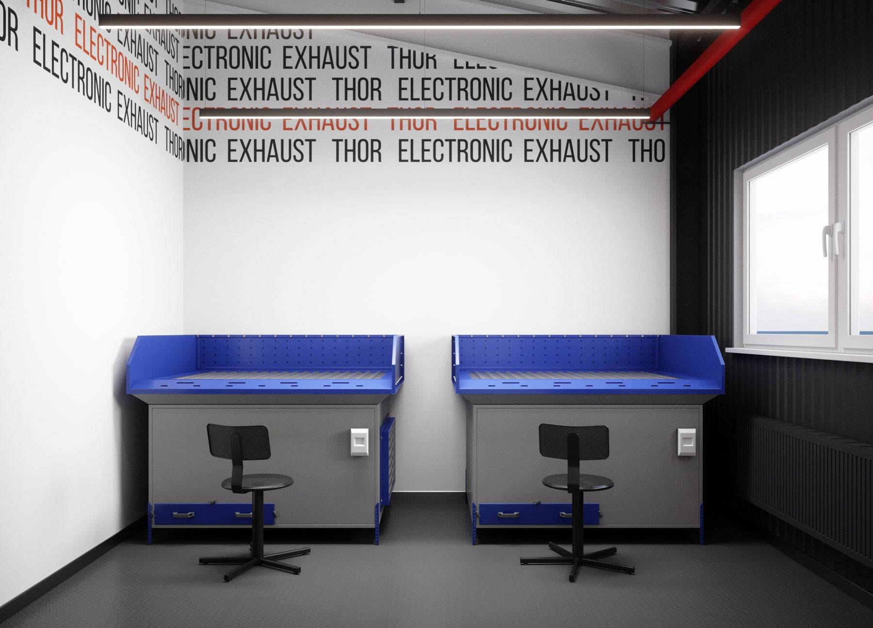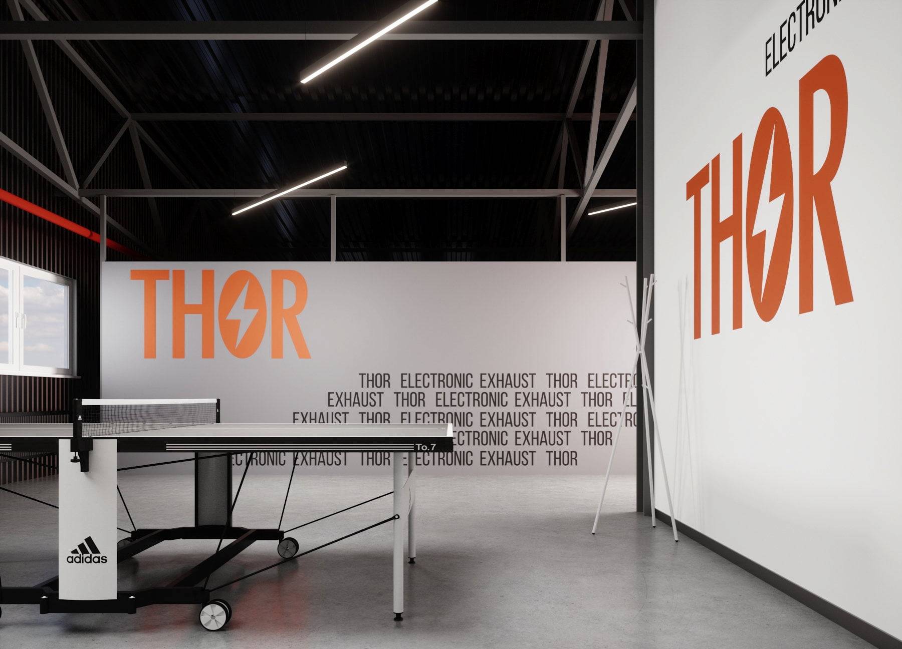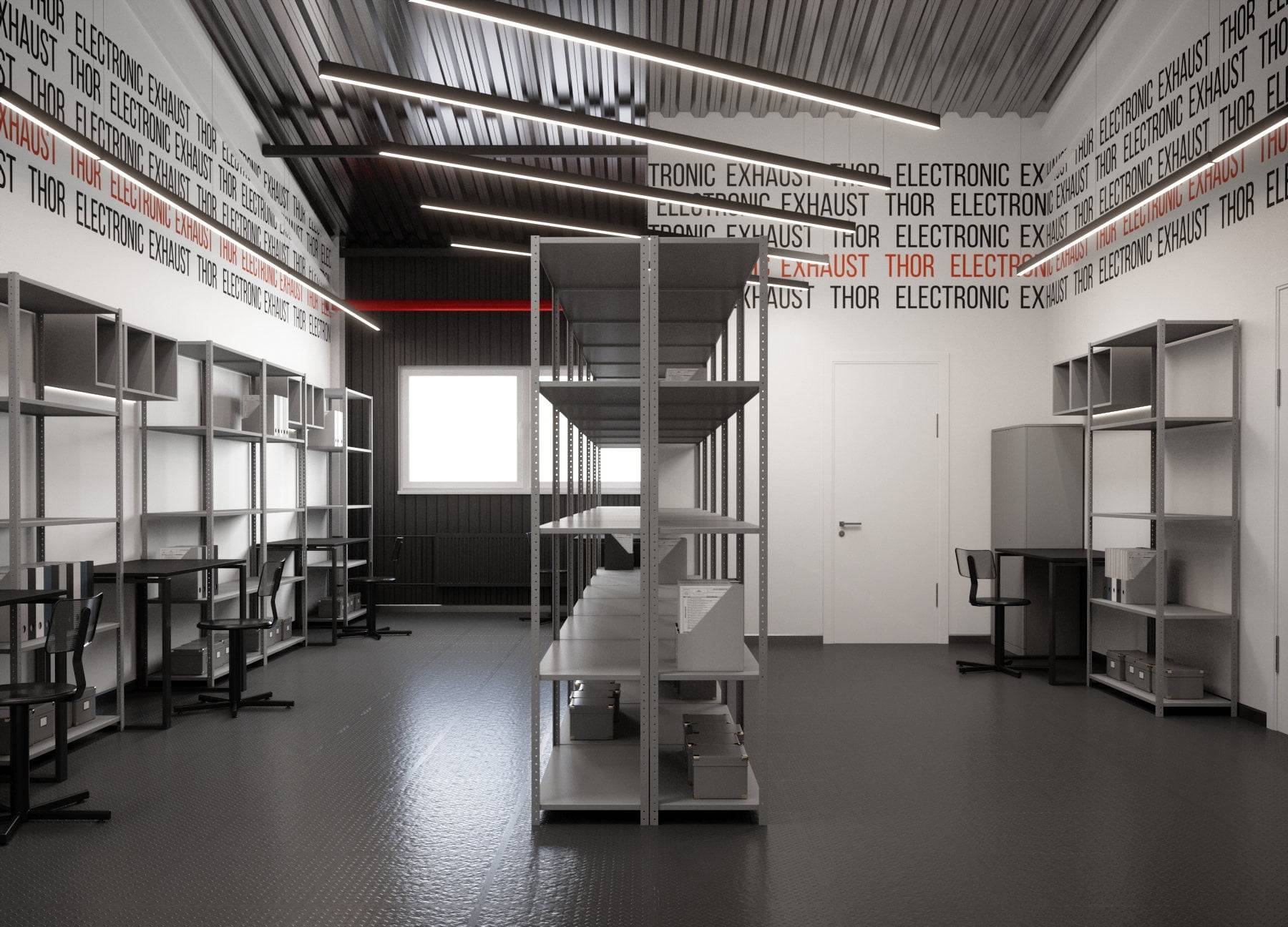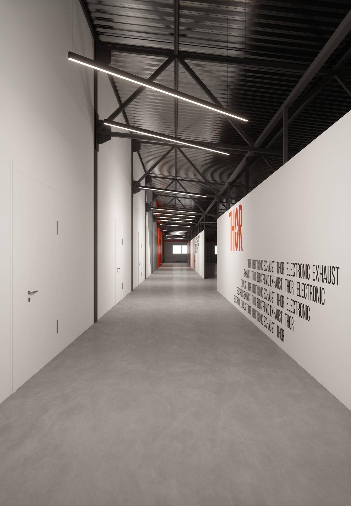 Modern industrial facility where THOR exhaust systems are assembled and produced. The factory layout features an acoustical room, factory workshops with machinery, laboratories, warehouses, office spaces and recreation areas. Bright branding color and unique pattern unites all work areas within one design concept. We created the design concept that solved ergonomic issues and divided the space into well designed practical areas.