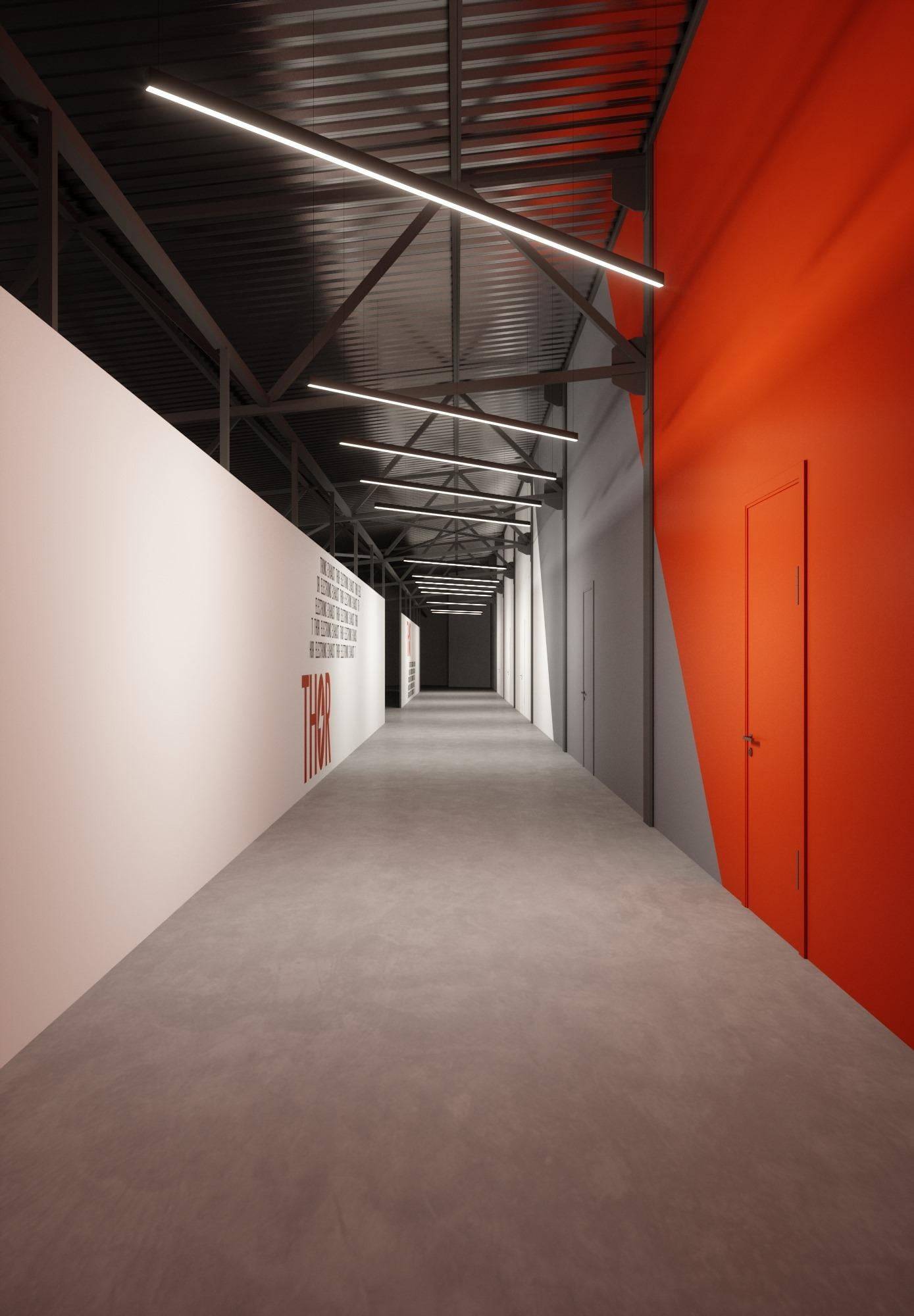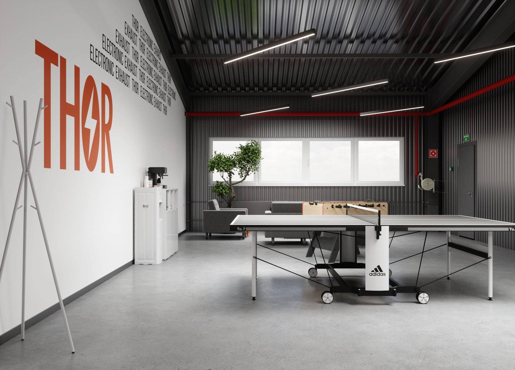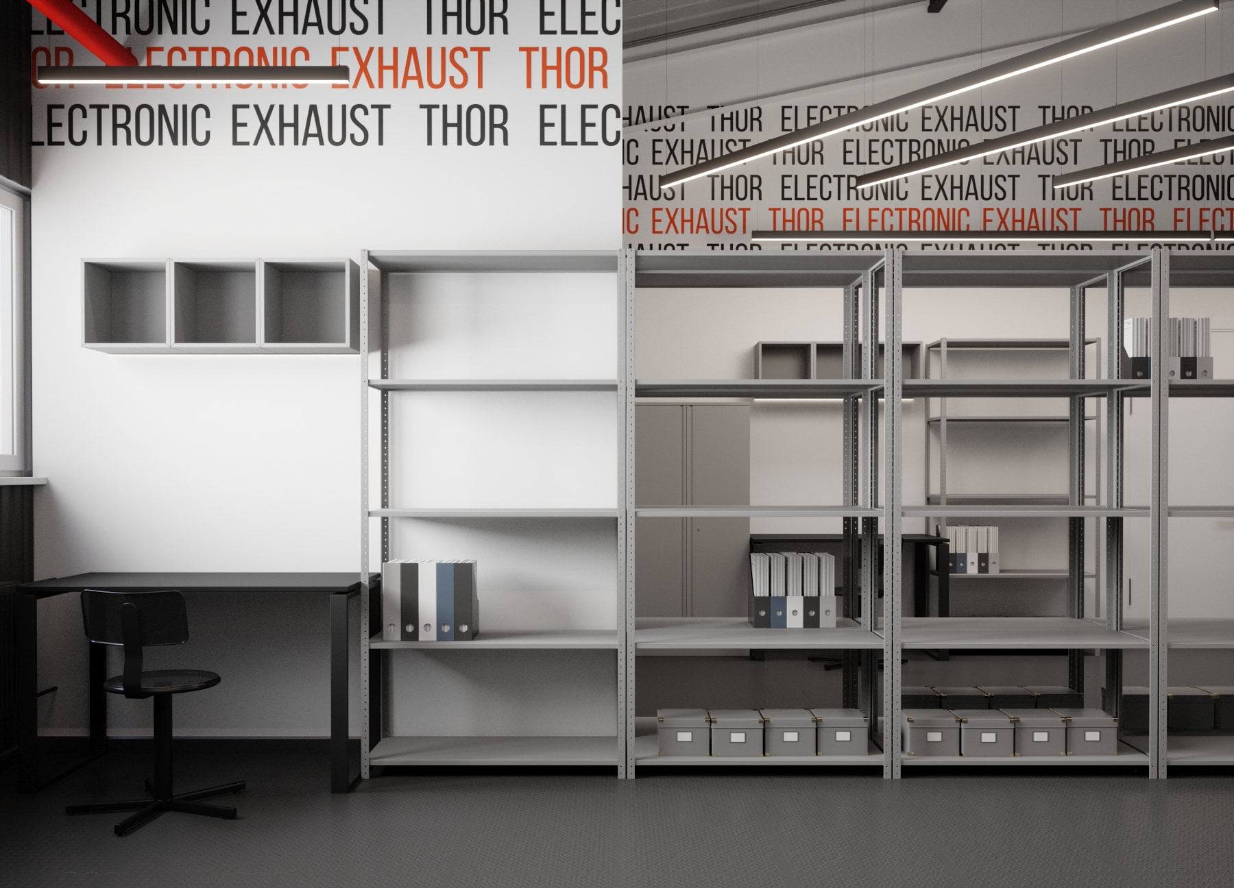 Modern industrial facility where THOR exhaust systems are assembled and produced. The factory layout features an acoustical room, factory workshops with machinery, laboratories, warehouses, office spaces and recreation areas. Bright branding color and unique pattern unites all work areas within one design concept. We created the design concept that solved ergonomic issues and divided the space into well designed practical areas.
