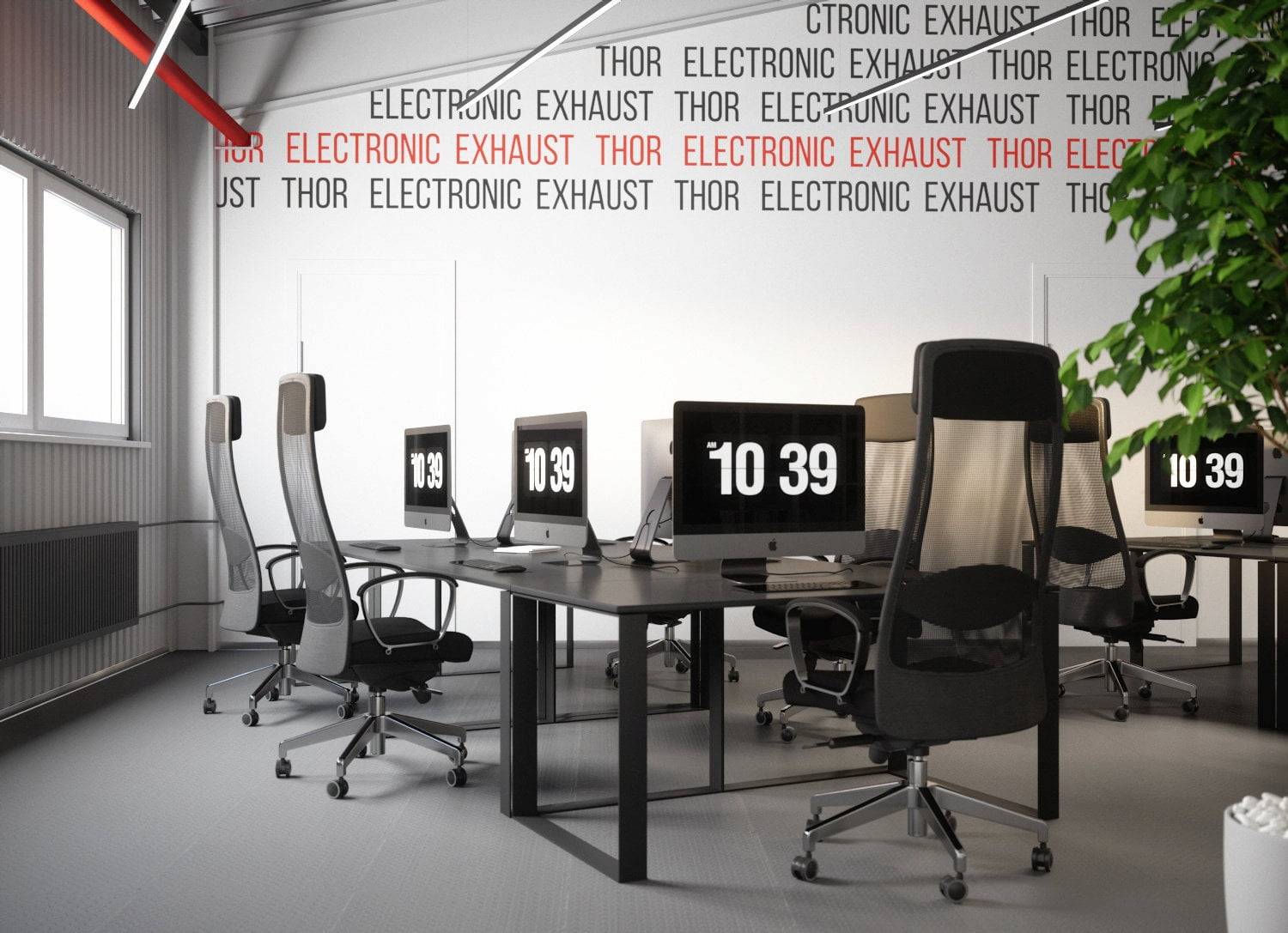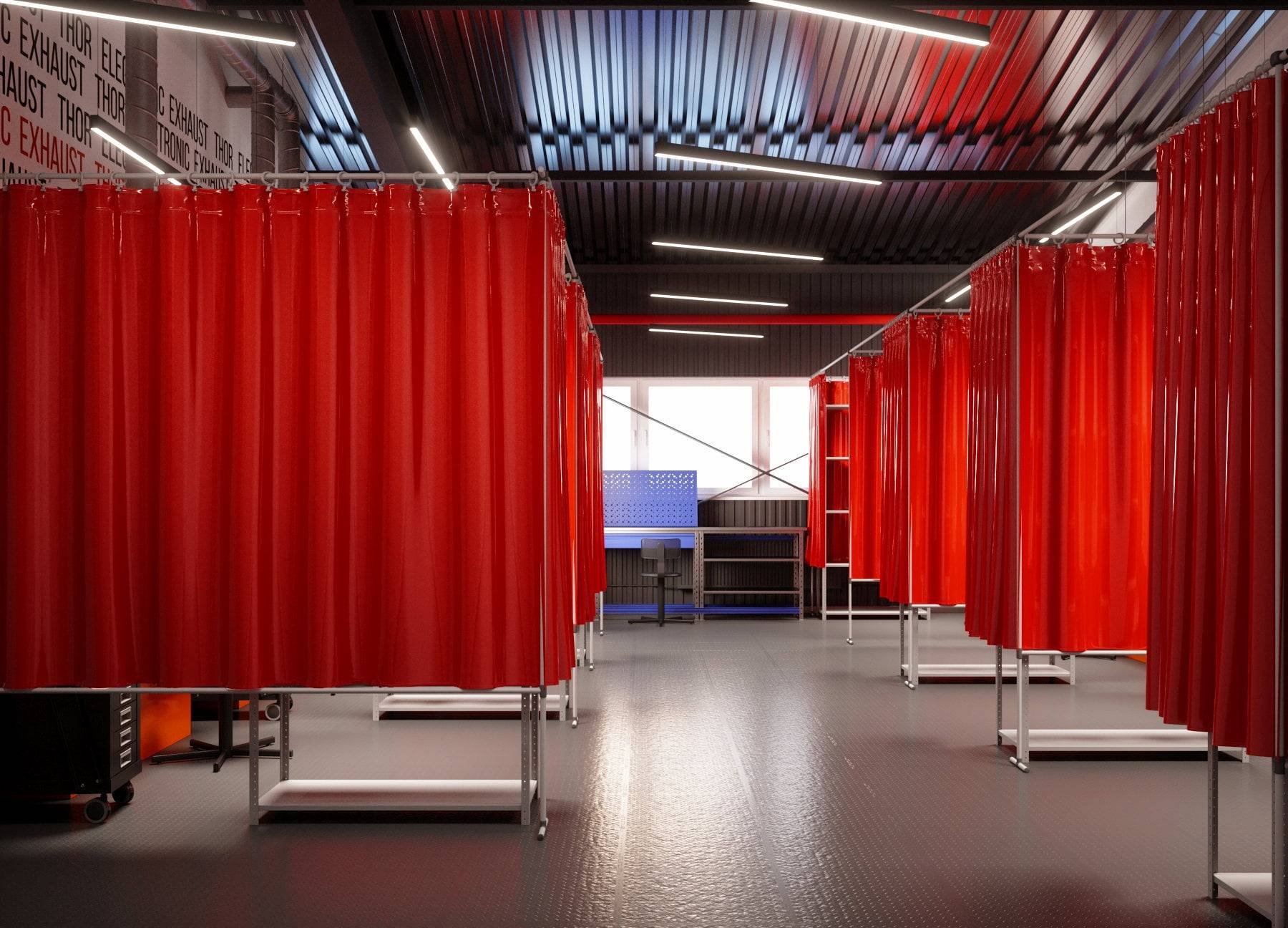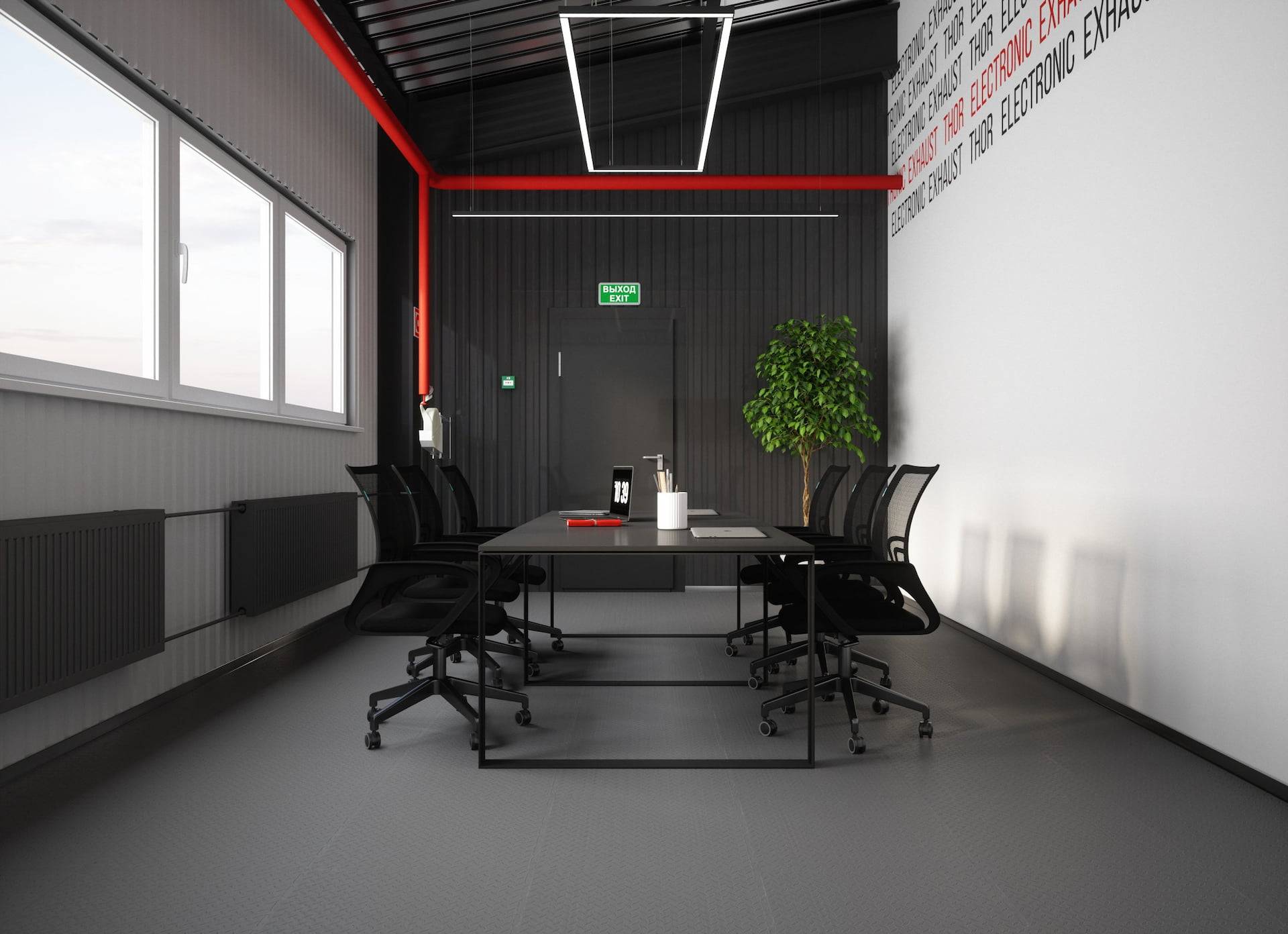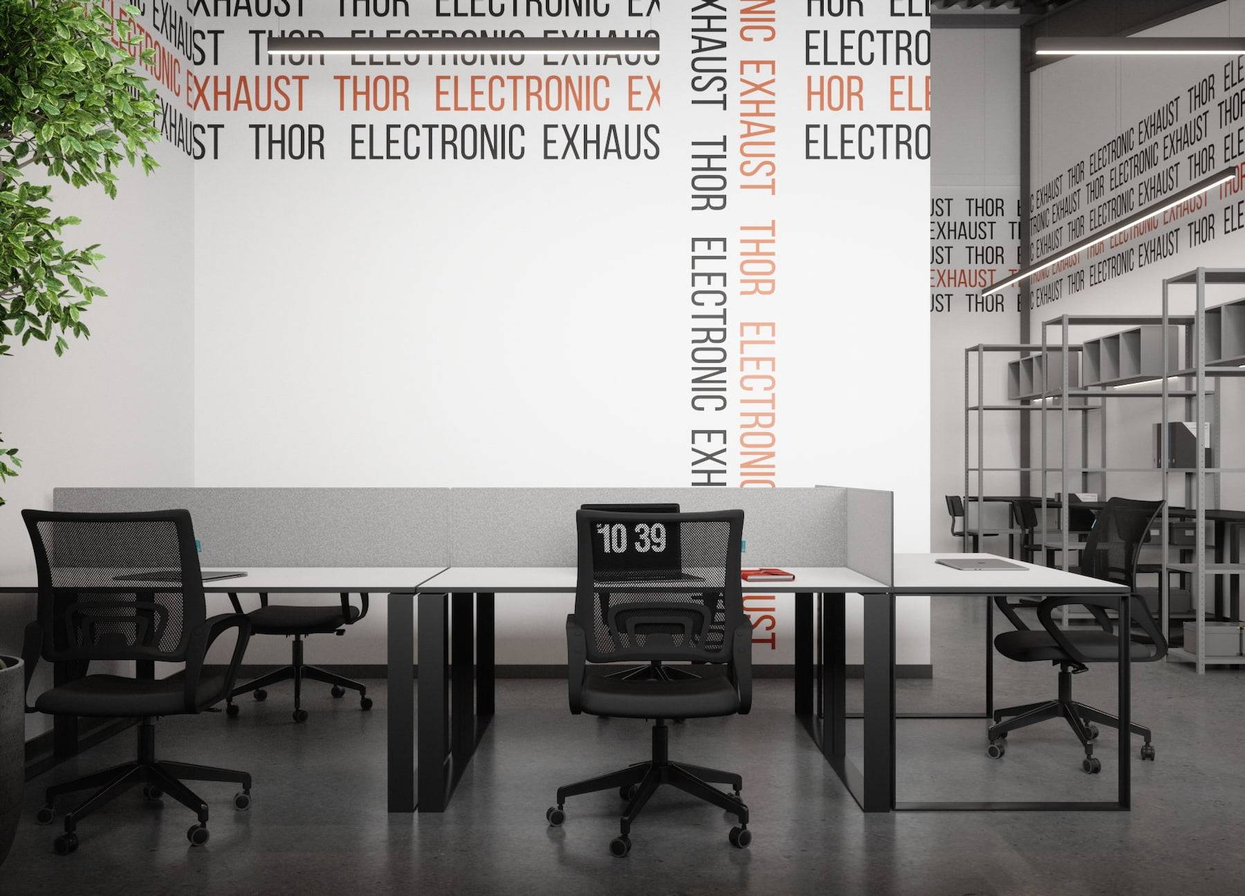 Modern industrial facility where THOR exhaust systems are assembled and produced. The factory layout features an acoustical room, factory workshops with machinery, laboratories, warehouses, office spaces and recreation areas. Bright branding color and unique pattern unites all work areas within one design concept. We created the design concept that solved ergonomic issues and divided the space into well designed practical areas.