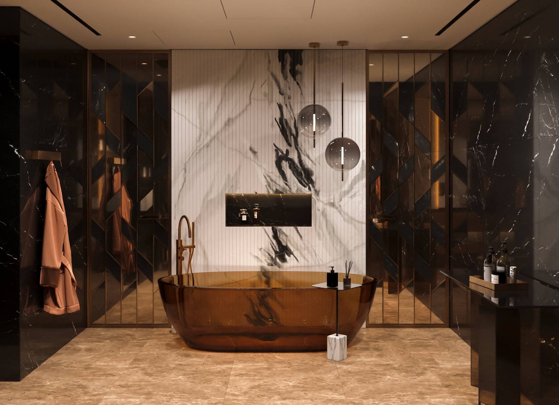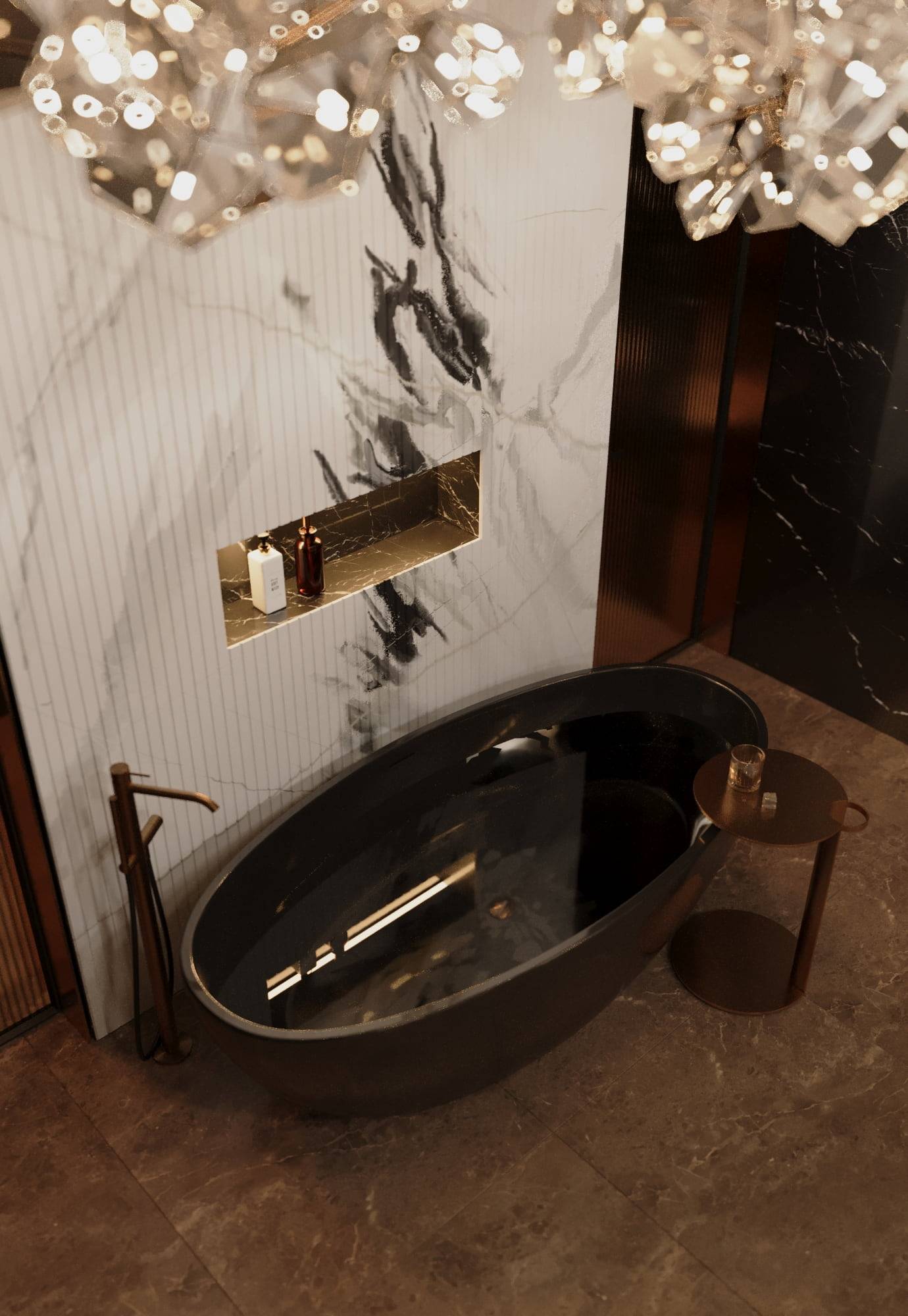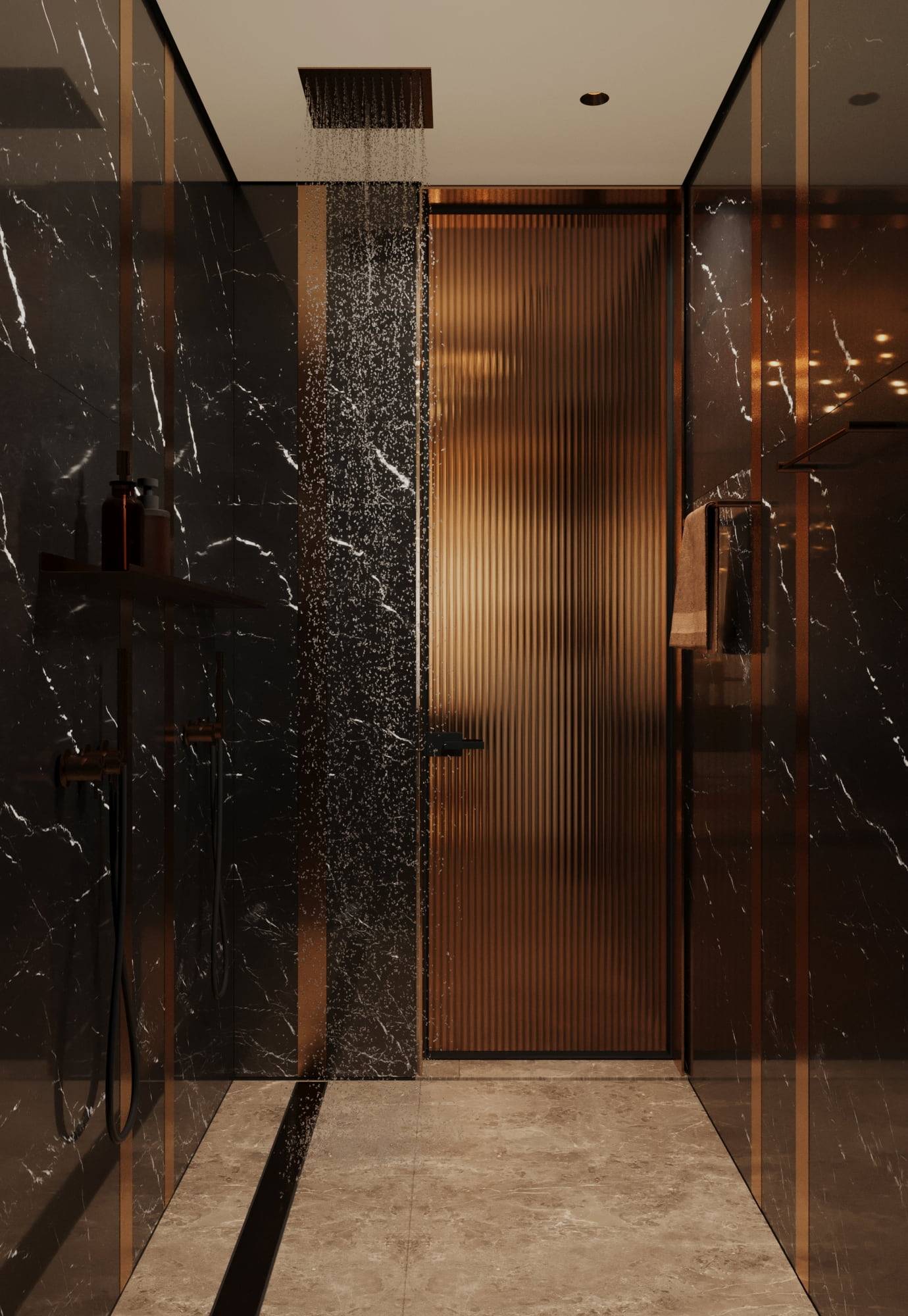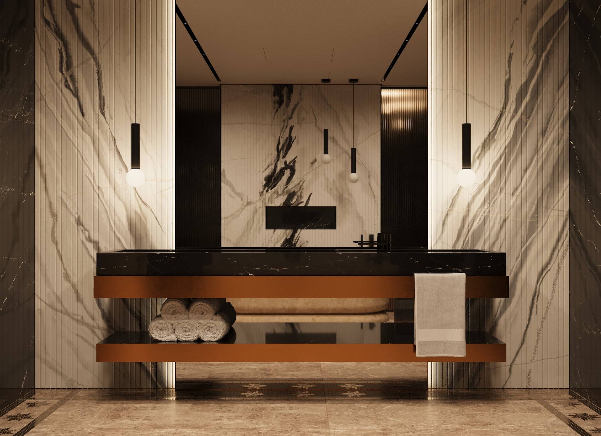 Spacious bathroom in the luxurious W Residence complex, tiled with large-format natural black marble that is inlaid with polished copper. The main goal for our design team was to combine three completely different materials like black marble, white marble and beige tiles in one working concept using bathroom fixtures, lighting and decor elements. Three design projects with different stylistic decisions were offered to the client.