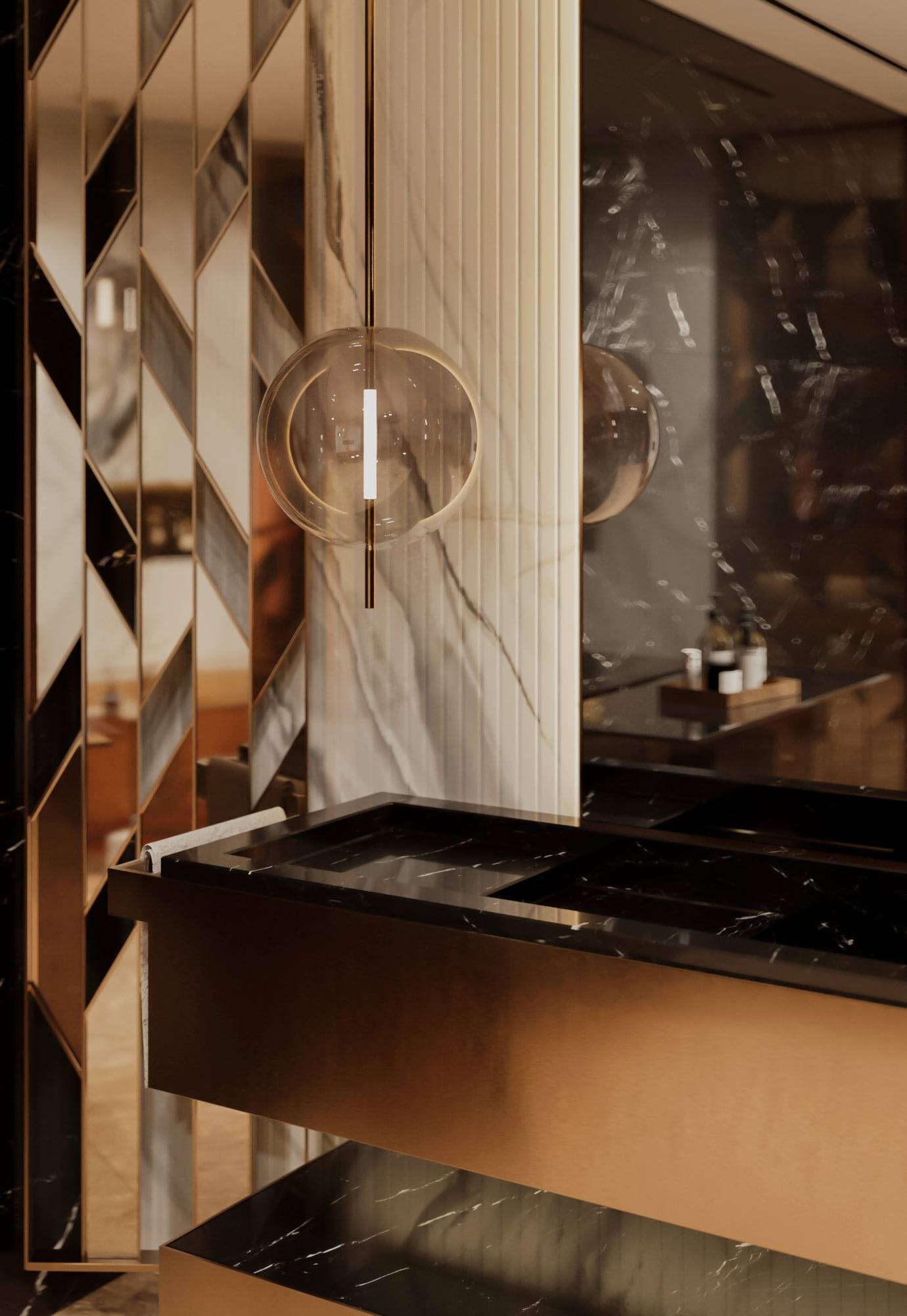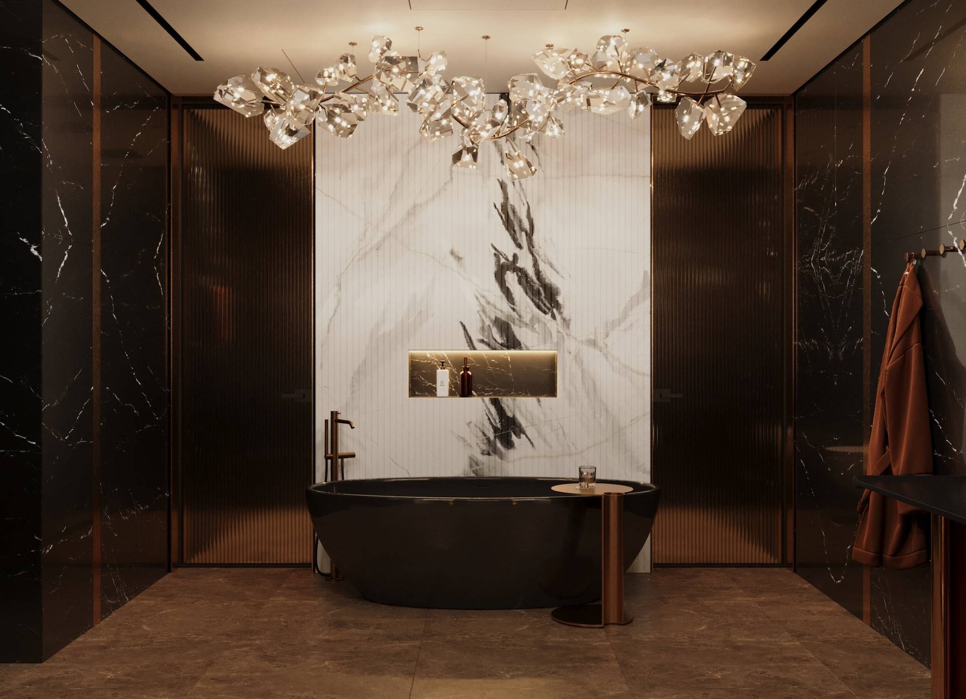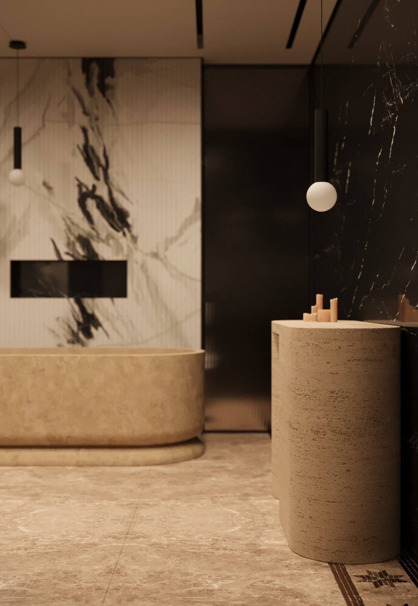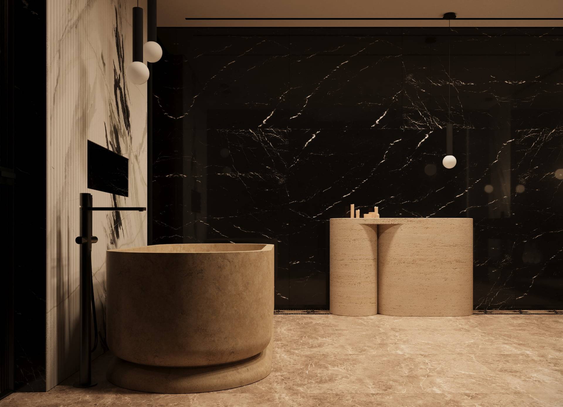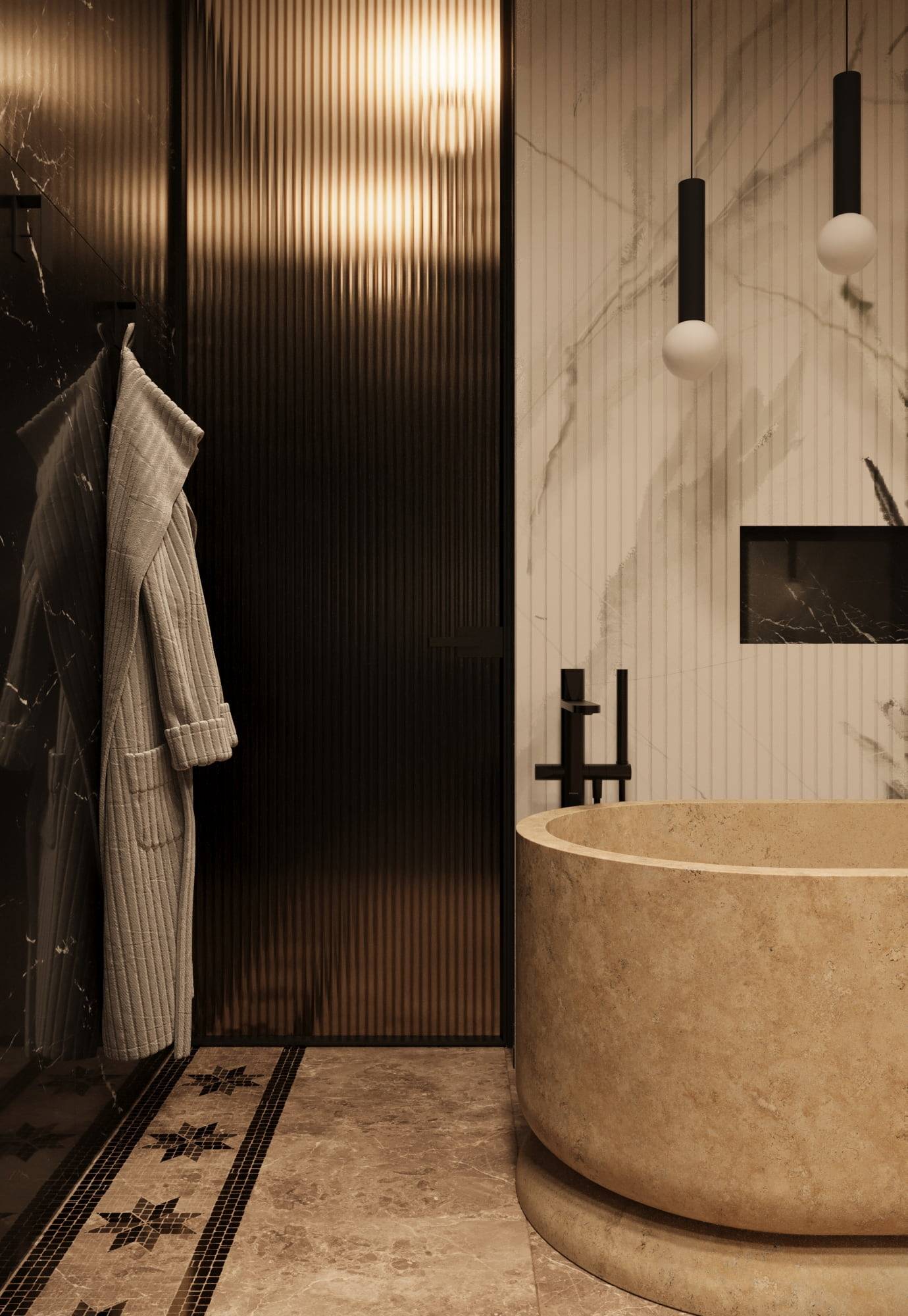 Spacious bathroom in the luxurious W Residence complex, tiled with large-format natural black marble that is inlaid with polished copper. The main goal for our design team was to combine three completely different materials like black marble, white marble and beige tiles in one working concept using bathroom fixtures, lighting and decor elements. Three design projects with different stylistic decisions were offered to the client.