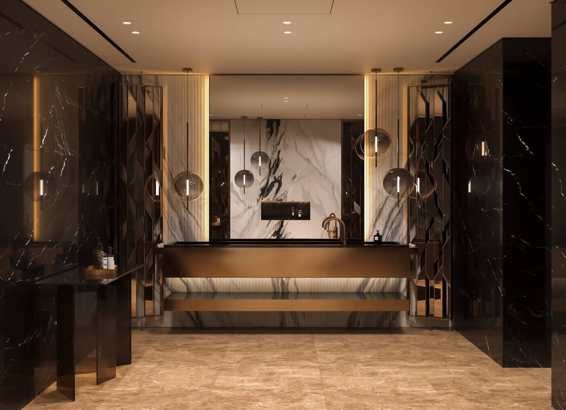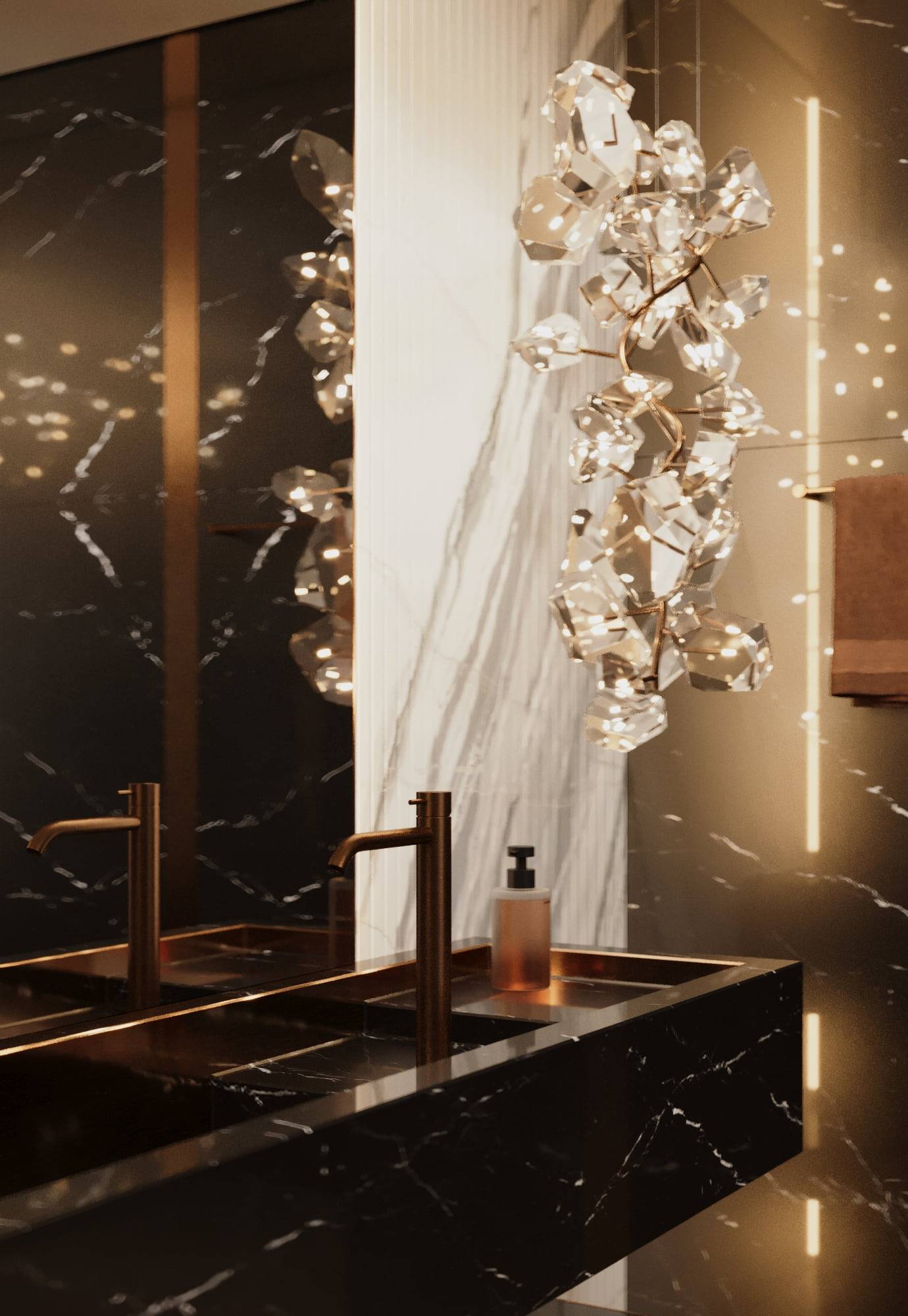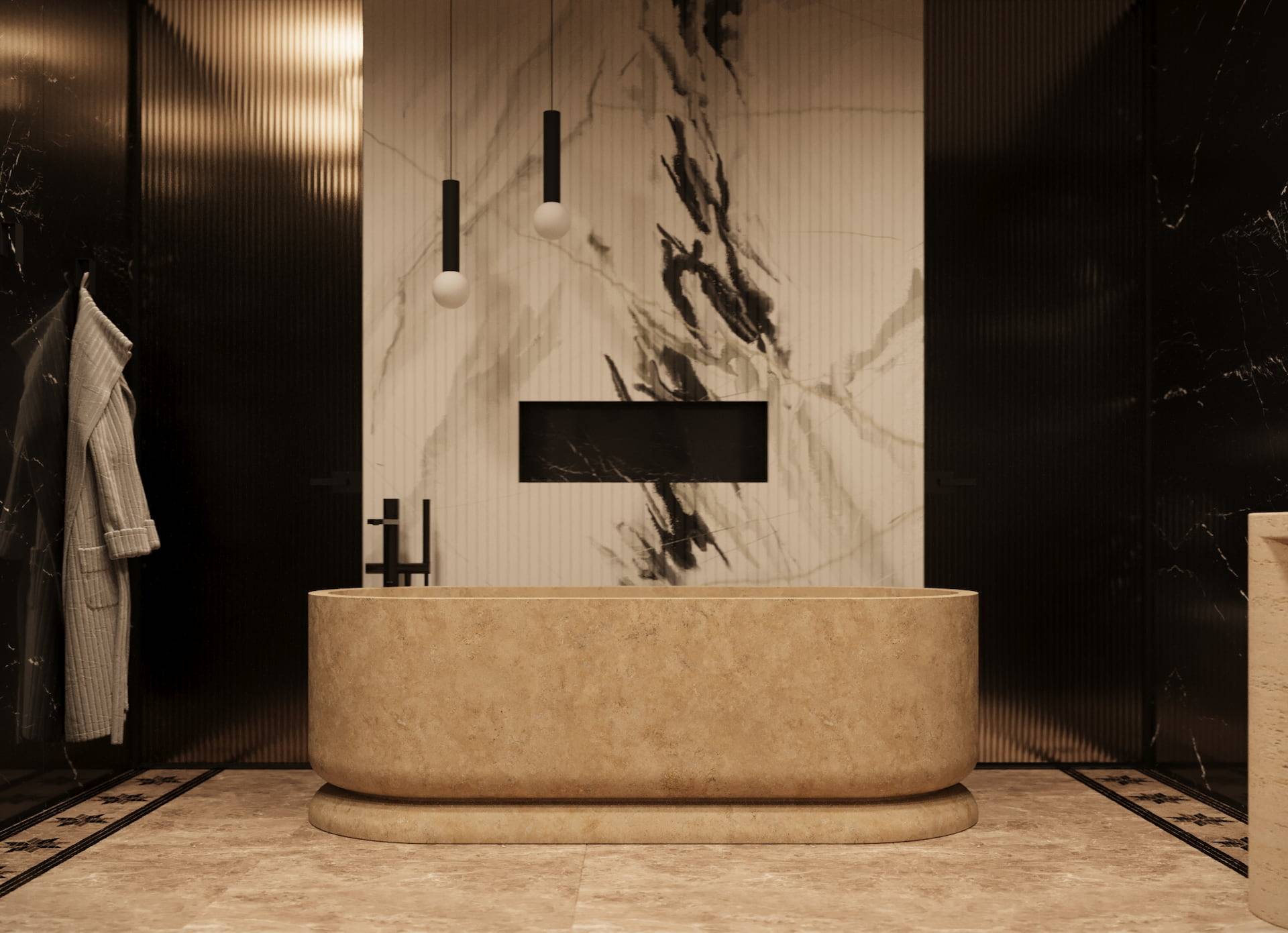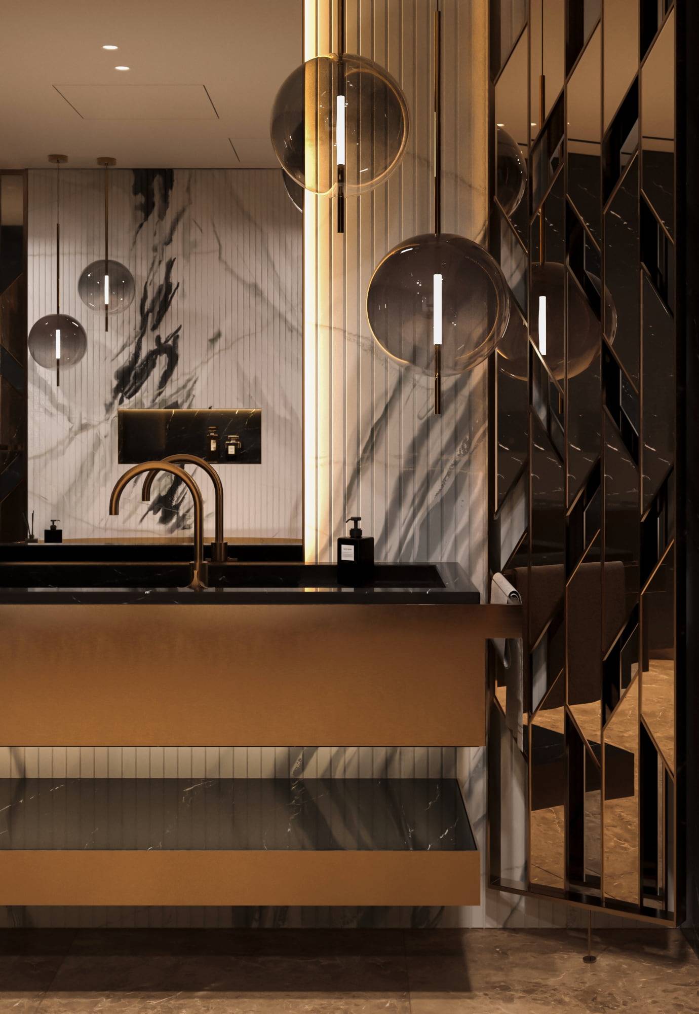 Spacious bathroom in the luxurious W Residence complex, tiled with large-format natural black marble that is inlaid with polished copper. The main goal for our design team was to combine three completely different materials like black marble, white marble and beige tiles in one working concept using bathroom fixtures, lighting and decor elements. Three design projects with different stylistic decisions were offered to the client.